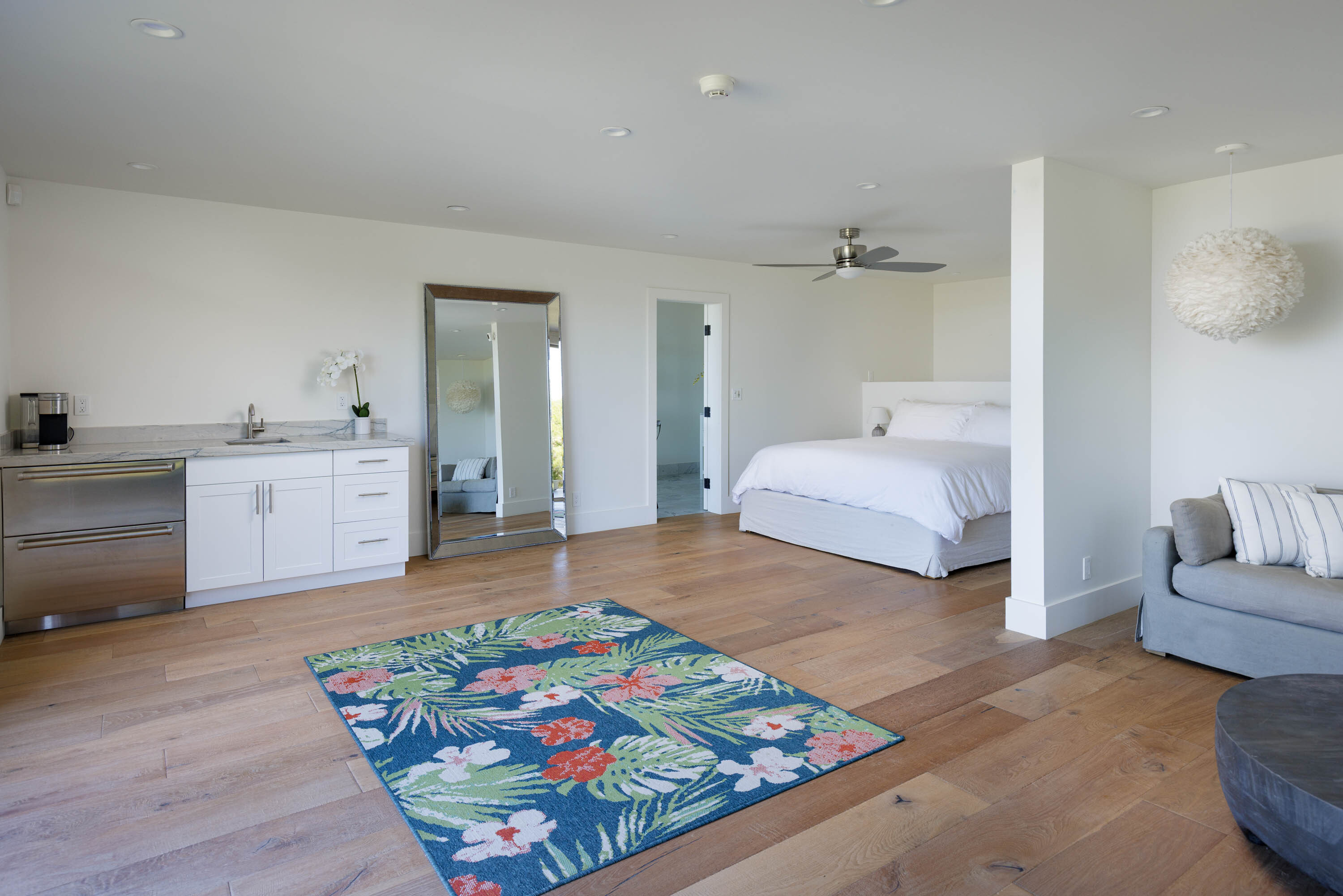 The great room features vaulted ceilings, expansive ocean facing windows, and a Carrara marble island. The chef’s kitchen is equipped with Sub Zero and Wolf appliances. A full butler’s pantry with a wine fridge, freezer, an additional dishwasher and ample storage supports larger gatherings. The upstairs primary suite captures panoramic views and includes a walk in closet and dedicated office nook.