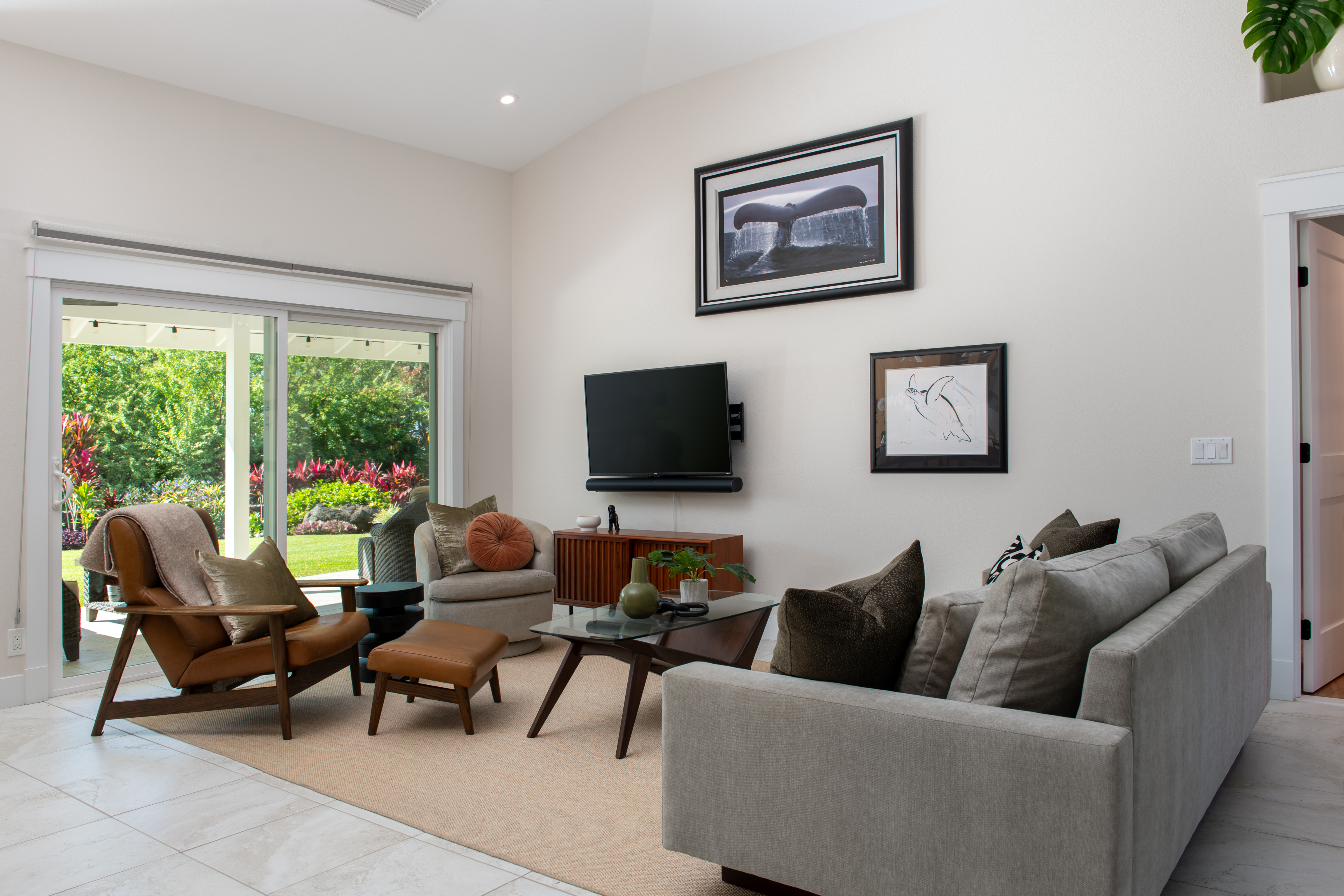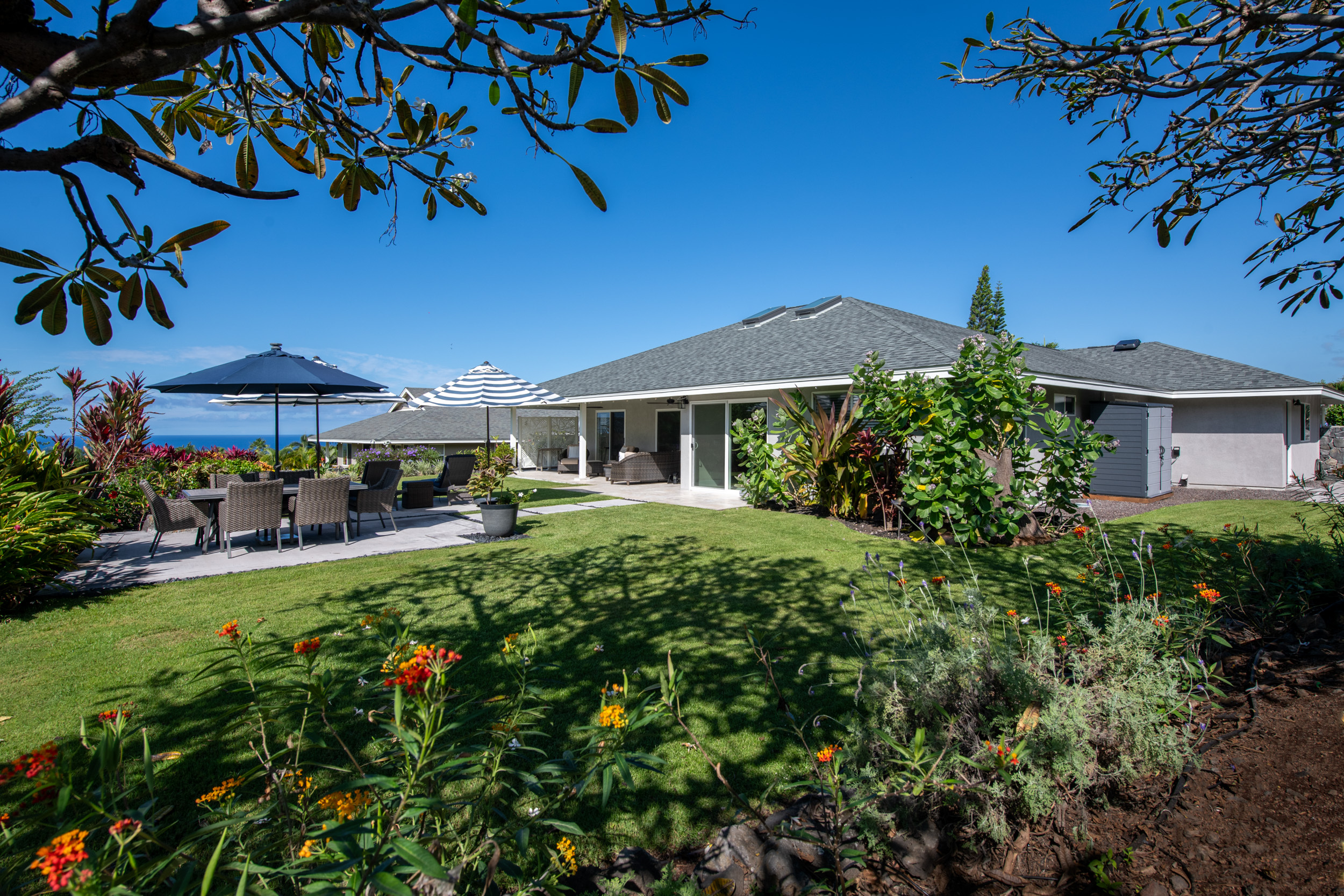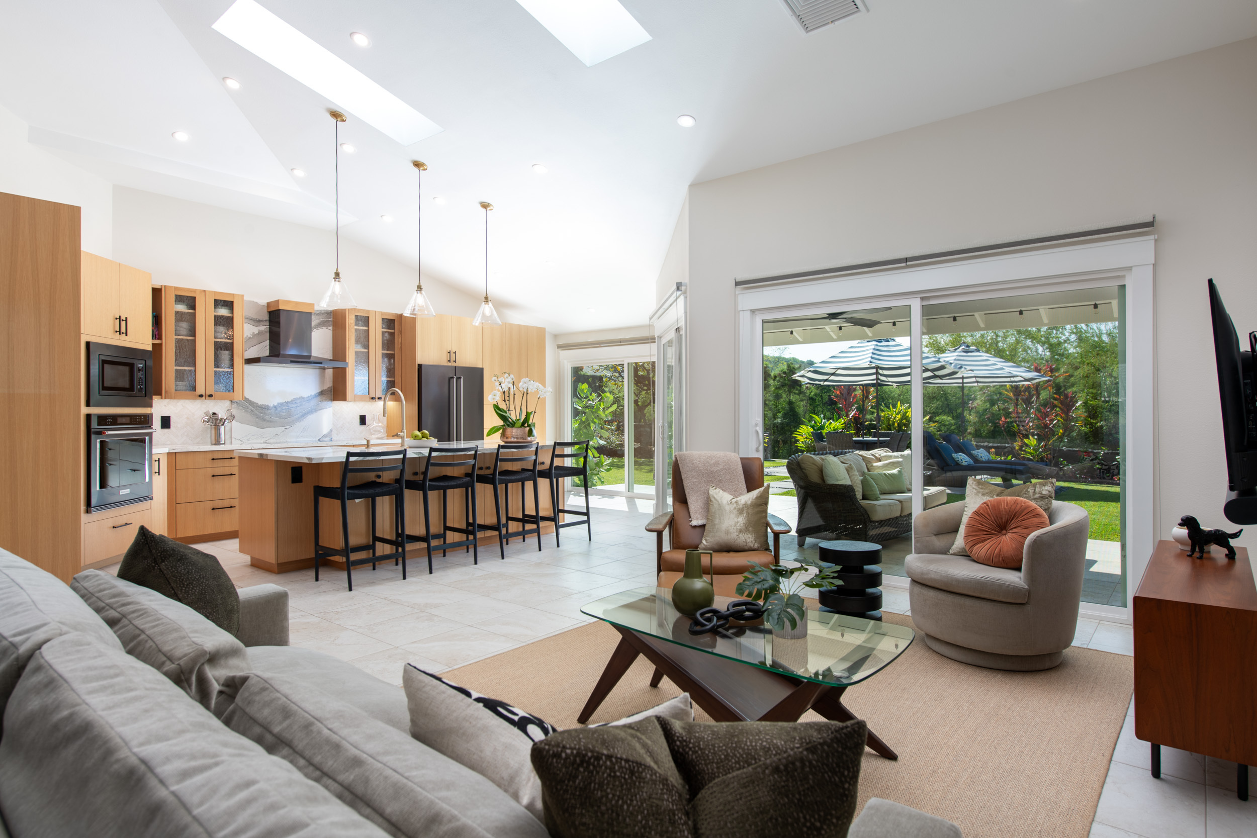 The floor plan was opened up to enhance natural light and create a bright, flowing layout with 10ft+ ceilings and a seamless connection to the outdoor living spaces. New tile throughout the interior and the lanai carries into a beautifully landscaped backyard that includes a butterfly sanctuary, fruit trees, and a private reclaimed lower terrace with mango, tangerine, banana, and lemon trees.