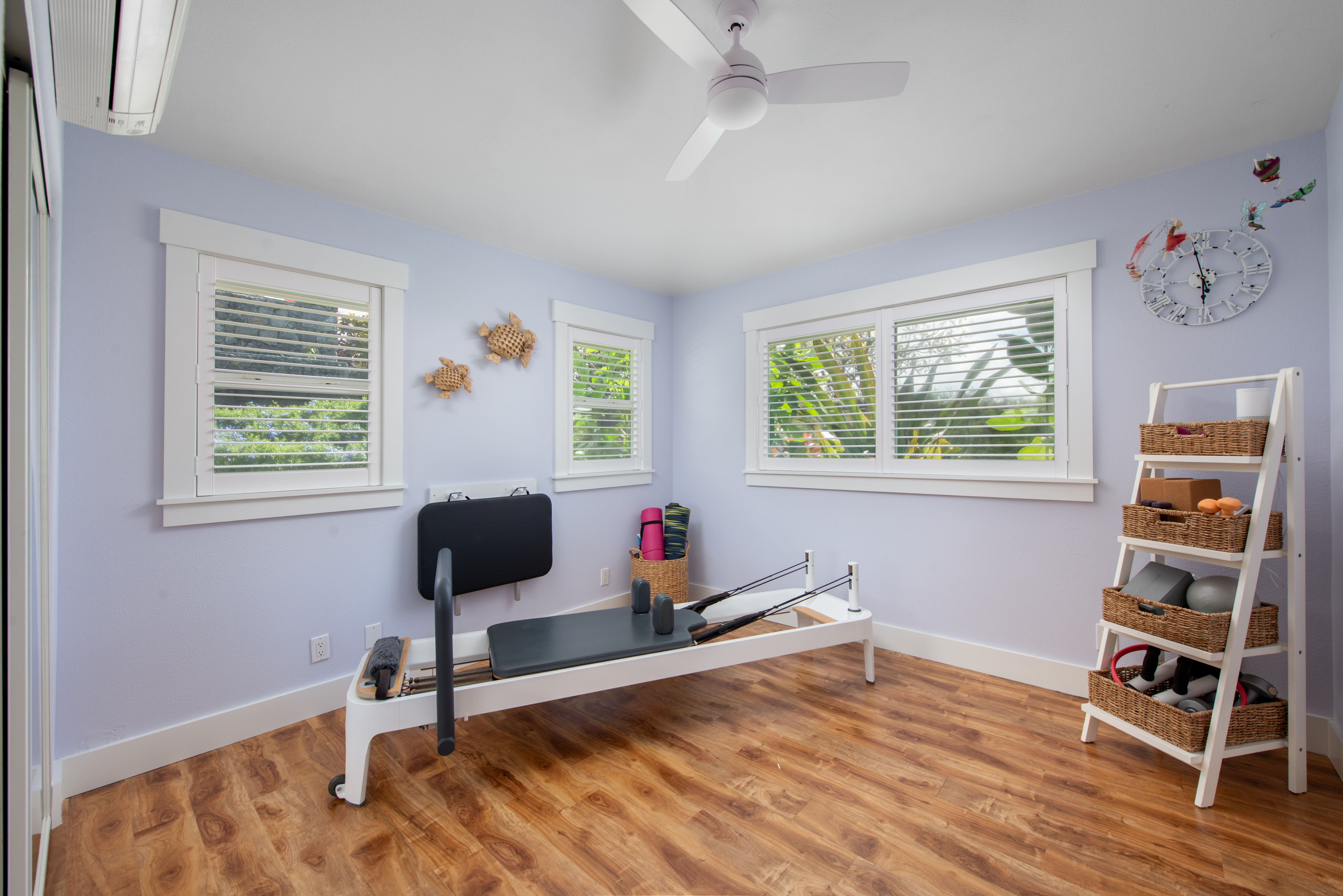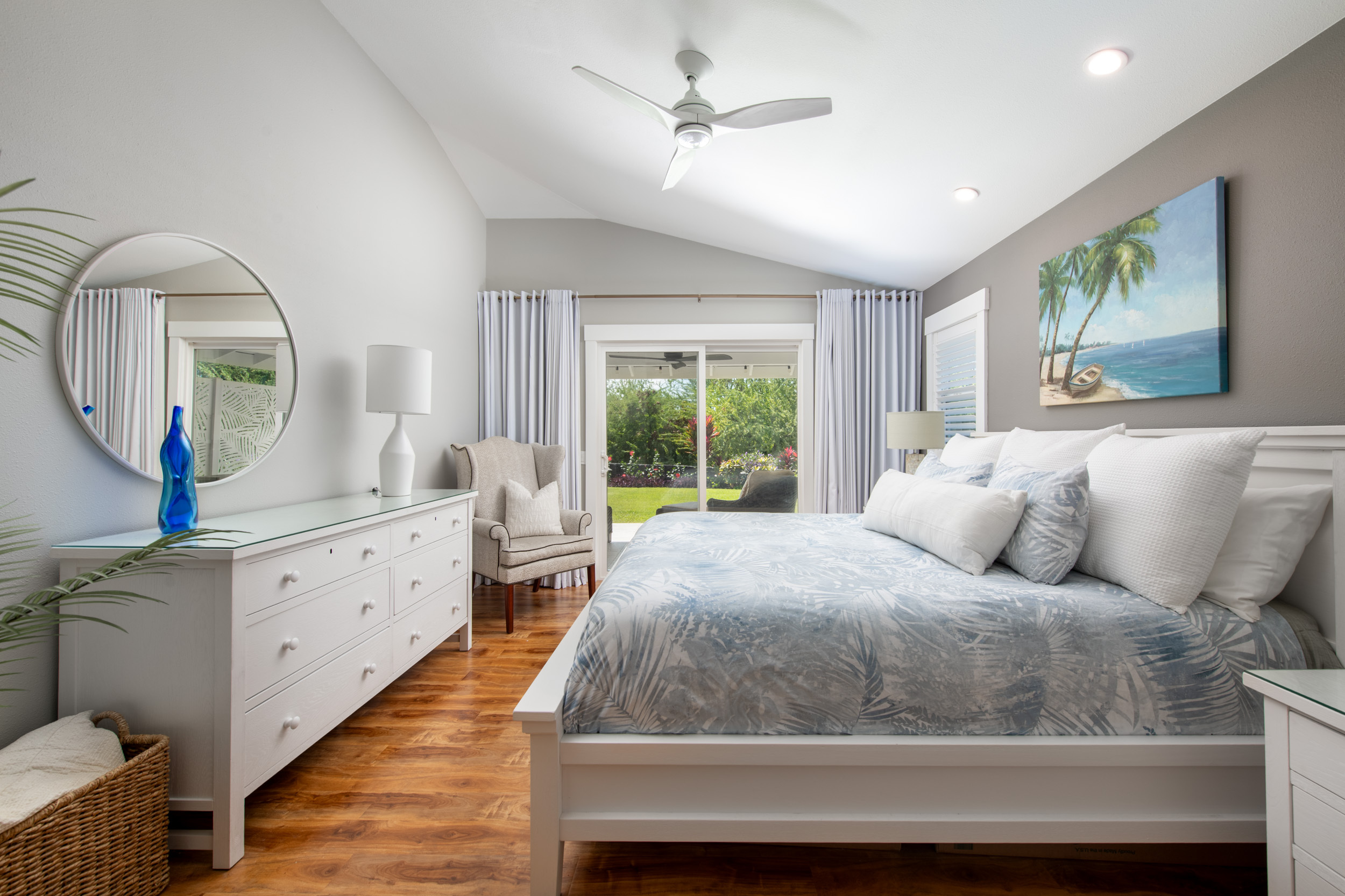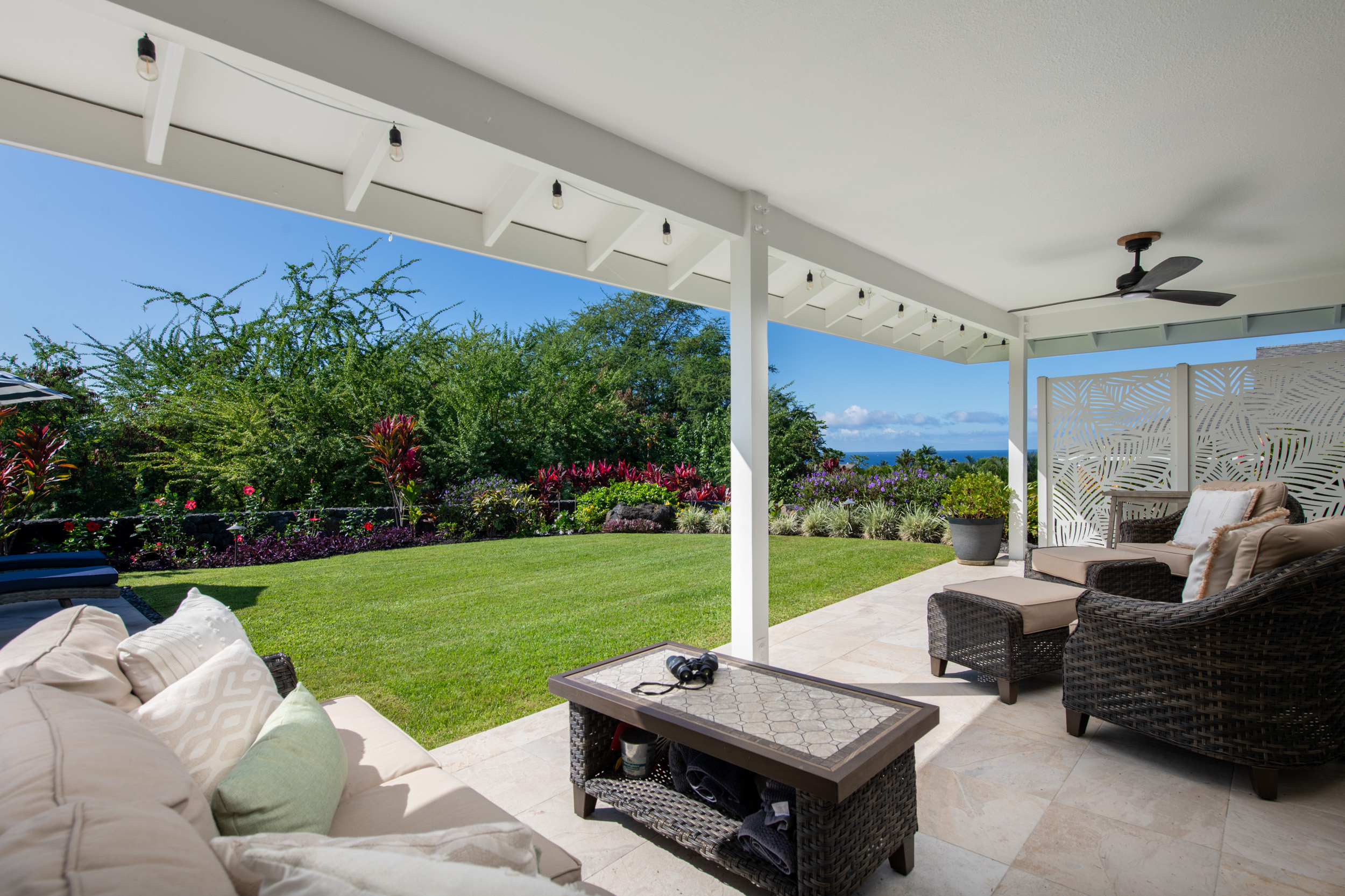 The floor plan was opened up to enhance natural light and create a bright, flowing layout with 10ft+ ceilings and a seamless connection to the outdoor living spaces. New tile throughout the interior and the lanai carries into a beautifully landscaped backyard that includes a butterfly sanctuary, fruit trees, and a private reclaimed lower terrace with mango, tangerine, banana, and lemon trees.