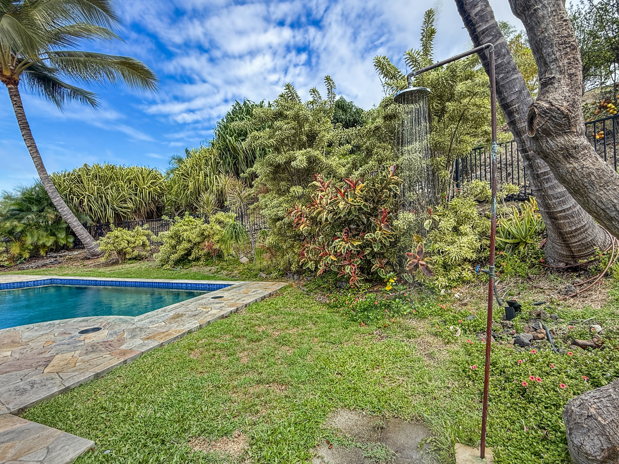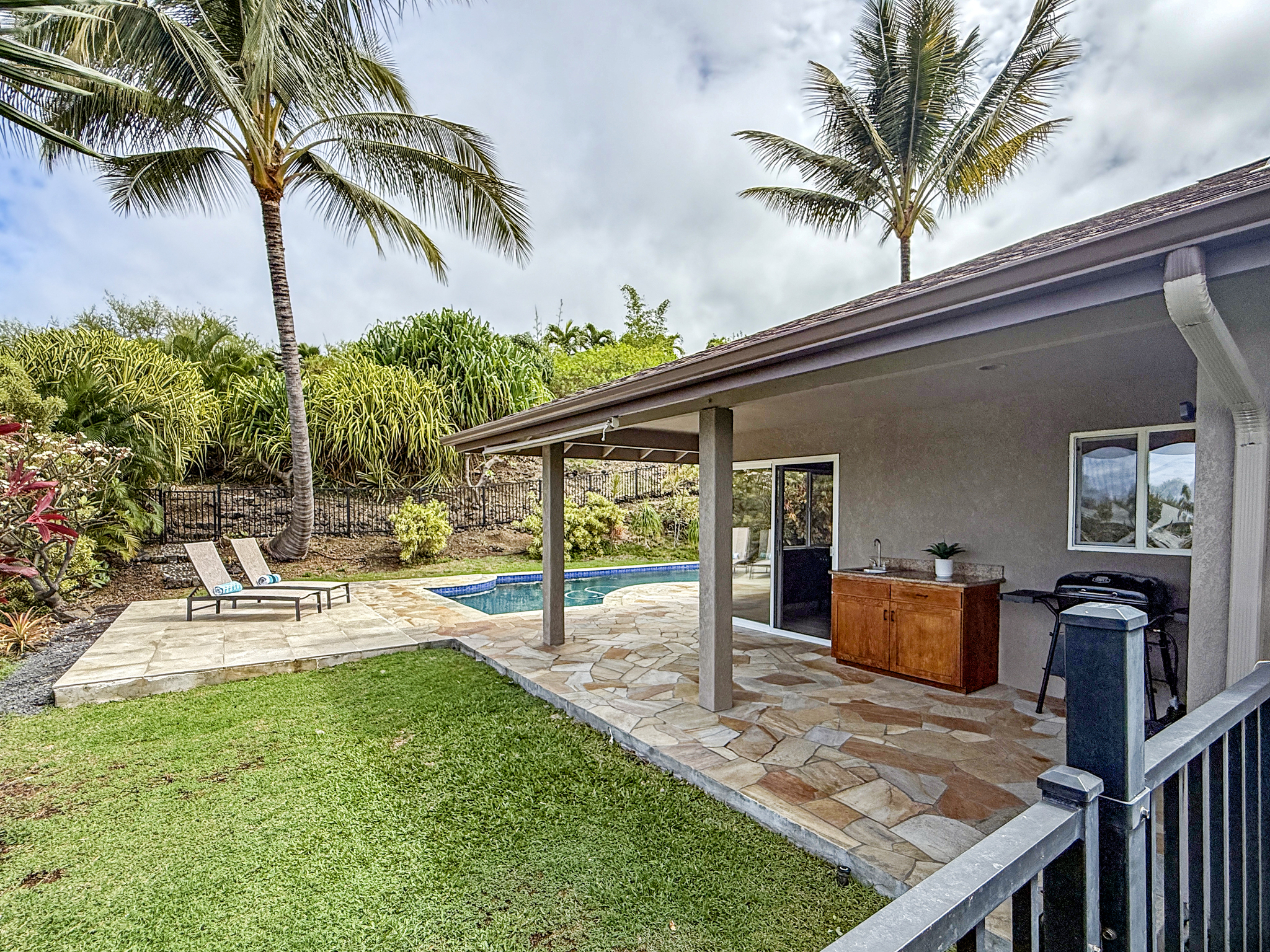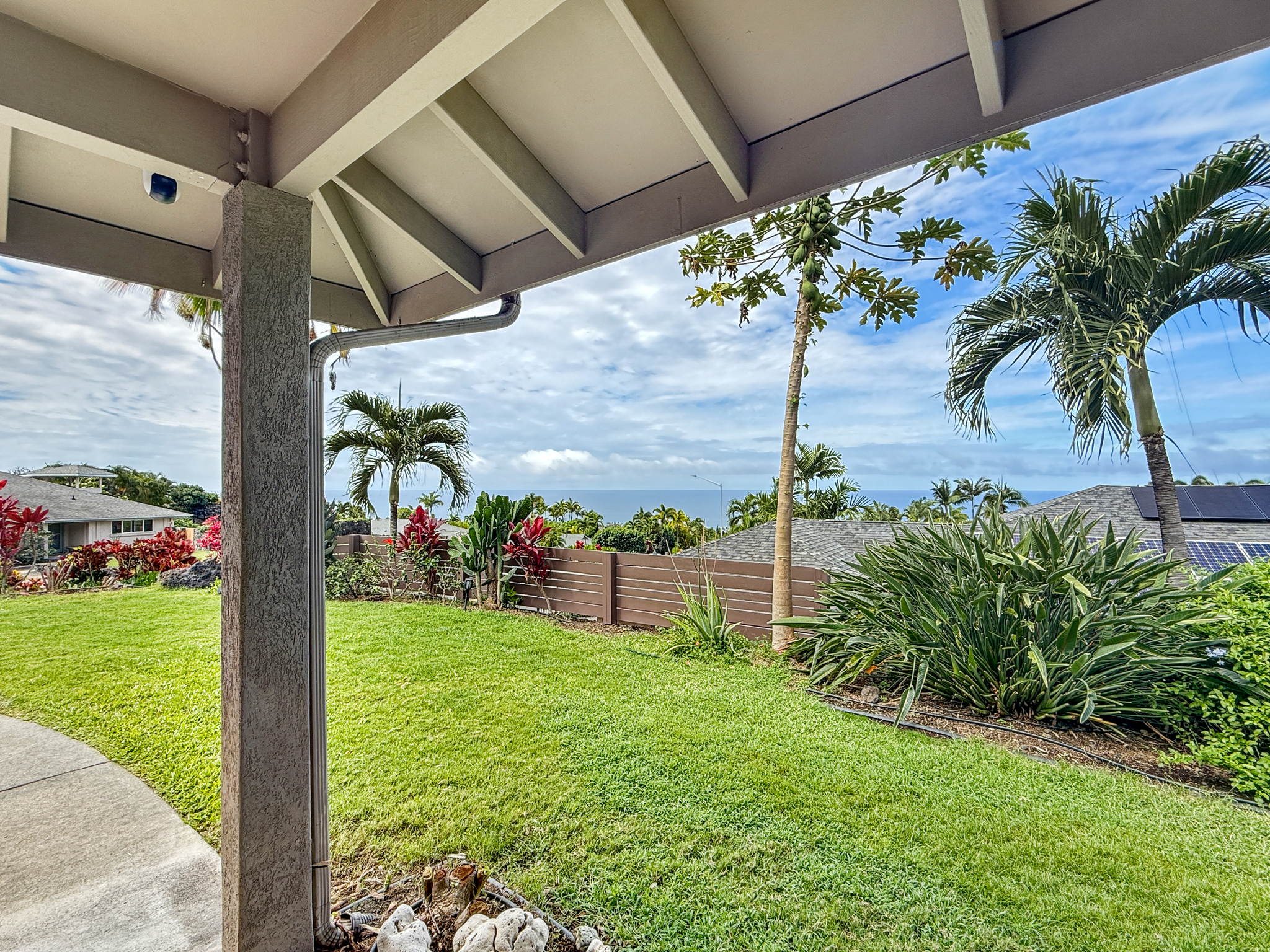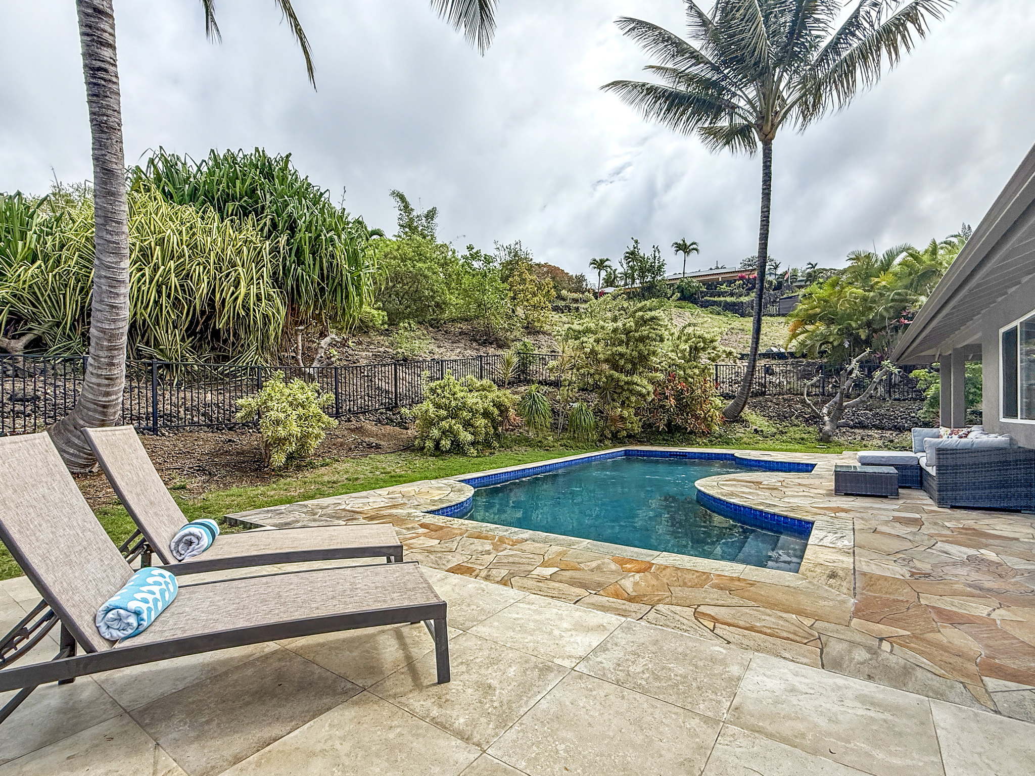 Enjoy comfortable living in this private, well-kept Ali'i Heights home with a backyard oasis and ocean view! The rear yard features a refreshing pool surrounded by quartzite decking and an abundance of "buffer space" from many of the neighboring properties. With covered lanai space, plus grassy spaces & nooks, there's an abundance of room for outdoor relaxation and entertaining. Although it's unlikely you'll grow tired of the gorgeous outdoor spaces, you can retreat to the interior of the home which features a large living room and kitchen with an island...both with airy, vaulted ceilings. Other features include: - Leased photovoltaic system with 21 panels and net metering - Ductless A/C units in the central area plus two bedrooms - New shingles (replaced June 2025) - Shaker-style kitchen cabinets - Solid granite countertops in the kitchen and both bathrooms - Ceramic tile throughout (one bedroom w/carpet) - Separate mud room/laundry room - 3-car garage - Fully-fenced side and rear yards - Vaulted ceilings in almost every room Located in a one of Kailua Kona's most desired neighborhoods, the property is just one-half of a mile from Ali'i Drive...within walking distance of the ocean. It's less than a mile to Magic Sands Beach Park where you can surf, swim or relax on the sand. And shopping and restaurants are just minutes away at Keauhou Shopping Center or in downtown/central Kona.
