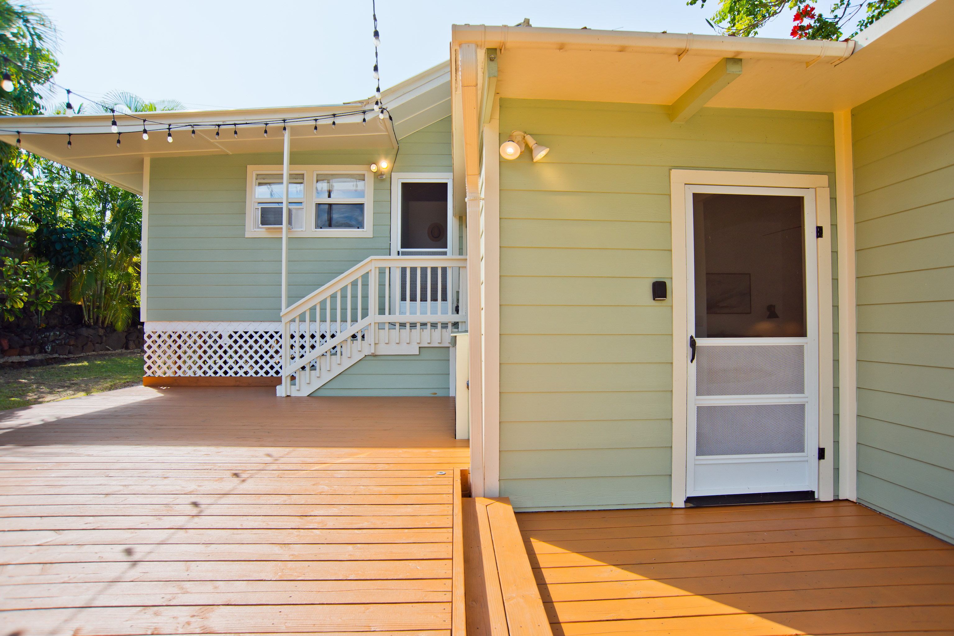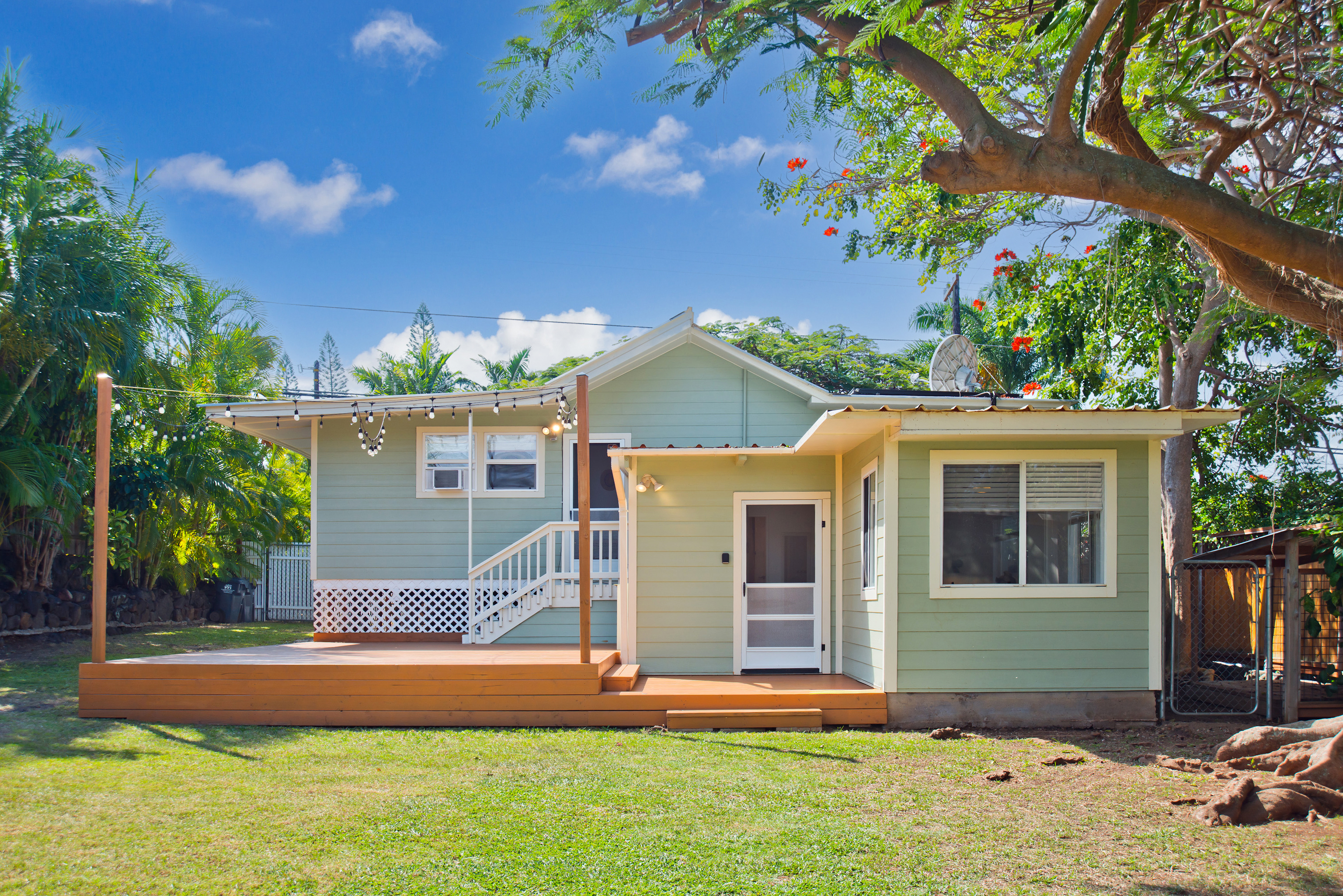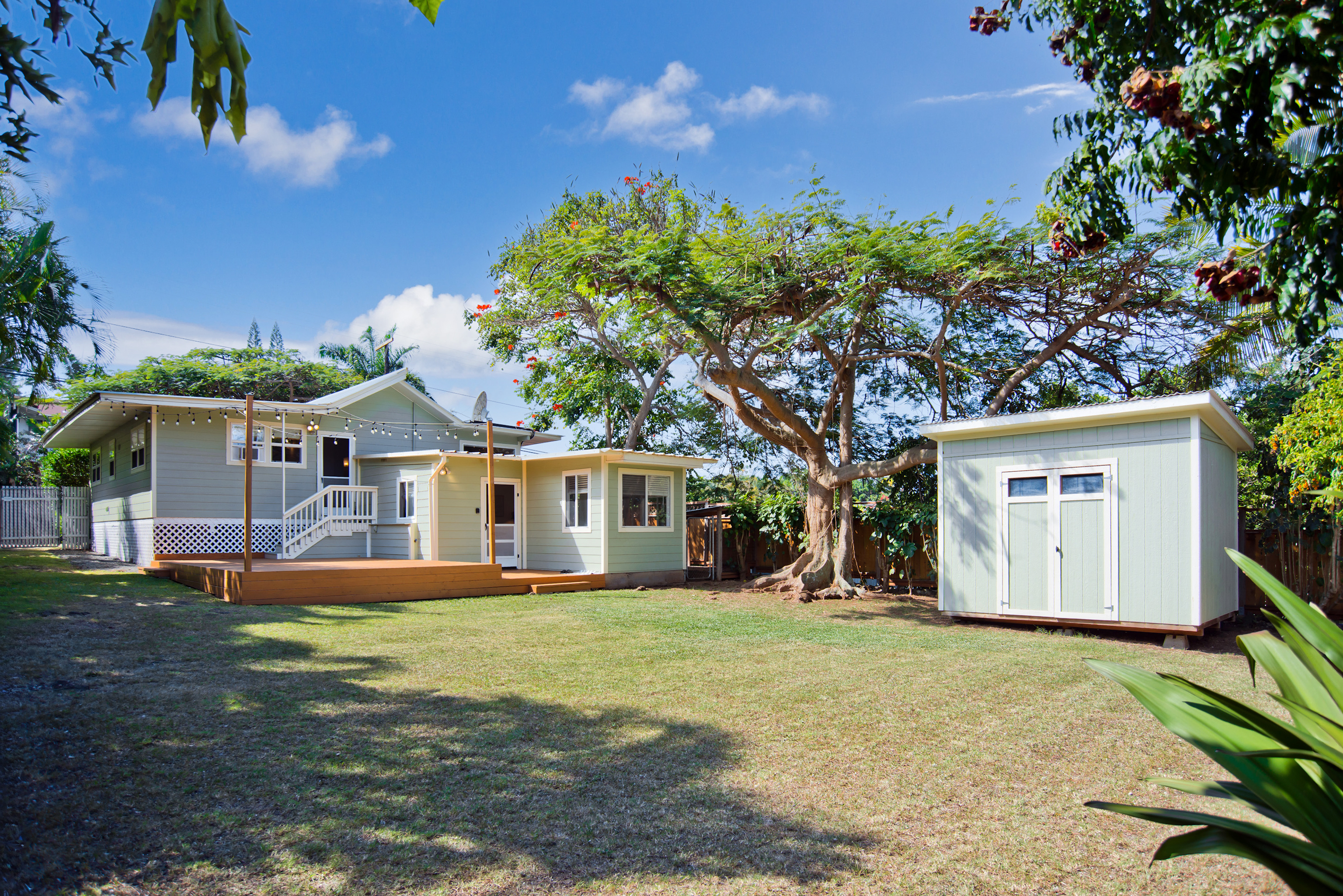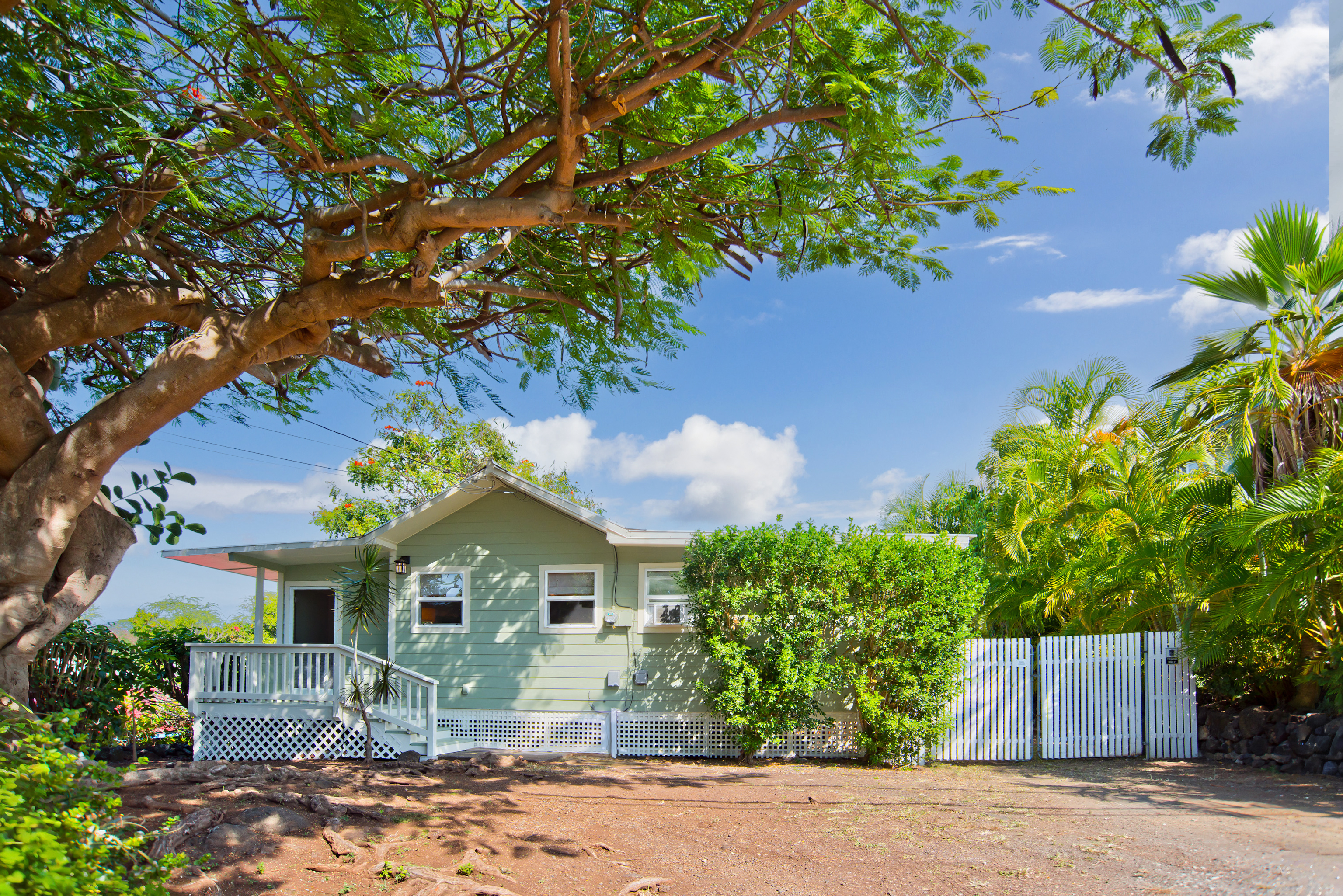 In the heart of Kailua Kona, sits this well-kept cottage with an ocean view and ohana. The charming main house has vaulted ceilings and an open floor plan, creating plenty of natural light. Ocean views may be seen from both the dining and kitchen windows. The spacious kitchen and living area are perfect for cooking and entertaining. The 2 bedrooms are flanked by 1 bathroom with bamboo flooring throughout and window AC units in every room. An in-home laundry station with brand new washer and dryer, and storage closet. Attached to the main home is an upgraded ohana/studio which holds a current short-term hosted rental permit. The Ohana has a separate entrance from the back deck/lanai with full bathroom, kitchenette, laminate flooring, inset closet space, and extra lounge space. This bonus room is ideal in establishing independence from the main home, whether for extended friends and family or for income purposes. Considerable backyard space includes a generous lawn, pet kennel/run, ample sized shed for storage or landscaping equipment, and an expansive deck for relaxing or hosting gatherings. Tropical foliage and fruit trees line the fully fenced in yard and an exquisite Royal Ponciano tree add to the natural island scenery. This property is optimal for those who want convenient access into downtown Kailua Kona's shops, restaurants, and beaches, while having easy entry onto the highway. Fitting for a primary residence, second home, or investment opportunity, this property offers enjoyable upgrades, privacy, and move-in readiness. No HOA and no monthly dues.