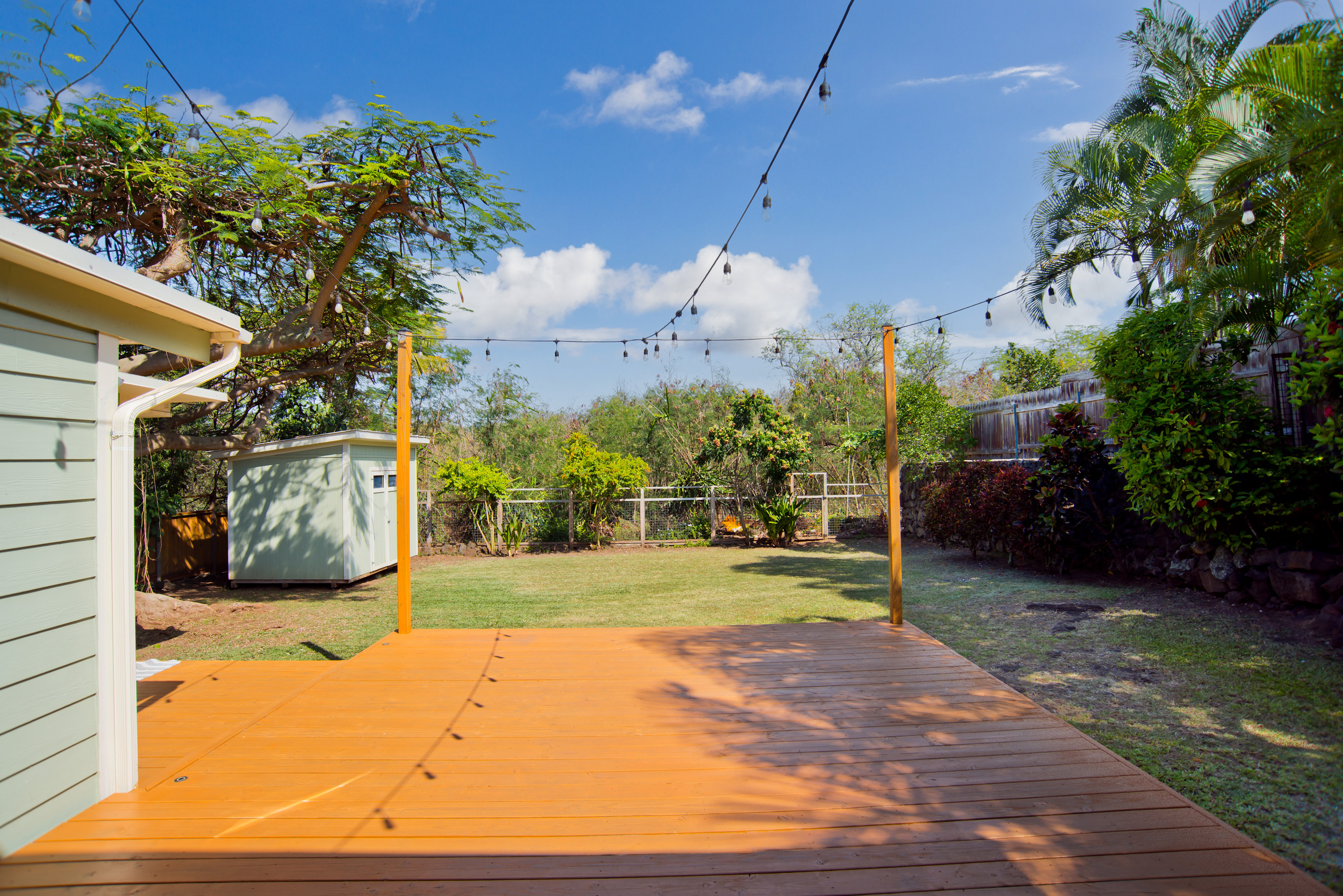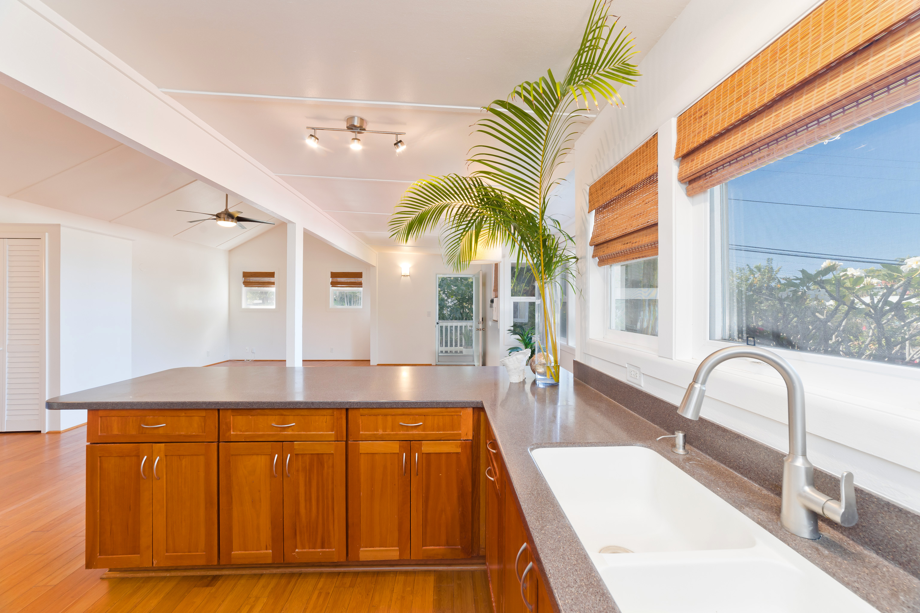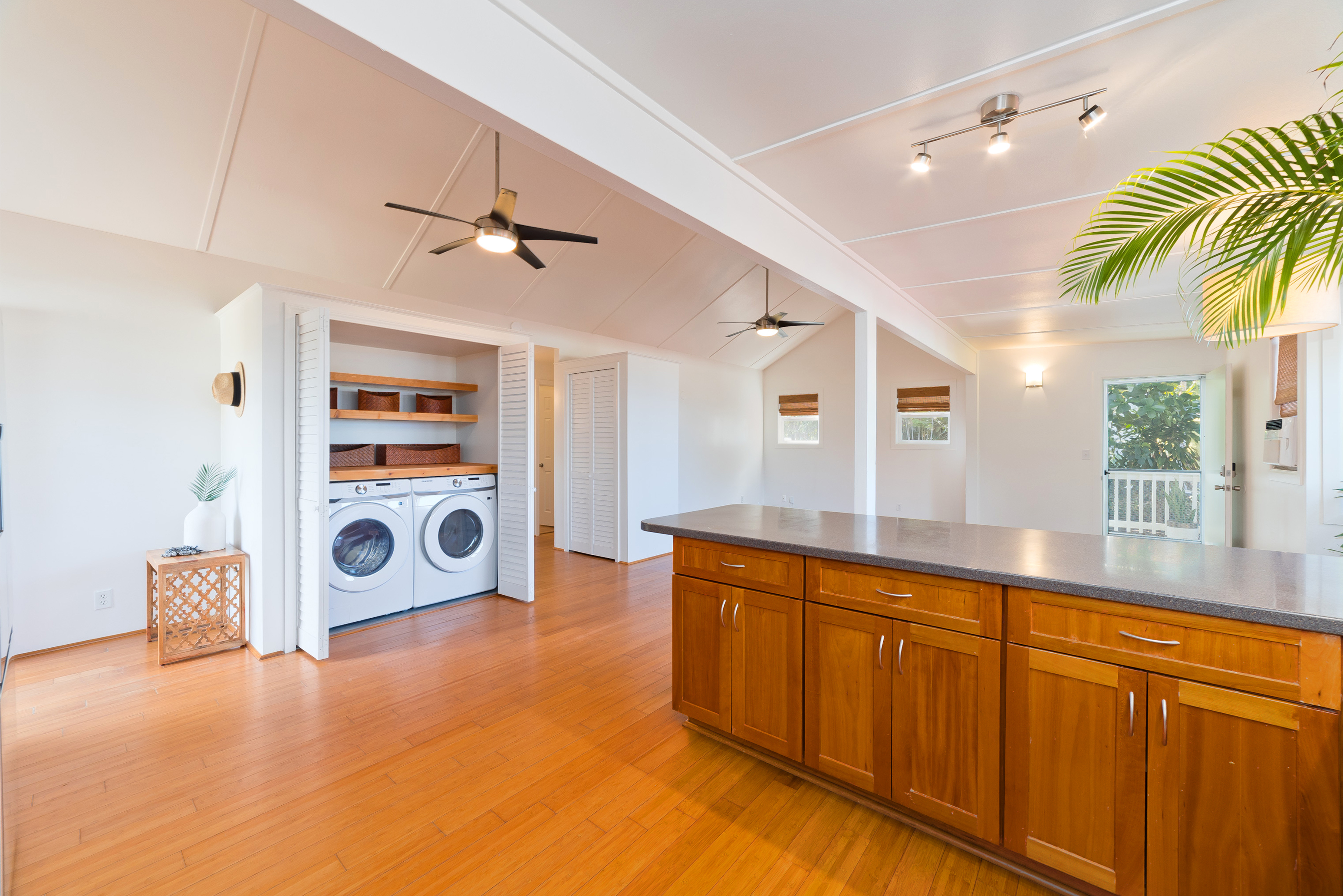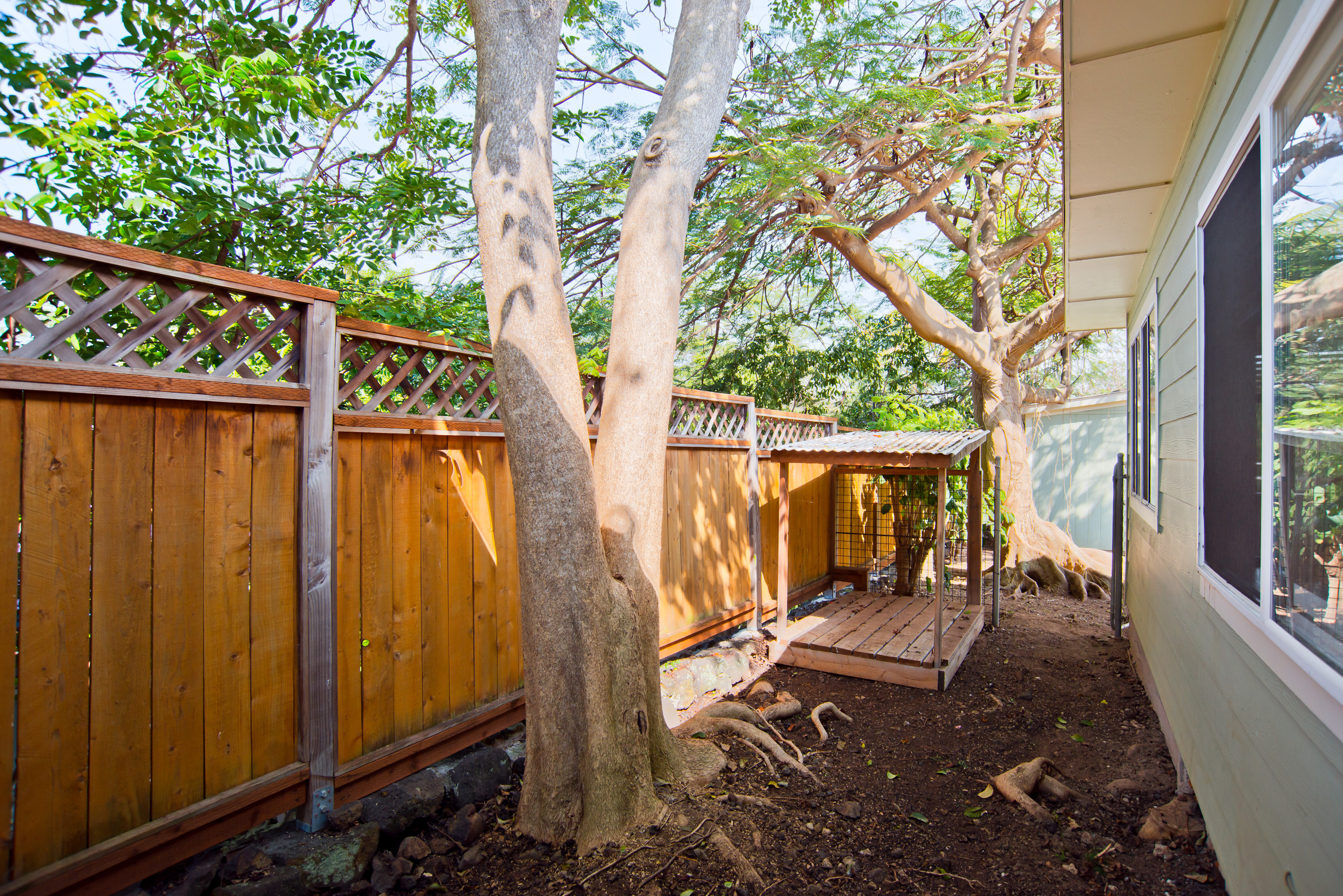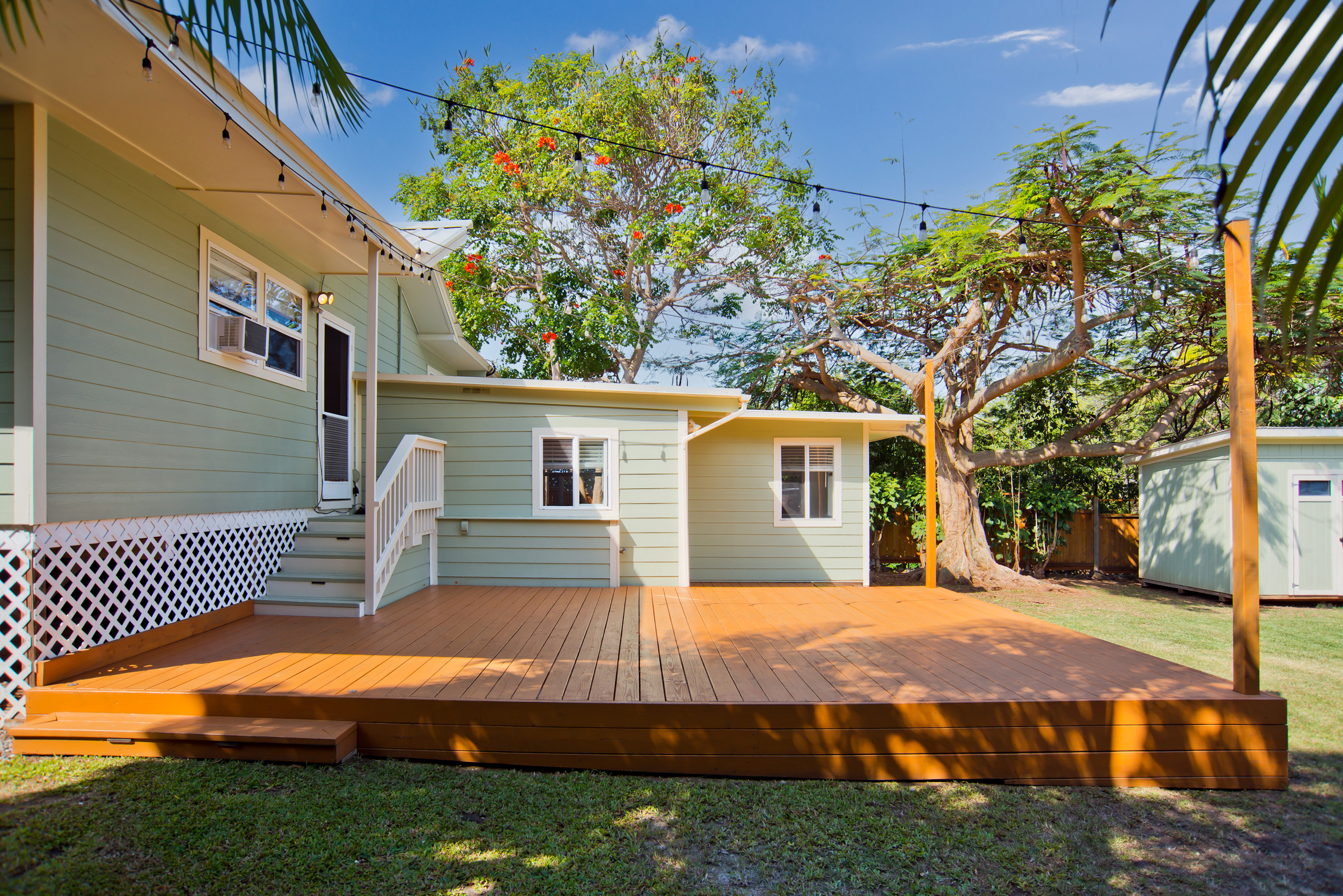 In the heart of Kailua Kona, sits this well-kept cottage with an ocean view and ohana. The charming main house has vaulted ceilings and an open floor plan, creating plenty of natural light. Ocean views may be seen from both the dining and kitchen windows. The spacious kitchen and living area are perfect for cooking and entertaining. The 2 bedrooms are flanked by 1 bathroom with bamboo flooring throughout and window AC units in every room. An in-home laundry station with brand new washer and dryer, and storage closet. Attached to the main home is an upgraded ohana/studio which holds a current short-term hosted rental permit. The Ohana has a separate entrance from the back deck/lanai with full bathroom, kitchenette, laminate flooring, inset closet space, and extra lounge space. This bonus room is ideal in establishing independence from the main home, whether for extended friends and family or for income purposes. Considerable backyard space includes a generous lawn, pet kennel/run, ample sized shed for storage or landscaping equipment, and an expansive deck for relaxing or hosting gatherings. Tropical foliage and fruit trees line the fully fenced in yard and an exquisite Royal Ponciano tree add to the natural island scenery. This property is optimal for those who want convenient access into downtown Kailua Kona's shops, restaurants, and beaches, while having easy entry onto the highway. Fitting for a primary residence, second home, or investment opportunity, this property offers enjoyable upgrades, privacy, and move-in readiness. No HOA and no monthly dues.
