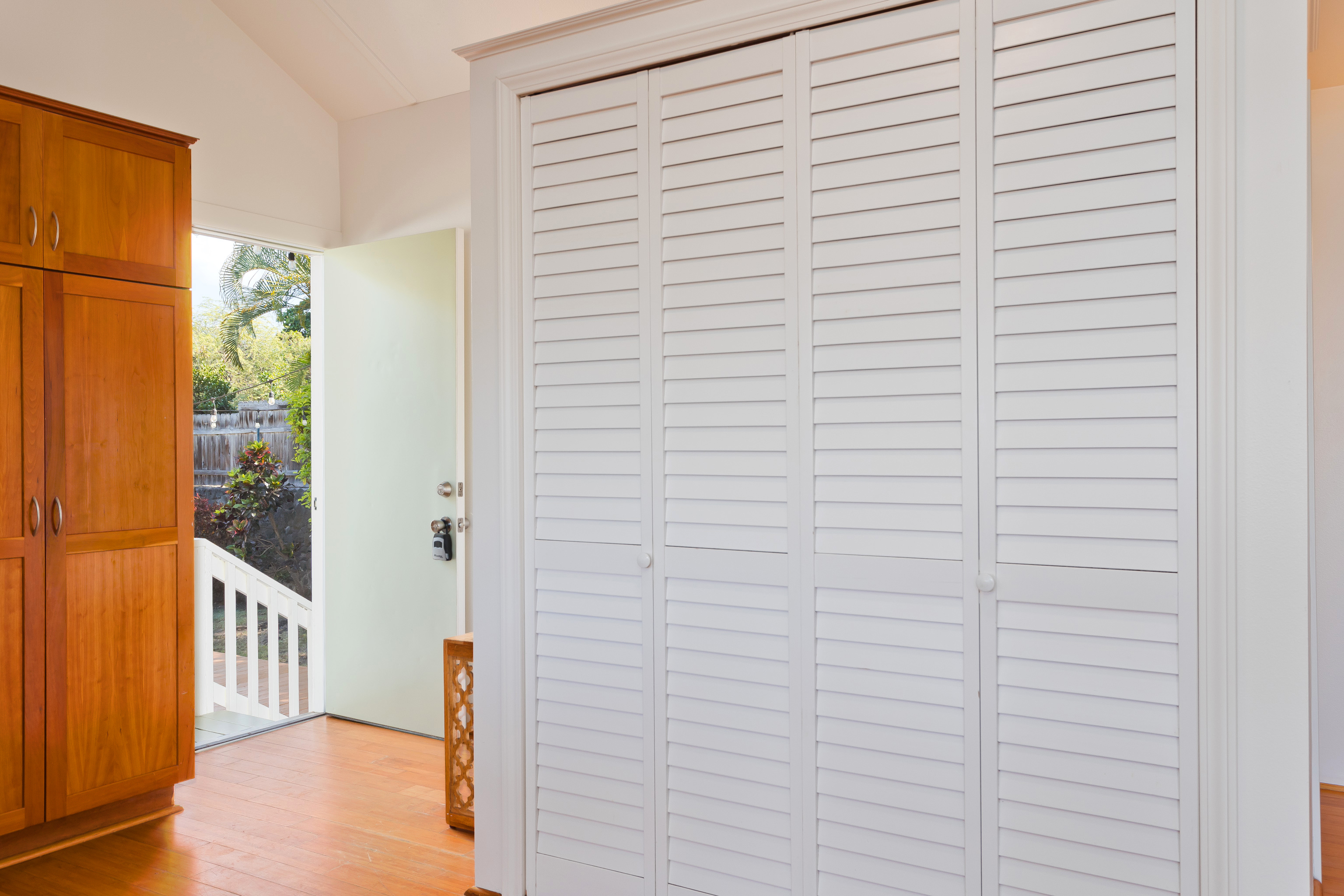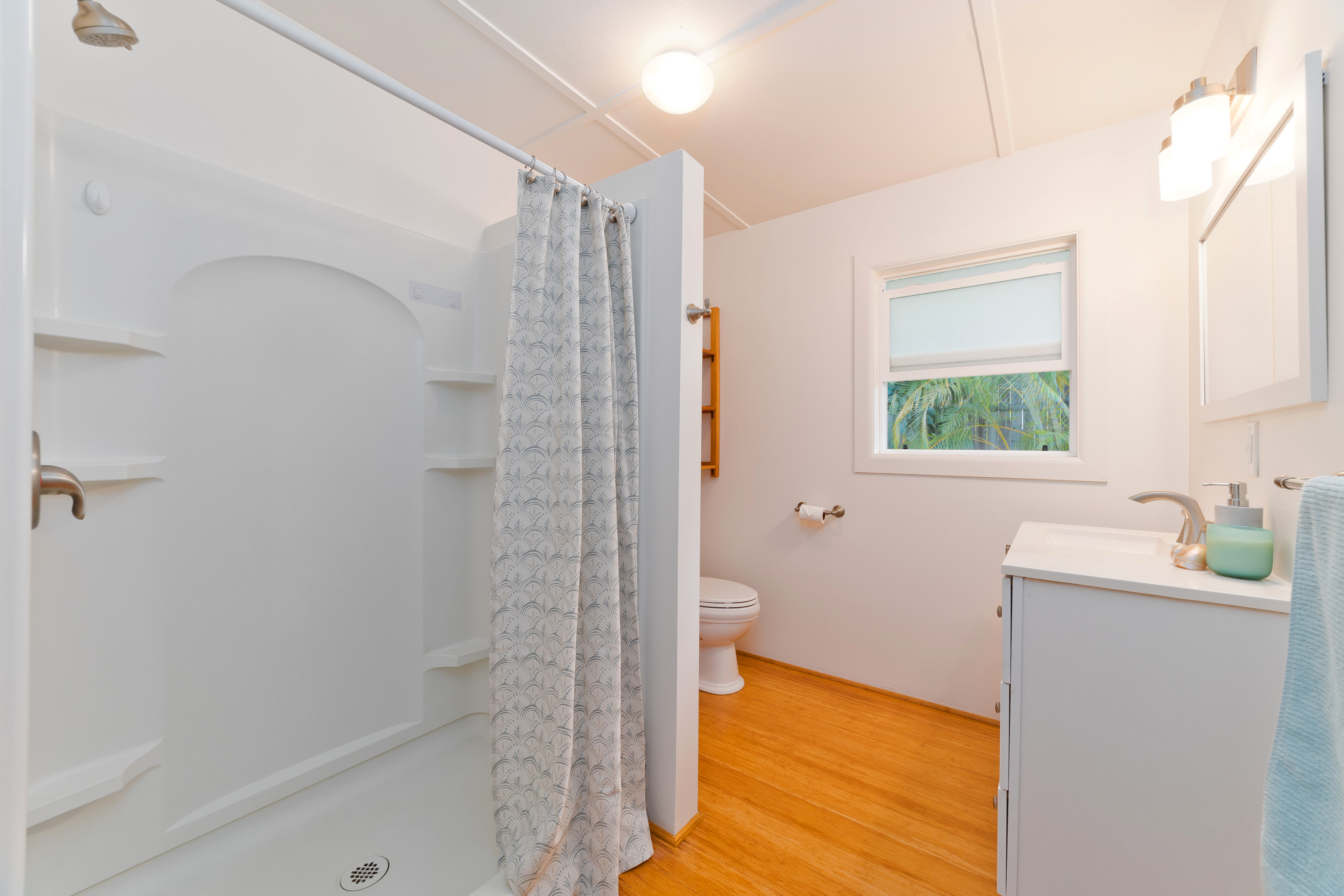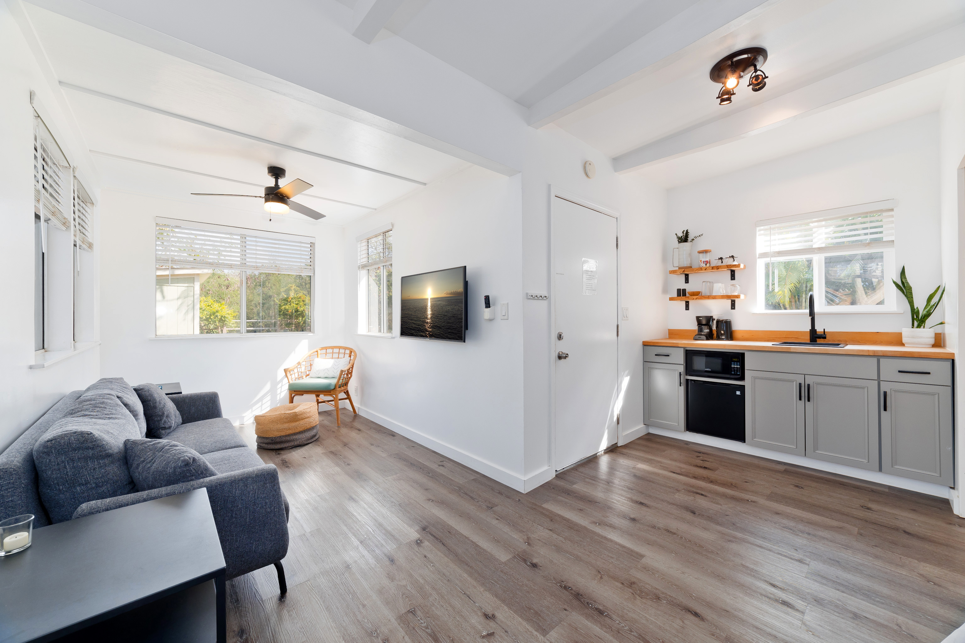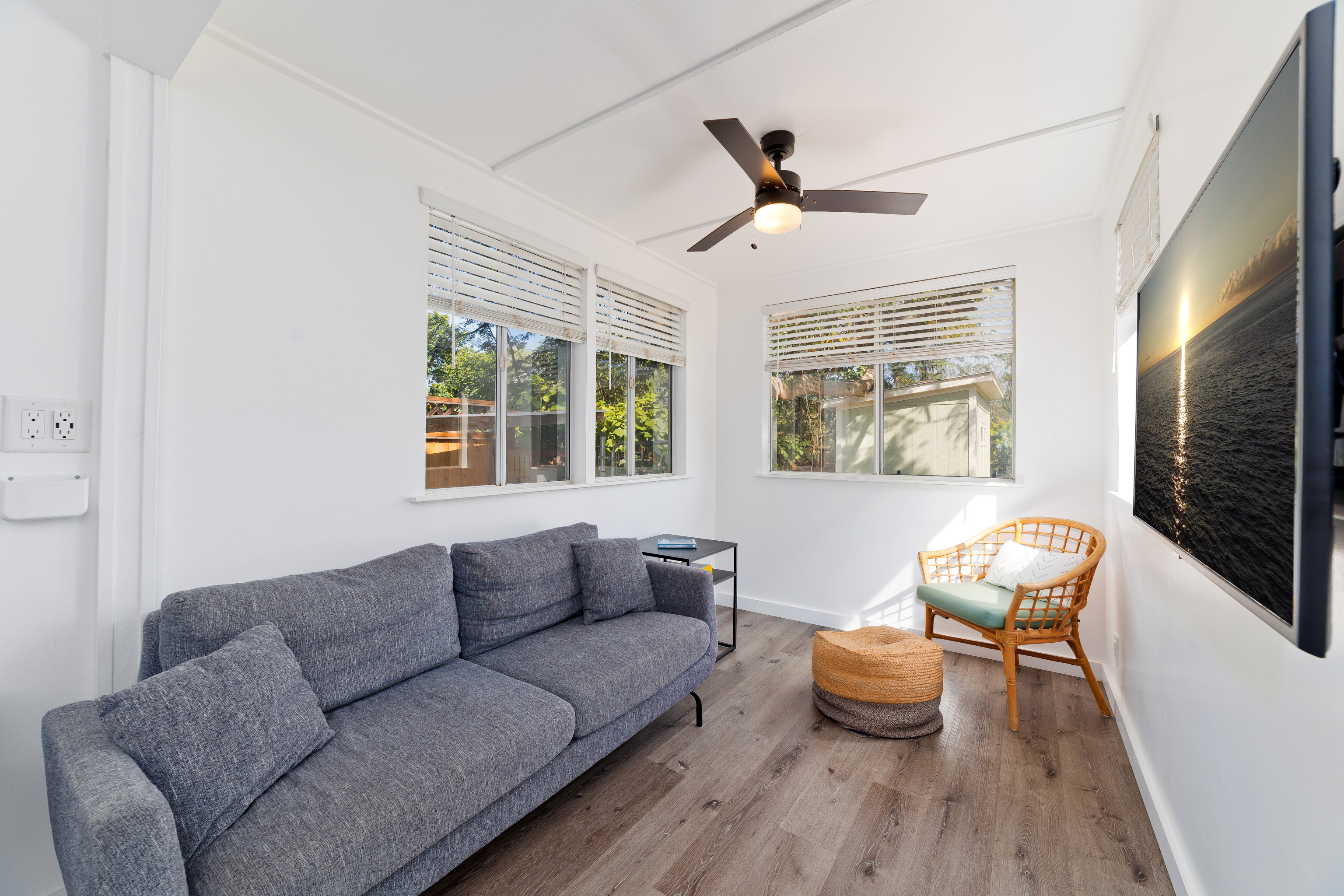In the heart of Kailua Kona, sits this well-kept cottage with an ocean view and ohana. The charming main house has vaulted ceilings and an open floor plan, creating plenty of natural light. Ocean views may be seen from both the dining and kitchen windows. The spacious kitchen and living area are perfect for cooking and entertaining. The 2 bedrooms are flanked by 1 bathroom with bamboo flooring throughout and window AC units in every room. An in-home laundry station with brand new washer and dryer, and storage closet. Attached to the main home is an upgraded ohana/studio which holds a current short-term hosted rental permit. The Ohana has a separate entrance from the back deck/lanai with full bathroom, kitchenette, laminate flooring, inset closet space, and extra lounge space. This bonus room is ideal in establishing independence from the main home, whether for extended friends and family or for income purposes. Considerable backyard space includes a generous lawn, pet kennel/run, ample sized shed for storage or landscaping equipment, and an expansive deck for relaxing or hosting gatherings. Tropical foliage and fruit trees line the fully fenced in yard and an exquisite Royal Ponciano tree add to the natural island scenery. This property is optimal for those who want convenient access into downtown Kailua Kona's shops, restaurants, and beaches, while having easy entry onto the highway. Fitting for a primary residence, second home, or investment opportunity, this property offers enjoyable upgrades, privacy, and move-in readiness. No HOA and no monthly dues.