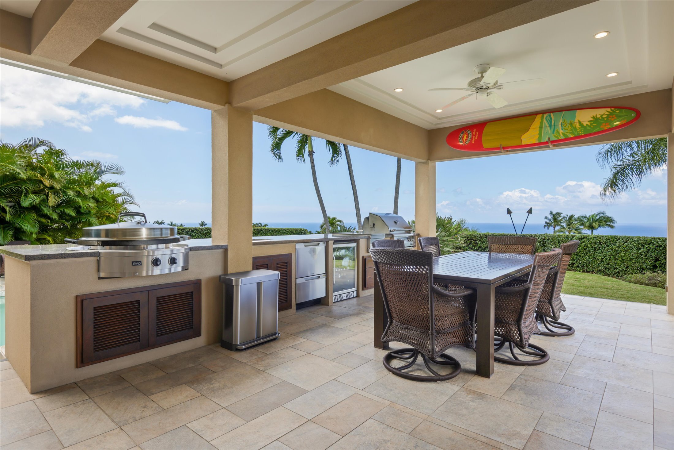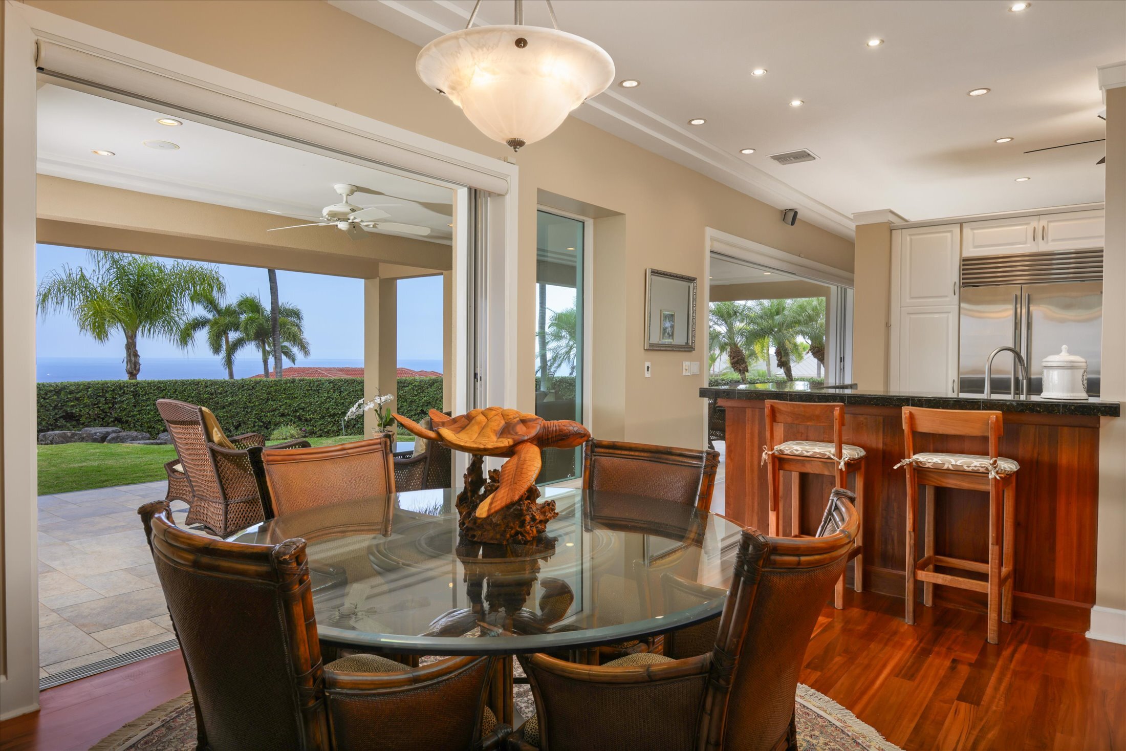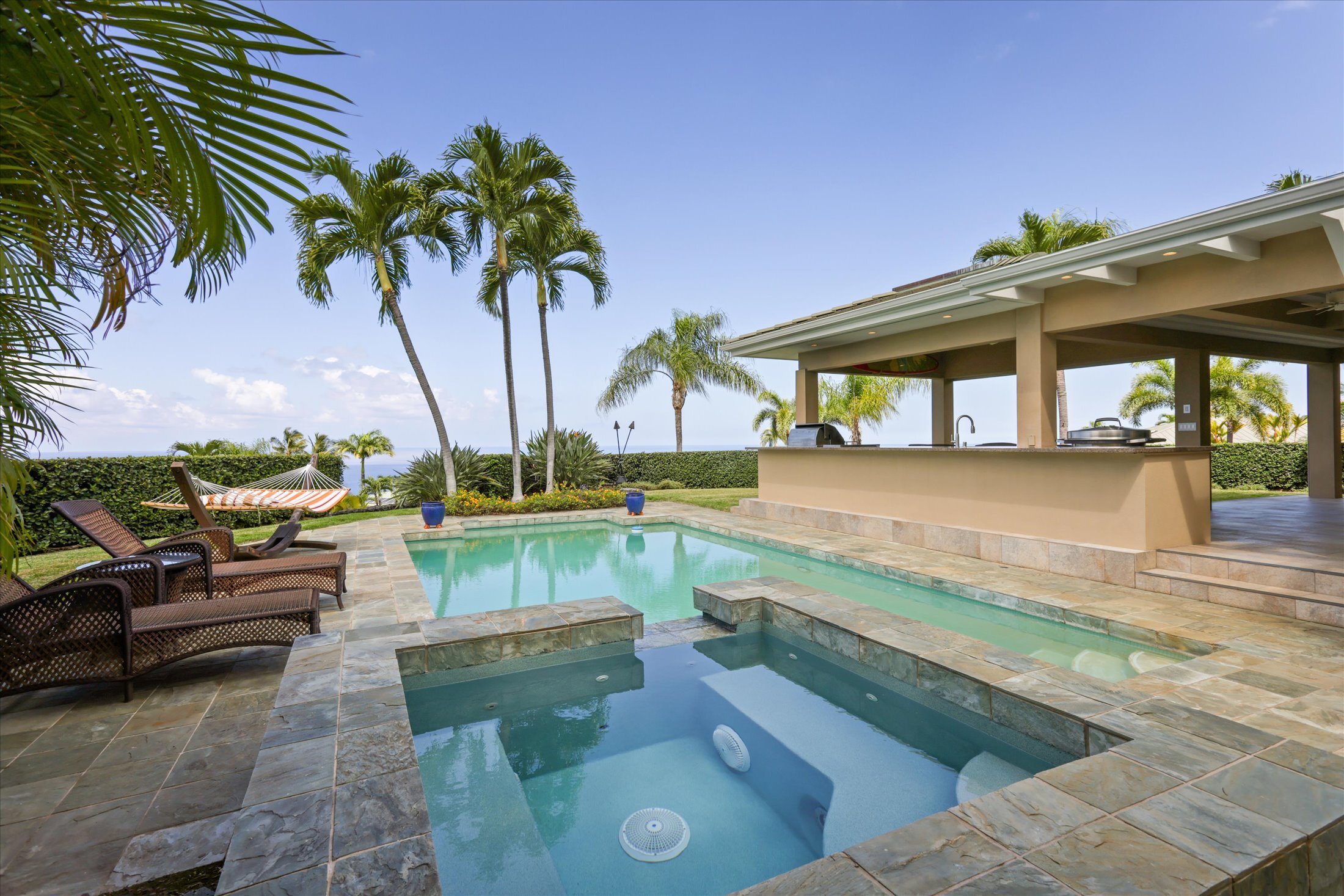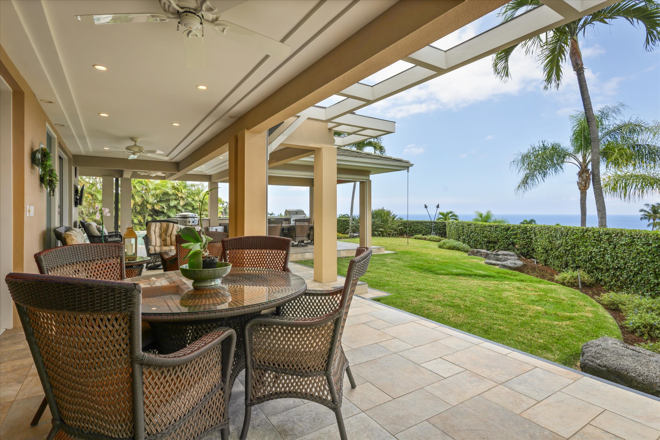 Commanding an exceptional vantage point within the gated enclave of Bayview Estates in Keauhou, this refined island residence captures sweeping panoramic ocean views spanning more than 180 degrees–delivering unforgettable sunsets, seasonal whale watching, and a daily connection to the Pacific that defines Kona Coast living. Being offered furnished and originally the developer’s model home, the property enjoys a premier location selected for its elevation, orientation, and expansive view corridors. A rare short, level driveway provides effortless access and everyday convenience. Designed for seamless indoor—outdoor living, expansive pocket doors open to a generous covered lanai with an outdoor kitchen and dining area–an ideal setting for entertaining against a dramatic ocean backdrop. The outdoor setting is further enhanced by a resort-style pool and spa, solar-heated for year-round comfort, creating a private retreat to relax and take in Kona’s iconic sunsets. Inside, Brazilian Tigerwood hardwood floors and granite surfaces create a warm, refined aesthetic. The chef’s kitchen features premium appliances, including Wolf, Sub-Zero, and Cove, complemented by extensive smart home upgrades with app-controlled irrigation, retractable sun shades, electronic blinds and entry features. Additional highlights include central air conditioning, an air-conditioned garage, a comprehensive security system, and dedicated electrical capacity for EV charging. Bayview Estates is a private gated community near Keauhou Bay, shopping, dining, golf, and ocean activities–offering privacy, convenience, and the best of island living.