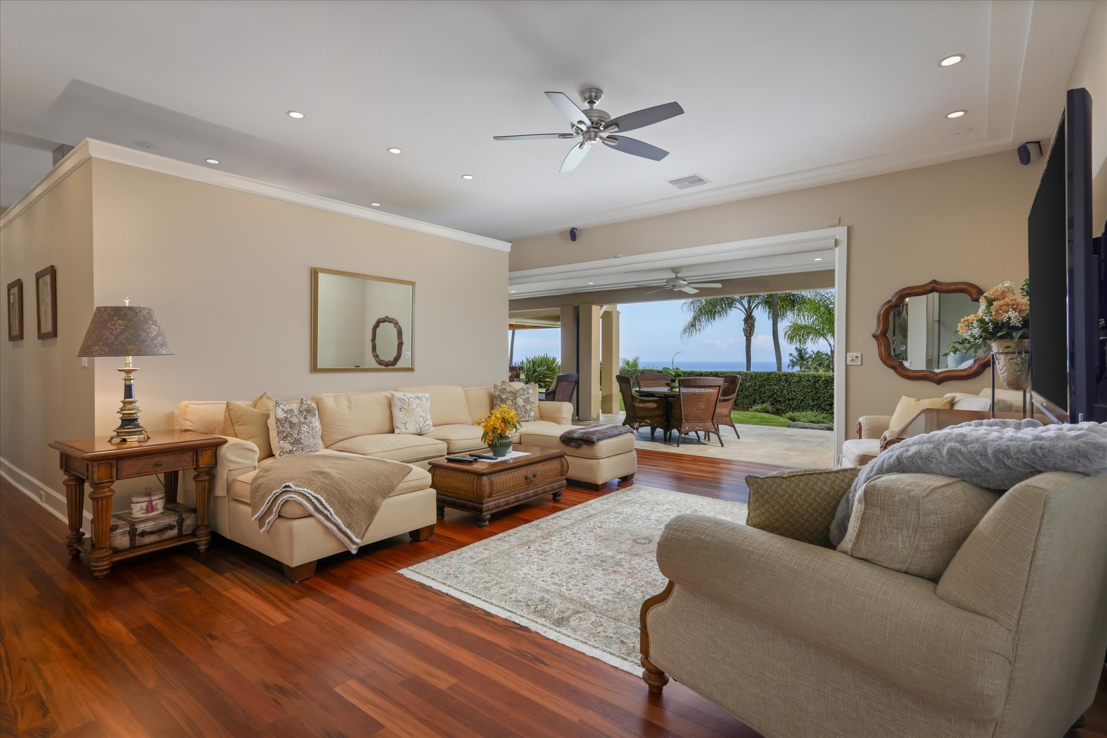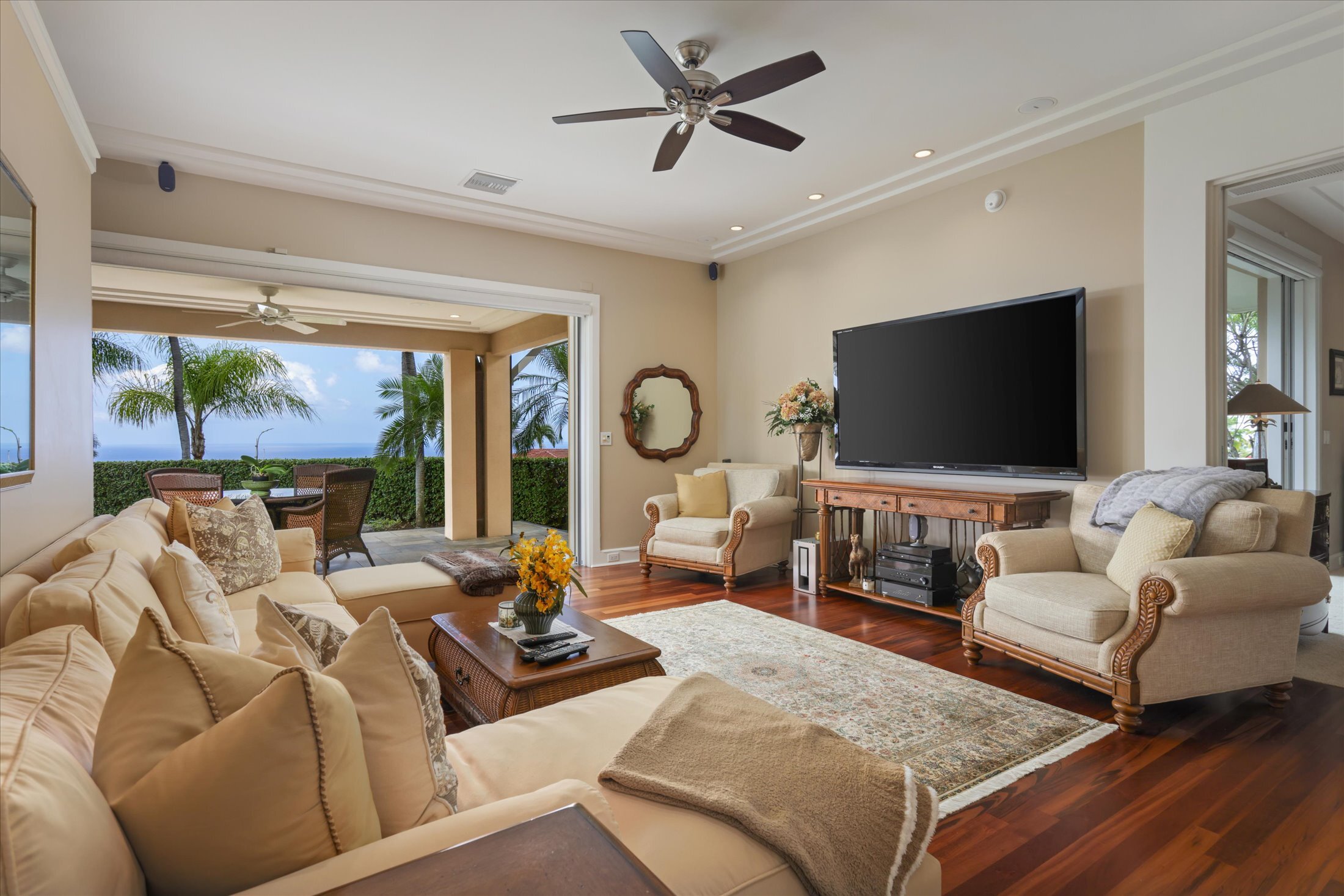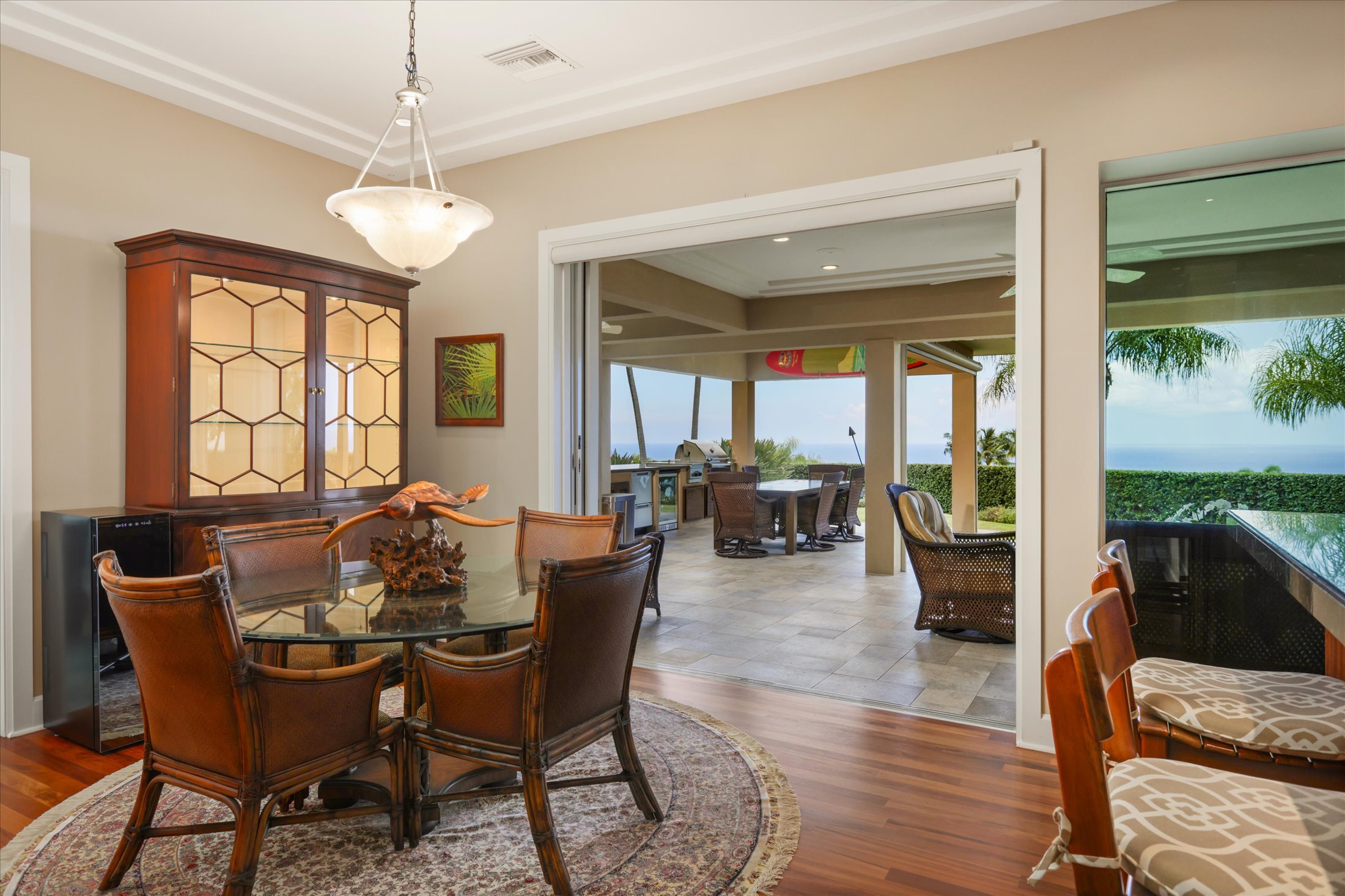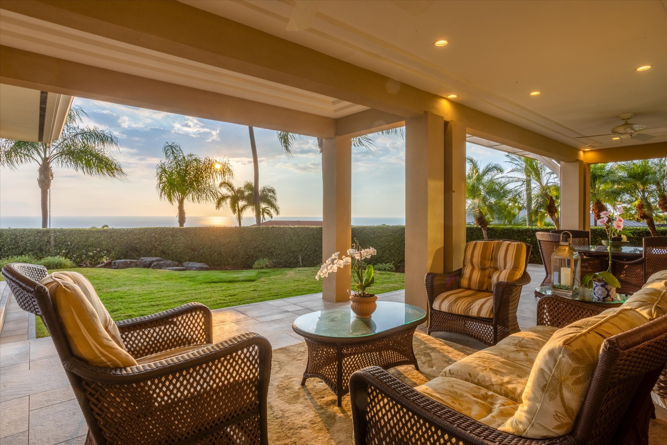 Commanding an exceptional vantage point within the gated enclave of Bayview Estates in Keauhou, this refined island residence captures sweeping panoramic ocean views spanning more than 180 degrees–delivering unforgettable sunsets, seasonal whale watching, and a daily connection to the Pacific that defines Kona Coast living. Being offered furnished and originally the developer’s model home, the property enjoys a premier location selected for its elevation, orientation, and expansive view corridors. A rare short, level driveway provides effortless access and everyday convenience. Designed for seamless indoor—outdoor living, expansive pocket doors open to a generous covered lanai with an outdoor kitchen and dining area–an ideal setting for entertaining against a dramatic ocean backdrop. The outdoor setting is further enhanced by a resort-style pool and spa, solar-heated for year-round comfort, creating a private retreat to relax and take in Kona’s iconic sunsets. Inside, Brazilian Tigerwood hardwood floors and granite surfaces create a warm, refined aesthetic. The chef’s kitchen features premium appliances, including Wolf, Sub-Zero, and Cove, complemented by extensive smart home upgrades with app-controlled irrigation, retractable sun shades, electronic blinds and entry features. Additional highlights include central air conditioning, an air-conditioned garage, a comprehensive security system, and dedicated electrical capacity for EV charging. Bayview Estates is a private gated community near Keauhou Bay, shopping, dining, golf, and ocean activities–offering privacy, convenience, and the best of island living.