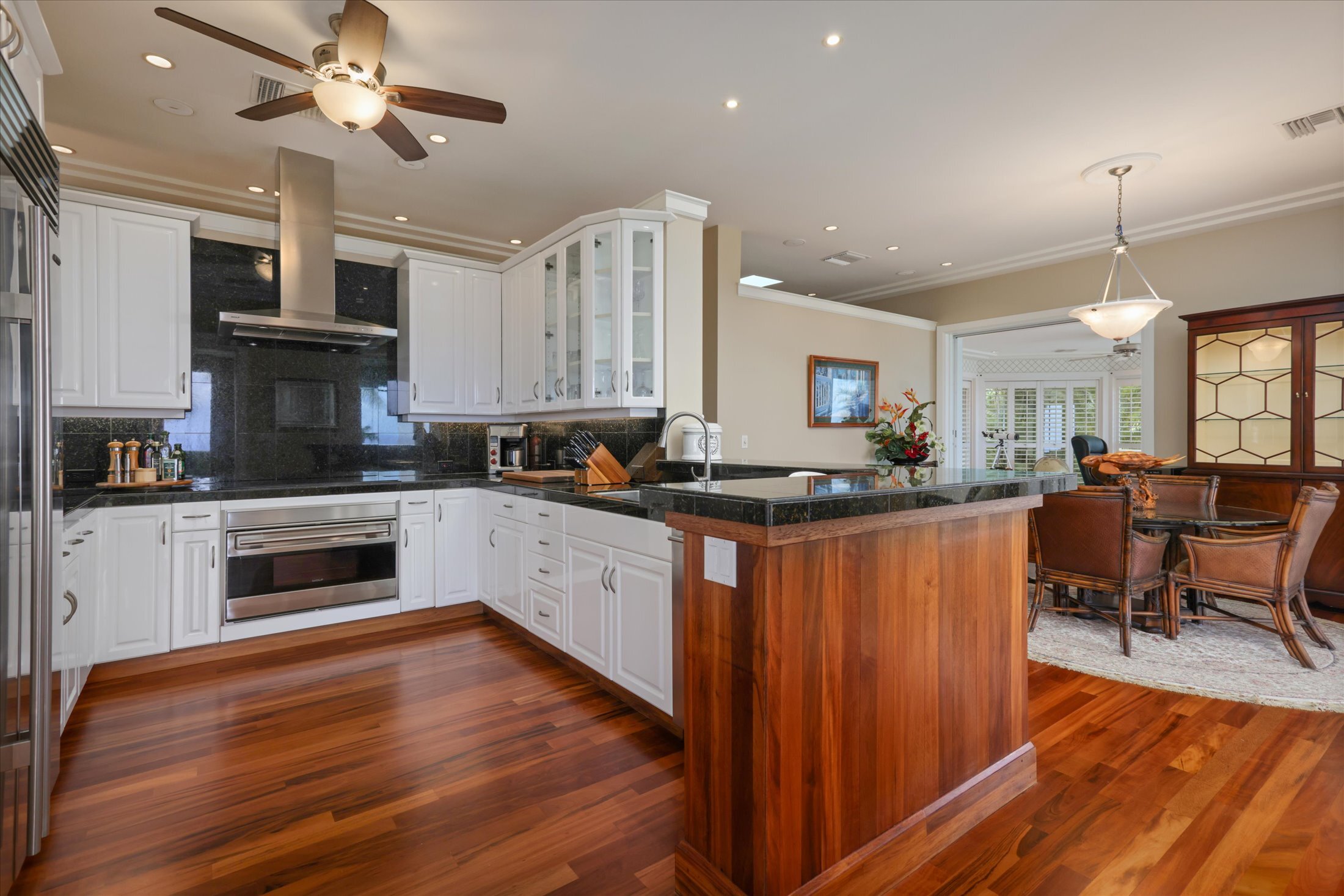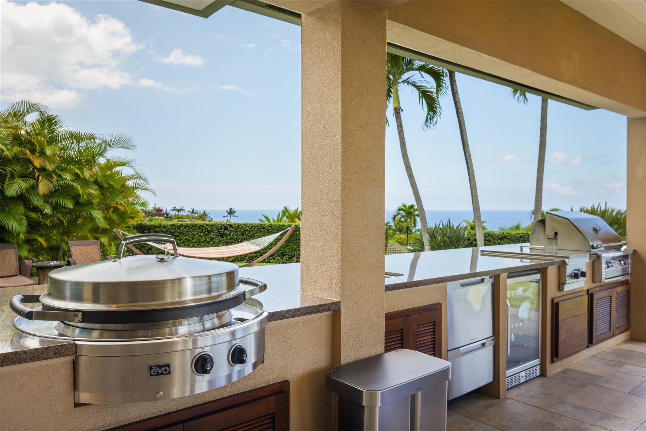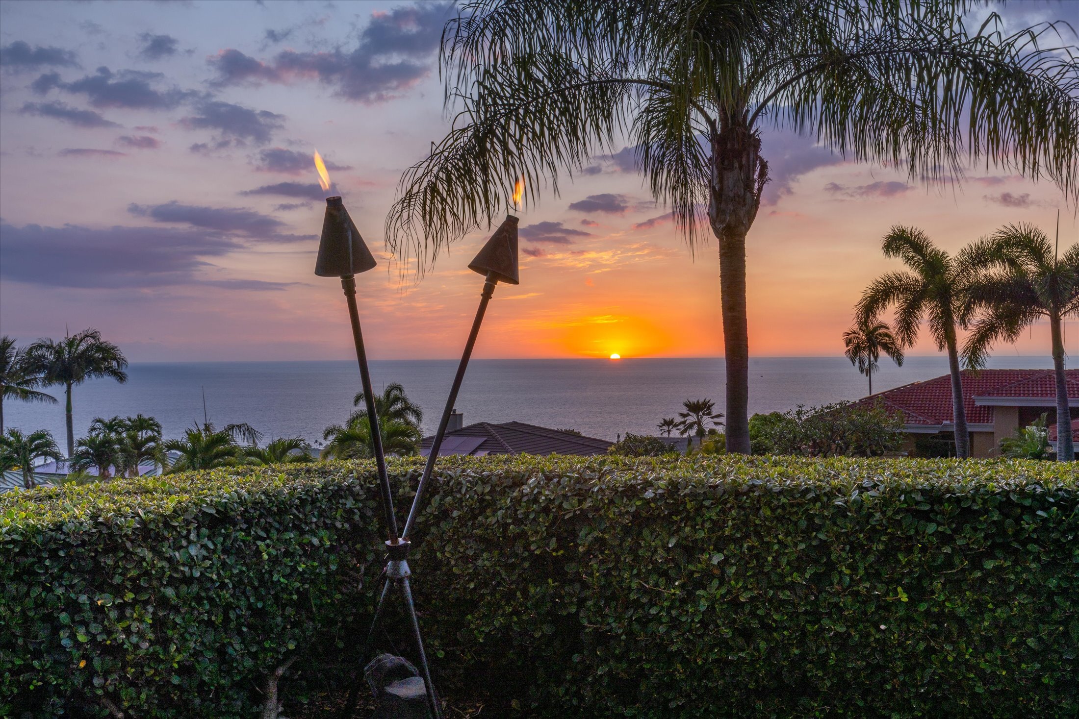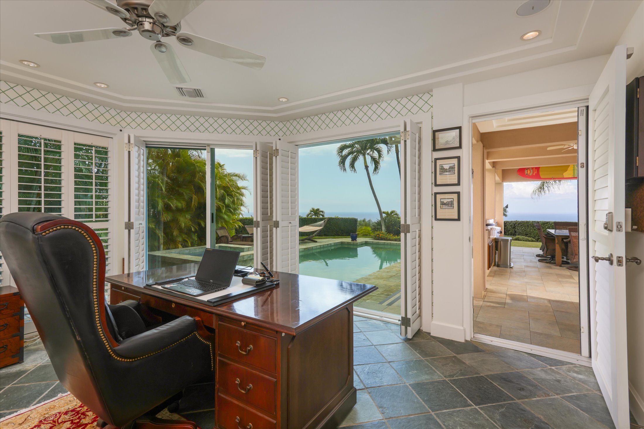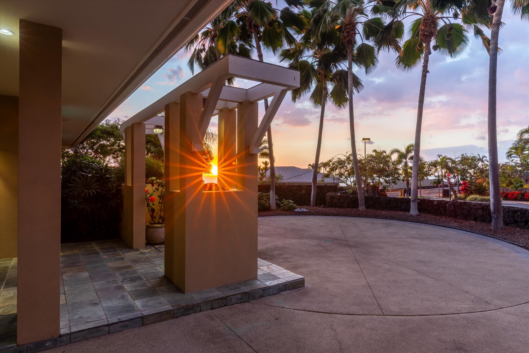 Commanding an exceptional vantage point within the gated enclave of Bayview Estates in Keauhou, this refined island residence captures sweeping panoramic ocean views spanning more than 180 degrees–delivering unforgettable sunsets, seasonal whale watching, and a daily connection to the Pacific that defines Kona Coast living. Being offered furnished and originally the developer’s model home, the property enjoys a premier location selected for its elevation, orientation, and expansive view corridors. A rare short, level driveway provides effortless access and everyday convenience. Designed for seamless indoor—outdoor living, expansive pocket doors open to a generous covered lanai with an outdoor kitchen and dining area–an ideal setting for entertaining against a dramatic ocean backdrop. The outdoor setting is further enhanced by a resort-style pool and spa, solar-heated for year-round comfort, creating a private retreat to relax and take in Kona’s iconic sunsets. Inside, Brazilian Tigerwood hardwood floors and granite surfaces create a warm, refined aesthetic. The chef’s kitchen features premium appliances, including Wolf, Sub-Zero, and Cove, complemented by extensive smart home upgrades with app-controlled irrigation, retractable sun shades, electronic blinds and entry features. Additional highlights include central air conditioning, an air-conditioned garage, a comprehensive security system, and dedicated electrical capacity for EV charging. Bayview Estates is a private gated community near Keauhou Bay, shopping, dining, golf, and ocean activities–offering privacy, convenience, and the best of island living.