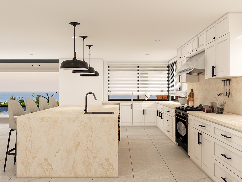 The four-bedroom, four-and-a-half-bath design centers on open living and unobstructed ocean views. The great room features a limestone accent wall and a 22-foot pocket door opening to the lanai and 50-foot pool with waterfall, fire, and baja bench.
