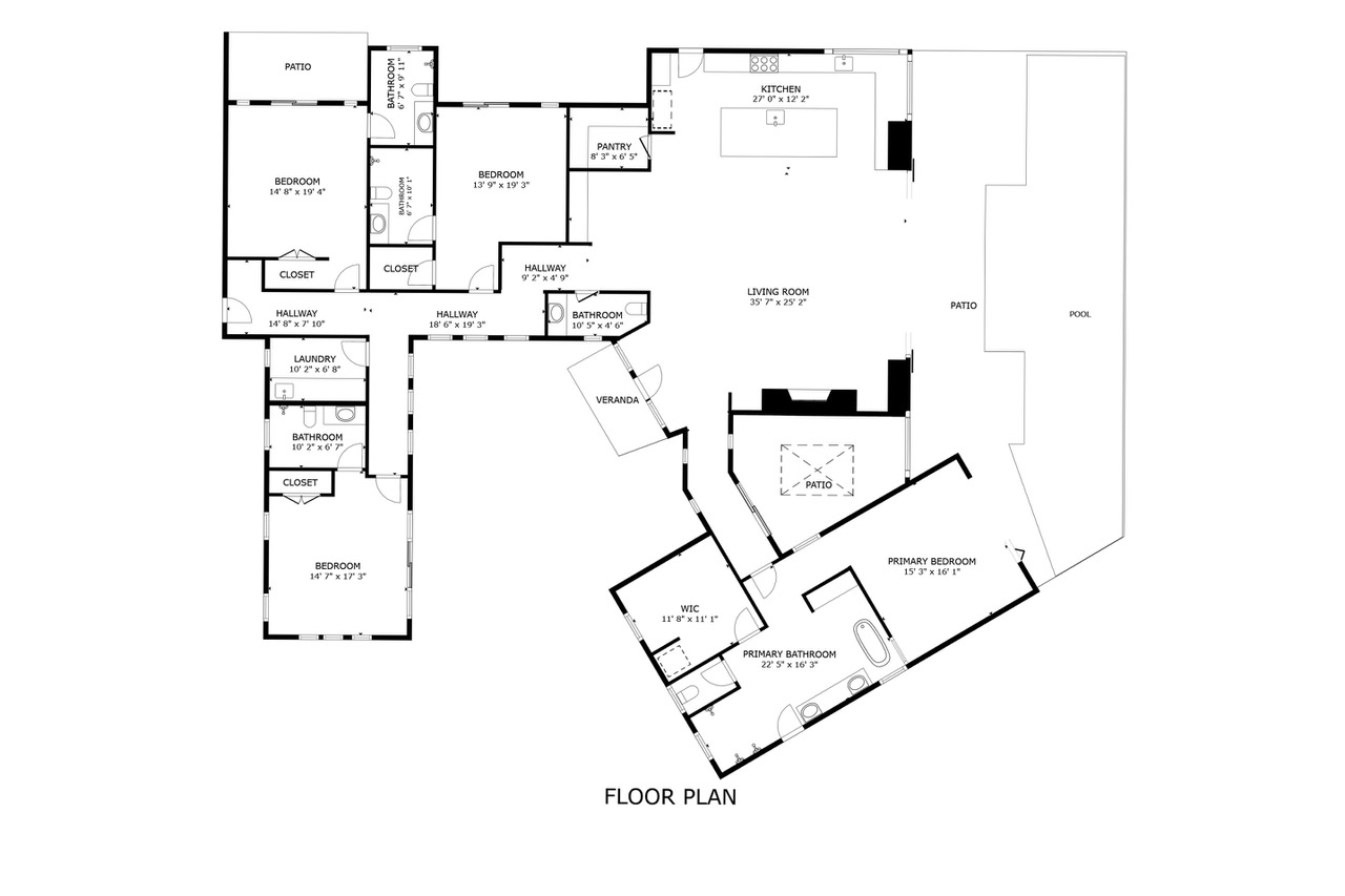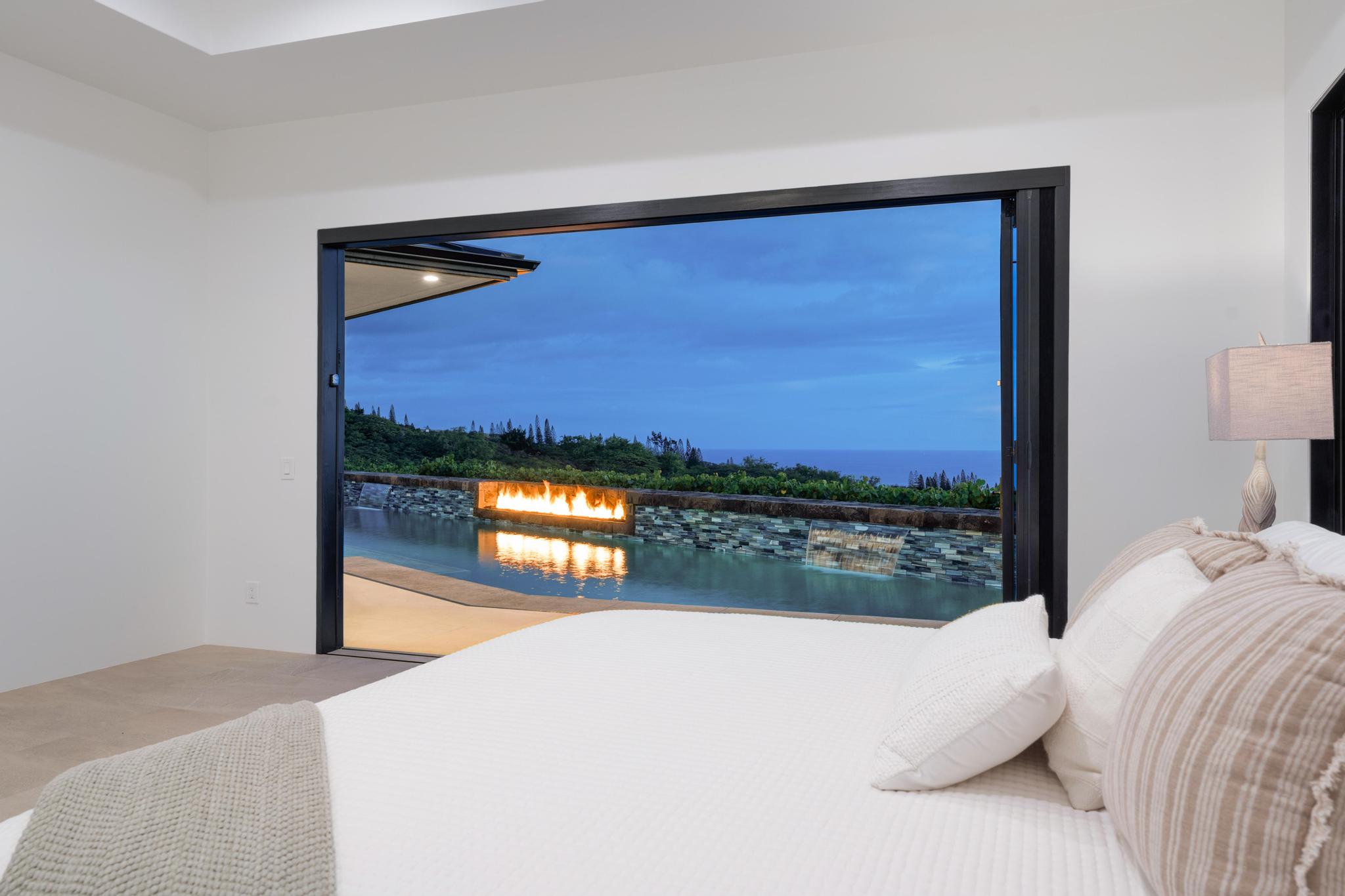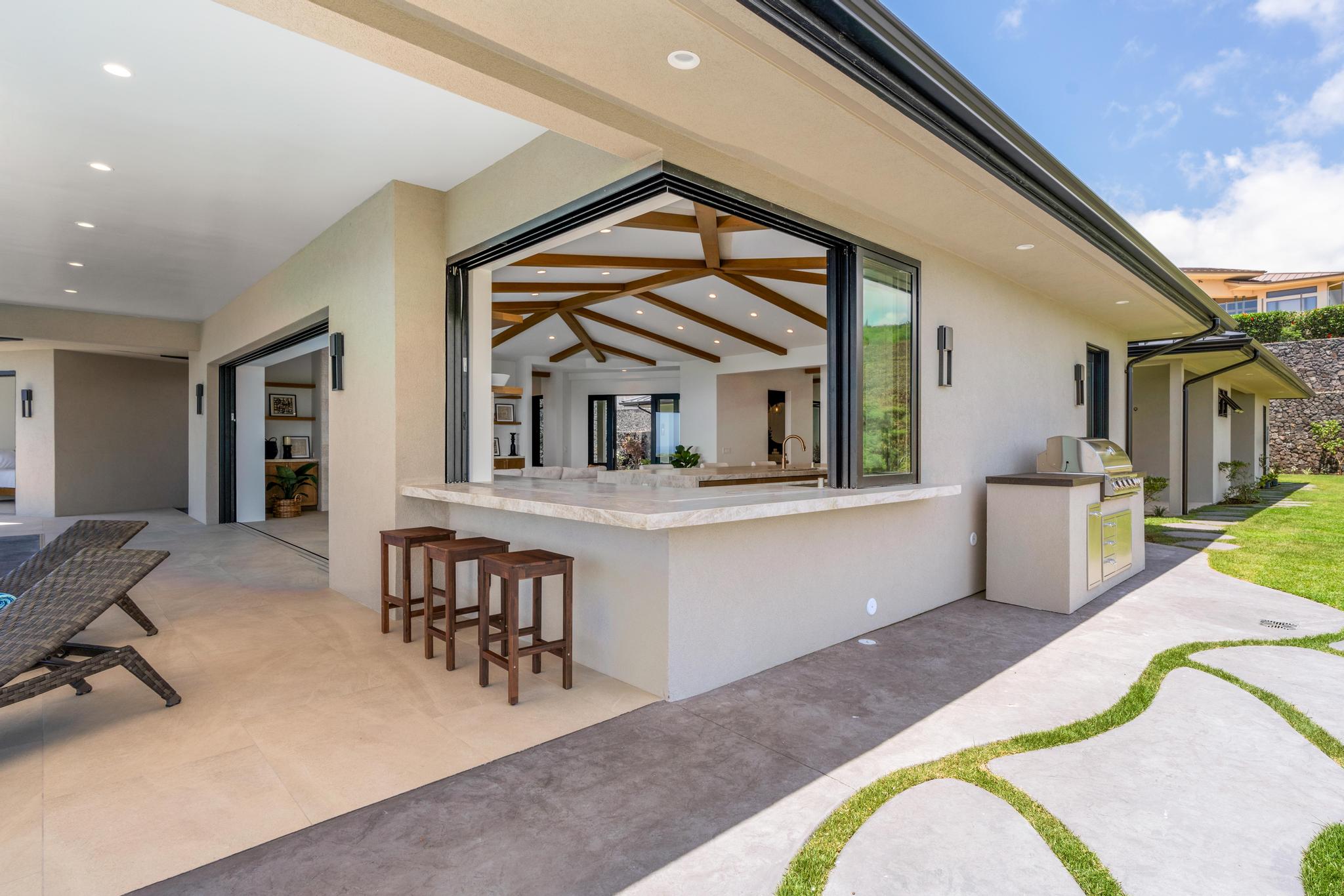 The chef’s kitchen is an entertainer’s dream with a Taj Mahal quartz waterfall island with seating for six people, high-end appliances, a wet bar, wine cooler, and a generous pass-through window for easy indoor-outdoor dining. The lanai features a built-in BBQ and is steps away from the 59-foot lap pool with a specialty fire feature, waterfall and Baja bench–perfect for lounging or moonlit dips.
