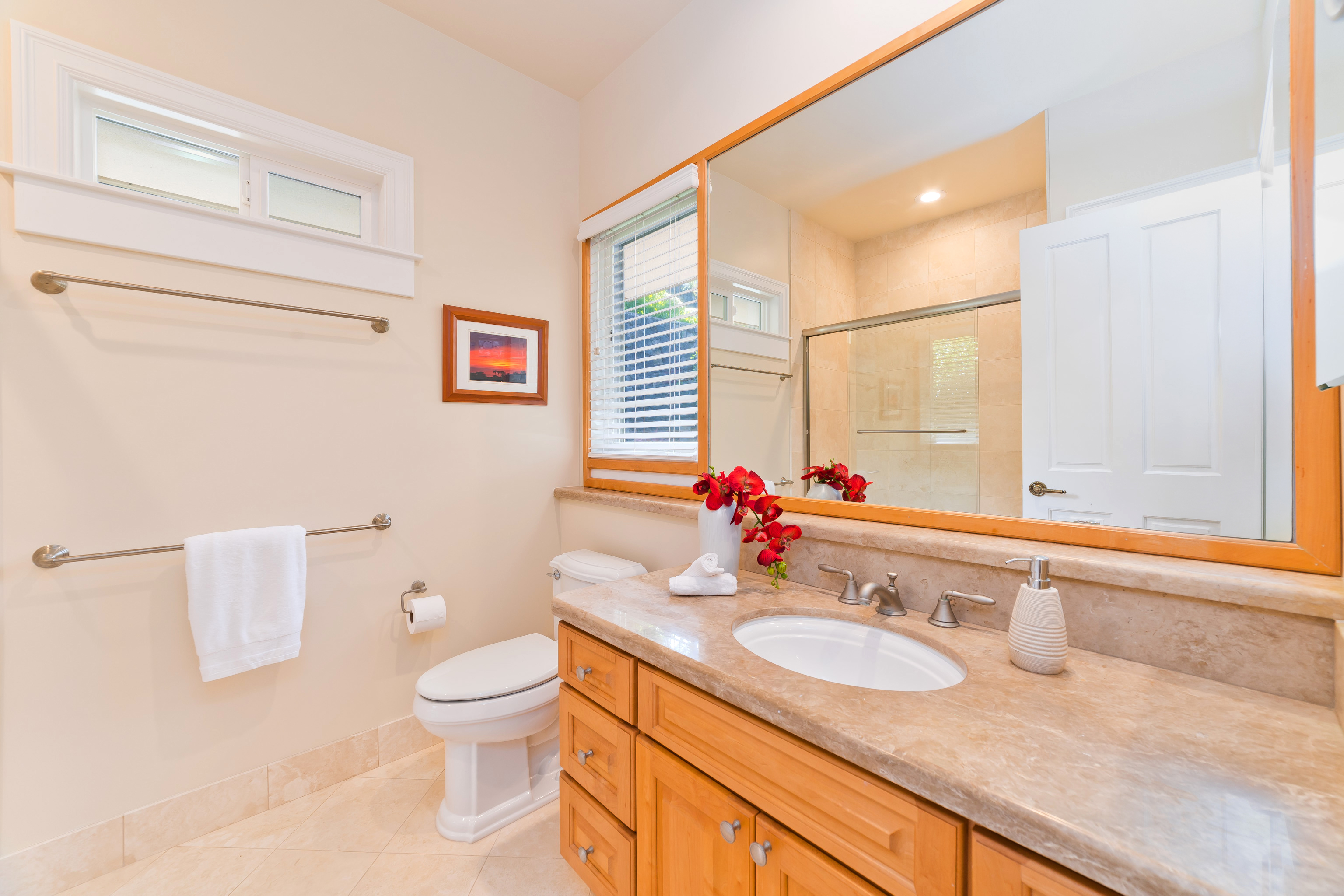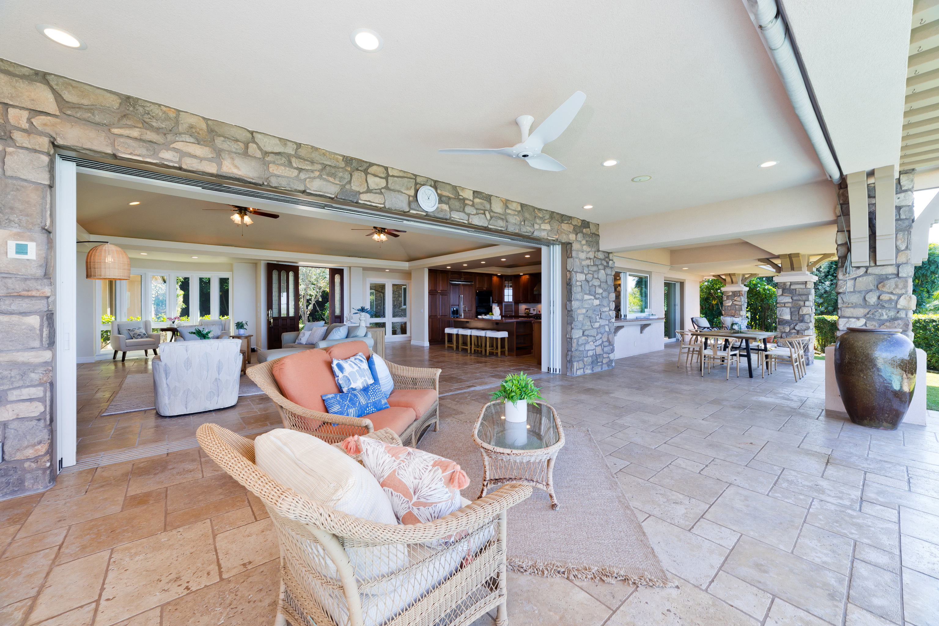 The open-concept great room connects effortlessly to a chef’s kitchen appointed with a Viking commercial gas range, generous prep space, and a natural flow to the covered lanai, perfect for entertaining or quiet mornings with Kona coffee. Three ensuite bedrooms provide privacy for guests, complemented by an ocean-view office that inspires both work and creativity.