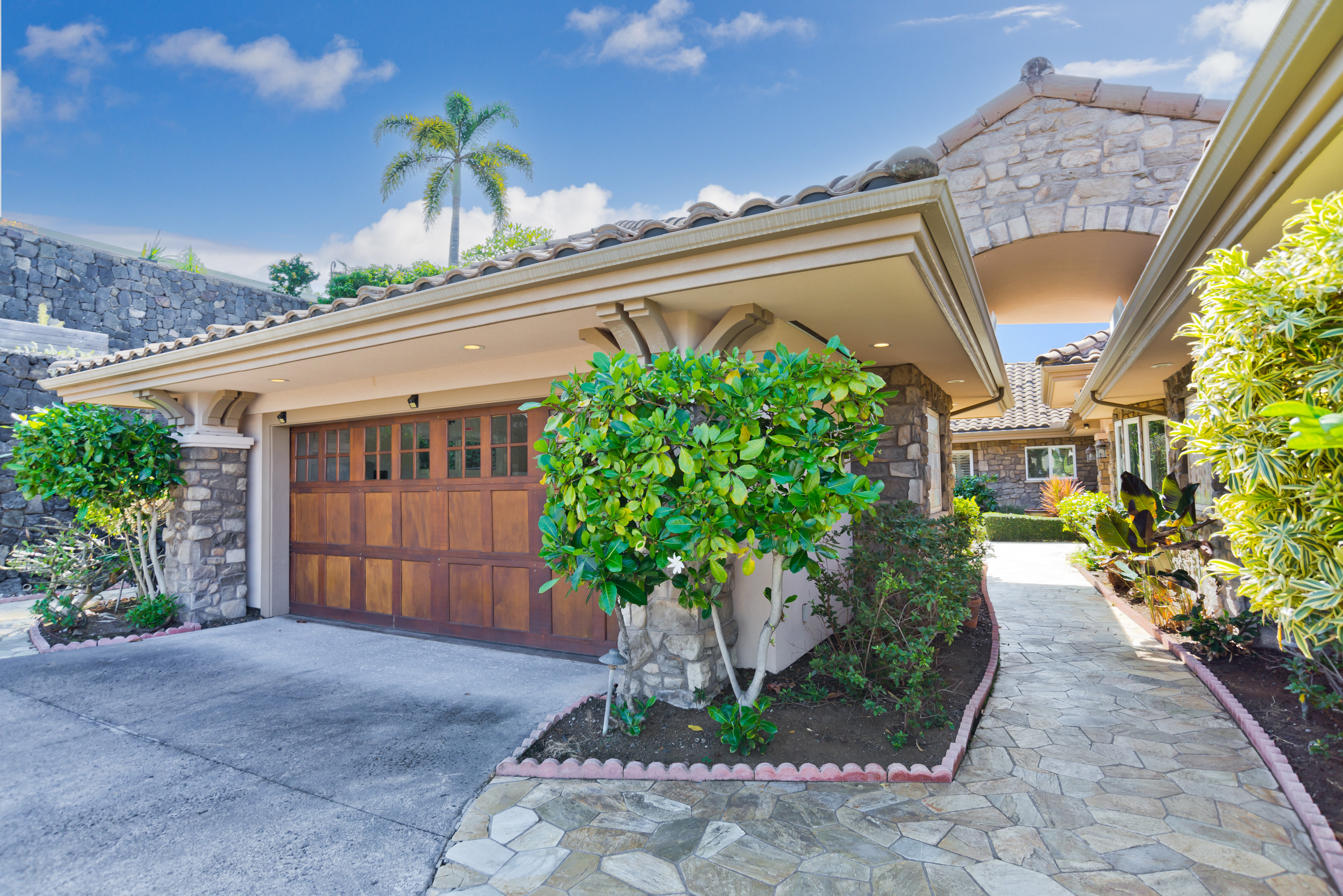 Perched above the Kona coast in the gated community of Bayview Estates, this single-level 3,049-square-foot residence blends architectural refinement with the warmth of island living. A graceful arched entry leads through a private courtyard lined with mature olive trees and into interiors framed by sweeping ocean and sunset views.