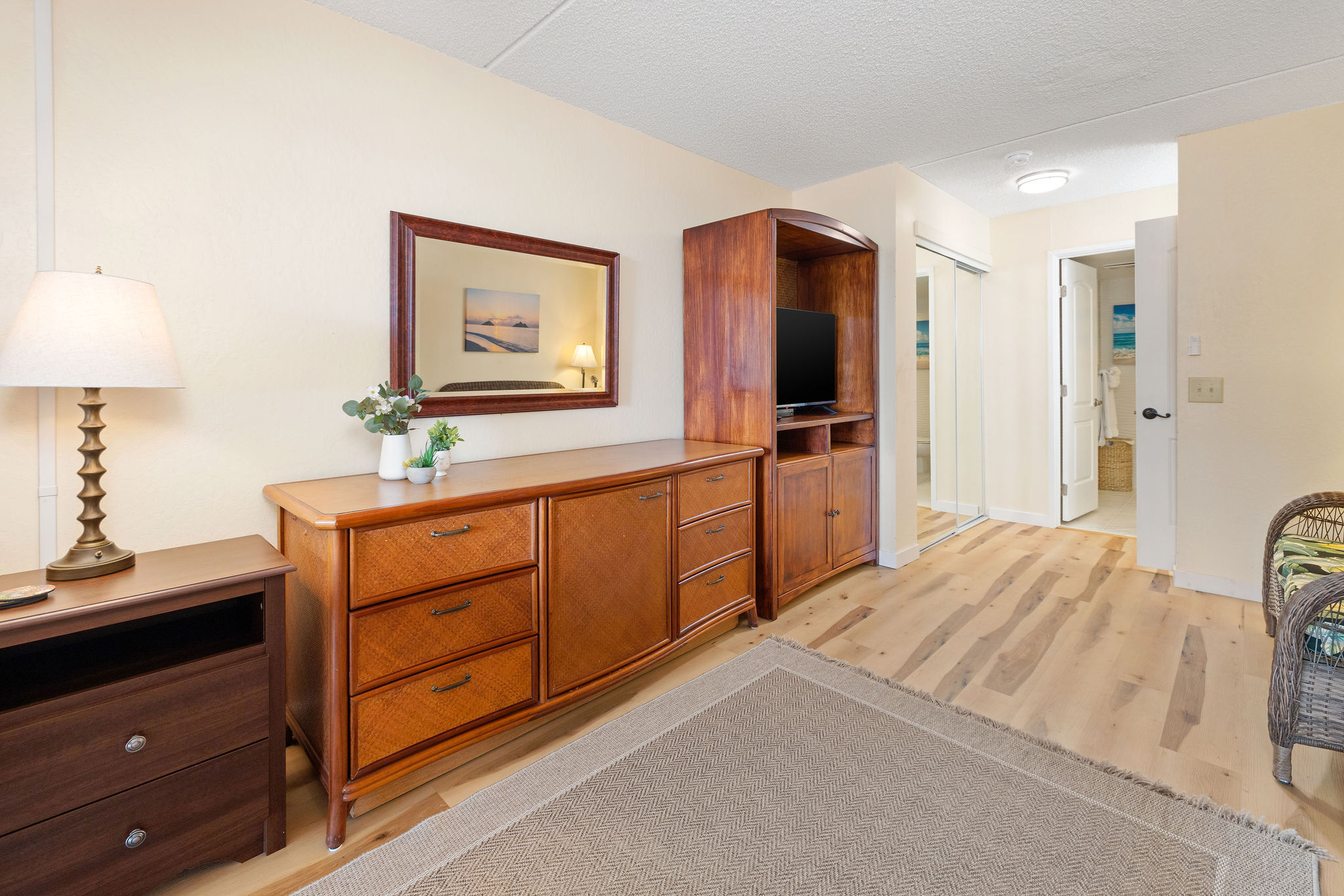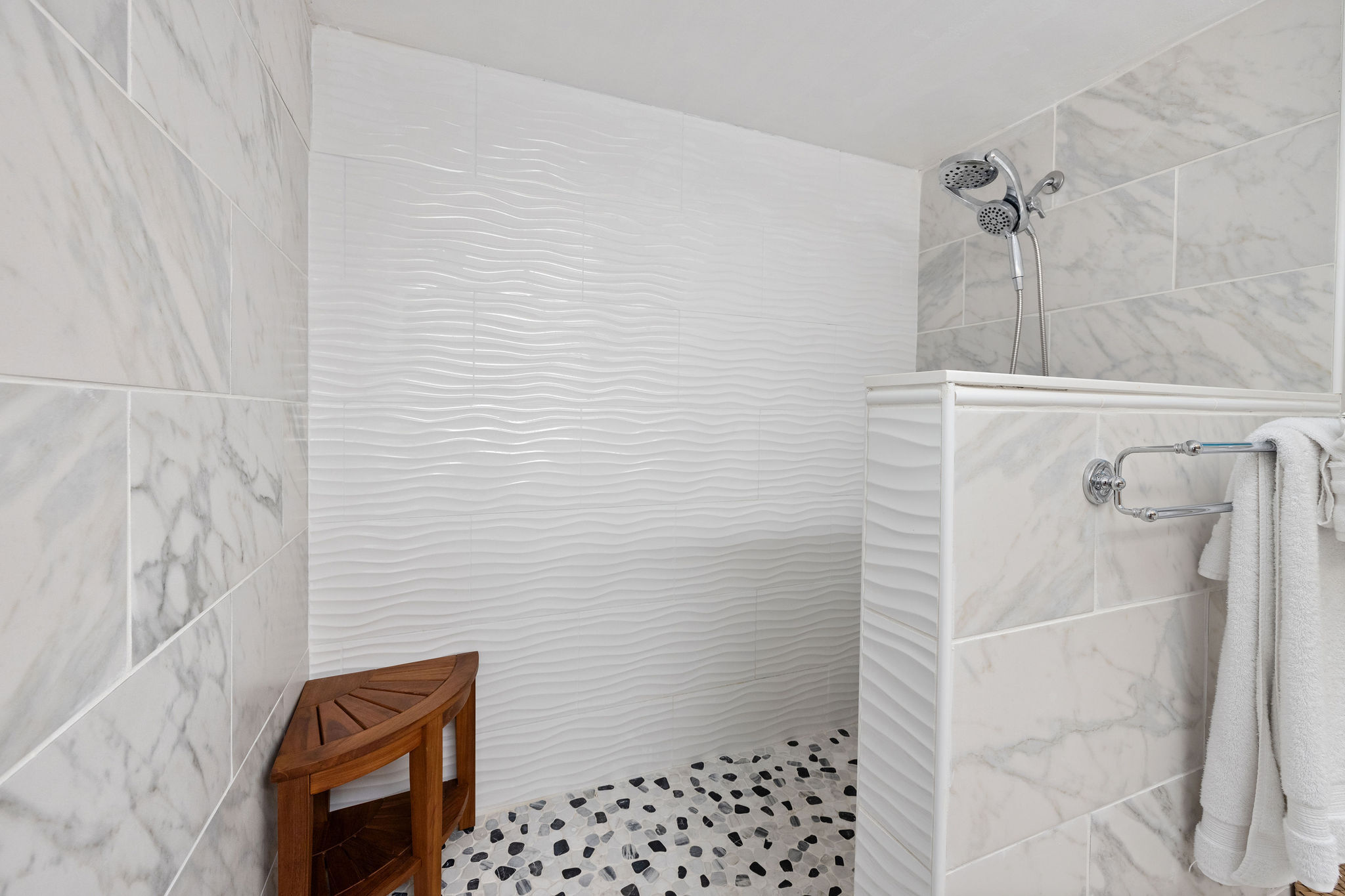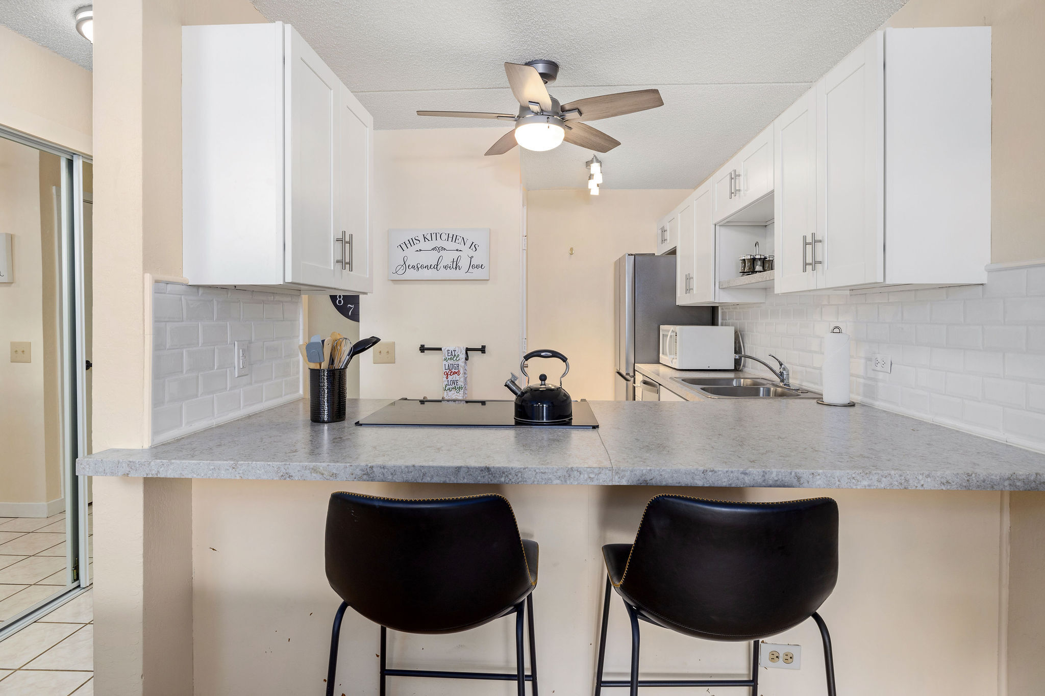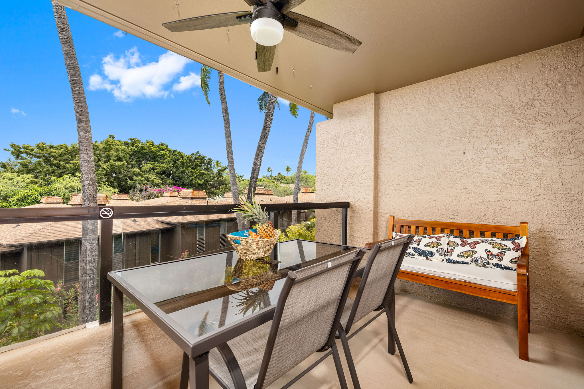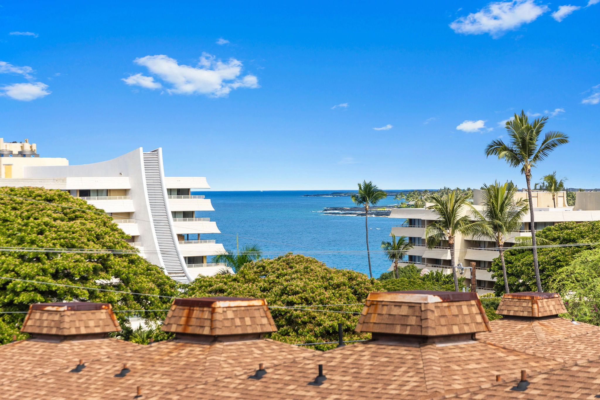 Walk to restaurants and shops on Alii Drive from this Kona Pacific condo in the heart of Kailua-Kona. This condo has been updated and is full of light and comfort. With the 2 bathroom layout, it feels like two separate living spaces with plenty of privacy. This unit boasts two separate lanais, both with ocean and mountain views. The renovation includes a walk-in shower in the master onsuite, and the other bathroom highlights new tile, vanity and other upgrades. The kitchen is equipt with all the modern conveniences such as new stainless refrigerator, dishwasher, all new cabinets and countertops. Kona Pacific complex offers easy access with elevators, a beautiful pool and convienent undercover parking. This particular unit has a double long parking spot that accomodates 2 cars. Totally furnished to welcome short term vacation guests, and this unit is an established legal licensed vacation rental with plenty of reservations to pass on to you. Maintenances fee include Cable, internet, water/hot water, trash, elevator maintenance, & complex amenity maintenance