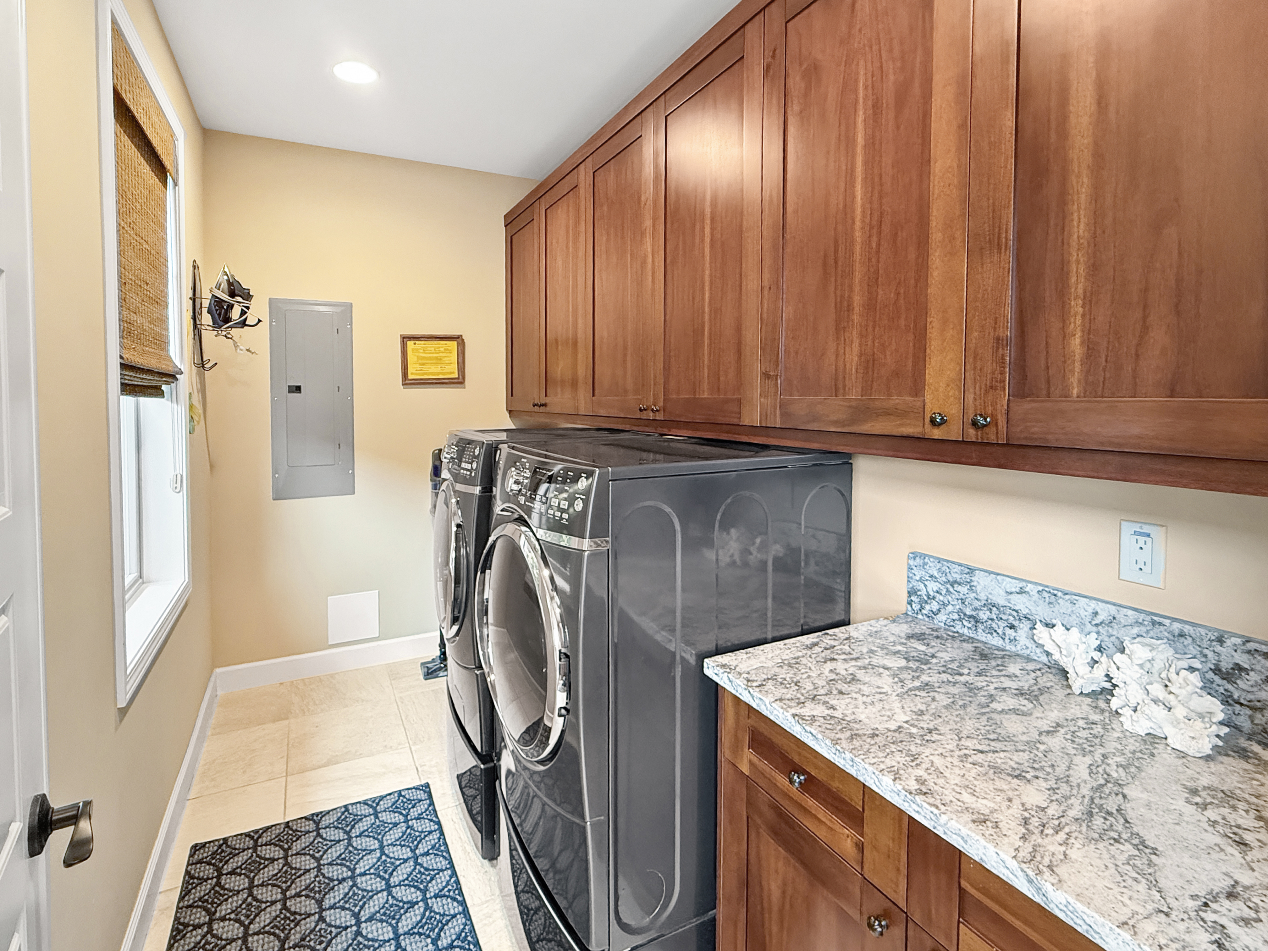 Enjoy running the central a/c throughout the home with 35 owned solar panels and 3 back up batteries. Electric bills run this sanctuary an average of $150 per month. The kitchen boasts straight on views and a large great room. Enjoy an expansive island, a coffee bar, top of the line GE Stainless Steel Monogram appliances including an induction cook-top and wine fridge. Behind the kitchen is a separate oversized laundry room with a door leading to the courtyard, built in gas grill and a two car garage. The garage is filled with all your beach needs from paddle boards to outdoor games.