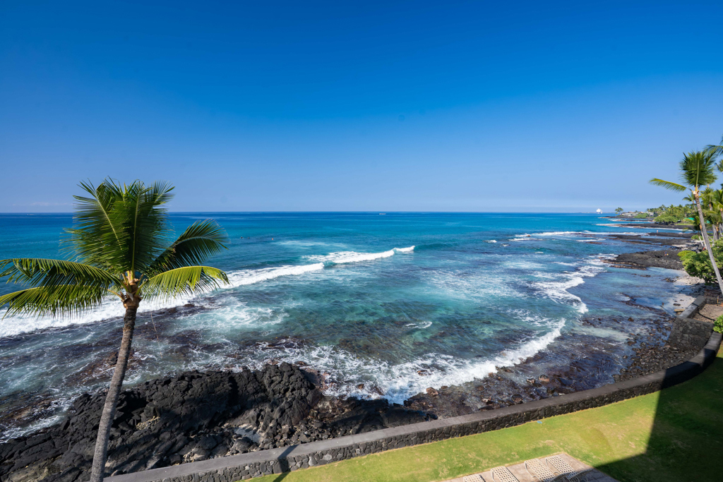 Banyan Tree Unit 406 is a premier top-floor corner condominium offering unobstructed views of the Pacific Ocean. With 1,219 square feet of total living space, including the extended outdoor lanai, this residence provides exceptional elevation, privacy, and expansive sightlines rarely available within the complex. The oceanfront lanai creates a seamless indoor—outdoor living experience, positioned so close to the shoreline that the sound and movement of the ocean become part of everyday life. From this vantage point, enjoy views of the surfers at the famous Banyans and Lymans surf breaks, passing dolphins, seasonal whales, and Kona’s stunning year round sunsets. Owned by the same family for over 25 years and meticulously cared for, the home reflects long-term stewardship and pride of ownership. The open layout is enhanced by abundant natural light, consistent trade winds, new expansive glass openings along the ocean side, split A/C in the living room, and numerous recent updates throughout. This residence is truly a must-see. Banyan Tree is a boutique 20-unit oceanfront community located along Alii Drive in Kailua-Kona’s Vacation Rental District, with an active STVR permit. The building is energy efficient, with the pool heater and common-area lighting powered by solar, contributing to thoughtful long-term operations. The HOA is well managed and approximately 95% funded, reflecting strong financial stewardship. Community amenities include a waterfront swimming pool, hot tub, barbecue area, second floor common room, secured entry, elevator access, and covered parking. The combination of top-floor elevation, corner-unit orientation, and unobstructed ocean views establishes Unit 406 as the premier offering within Banyan Tree. An exceptional opportunity to own a legacy-quality oceanfront residence in one of Kailua-Kona’s most established coastal locations.