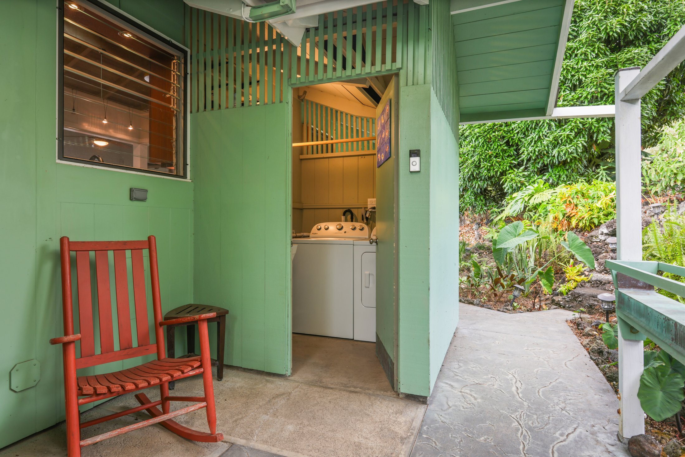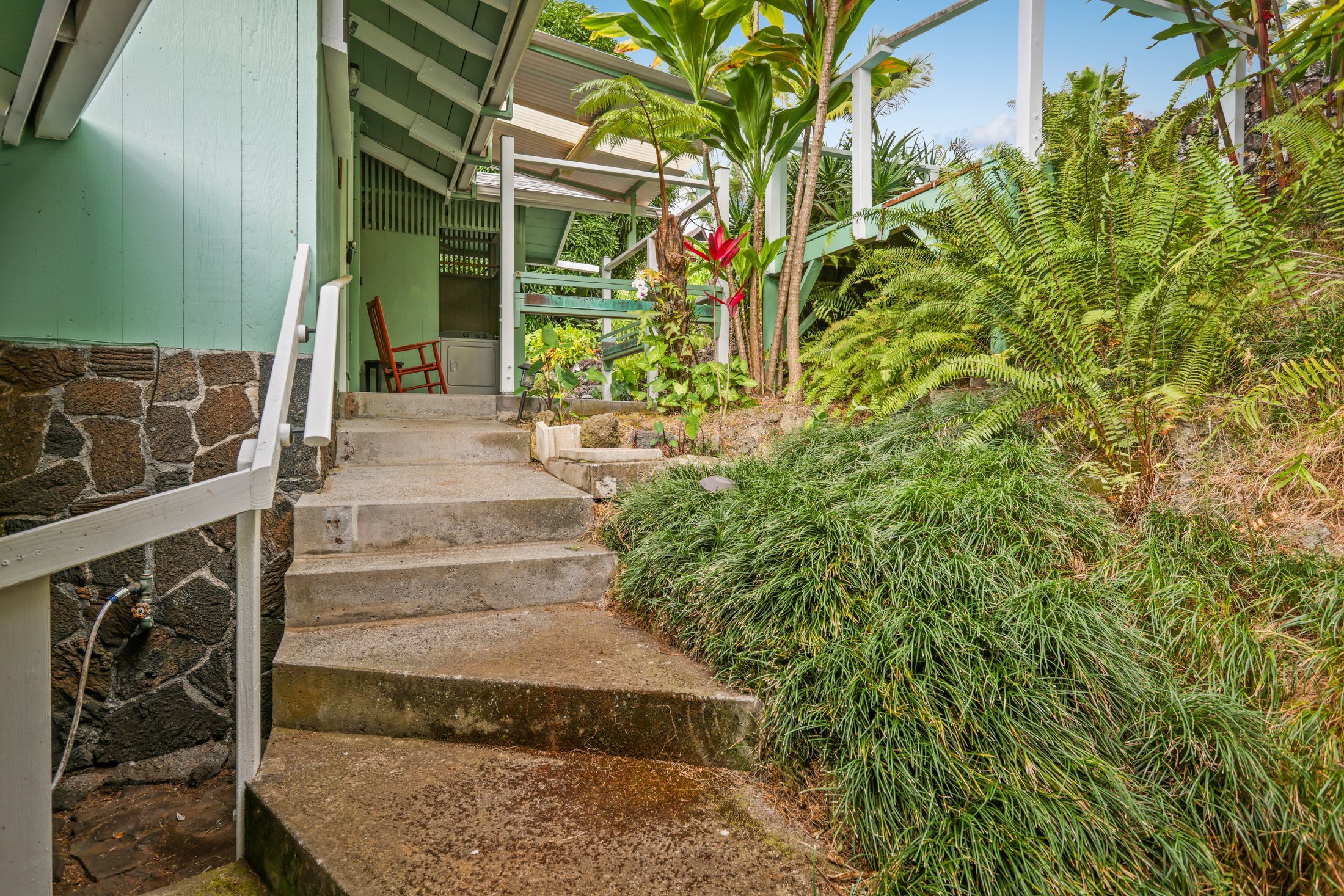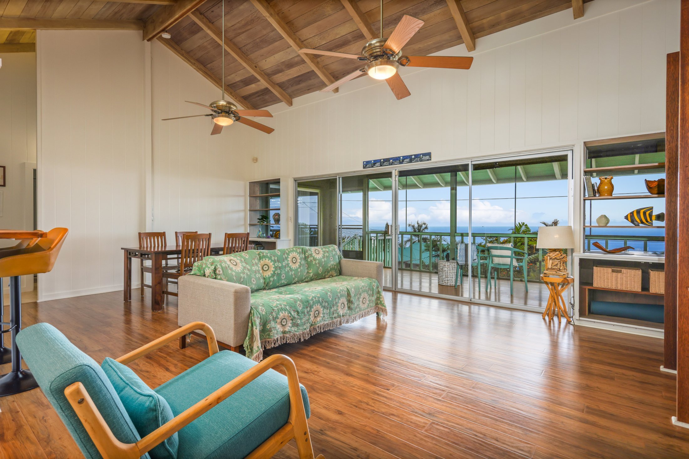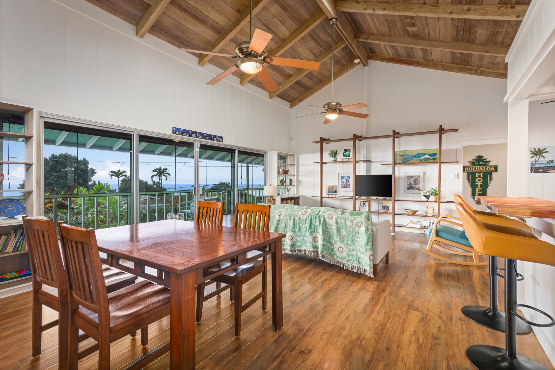 A sweet fully furnished 2 bedroom 2 bath ocean view home in a quiet established neighborhood. This home lives larger than 1248 sq. ft. with the screened in lanai connected to the living room with large sliding glass doors. The kitchen and bathrooms have been updated. The living room and bedrooms have laminate flooring. This vintage home has been beautifully maintained and sits on a large corner lot in Holualoa Estates.