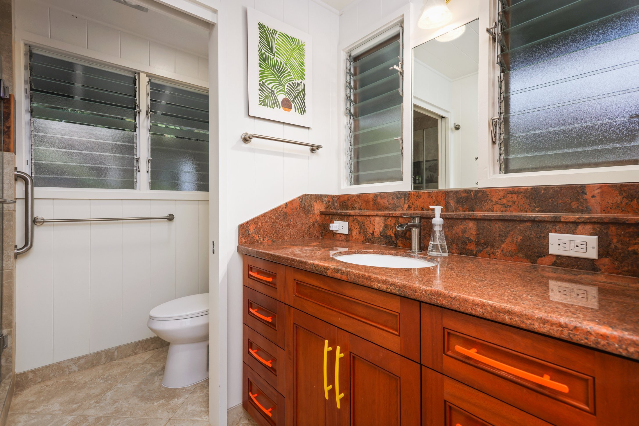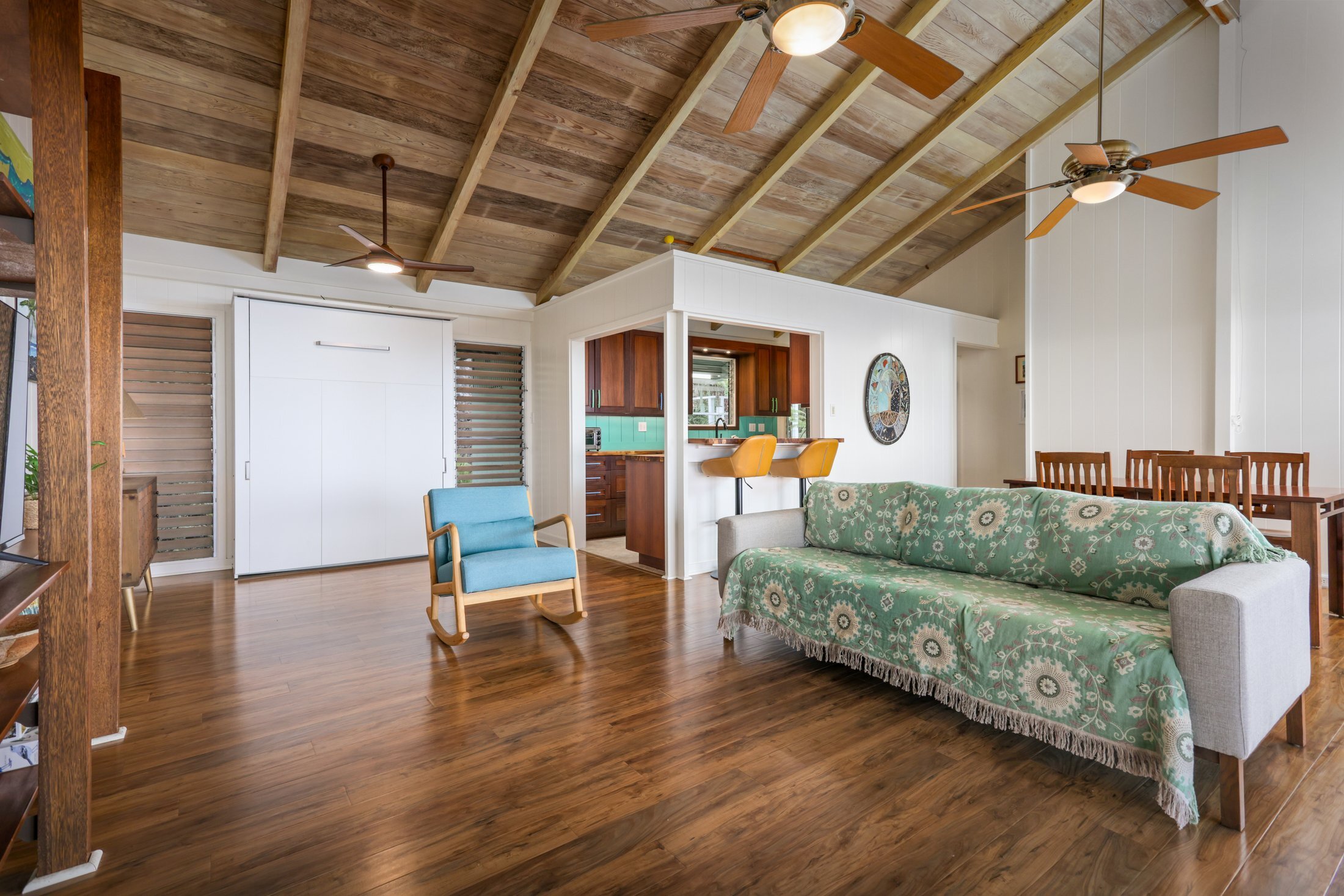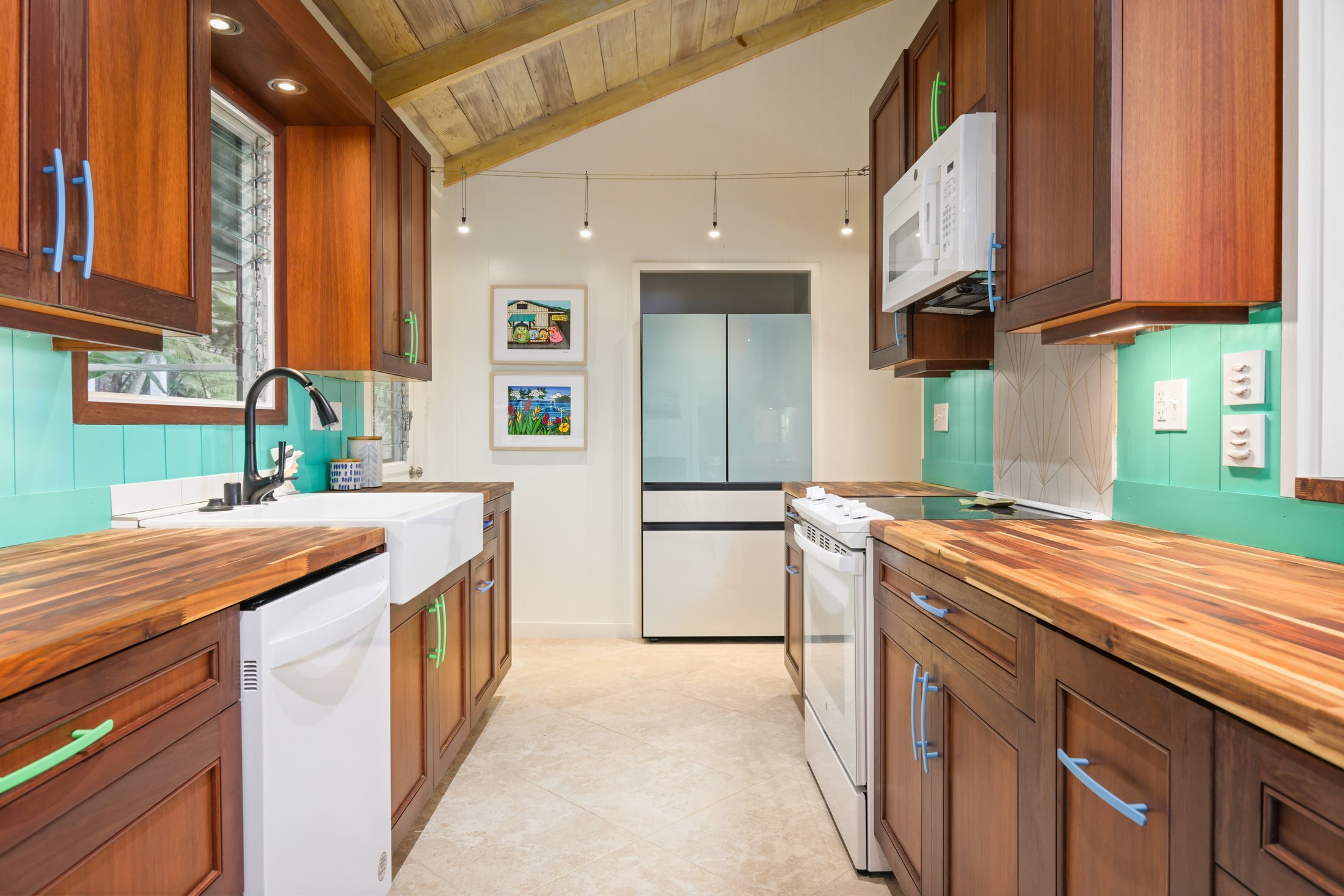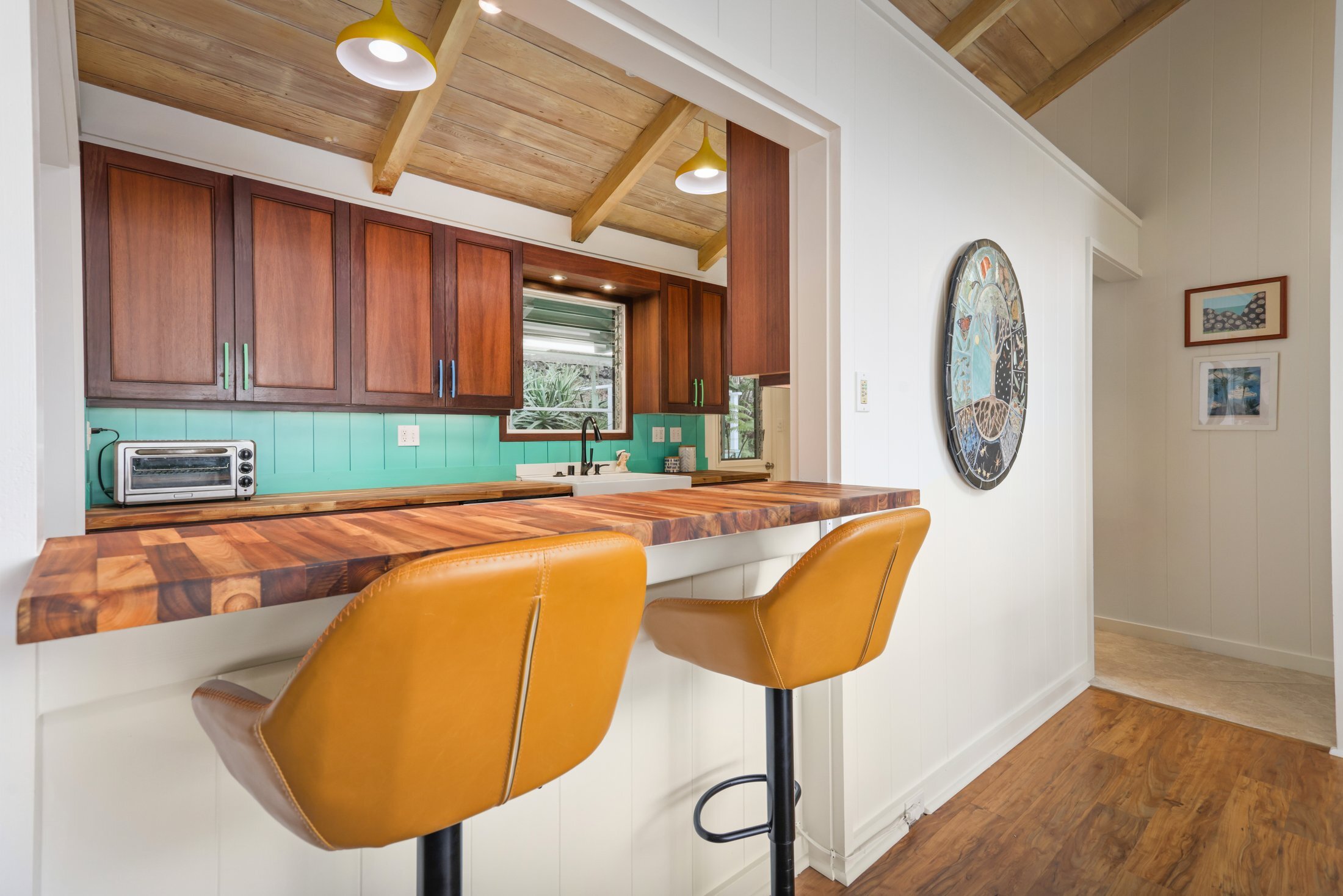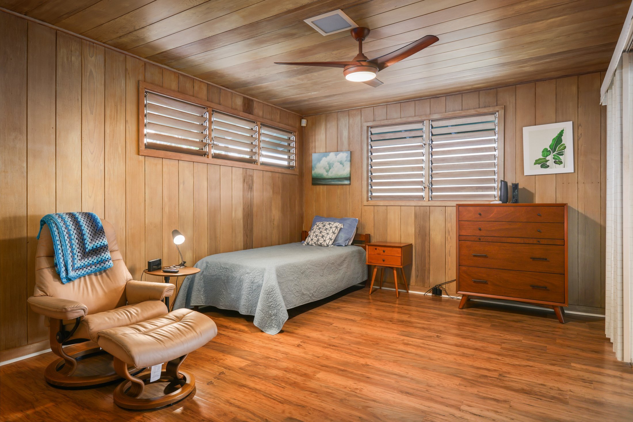 A sweet fully furnished 2 bedroom 2 bath ocean view home in a quiet established neighborhood. This home lives larger than 1248 sq. ft. with the screened in lanai connected to the living room with large sliding glass doors. The kitchen and bathrooms have been updated. The living room and bedrooms have laminate flooring. This vintage home has been beautifully maintained and sits on a large corner lot in Holualoa Estates.