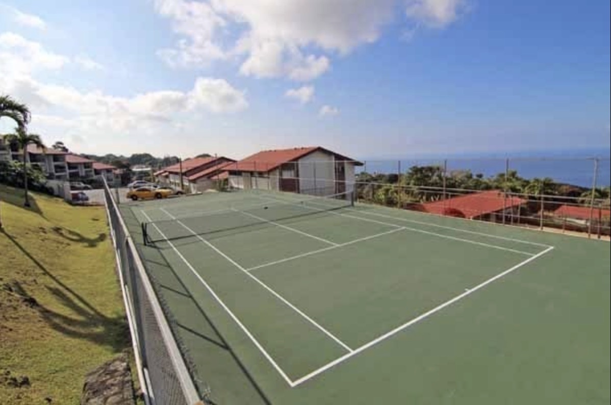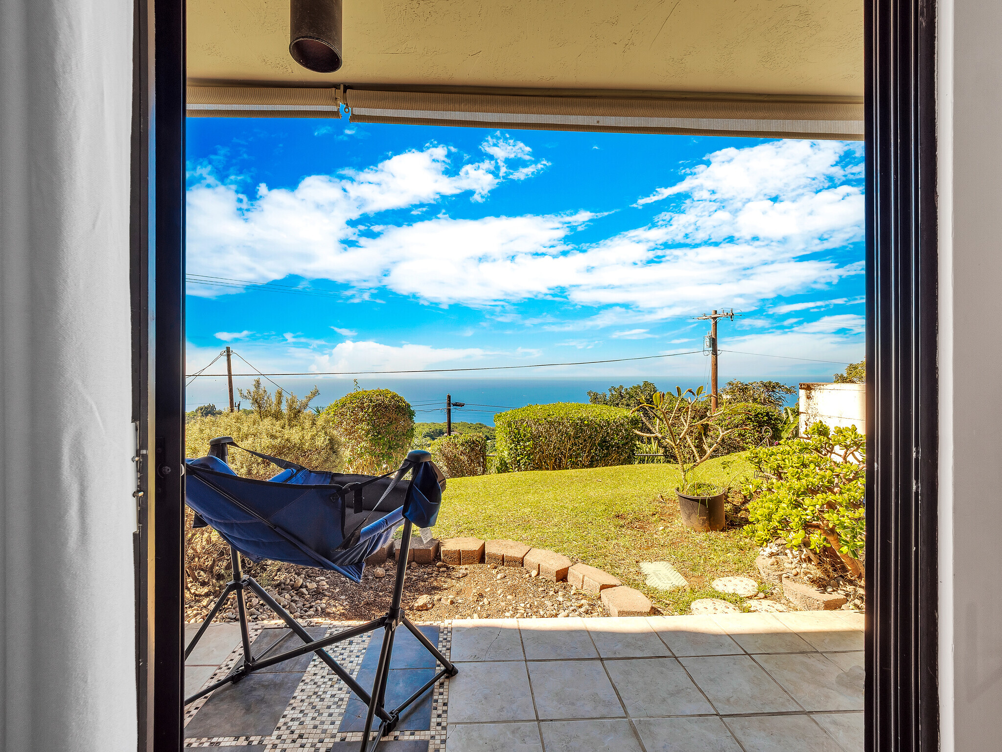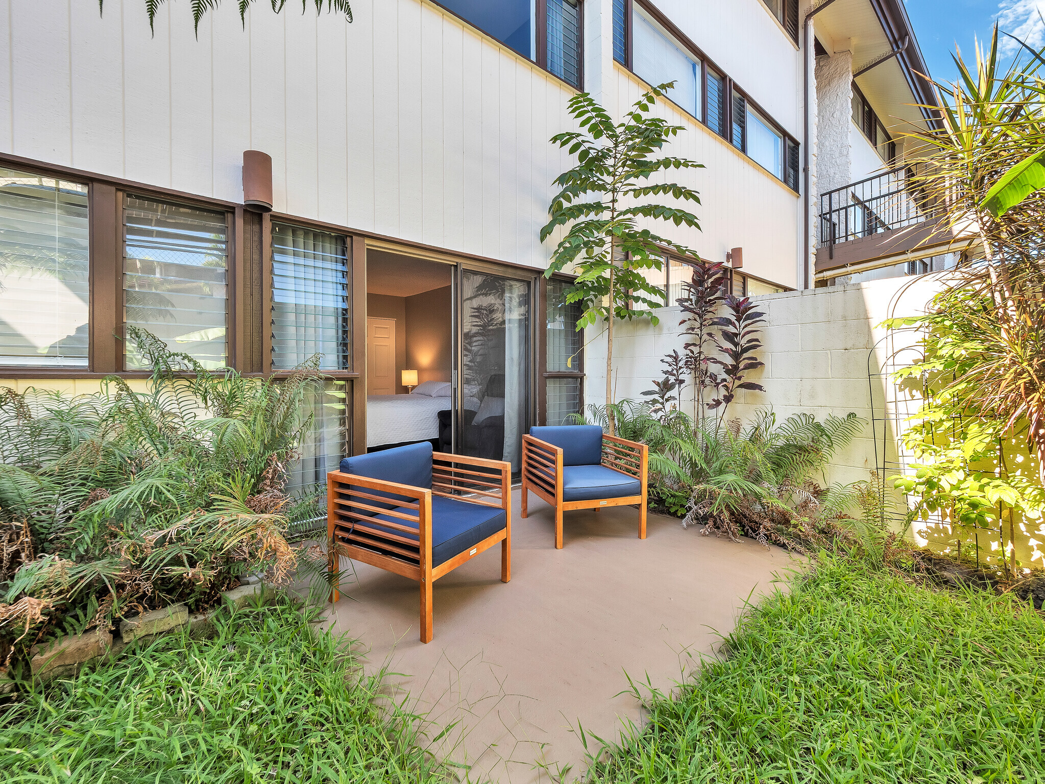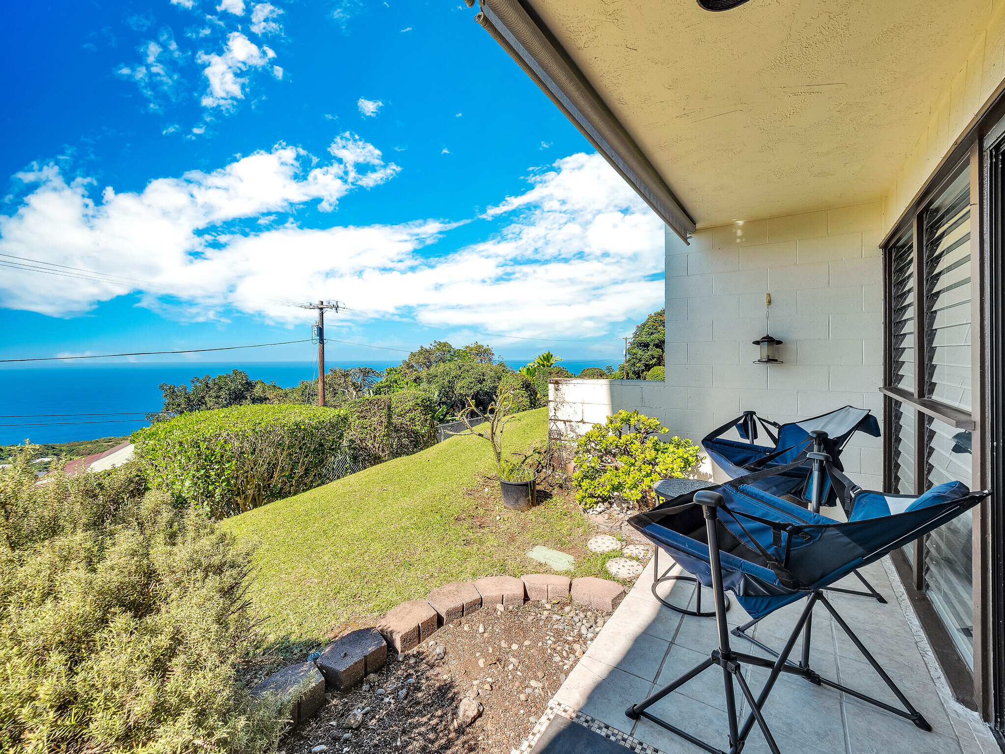 Welcome to Unit 150F at Kona Coffee Villas, a well-kept ground-floor 2-bedroom, 2-bath condo located at a cooler elevation above Kailua-Kona. The 853 sq ft interior features an open layout with wood-style tile flooring throughout the main living areas and a refreshed kitchen with solid granite countertops, and stainless appliances. Sliding glass doors open to a private 149 sq ft backyard area, an uncommon setup that provides a comfortable outdoor area. Ocean views, including whales in season, can be seen from the front lanai beyond the greenery, offering a serene and restful backdrop. The assigned parking stall is conveniently located just steps from the unit, with ample guest parking throughout the complex. Kona Coffee Villas is a quiet community with a pool and tennis court, centrally located near shopping, dining, and everyday conveniences.