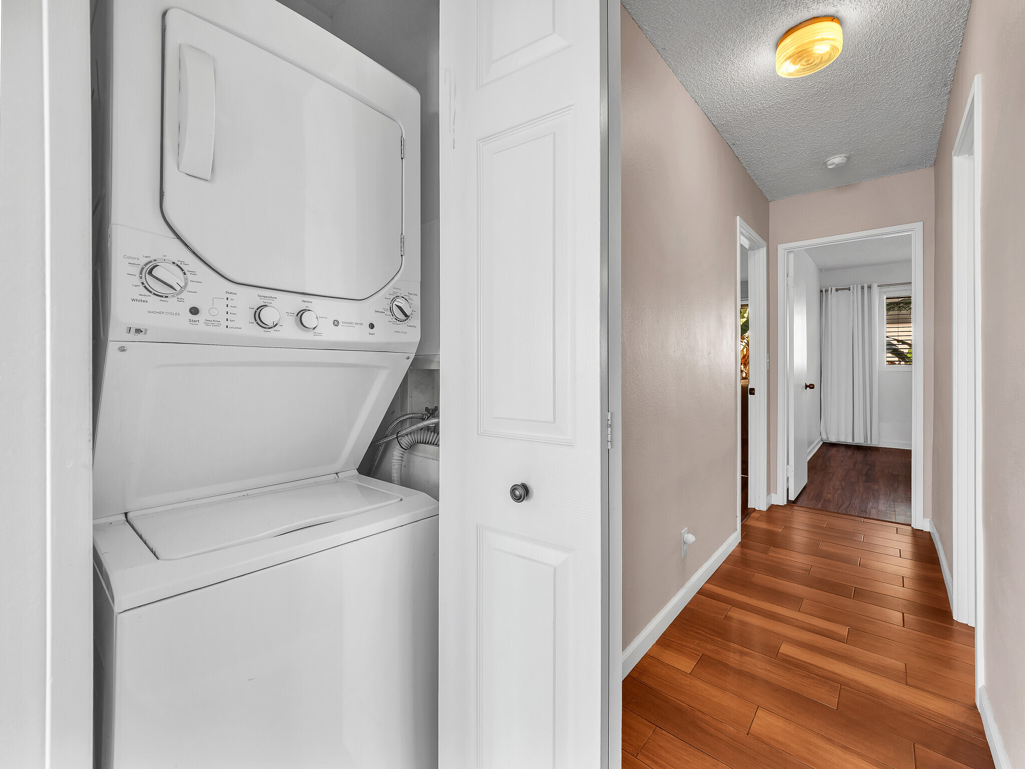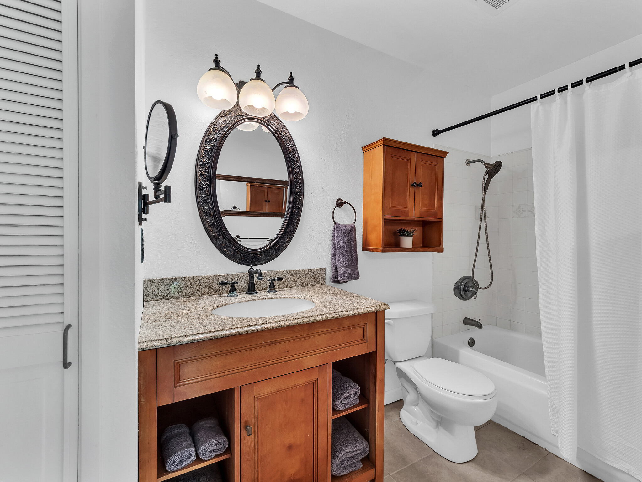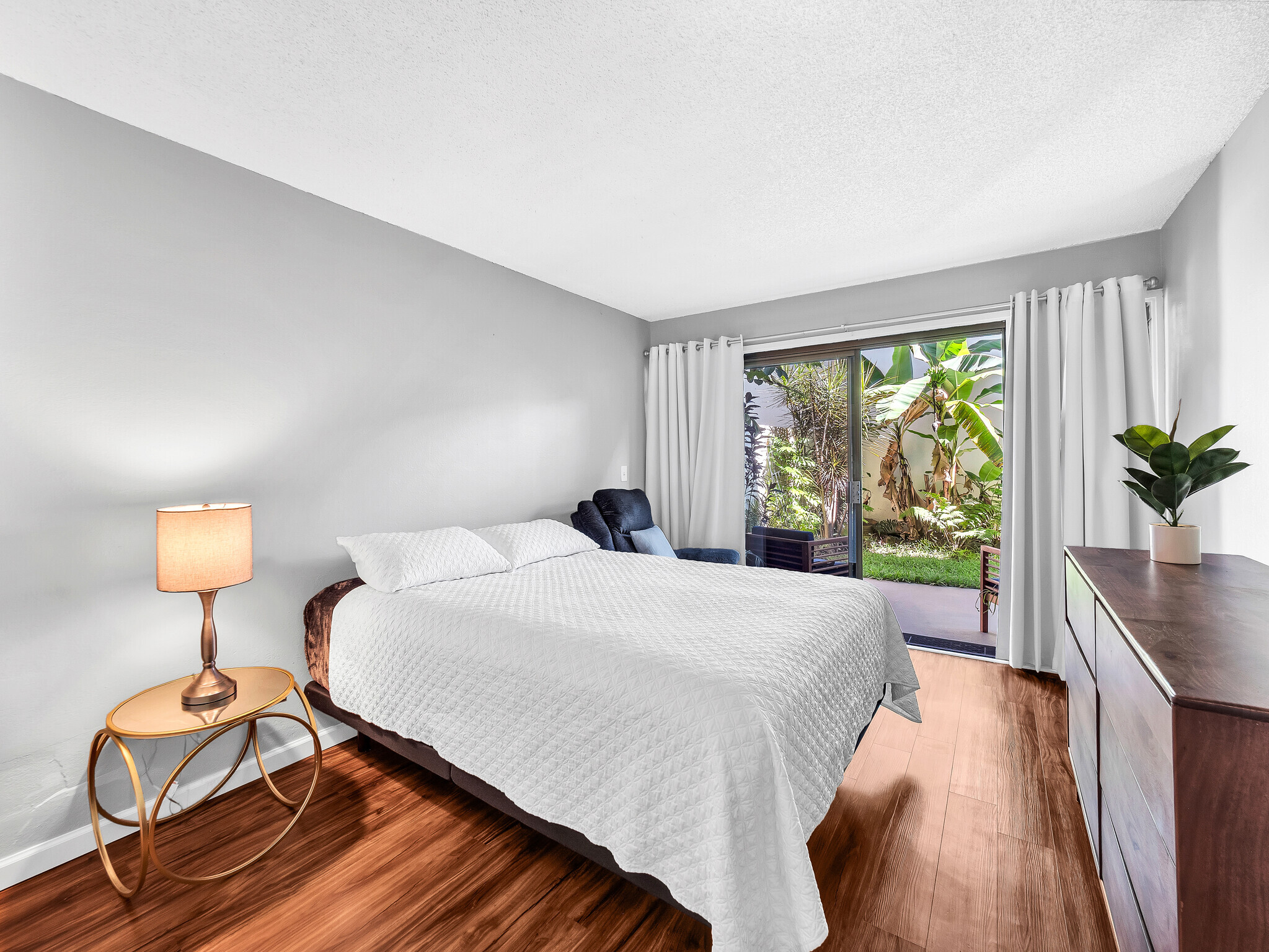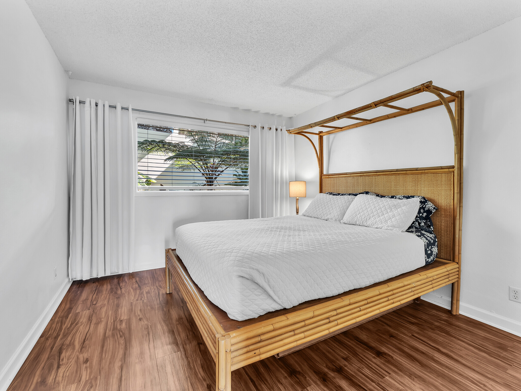Welcome to Unit 150F at Kona Coffee Villas, a well-kept ground-floor 2-bedroom, 2-bath condo located at a cooler elevation above Kailua-Kona. The 853 sq ft interior features an open layout with wood-style tile flooring throughout the main living areas and a refreshed kitchen with solid granite countertops, and stainless appliances. Sliding glass doors open to a private 149 sq ft backyard area, an uncommon setup that provides a comfortable outdoor area. Ocean views, including whales in season, can be seen from the front lanai beyond the greenery, offering a serene and restful backdrop. The assigned parking stall is conveniently located just steps from the unit, with ample guest parking throughout the complex. Kona Coffee Villas is a quiet community with a pool and tennis court, centrally located near shopping, dining, and everyday conveniences.