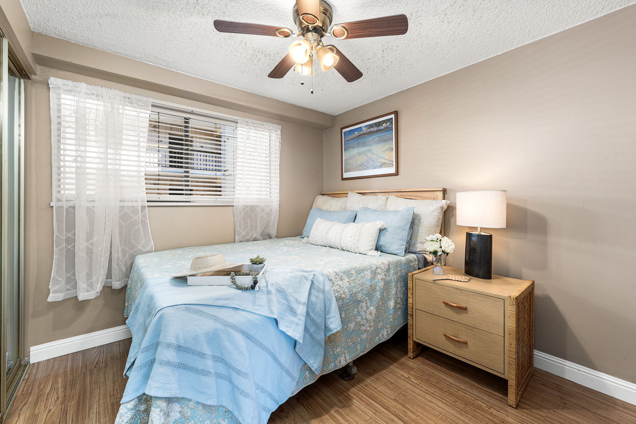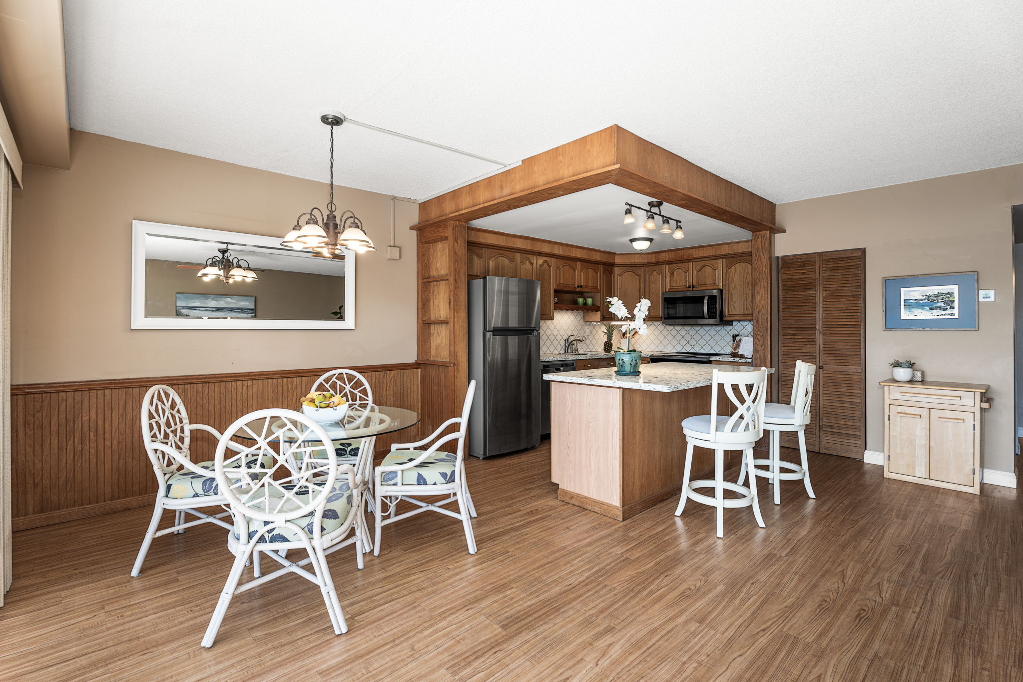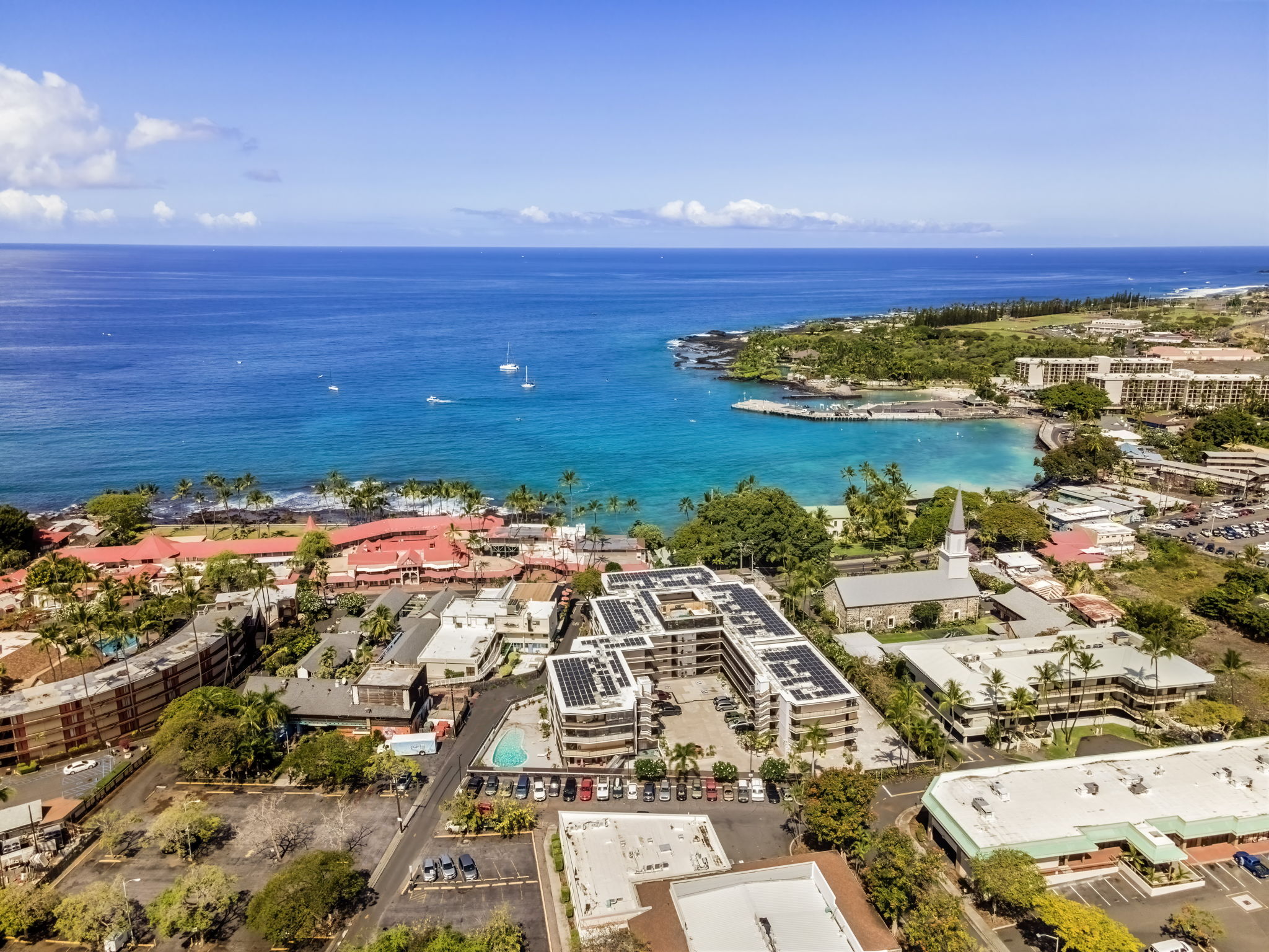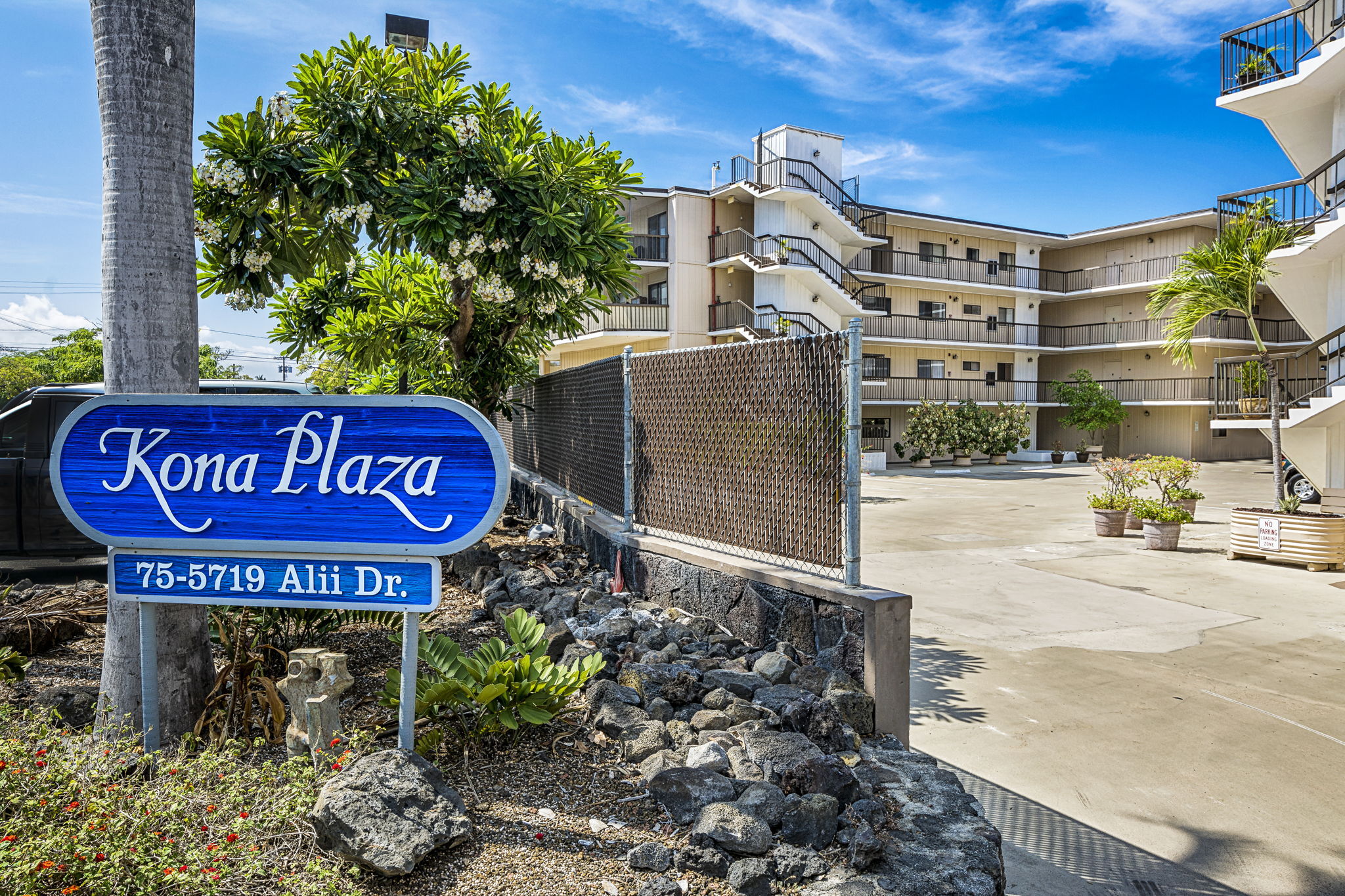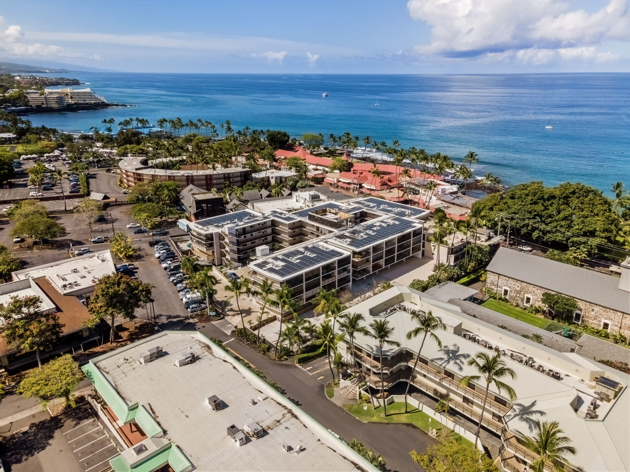 In the heart of historic Kailua-Kona, Unit 208 at Kona Plaza offers spacious in-town living with flexibility as a primary residence, vacation home, or investment opportunity. This second-floor 2BD/2BA condo enjoys abundant natural light, cool island breezes, and a warm sunset glow from the lanai – all just steps from the ocean. The open-concept great room is airy and versatile, allowing multiple furniture layouts for comfortable living or hosting guests. Luxury vinyl flooring runs throughout for durability, style, and easy maintenance. Seamless transitions connect the kitchen, dining, and living areas, creating an effortless flow for everyday living and entertaining. The kitchen features generous cabinetry, open shelving, a pantry, granite countertops with an undermount sink, custom tiled backsplash, stainless steel appliances, and an oversized island ideal for prep, dining, or conversation. Enjoy meals indoors or on the covered lanai. Both bedrooms are privately positioned toward the rear of the unit and offer large windows and ample closet space. Bathrooms include custom tile surrounds, a soaking tub/shower combination, and well-lit vanities with storage.Unit 208 is ideally located near the pool for quick access, yet positioned away from direct pool noise for added privacy. In-unit washer and dryer provide convenience. Kona Plaza is centrally located in Kailua-Kona along historic Ali?i Drive which features restaurants, shopping, entertainment, Kailua Pier, Kamakahonu Bay, Hulihe?e Palace, Mokuaikaua Church, and more. Amenities include a pool, secure parking garage, elevators, and rooftop sundeck. Short- and long-term rentals allowed. Whether you’re seeking a full-time home, island retreat, or investment opportunity, Unit 208 offers flexibility in one of Kona’s most desirable locations. Property Video LInk; https://hawaiian-virtual-tours.aryeo.com/videos/019ca693-a2ff-725b-ab29-aeb16ba3a635