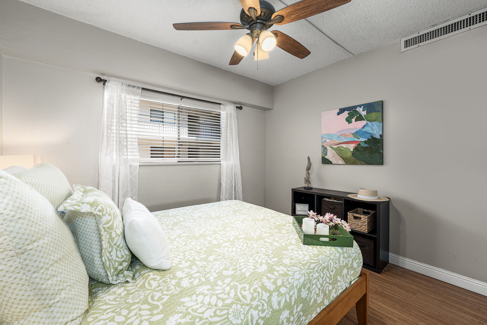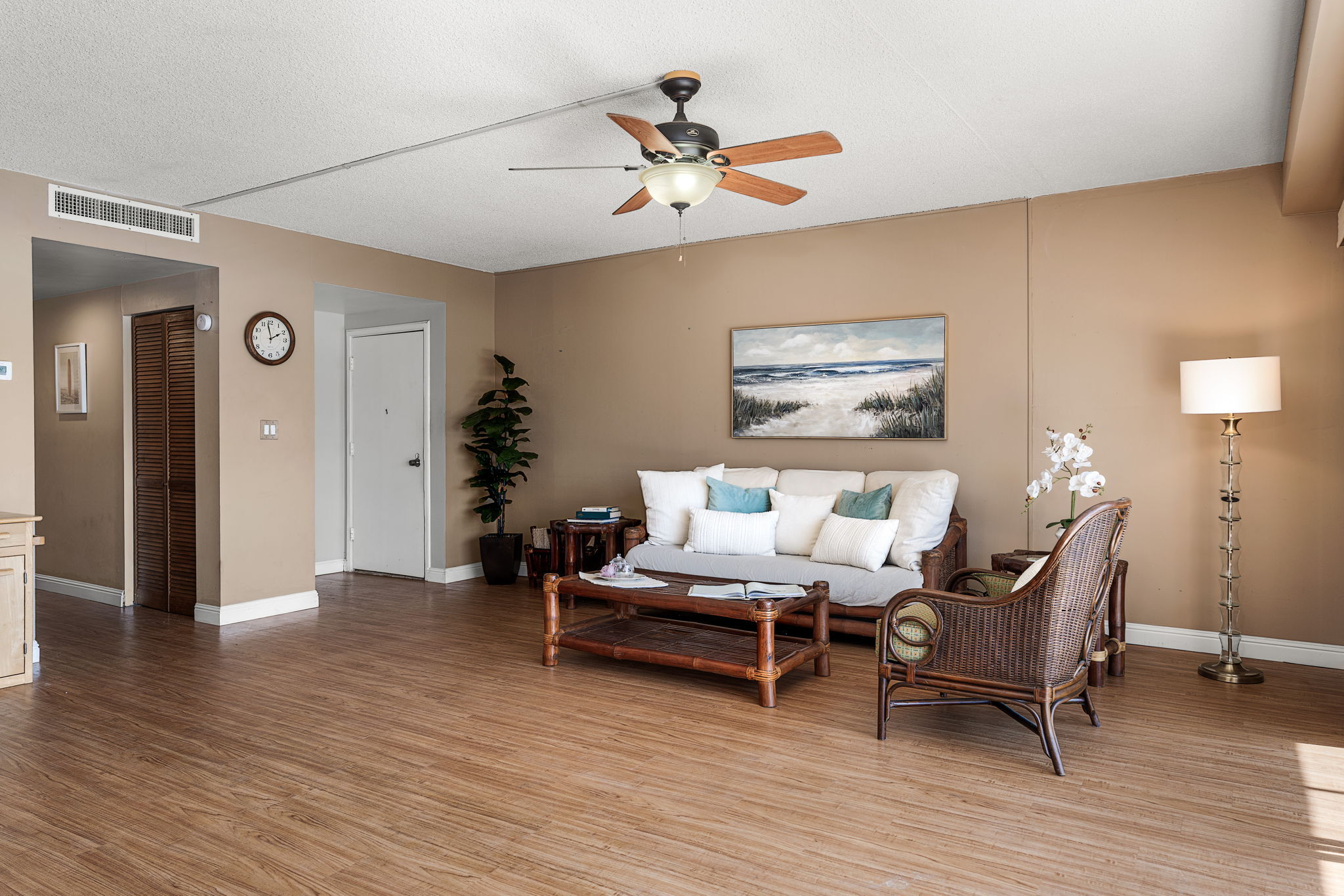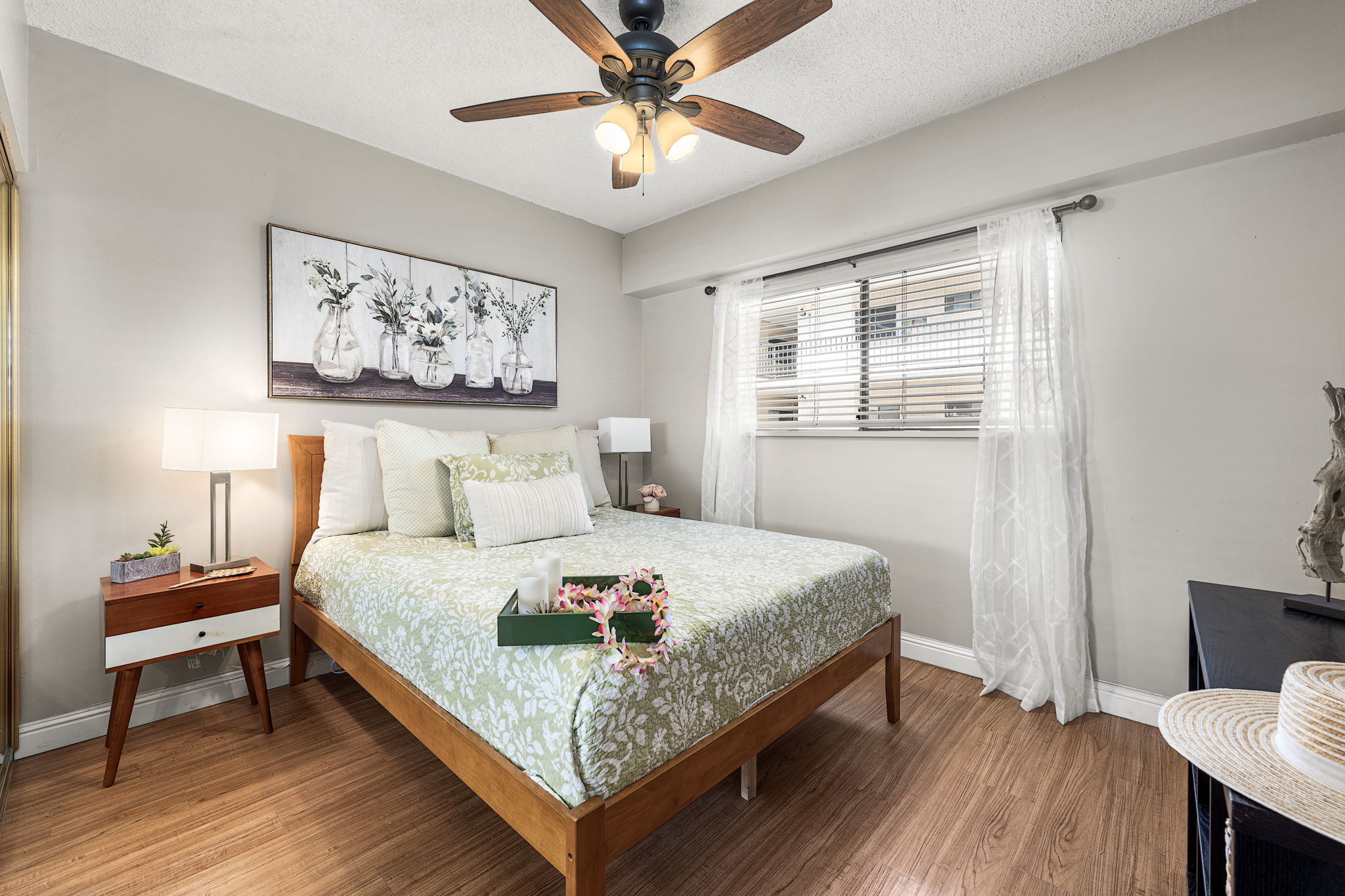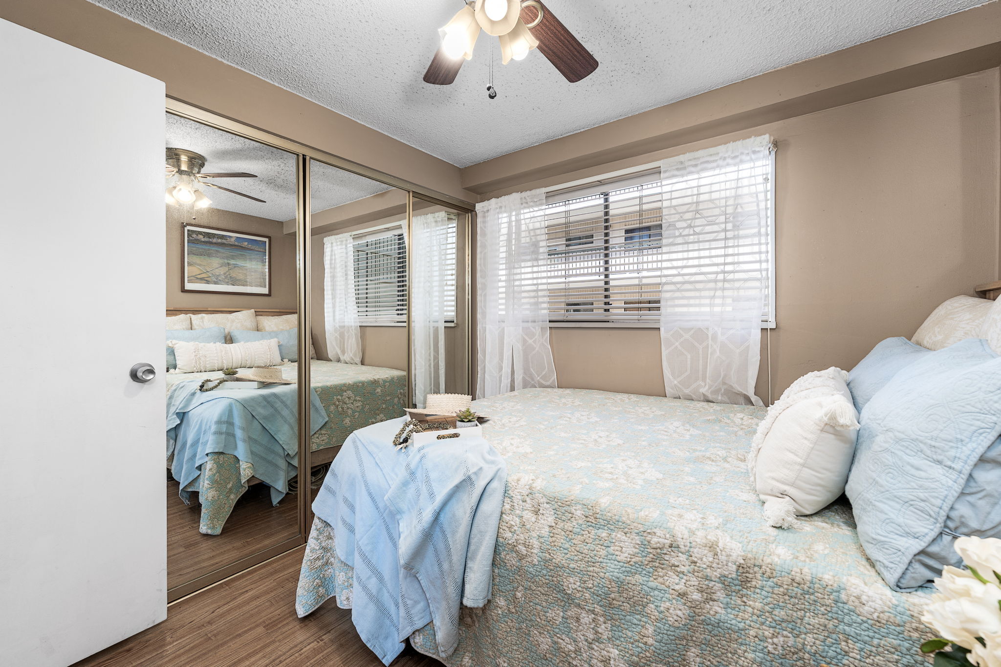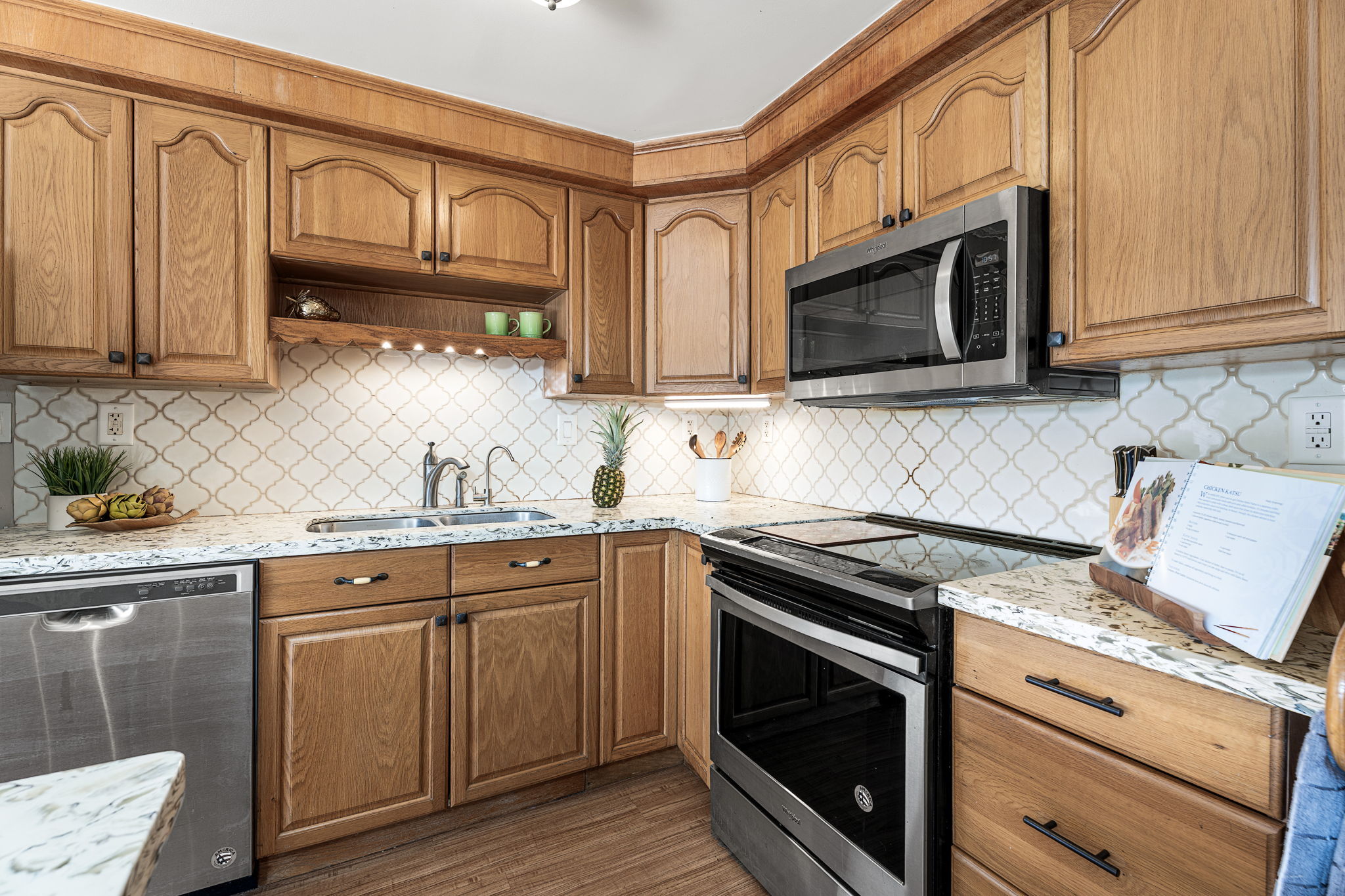 In the heart of historic Kailua-Kona, Unit 208 at Kona Plaza offers spacious in-town living with flexibility as a primary residence, vacation home, or investment opportunity. This second-floor 2BD/2BA condo enjoys abundant natural light, cool island breezes, and a warm sunset glow from the lanai – all just steps from the ocean. The open-concept great room is airy and versatile, allowing multiple furniture layouts for comfortable living or hosting guests. Luxury vinyl flooring runs throughout for durability, style, and easy maintenance. Seamless transitions connect the kitchen, dining, and living areas, creating an effortless flow for everyday living and entertaining. The kitchen features generous cabinetry, open shelving, a pantry, granite countertops with an undermount sink, custom tiled backsplash, stainless steel appliances, and an oversized island ideal for prep, dining, or conversation. Enjoy meals indoors or on the covered lanai. Both bedrooms are privately positioned toward the rear of the unit and offer large windows and ample closet space. Bathrooms include custom tile surrounds, a soaking tub/shower combination, and well-lit vanities with storage.Unit 208 is ideally located near the pool for quick access, yet positioned away from direct pool noise for added privacy. In-unit washer and dryer provide convenience. Kona Plaza is centrally located in Kailua-Kona along historic Ali?i Drive which features restaurants, shopping, entertainment, Kailua Pier, Kamakahonu Bay, Hulihe?e Palace, Mokuaikaua Church, and more. Amenities include a pool, secure parking garage, elevators, and rooftop sundeck. Short- and long-term rentals allowed. Whether you’re seeking a full-time home, island retreat, or investment opportunity, Unit 208 offers flexibility in one of Kona’s most desirable locations. Property Video LInk; https://hawaiian-virtual-tours.aryeo.com/videos/019ca693-a2ff-725b-ab29-aeb16ba3a635