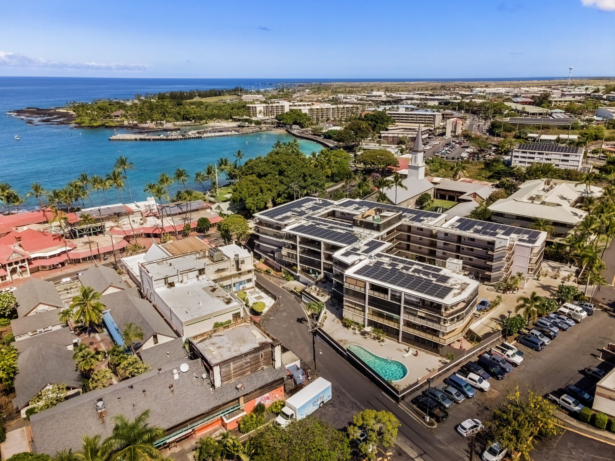 Located in the heart of downtown Kailua-Kona along iconic Ali?i Drive, this 1-bedroom, 1-bathroom condo at Kona Plaza offers an exceptional opportunity for both investment and personal use. Just steps from the ocean, dining, shopping, and historic landmarks, the location captures the essence of Kona’s coastal lifestyle. This desirable unit features additional living space and privacy with an expansive screened-in lanai–perfect for enjoying morning coffee or relaxing with mountain and town views. The functional interior layout includes a well-appointed kitchen, a comfortable living and dining area, and in-unit washer and dryer for everyday convenience. Located in a resort-zoned complex where short-term vacation rentals are permitted, this unit has a strong rental history and the option to retain confirmed future bookings, offering income potential and/or personal enjoyment in a high-demand location. Kona Plaza amenities include a swimming pool, two rooftop sundecks with ocean views, secure elevator access, and covered parking. Monthly HOA fees include water, sewer, trash, cable, and solar electricity for ease of ownership. Property Video Link; https://hawaiian-virtual-tours.aryeo.com/videos/019d402c-0e76-7320-a543-187bbee0fa6d