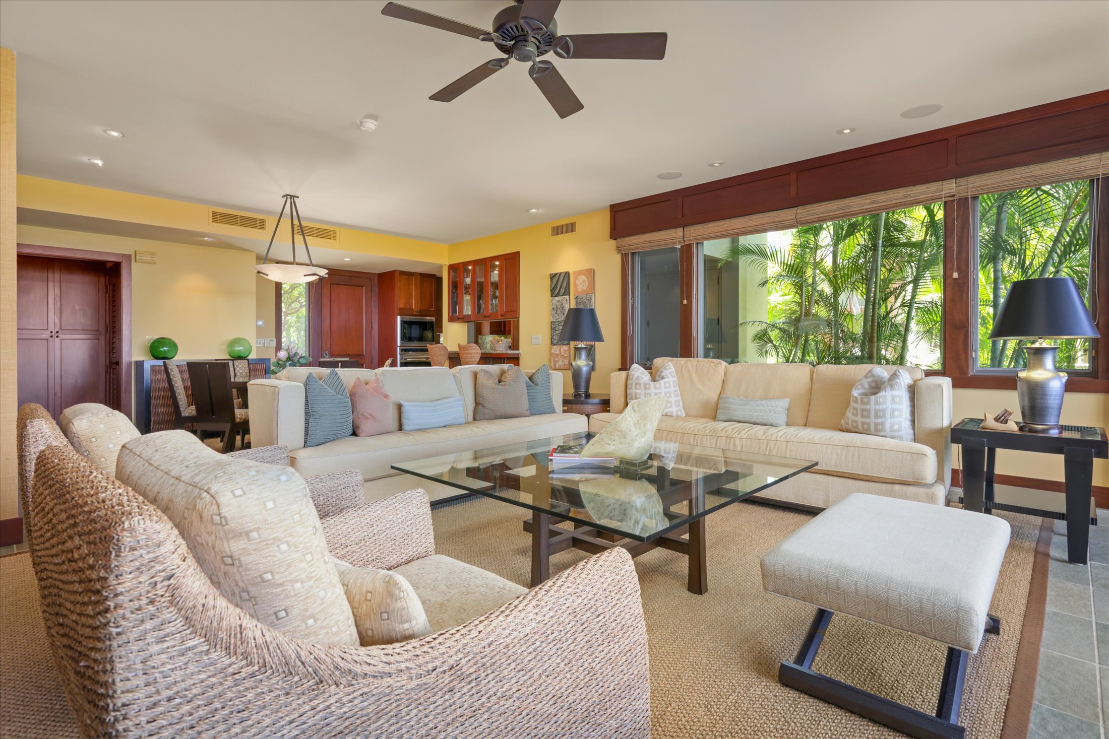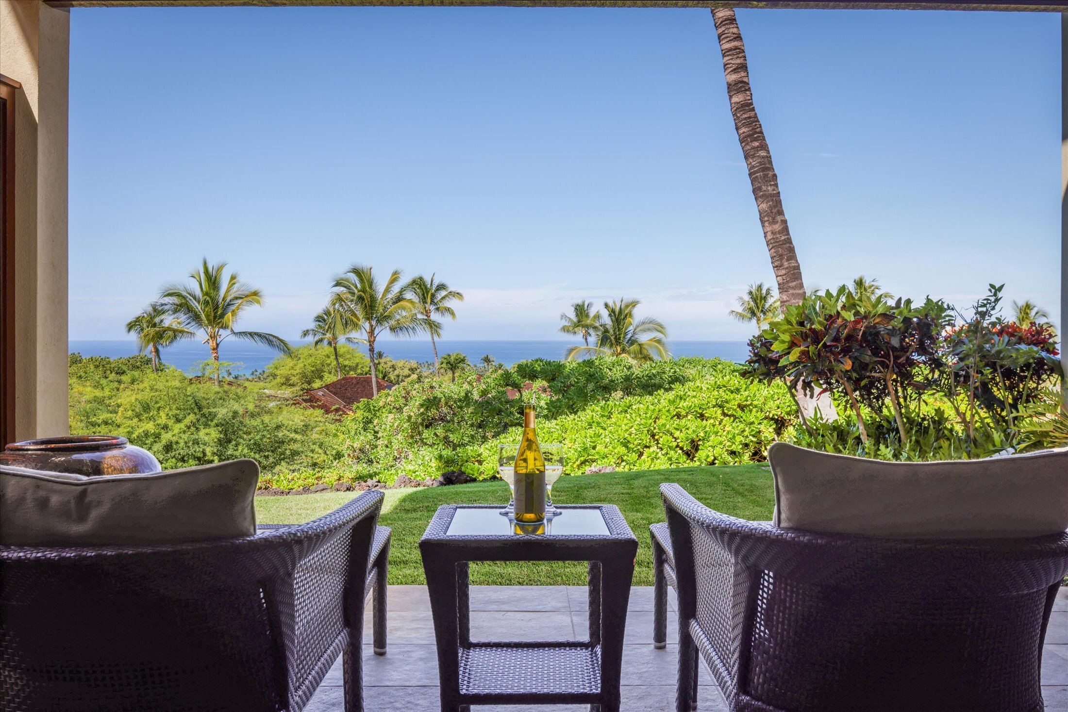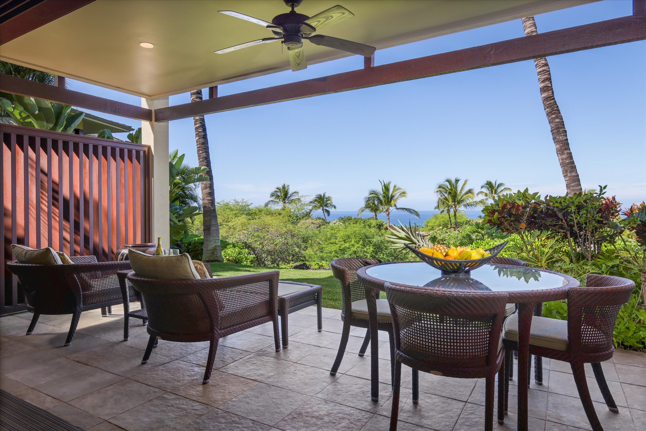Hainoa Villa 2903A (#15) offers a rare opportunity to own an entry-level residence within the world-renowned Hualalai Resort, home to the Four Seasons Resort Hualalai. This single-level, garden-level, two-bedroom, two-bath corner condominium is ideally located in an elevated area of the resort, capturing panoramic Pacific Ocean views, gentle trade winds, and breathtaking sunsets. Designed for seamless indoor-outdoor living, the great room opens through sliding pocket doors with rich mahogany shutters to a covered lanai with a built-in Wolf BBQ, granite countertops, and a Sub-Zero refrigerator, perfect for entertaining. The large primary suite includes a private ocean-view lanai, a walk-in closet with built-ins, a spa-style bath with a deep soaking tub, dual vanities, and a signature outdoor shower garden. The well-appointed kitchen showcases top-of-the-line appliances, granite counters, and custom mahogany cabinetry. Additional features include an enclosed one-and-a-half-car garage with storage and a 4-seat golf cart included in the sale. Conveniently located within a short distance to the Members-only Ke‘olu Clubhouse. Membership in The Hualalai Club can be purchased separately from the real estate purchase. Hualalai Club members can access amenities, including two championship golf courses, Residents’ Beach House, Canoe Club, Tennis Club, Sports Club & Spa, ocean pursuits, concierge services, and beach and pool facilities at the Four Seasons Resort Hualalai. Sold turn-key furnished. Vacation Rental is allowed under Four Season's Hualalai Resort rules.