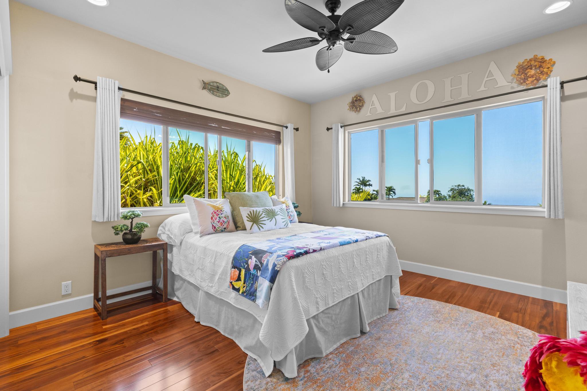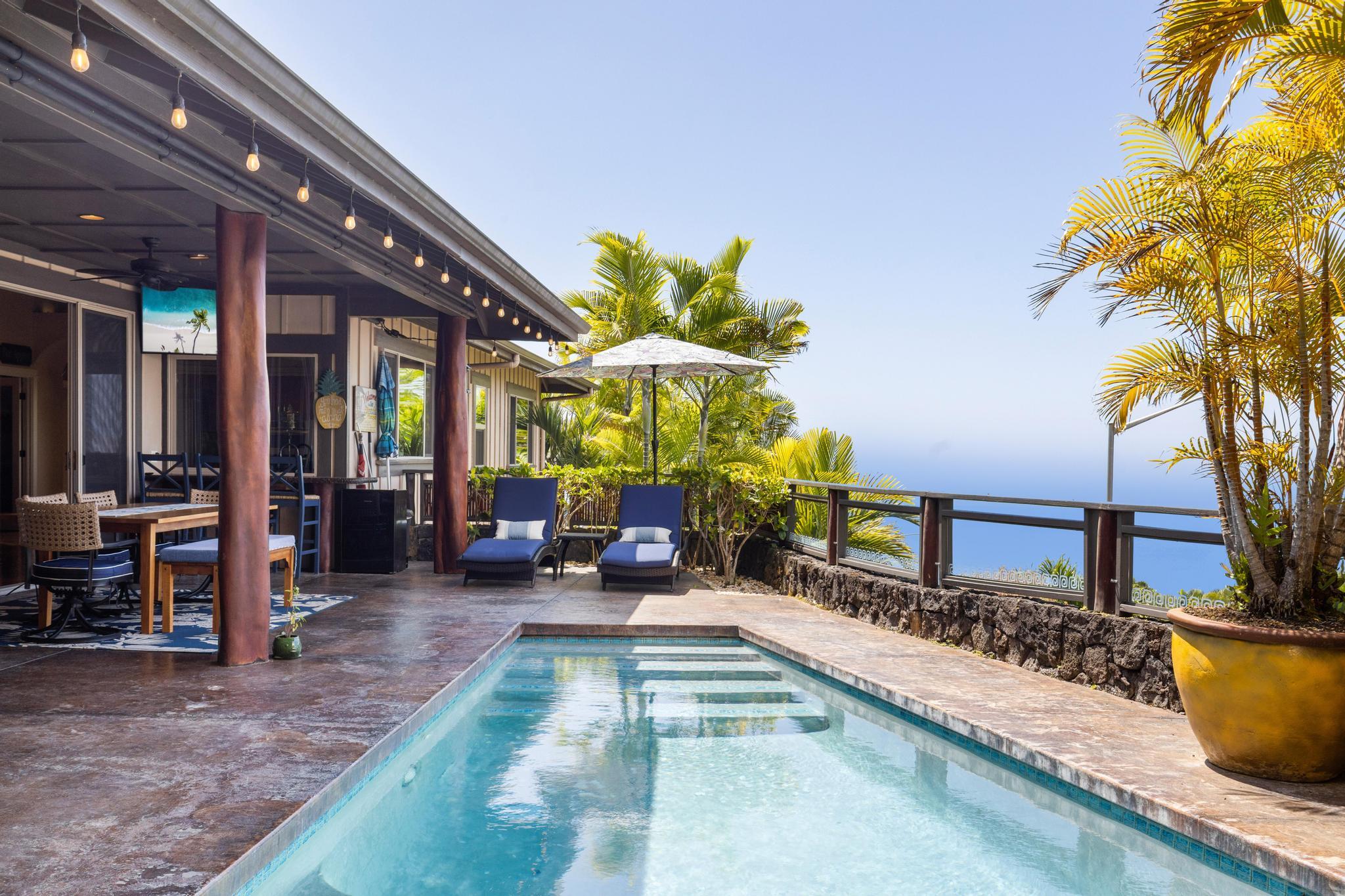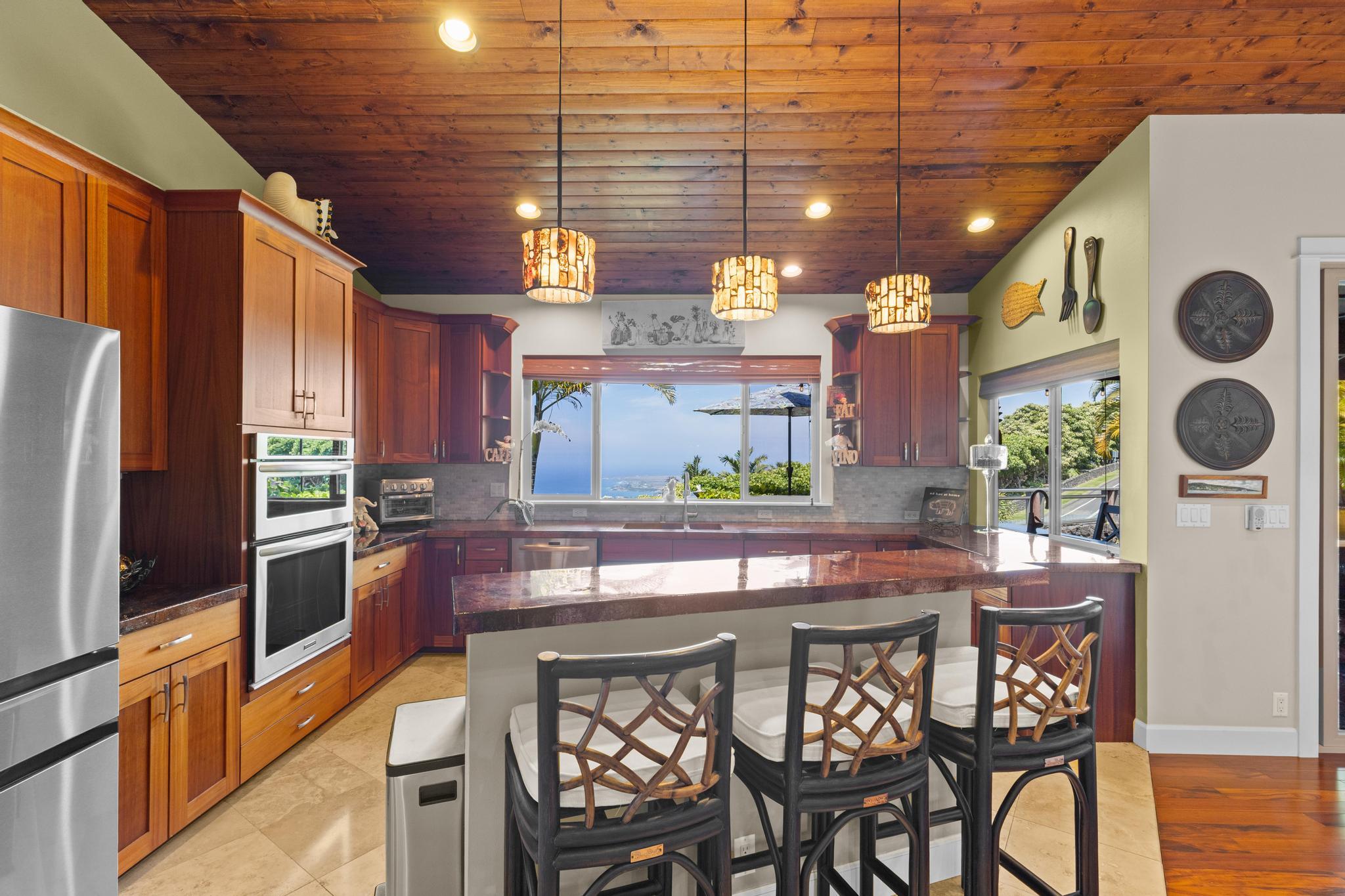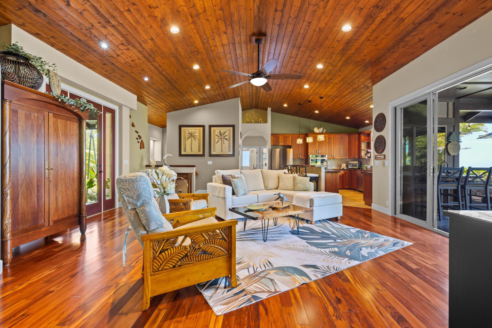 Perched at an ideal elevation in the coveted Iolani Subdivision, this exceptional custom estate captures sweeping Pacific Ocean views, year-round sunsets, and panoramic vistas along the Kailua-Kona coastline. Set on nearly one acre of beautifully landscaped grounds, the property offers privacy, space, and an elevated island lifestyle just minutes from beaches, Kailua Village, and the charming coffee-farming community of Holualoa. Designed for both elegant living and effortless entertaining, this 4-bedroom, 3.5-bath residence includes a dedicated office and a private garden-level guest suite with its own entrance–ideal for extended family or visiting guests. The home showcases outstanding craftsmanship with rich tigerwood flooring, soaring wood ceilings, custom stonework, and refined architectural details throughout. Expansive windows frame the ocean horizon, filling the living spaces with natural light and spectacular views. At the heart of the home, the chef’s kitchen features custom concrete countertops, stainless steel appliances, a six-burner gas range, an oversized walk-in pantry, and a convenient pass-through window to the lanai–perfect for seamless indoor-outdoor entertaining. The spacious primary suite offers a serene retreat with a spa-inspired bath, custom finishes, and private access to the pool and lanai. Two additional upstairs bedrooms enjoy beautiful ocean views, while the lower-level guest suite opens to lush garden surroundings. Comfort is enhanced with split A/C systems in the primary suite and living room, freestanding cooling units in the additional bedrooms, and blackout curtains in all bedrooms for restful nights. Outdoor living embraces the best of Kona with a resort-style pool and sunset lanai featuring a built-in BBQ, wet bar, and a dramatic lighted waterfall. Upgraded glass pool fencing maximizes the breathtaking ocean views, while solar pool heating enhances comfort year-round.