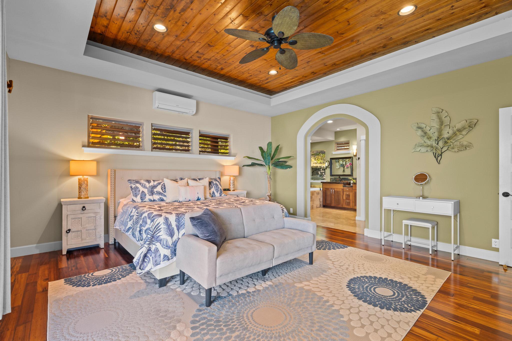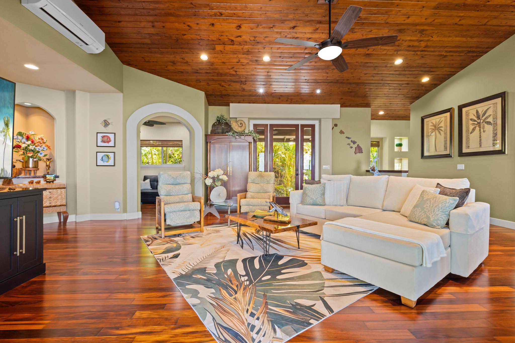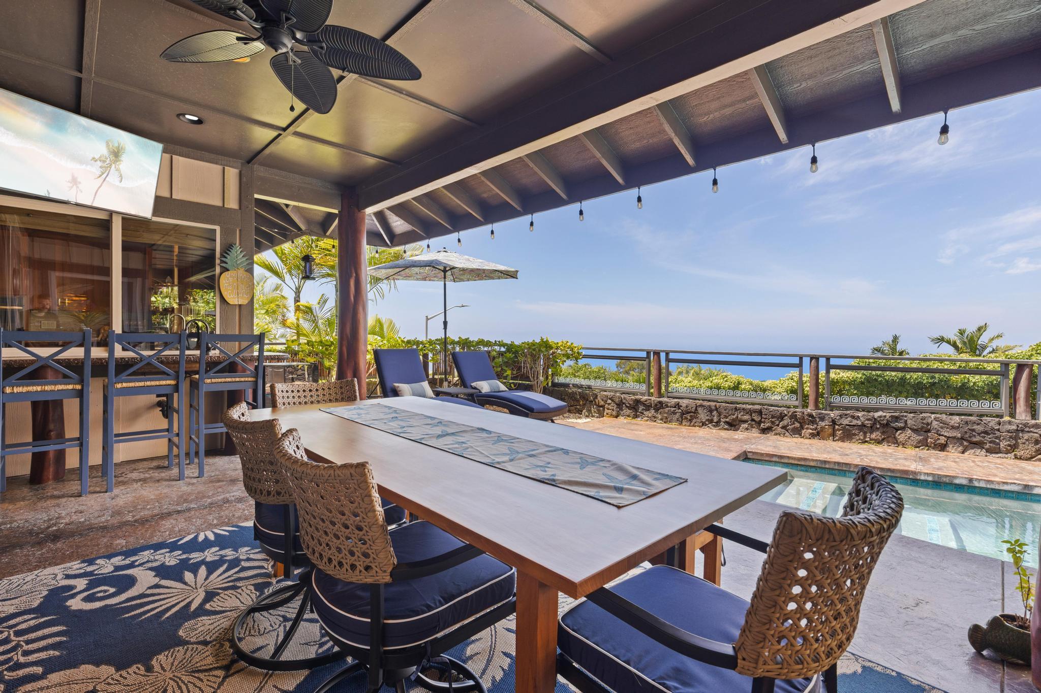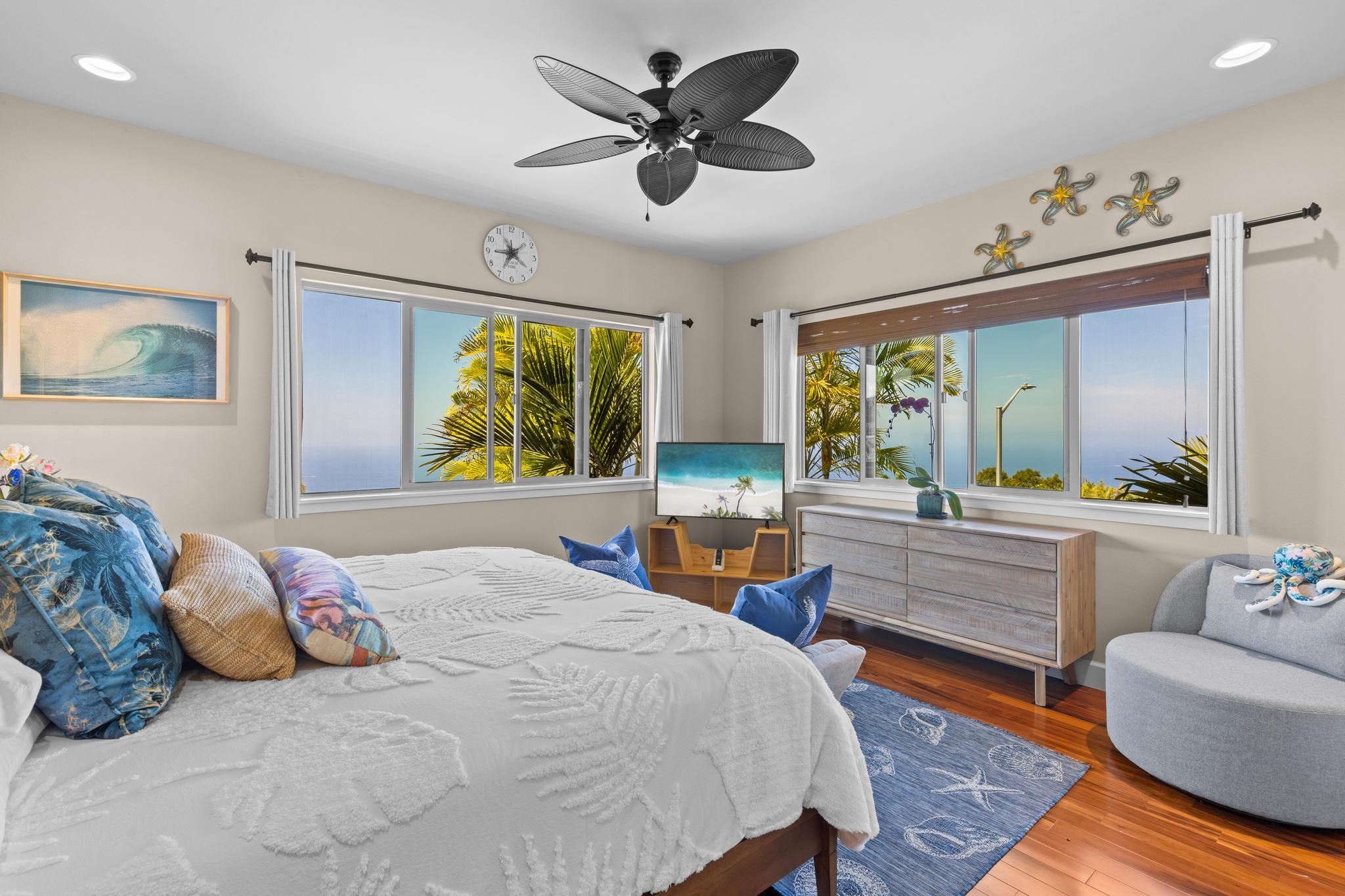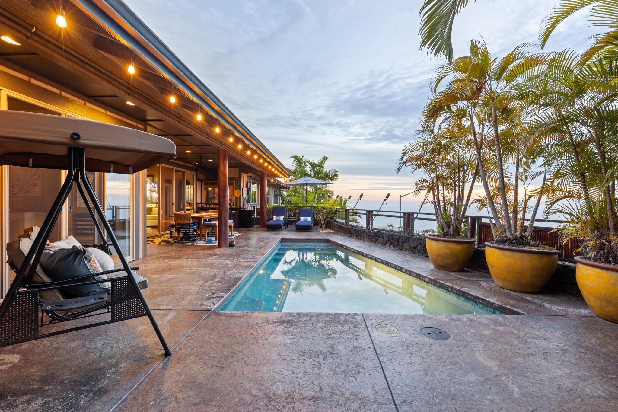 Perched at an ideal elevation in the coveted Iolani Subdivision, this exceptional custom estate captures sweeping Pacific Ocean views, year-round sunsets, and panoramic vistas along the Kailua-Kona coastline. Set on nearly one acre of beautifully landscaped grounds, the property offers privacy, space, and an elevated island lifestyle just minutes from beaches, Kailua Village, and the charming coffee-farming community of Holualoa. Designed for both elegant living and effortless entertaining, this 4-bedroom, 3.5-bath residence includes a dedicated office and a private garden-level guest suite with its own entrance–ideal for extended family or visiting guests. The home showcases outstanding craftsmanship with rich tigerwood flooring, soaring wood ceilings, custom stonework, and refined architectural details throughout. Expansive windows frame the ocean horizon, filling the living spaces with natural light and spectacular views. At the heart of the home, the chef’s kitchen features custom concrete countertops, stainless steel appliances, a six-burner gas range, an oversized walk-in pantry, and a convenient pass-through window to the lanai–perfect for seamless indoor-outdoor entertaining. The spacious primary suite offers a serene retreat with a spa-inspired bath, custom finishes, and private access to the pool and lanai. Two additional upstairs bedrooms enjoy beautiful ocean views, while the lower-level guest suite opens to lush garden surroundings. Comfort is enhanced with split A/C systems in the primary suite and living room, freestanding cooling units in the additional bedrooms, and blackout curtains in all bedrooms for restful nights. Outdoor living embraces the best of Kona with a resort-style pool and sunset lanai featuring a built-in BBQ, wet bar, and a dramatic lighted waterfall. Upgraded glass pool fencing maximizes the breathtaking ocean views, while solar pool heating enhances comfort year-round.