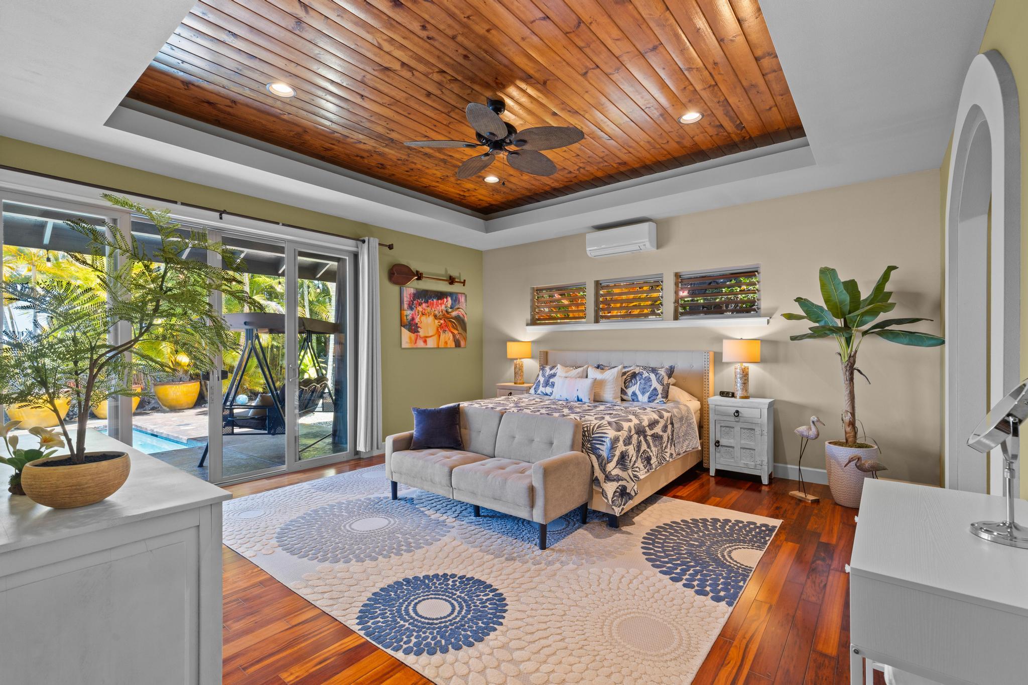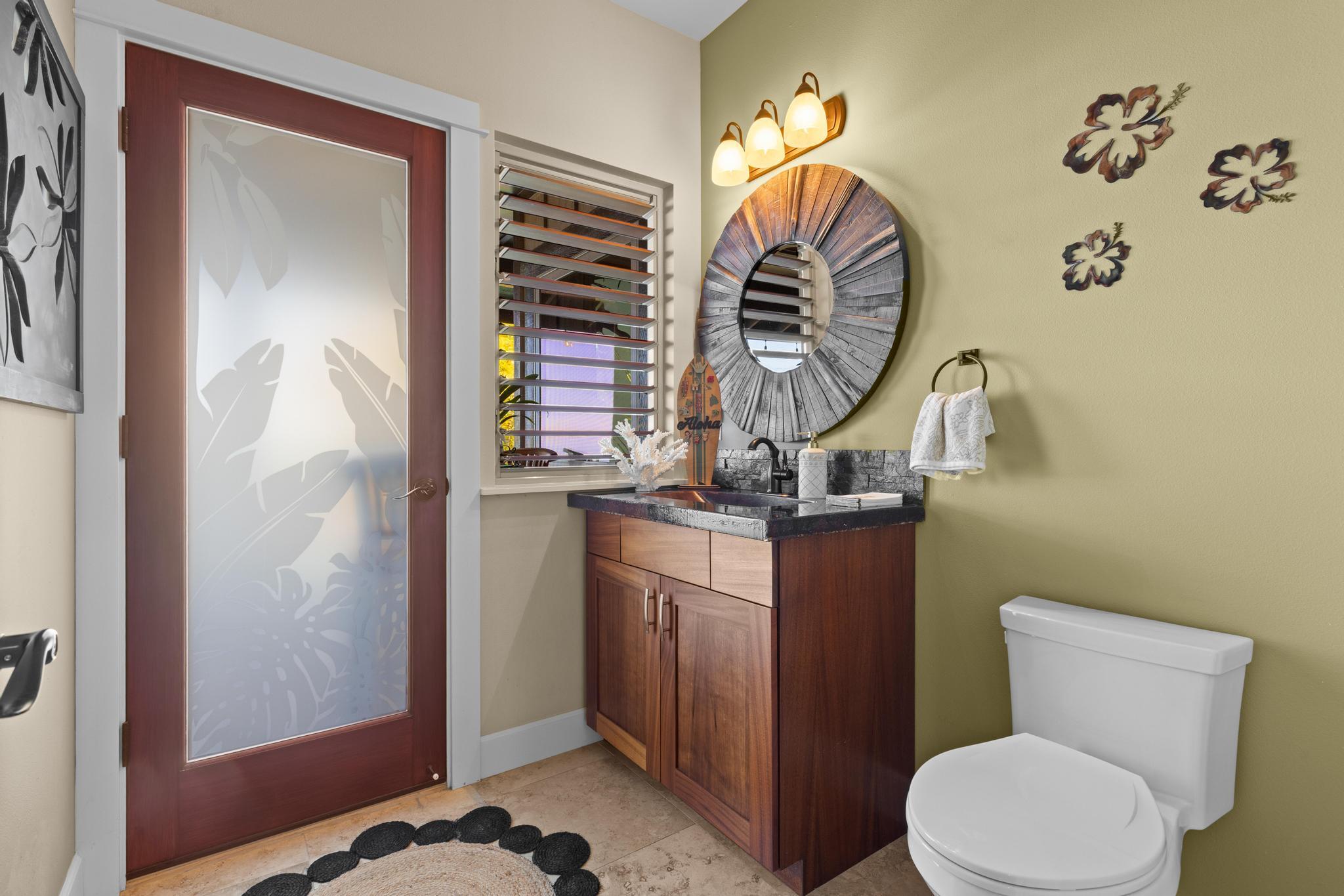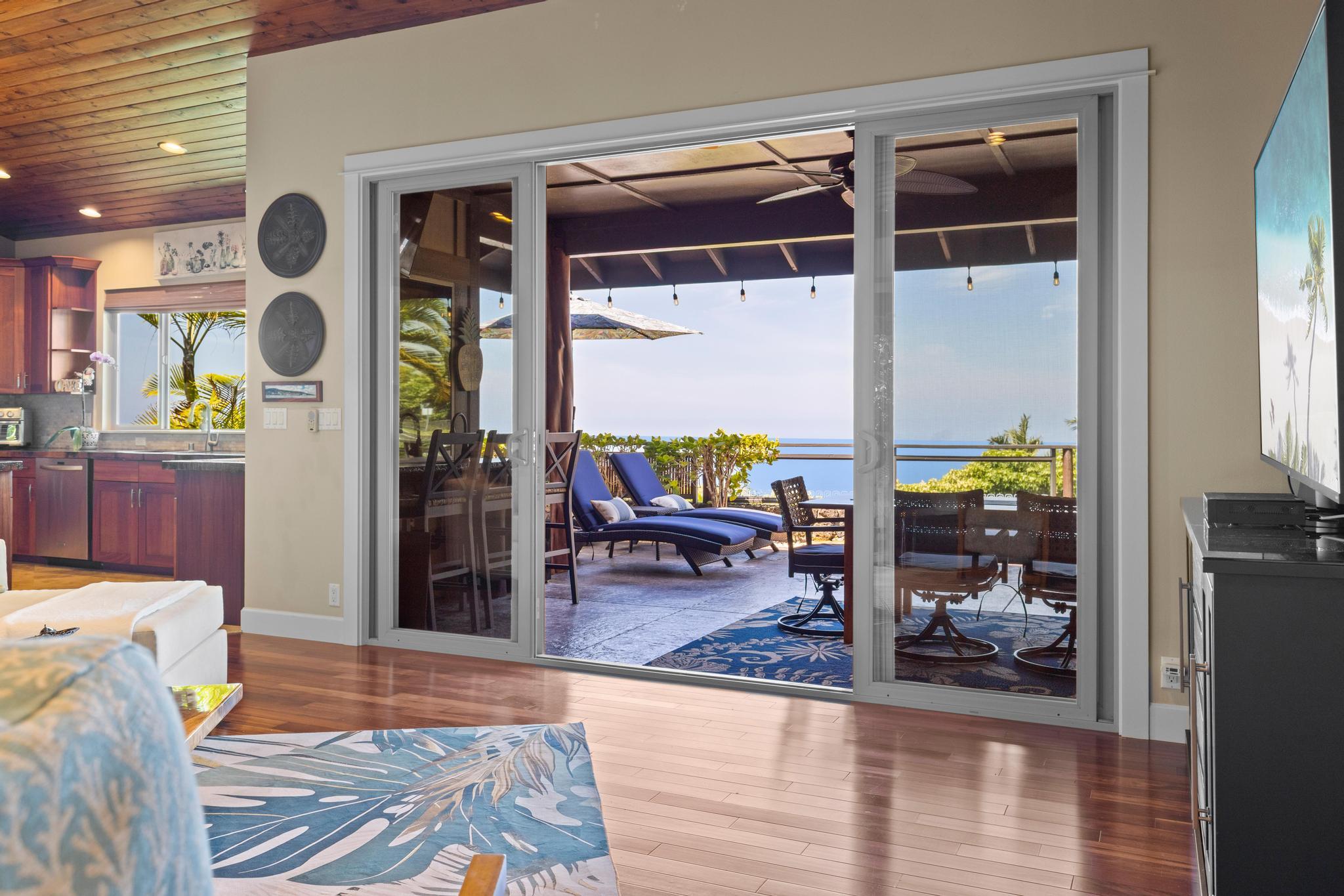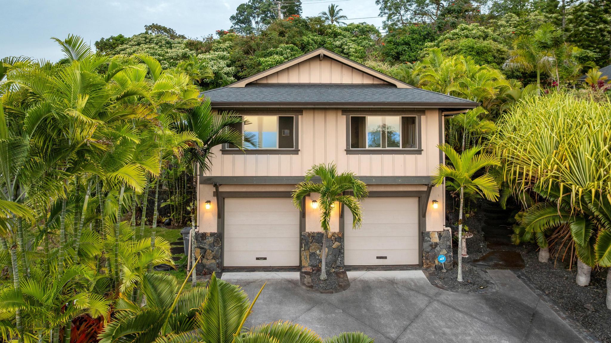 Perched at an ideal elevation in the coveted Iolani Subdivision, this exceptional custom estate captures sweeping Pacific Ocean views, year-round sunsets, and panoramic vistas along the Kailua-Kona coastline. Set on nearly one acre of beautifully landscaped grounds, the property offers privacy, space, and an elevated island lifestyle just minutes from beaches, Kailua Village, and the charming coffee-farming community of Holualoa. Designed for both elegant living and effortless entertaining, this 4-bedroom, 3.5-bath residence includes a dedicated office and a private garden-level guest suite with its own entrance–ideal for extended family or visiting guests. The home showcases outstanding craftsmanship with rich tigerwood flooring, soaring wood ceilings, custom stonework, and refined architectural details throughout. Expansive windows frame the ocean horizon, filling the living spaces with natural light and spectacular views. At the heart of the home, the chef’s kitchen features custom concrete countertops, stainless steel appliances, a six-burner gas range, an oversized walk-in pantry, and a convenient pass-through window to the lanai–perfect for seamless indoor-outdoor entertaining. The spacious primary suite offers a serene retreat with a spa-inspired bath, custom finishes, and private access to the pool and lanai. Two additional upstairs bedrooms enjoy beautiful ocean views, while the lower-level guest suite opens to lush garden surroundings. Comfort is enhanced with split A/C systems in the primary suite and living room, freestanding cooling units in the additional bedrooms, and blackout curtains in all bedrooms for restful nights. Outdoor living embraces the best of Kona with a resort-style pool and sunset lanai featuring a built-in BBQ, wet bar, and a dramatic lighted waterfall. Upgraded glass pool fencing maximizes the breathtaking ocean views, while solar pool heating enhances comfort year-round.