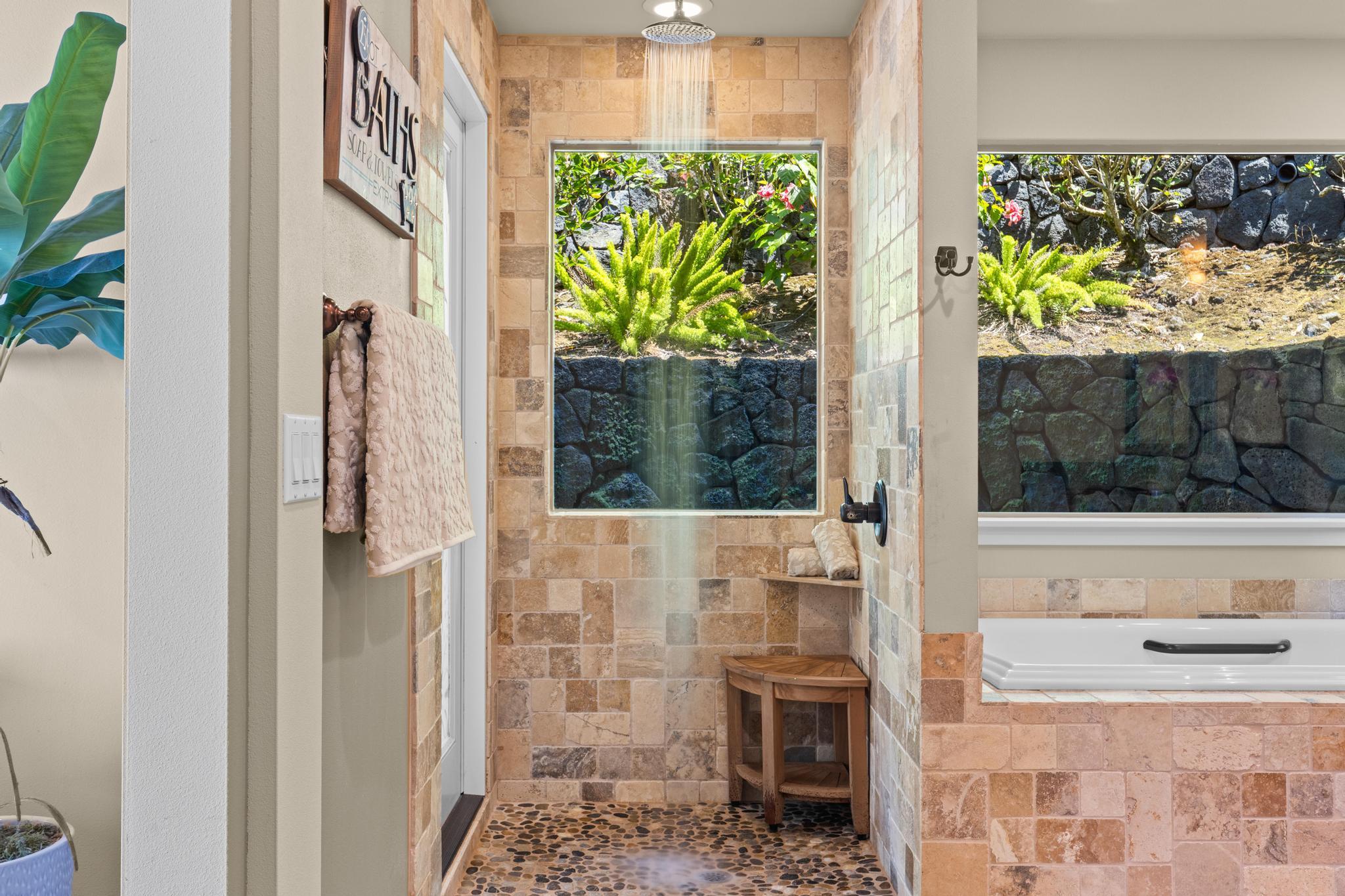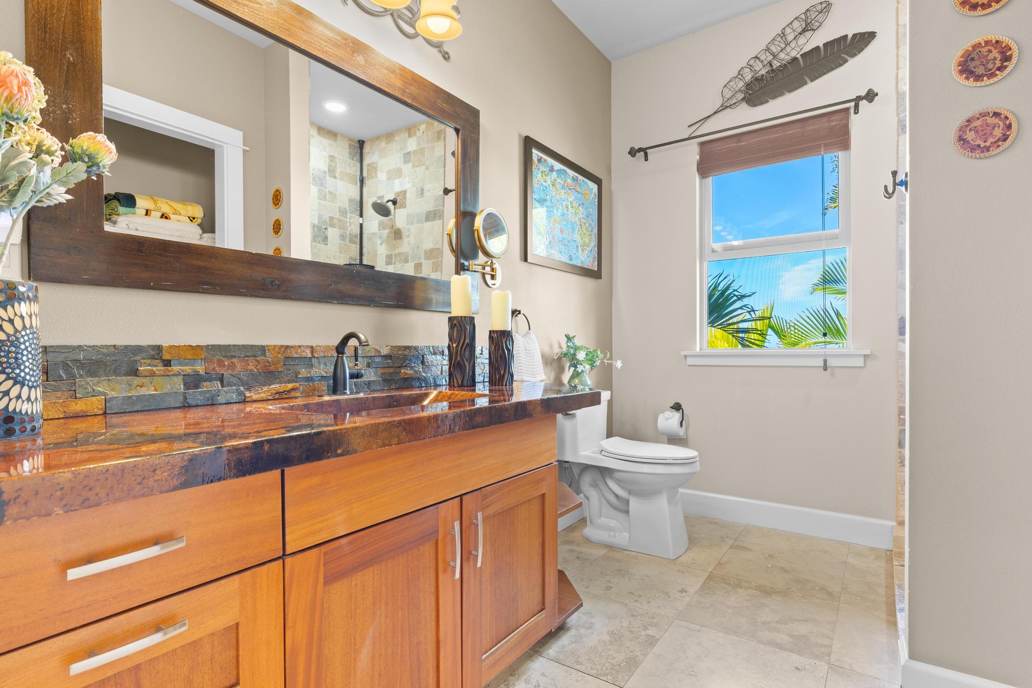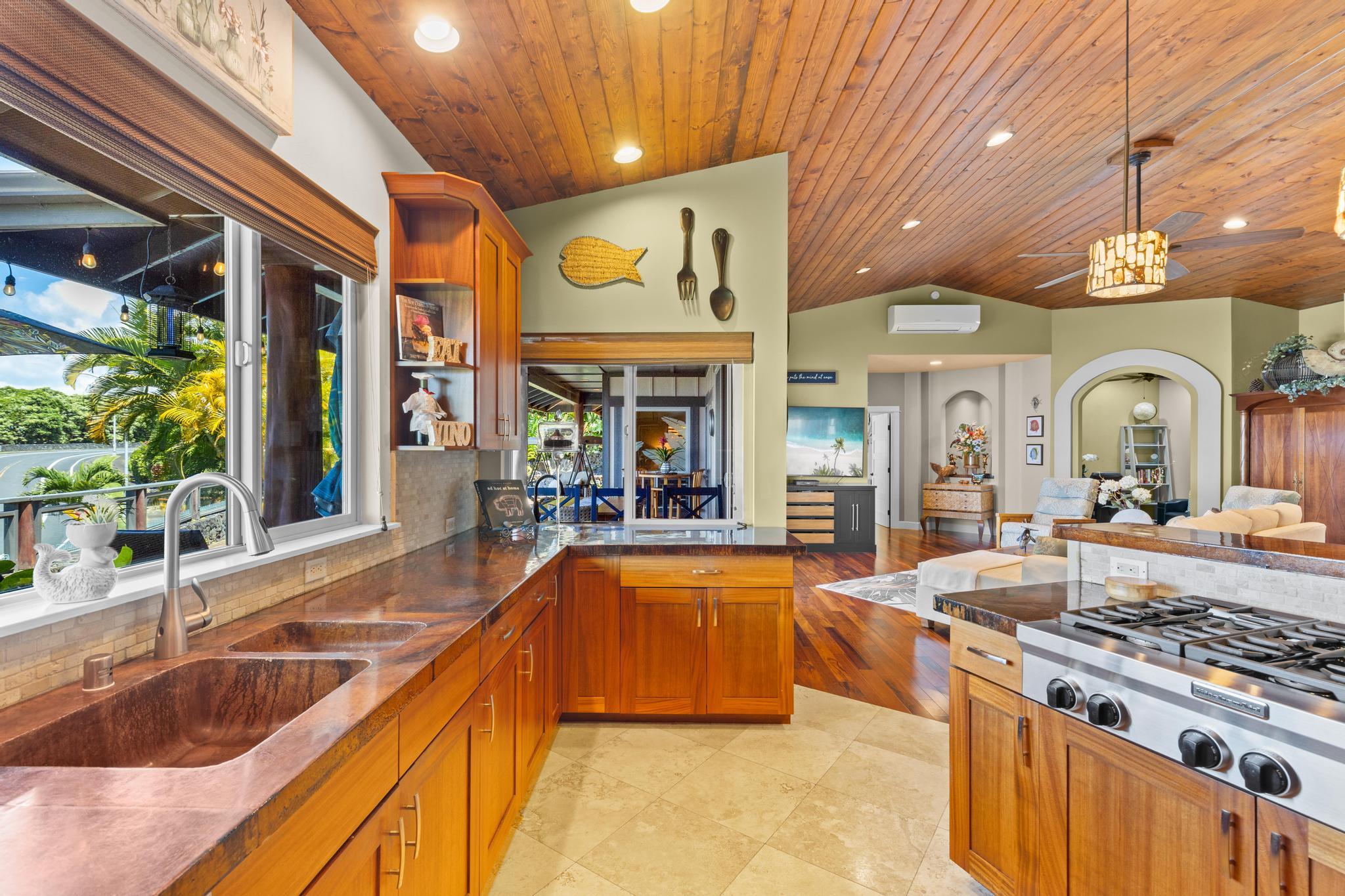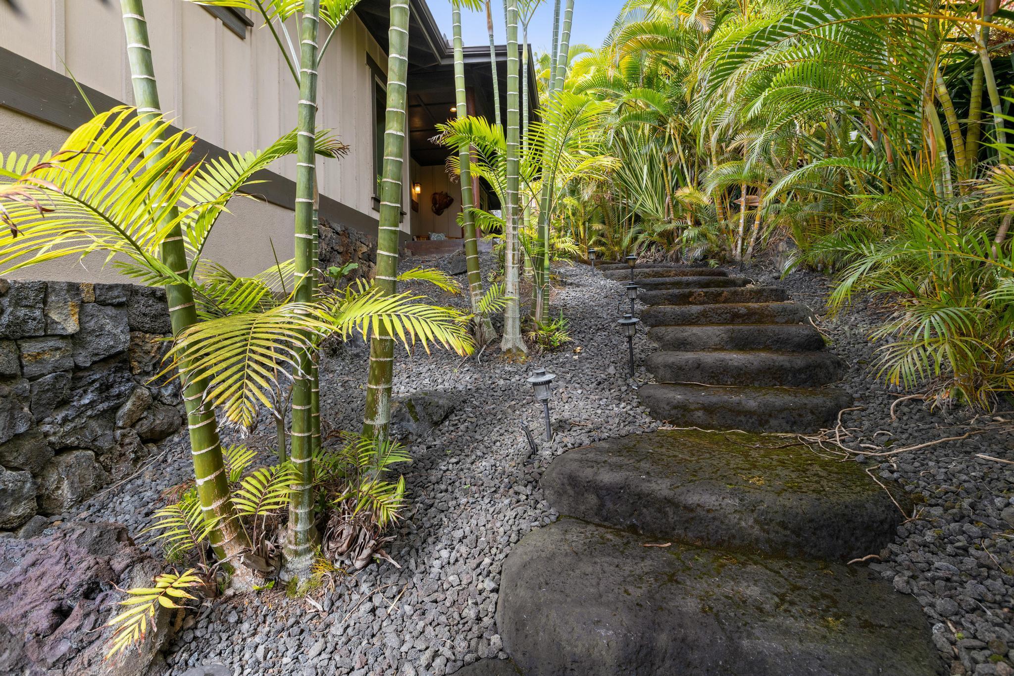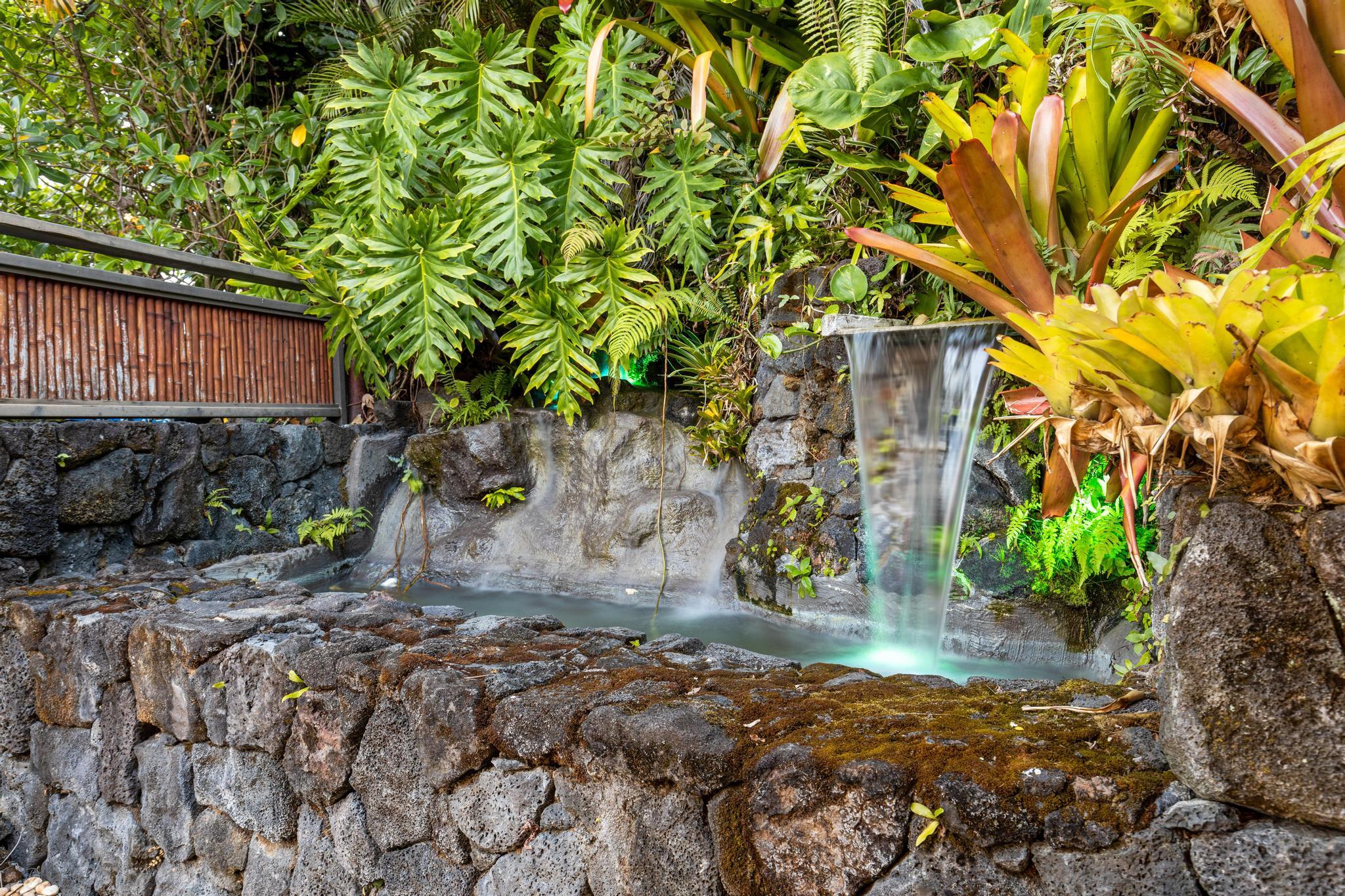 Perched at an ideal elevation in the coveted Iolani Subdivision, this exceptional custom estate captures sweeping Pacific Ocean views, year-round sunsets, and panoramic vistas along the Kailua-Kona coastline. Set on nearly one acre of beautifully landscaped grounds, the property offers privacy, space, and an elevated island lifestyle just minutes from beaches, Kailua Village, and the charming coffee-farming community of Holualoa. Designed for both elegant living and effortless entertaining, this 4-bedroom, 3.5-bath residence includes a dedicated office and a private garden-level guest suite with its own entrance–ideal for extended family or visiting guests. The home showcases outstanding craftsmanship with rich tigerwood flooring, soaring wood ceilings, custom stonework, and refined architectural details throughout. Expansive windows frame the ocean horizon, filling the living spaces with natural light and spectacular views. At the heart of the home, the chef’s kitchen features custom concrete countertops, stainless steel appliances, a six-burner gas range, an oversized walk-in pantry, and a convenient pass-through window to the lanai–perfect for seamless indoor-outdoor entertaining. The spacious primary suite offers a serene retreat with a spa-inspired bath, custom finishes, and private access to the pool and lanai. Two additional upstairs bedrooms enjoy beautiful ocean views, while the lower-level guest suite opens to lush garden surroundings. Comfort is enhanced with split A/C systems in the primary suite and living room, freestanding cooling units in the additional bedrooms, and blackout curtains in all bedrooms for restful nights. Outdoor living embraces the best of Kona with a resort-style pool and sunset lanai featuring a built-in BBQ, wet bar, and a dramatic lighted waterfall. Upgraded glass pool fencing maximizes the breathtaking ocean views, while solar pool heating enhances comfort year-round.