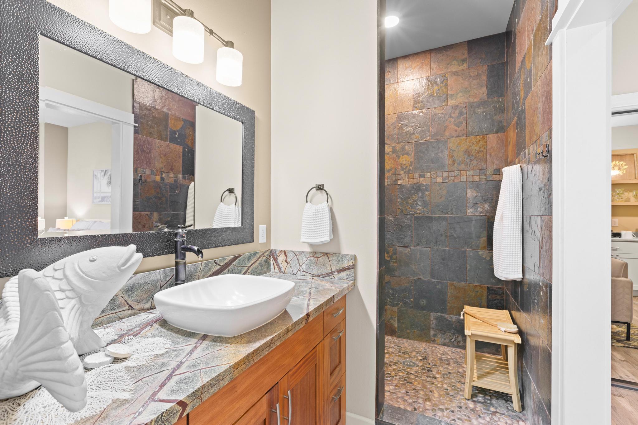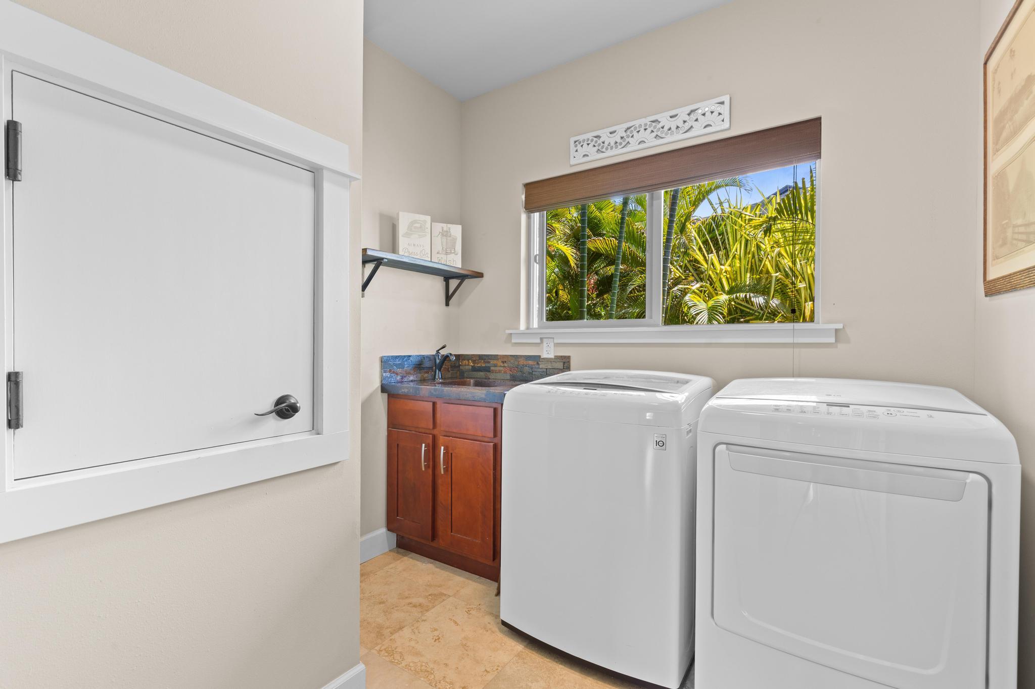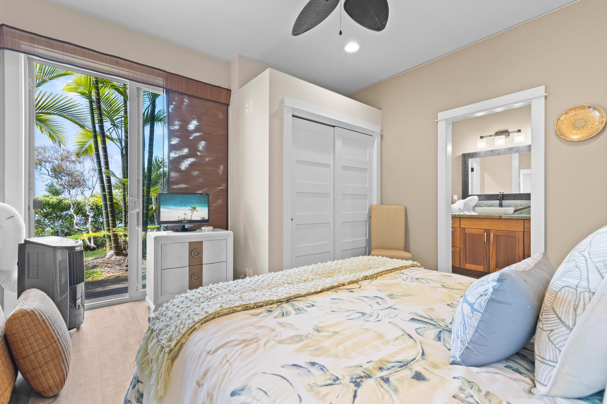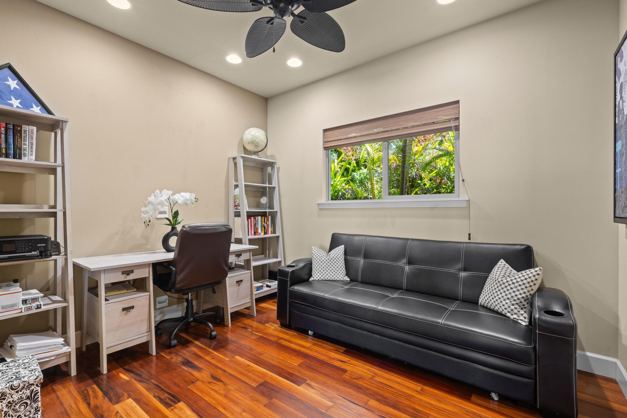 Perched at an ideal elevation in the coveted Iolani Subdivision, this exceptional custom estate captures sweeping Pacific Ocean views, year-round sunsets, and panoramic vistas along the Kailua-Kona coastline. Set on nearly one acre of beautifully landscaped grounds, the property offers privacy, space, and an elevated island lifestyle just minutes from beaches, Kailua Village, and the charming coffee-farming community of Holualoa. Designed for both elegant living and effortless entertaining, this 4-bedroom, 3.5-bath residence includes a dedicated office and a private garden-level guest suite with its own entrance–ideal for extended family or visiting guests. The home showcases outstanding craftsmanship with rich tigerwood flooring, soaring wood ceilings, custom stonework, and refined architectural details throughout. Expansive windows frame the ocean horizon, filling the living spaces with natural light and spectacular views. At the heart of the home, the chef’s kitchen features custom concrete countertops, stainless steel appliances, a six-burner gas range, an oversized walk-in pantry, and a convenient pass-through window to the lanai–perfect for seamless indoor-outdoor entertaining. The spacious primary suite offers a serene retreat with a spa-inspired bath, custom finishes, and private access to the pool and lanai. Two additional upstairs bedrooms enjoy beautiful ocean views, while the lower-level guest suite opens to lush garden surroundings. Comfort is enhanced with split A/C systems in the primary suite and living room, freestanding cooling units in the additional bedrooms, and blackout curtains in all bedrooms for restful nights. Outdoor living embraces the best of Kona with a resort-style pool and sunset lanai featuring a built-in BBQ, wet bar, and a dramatic lighted waterfall. Upgraded glass pool fencing maximizes the breathtaking ocean views, while solar pool heating enhances comfort year-round.