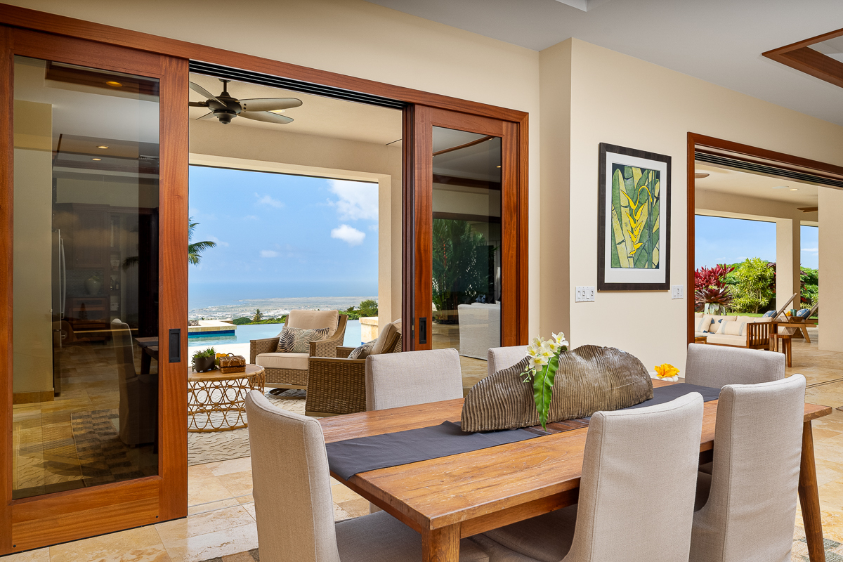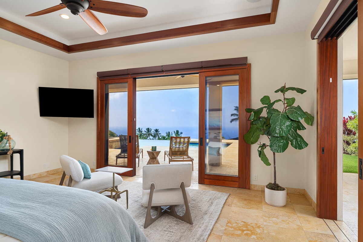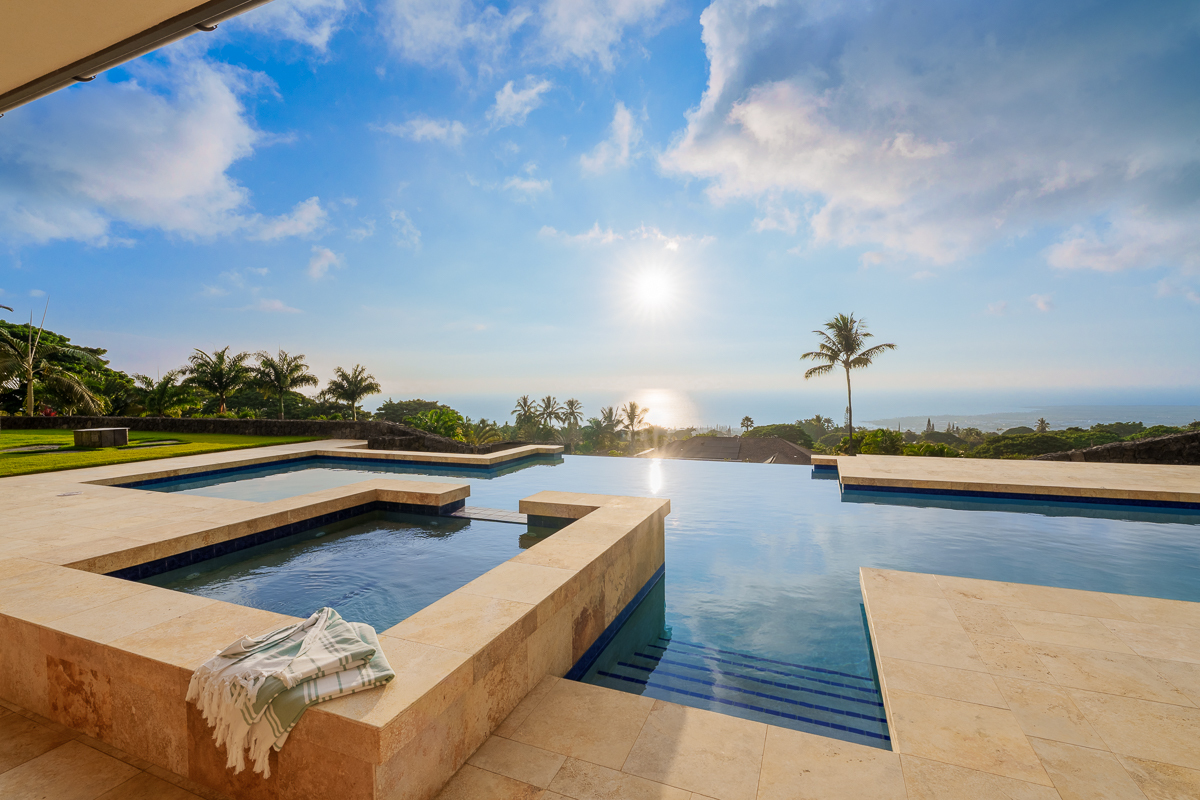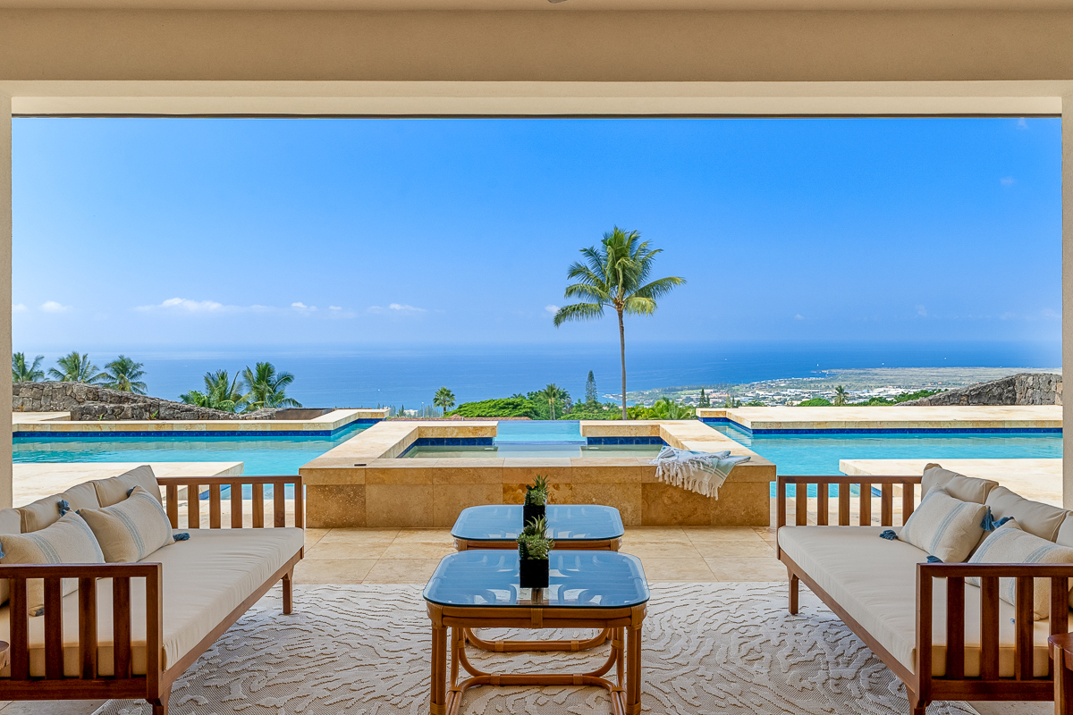 More than 1,200 square feet of covered lanais surround a 50-foot heated infinity-edge pool and spa, framing breathtaking ocean and city vistas. Additionally, not included in the living square footage, the home offers a 500+ square foot covered, fully equipped outdoor kitchen with half bath and outdoor shower, that makes entertaining effortless. Relax on the deep-set lanai's as you enjoy Kona’s year-round outdoor living.