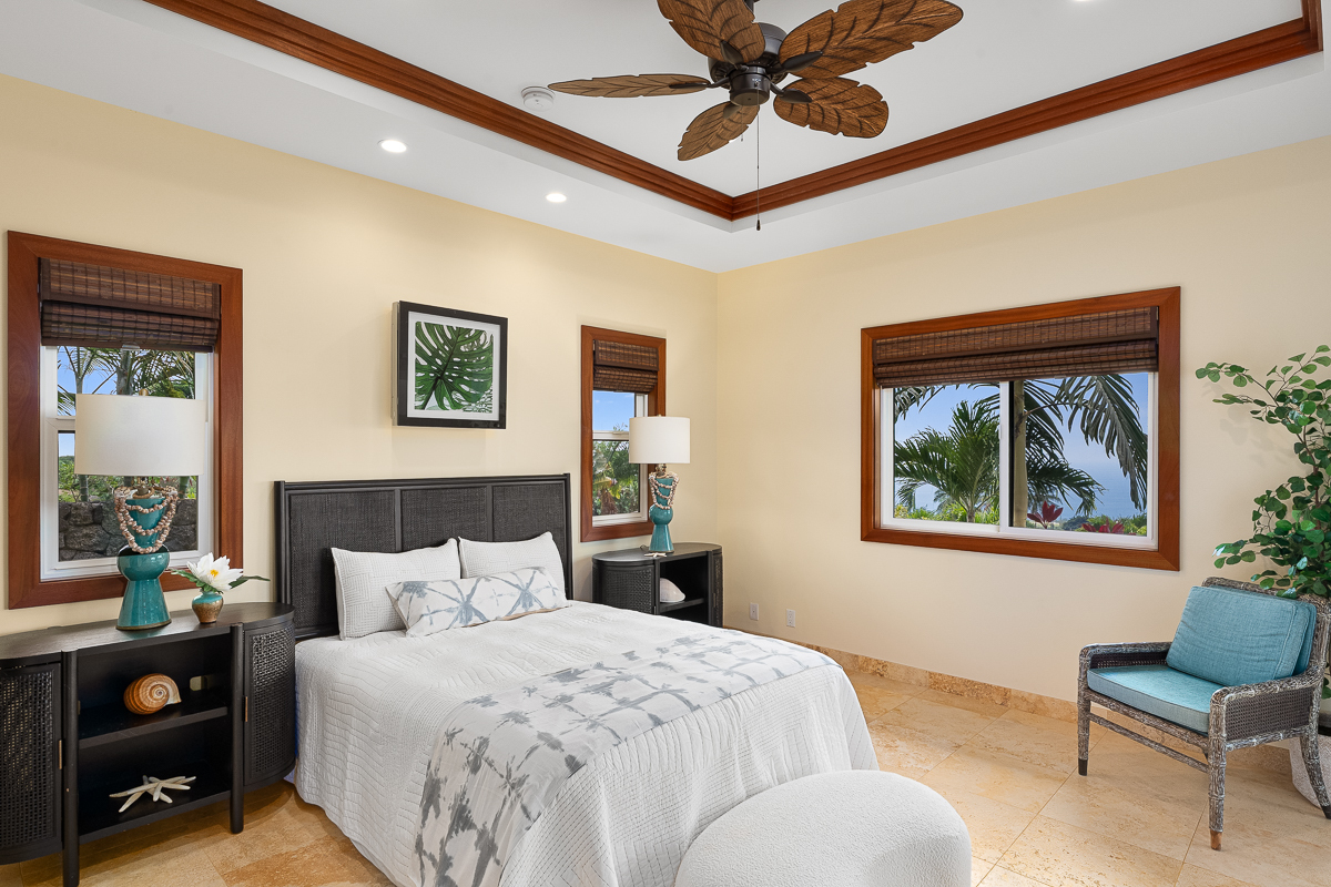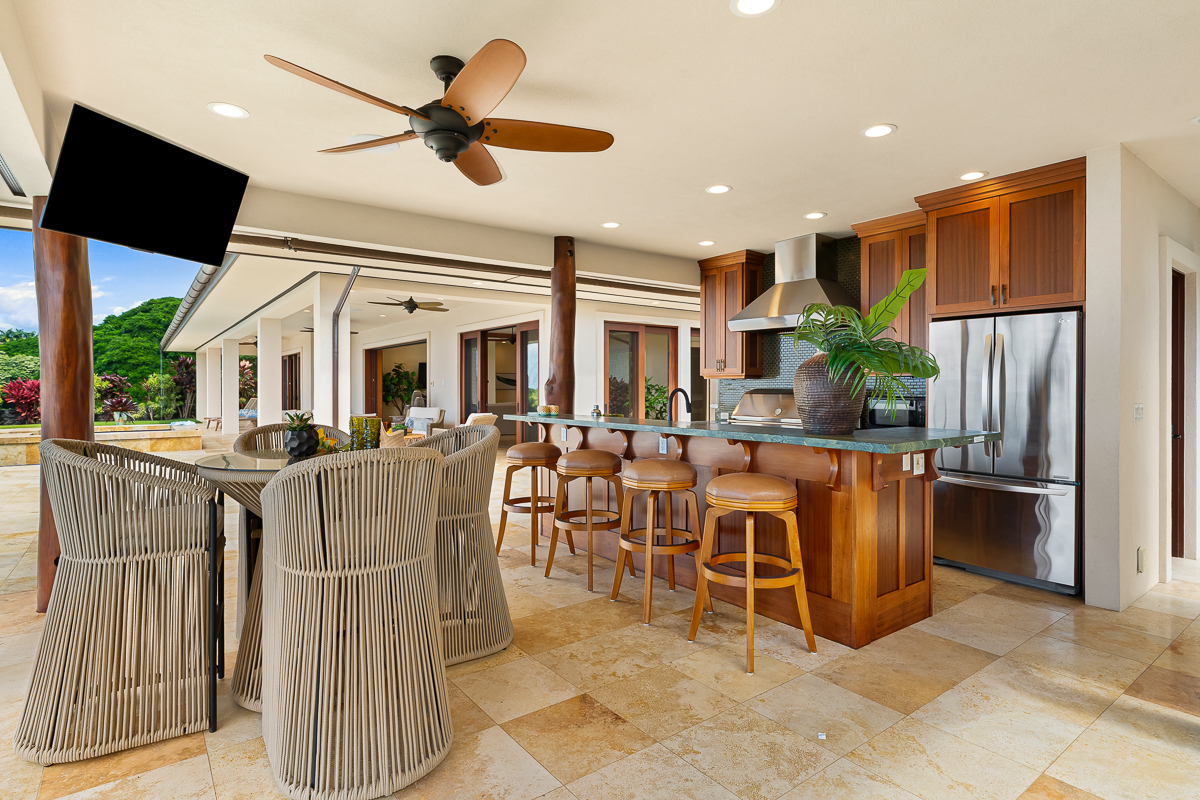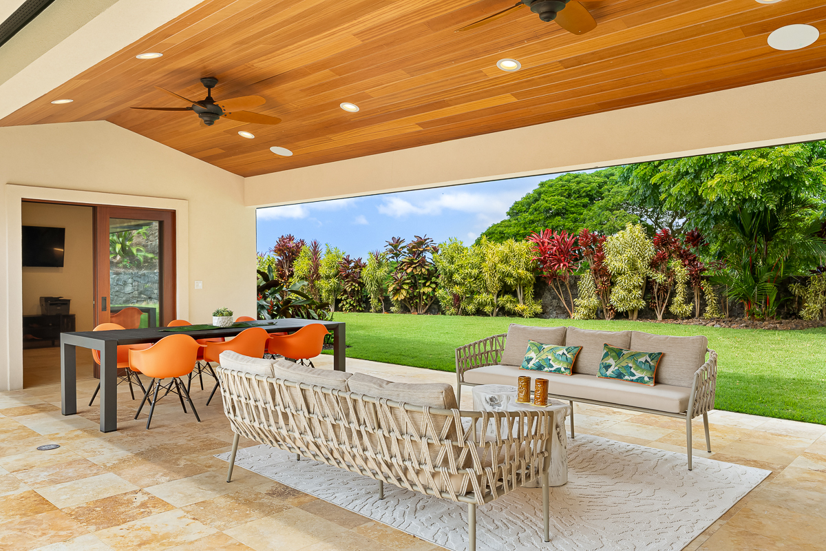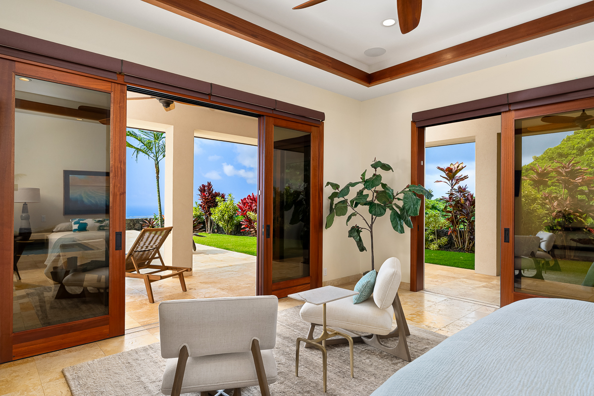 More than 1,200 square feet of covered lanais surround a 50-foot heated infinity-edge pool and spa, framing breathtaking ocean and city vistas. Additionally, not included in the living square footage, the home offers a 500+ square foot covered, fully equipped outdoor kitchen with half bath and outdoor shower, that makes entertaining effortless. Relax on the deep-set lanai's as you enjoy Kona’s year-round outdoor living.