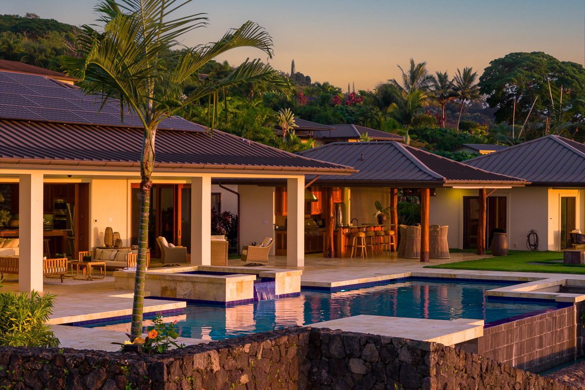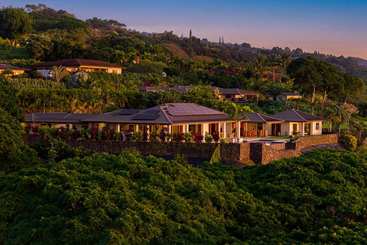 Nestled above Kona Town, Hoku‘aka offers unmatched privacy, serenity, and sweeping views of the coastline, harbor, and city lights below. Just two miles from the heart of Kailua-Kona, this modern pod style single-level island estate rests within a gated community that balances luxury and tranquility.
