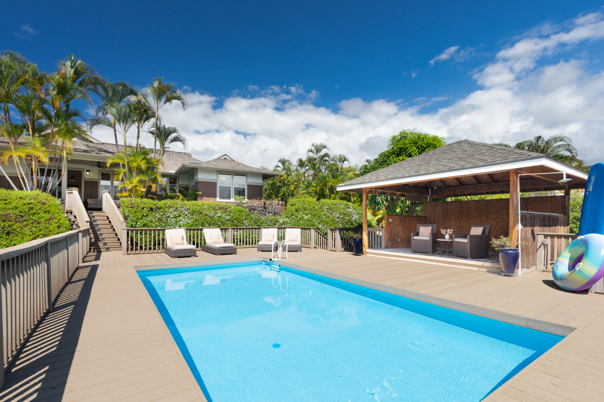 Down below, you’ll find your own tropical retreat – a sparkling pool area with a relaxing “Hale” cabana, perfect for lounging, entertaining, or enjoying sunset cocktails with friends.