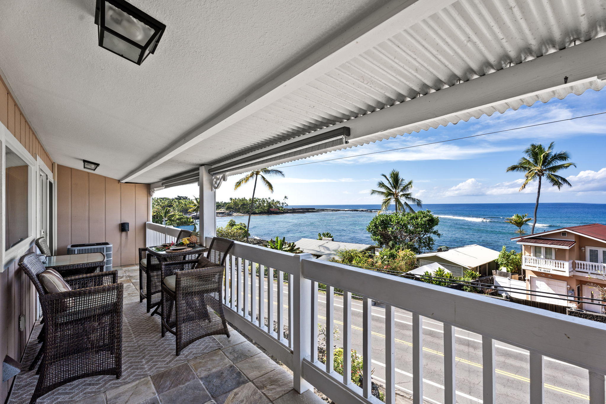 Enjoy the tranquil sounds of the crashing waves and the epic ocean/sunset views from this rarely available top floor unit at the "boutique" Kahaluu Bay condominium complex. This unit is a very successful STVR and is being sold furnished / turnkey. The Kahaluu Reef Condo Complex is a hidden treasure and is located within a vacation/resort zoning node, V-1.25, allowing for the ability to be used as a Short Term Vacation Rental.