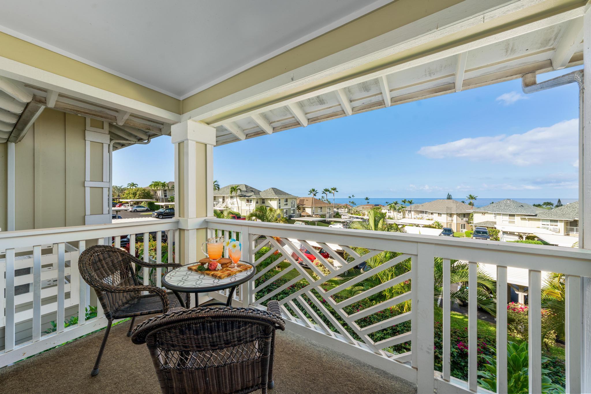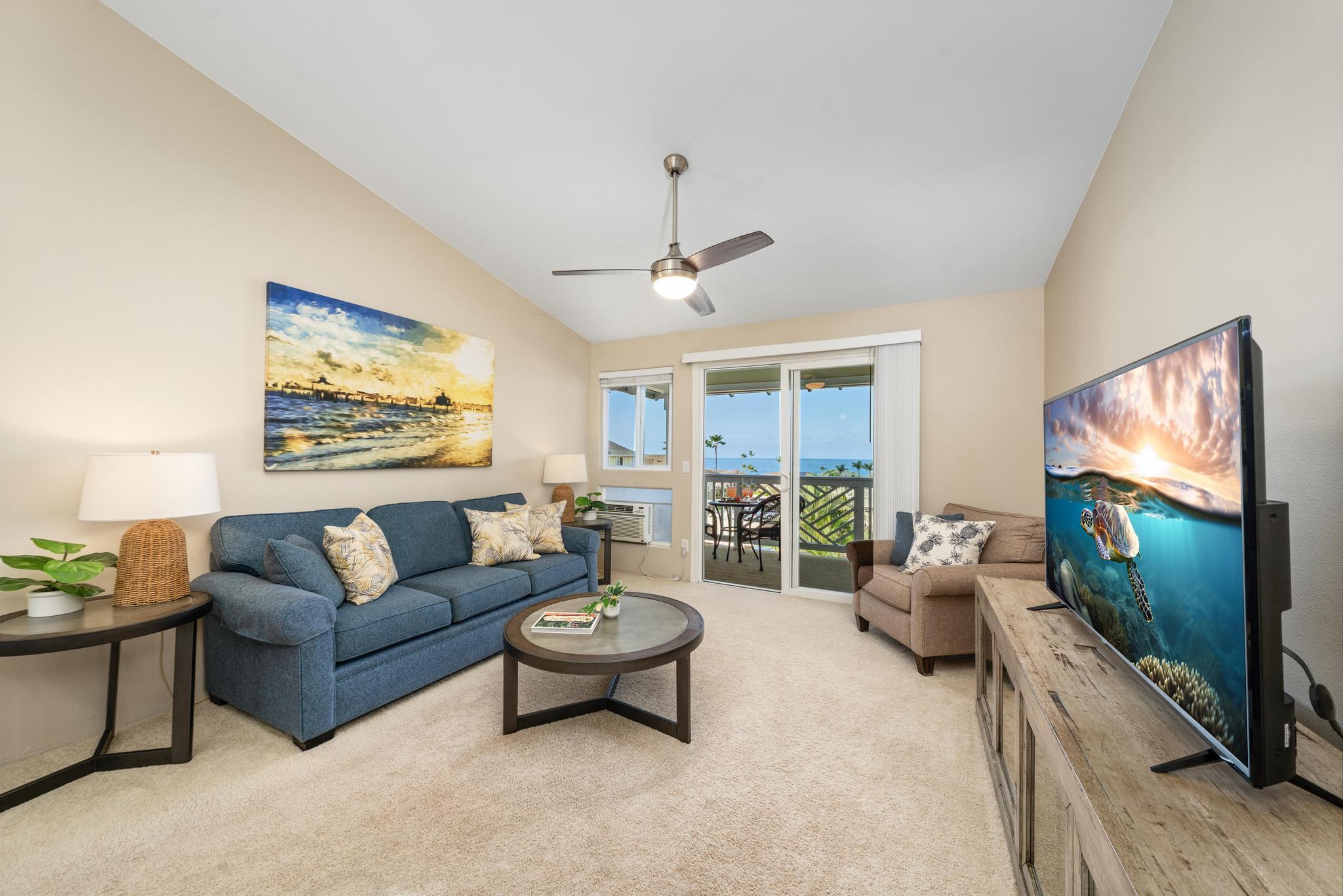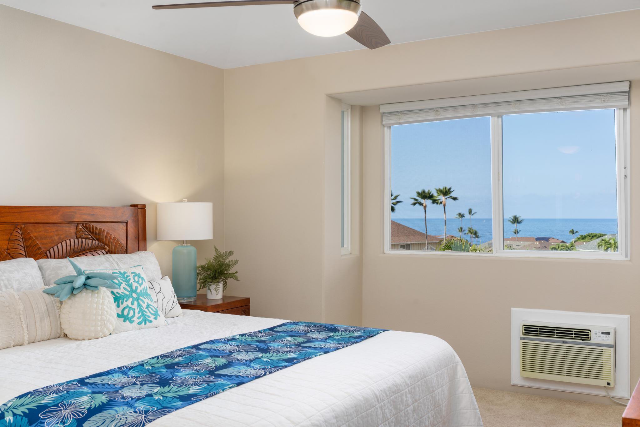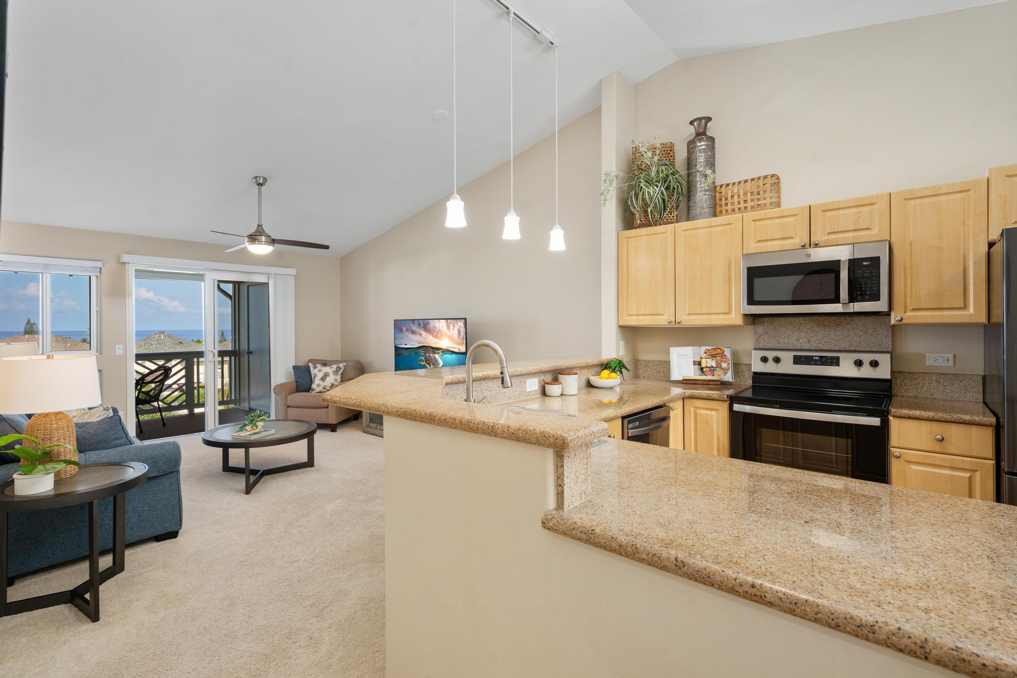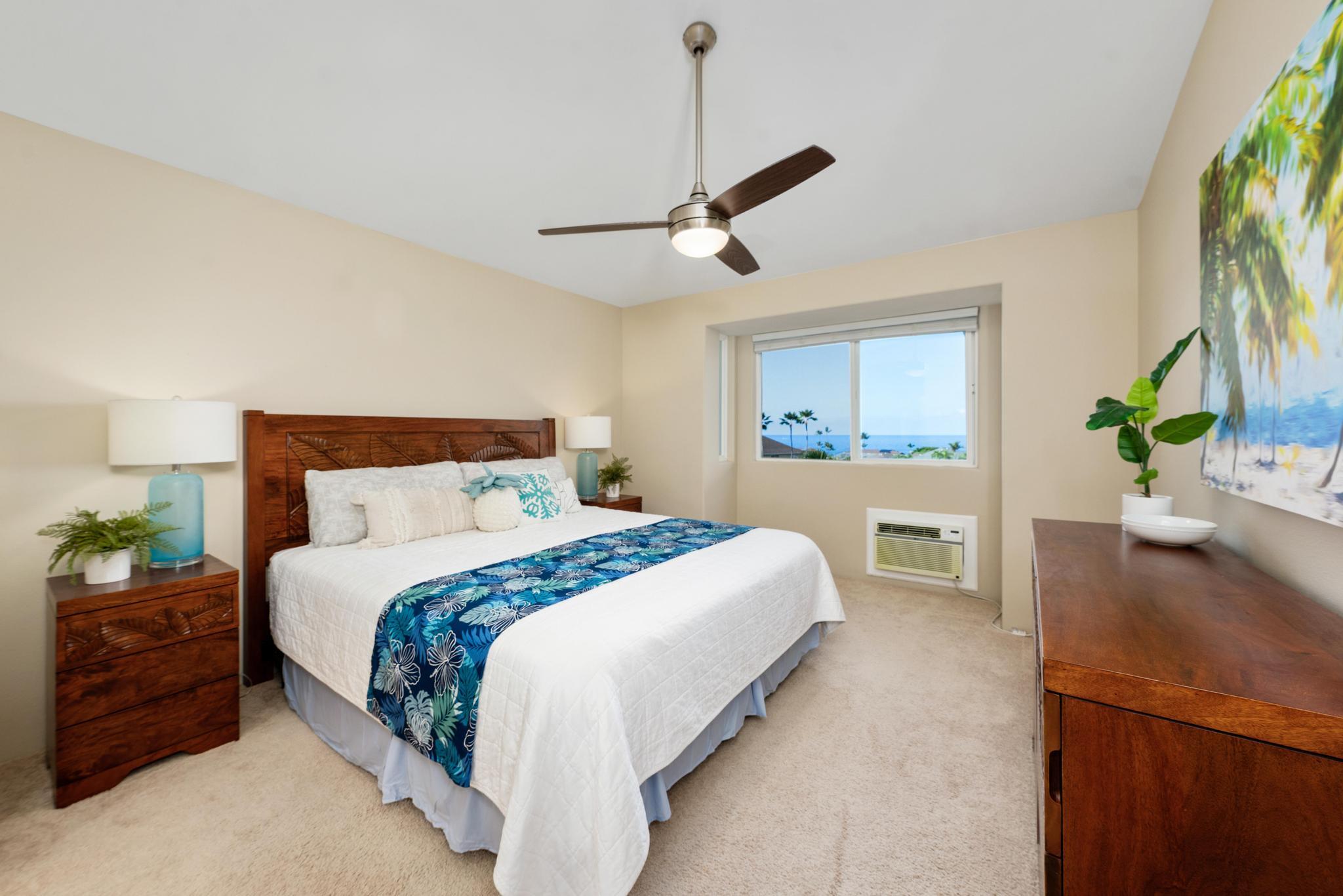 Situated atop the condo complex in the gated Kona Sea Ridge community on Ali`i Drive, K23 boasts stunning ocean views and features a fully furnished 2-bedroom, 2-bathroom layout that perfectly blends comfort, privacy, and the essence of island living. Located on the second floor, it offers ocean views from the kitchen, living room and primary bedroom and complemented by air conditioning, refreshing cross breezes, and ceiling fans to maintain a cool and welcoming atmosphere. The open-concept layout boasts vaulted ceilings in the kitchen and living area, creating a spacious and light-filled environment. The well-equipped kitchen features granite countertops, generous storage, and a breakfast bar, merging functionality with style. The primary bedroom serves as a comfortable ensuite, complete with a walk-in shower, while the guest bedroom offers privacy with beautiful Hualalai mountain view. Step out onto the covered lanai to savor ocean views and fresh breezes–an ideal spot for morning coffee or evening sunsets. The unit also includes a stacked washer/dryer and two assigned parking spaces, one of which is covered. Located in a tranquil area of the community, this condo offers resort-style amenities such as a fitness center, pool, hot tub, BBQ area, and community pavilion. Embrace the delightful coastal lifestyle of Kona in this move-in-ready condition!