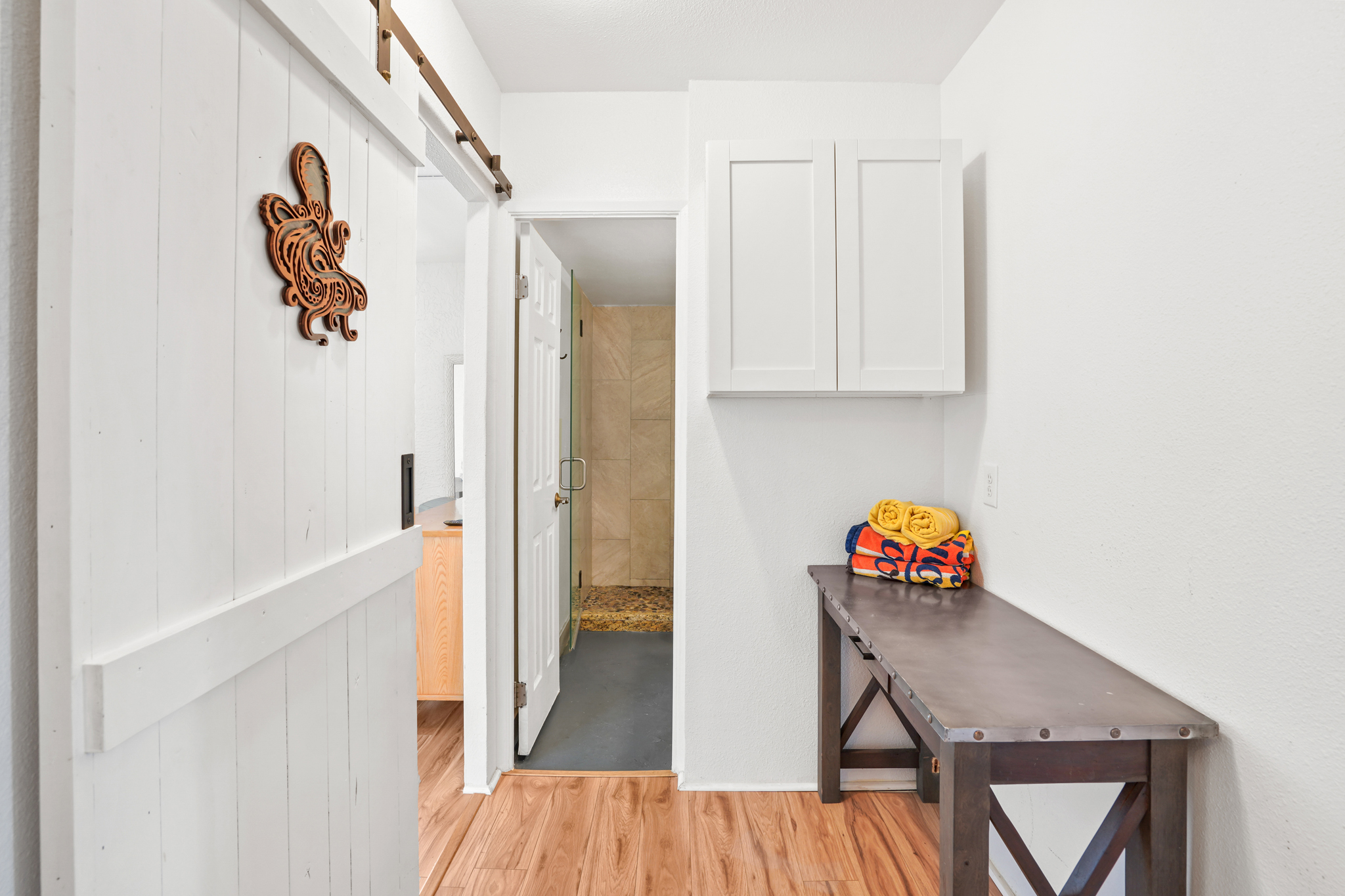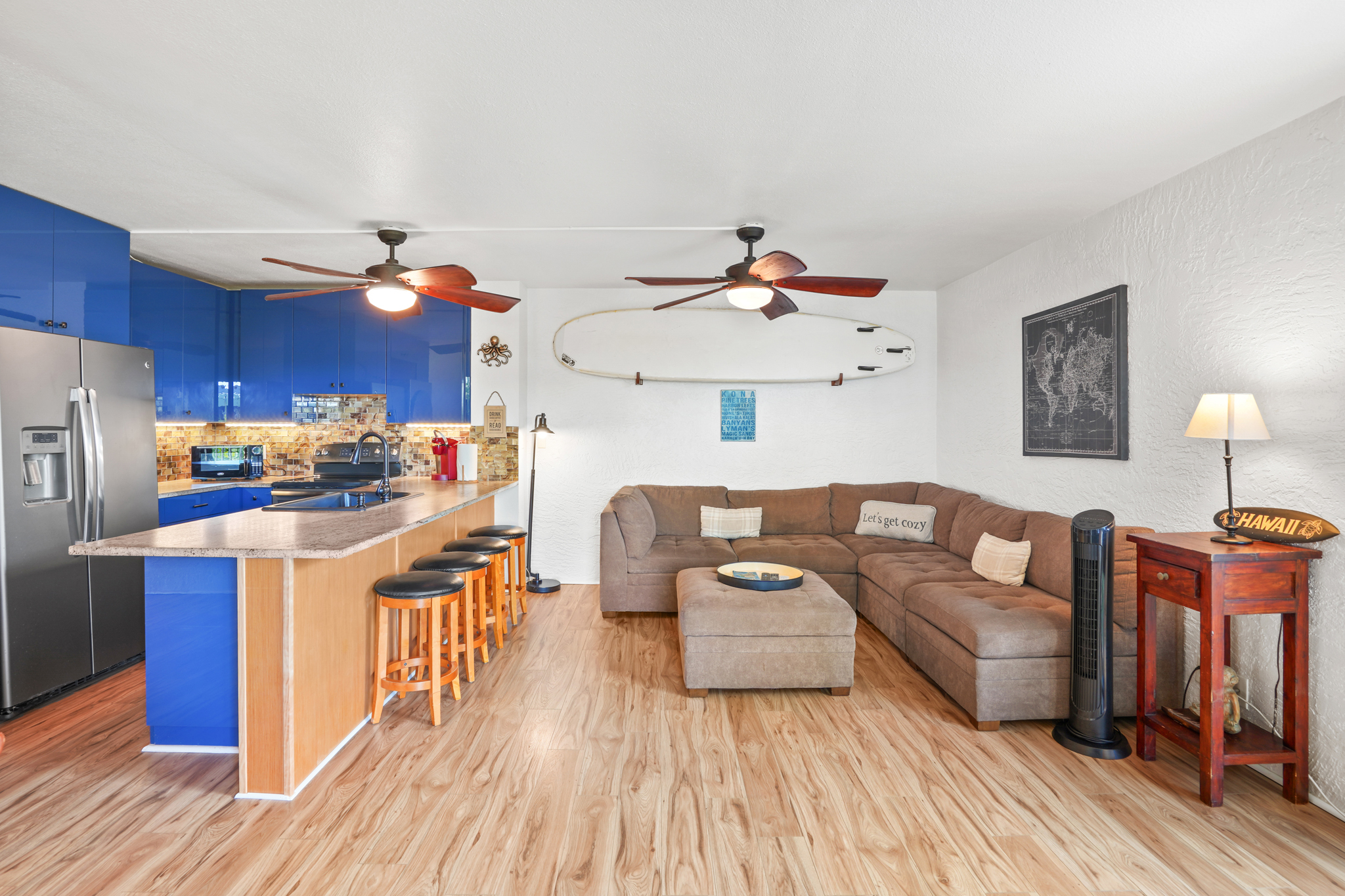 The kitchen is well-appointed with modern appliances and plenty of counter space, while the spacious bedroom provides comfort and relaxation after a day exploring the Kona Coast.