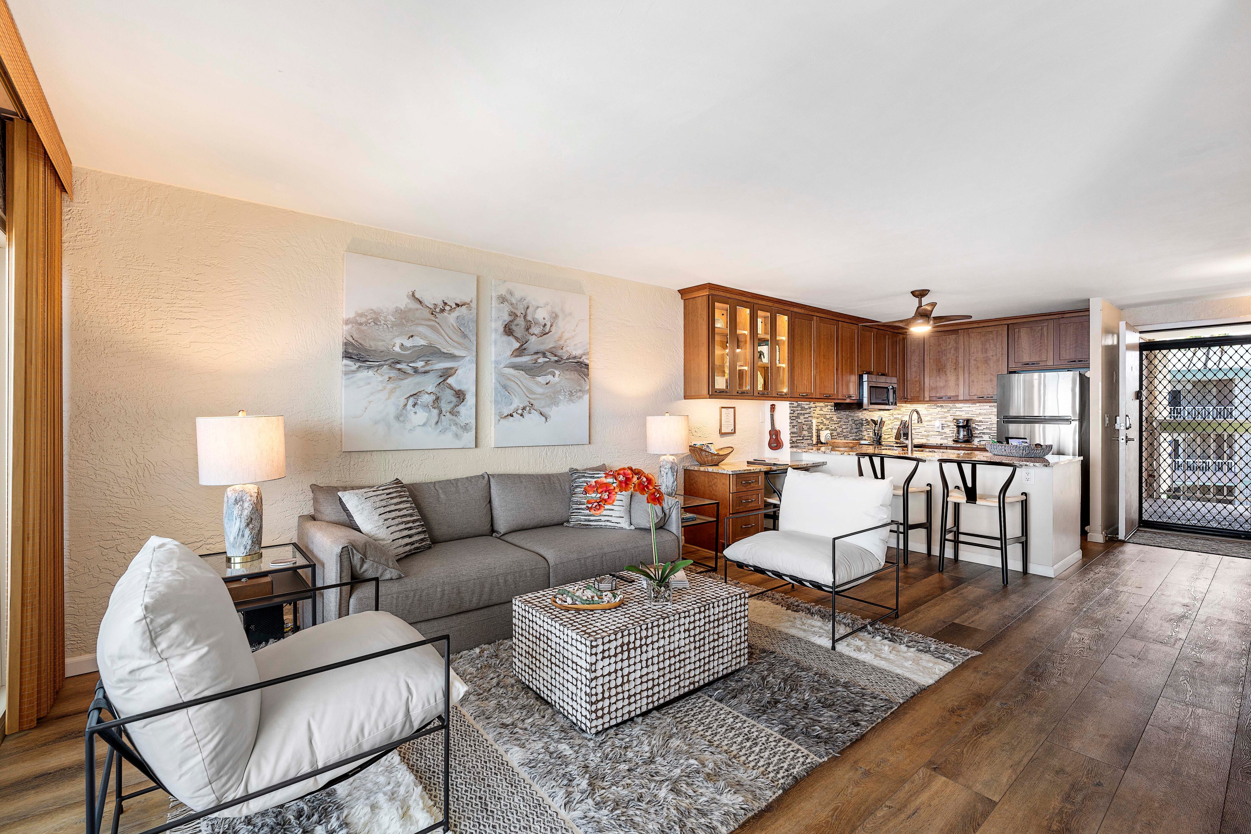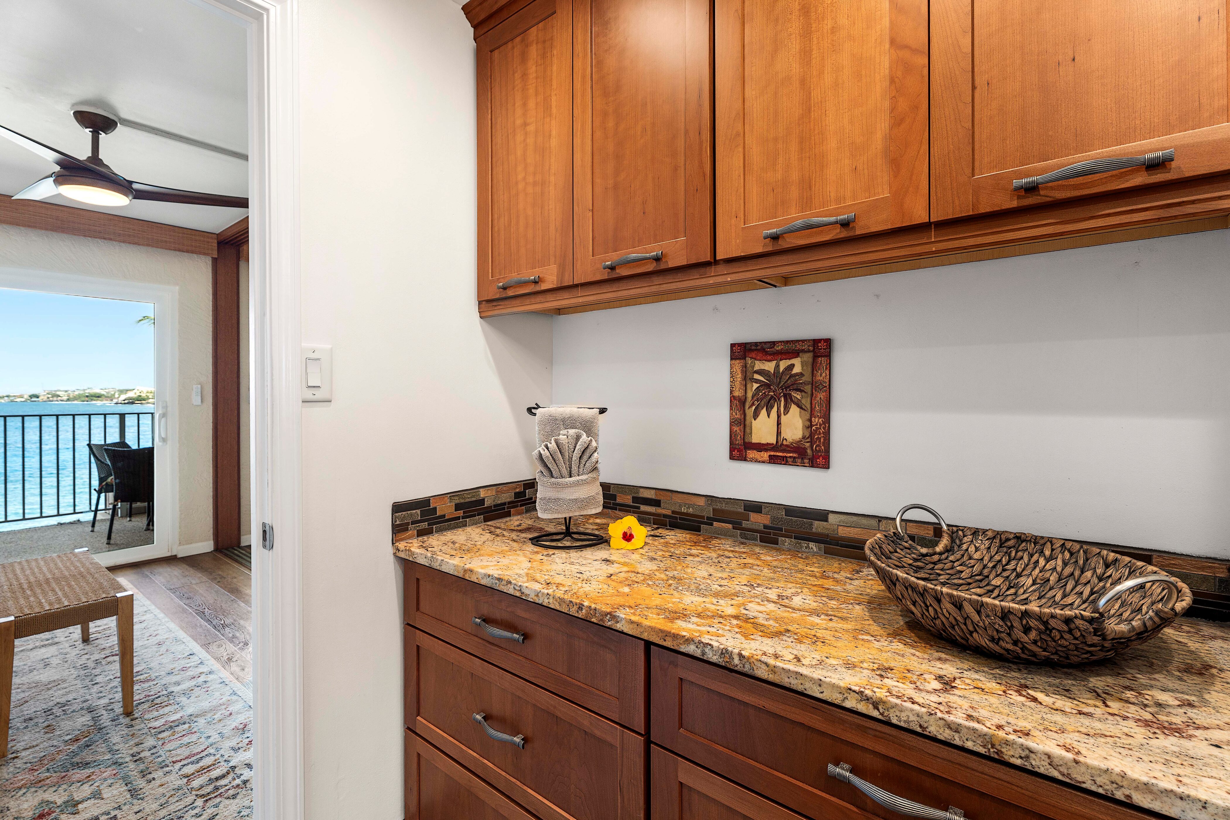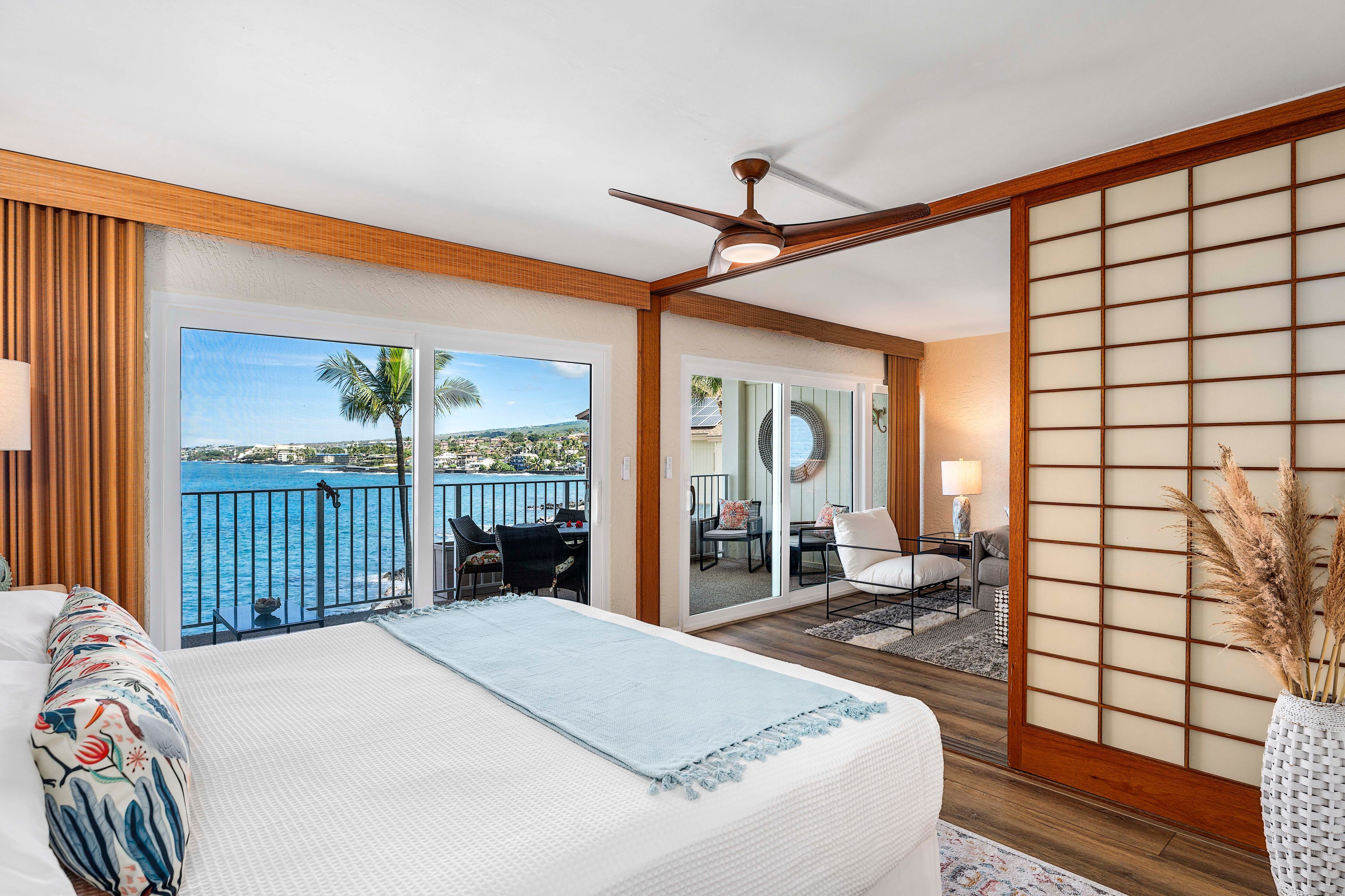 Welcome to Alii Villas! Experience the best of Kailua-Kona from this ultra-clean, designer-renovated oceanfront penthouse –where breathtaking views, timeless design, and direct ocean access come together for exceptional island living. Wake up to the sound of waves, feel cooling ocean breezes drift through the home, and watch palm trees sway against the sparkling waters of Kona Bay. The 2-bedroom, 2-bath home was thoughtfully renovated in recent years and meticulously maintained, resulting in a clean, contemporary island aesthetic that lives beautifully. Discover a redesigned kitchen and baths featuring Thomasville cabinetry, under-cabinet lighting, granite counters, glass-enclosed showers, modern appliances, luxury vinyl plank flooring, windows, and sliding doors. Step into this open-concept living space designed for entertaining and meaningful time with family and friends, that flows seamlessly to a spacious oceanfront lanai, effectively extending the living space outdoors for relaxed waterfront lounging and dining. The oceanfront primary bedroom is a serene retreat, where you’ll drift off to sleep to the sound of the surf. Shoji-style privacy screens allow the space to open visually during the day, expanding sightlines and maximizing ocean views. Enjoy direct ocean access and a front-row seat to Hawai‘i’s marine life, with dolphins often playing offshore, seasonal whale sightings, and the occasional sea turtle gliding by below. From morning walks along iconic Ali‘i Drive to sunset evenings overlooking the water, this location offers effortless coastal living just minutes from downtown Kailua-Kona’s restaurants, shopping, and ocean activities. This successful vacation rental is offered turnkey, furnished, with immediate income potential Don’t miss this rare opportunity to own a turnkey oceanfront penthouse in the heart of Kailua-Kona, where lifestyle, location, and timeless island living come together!