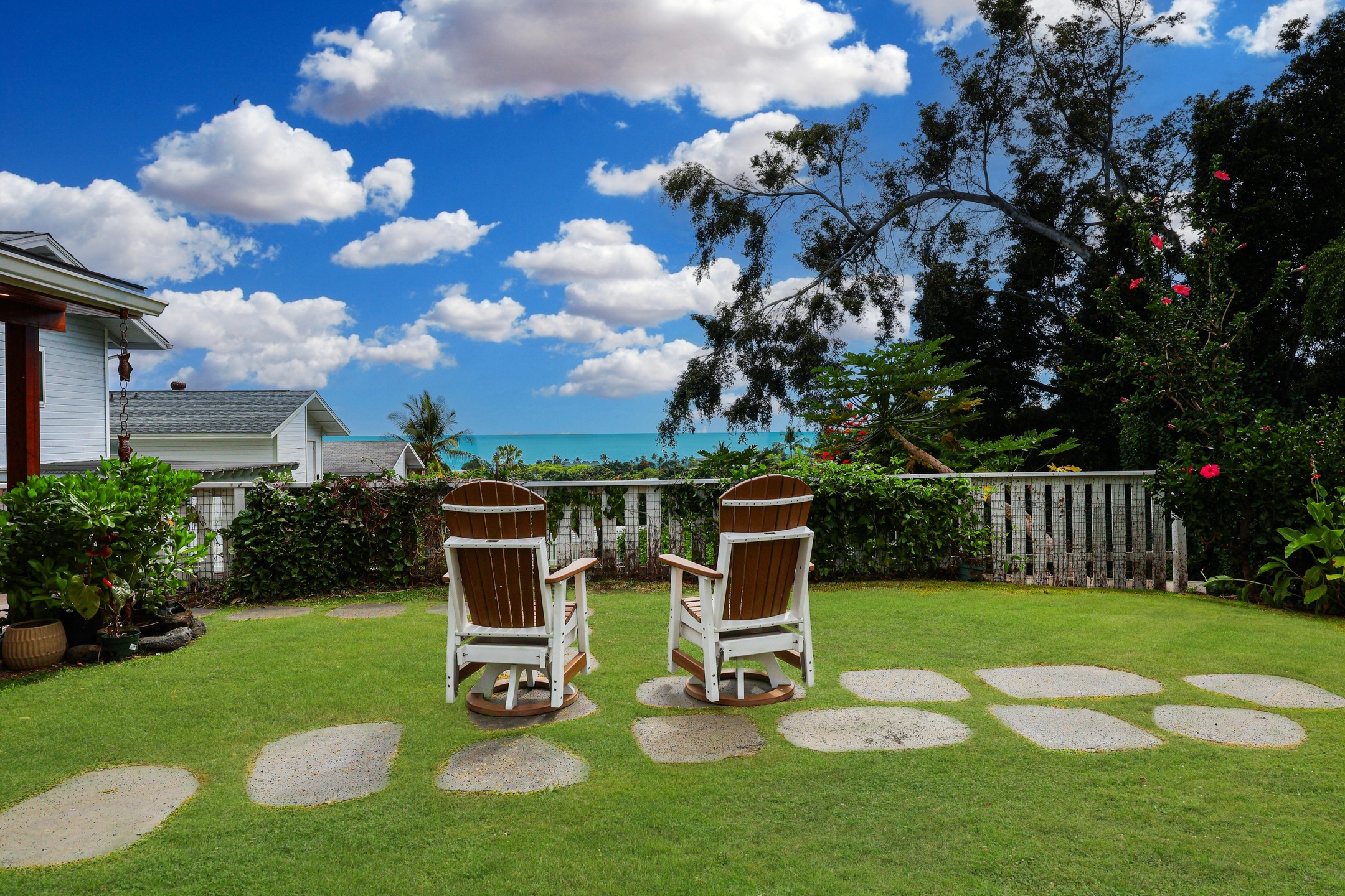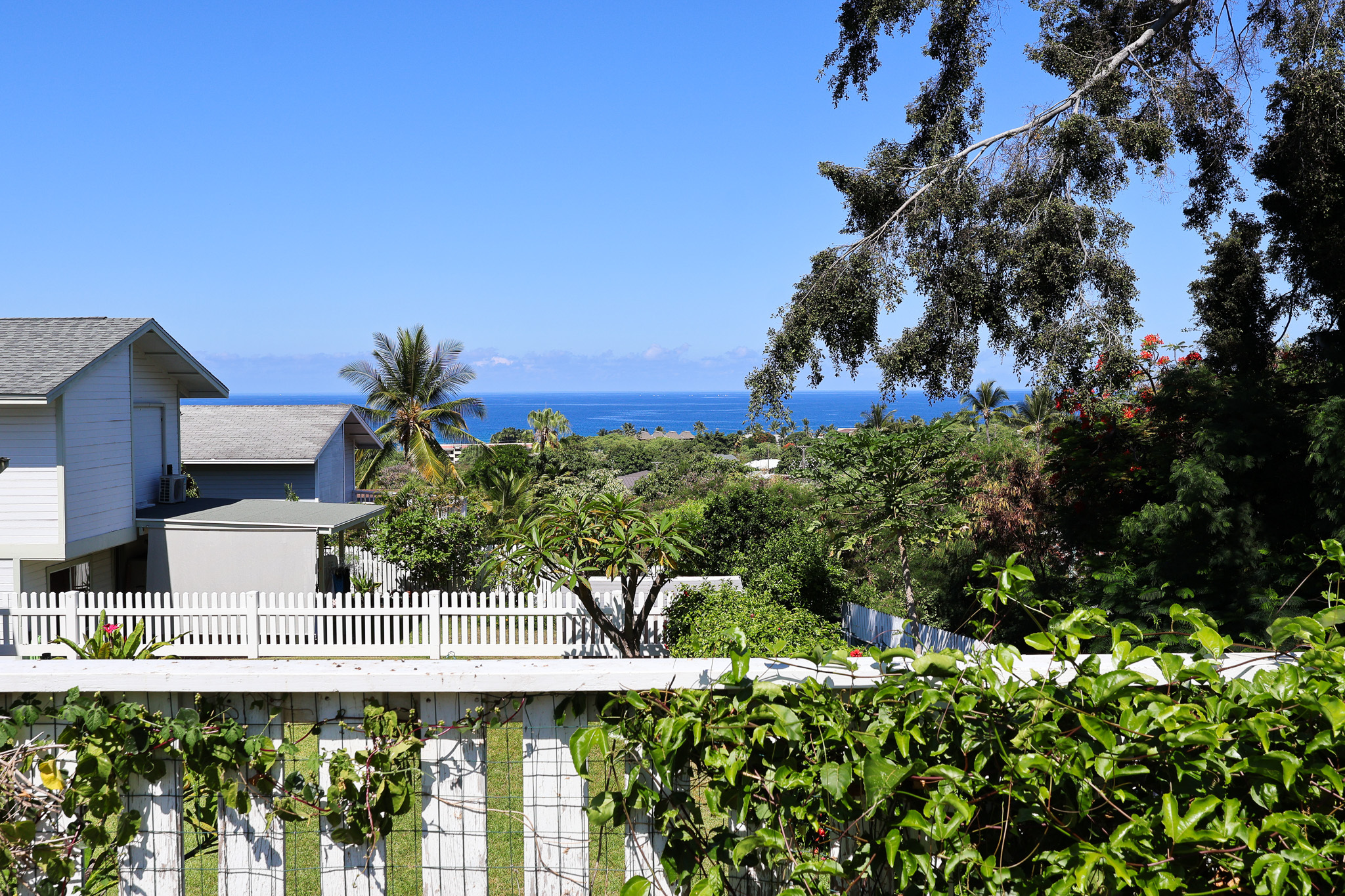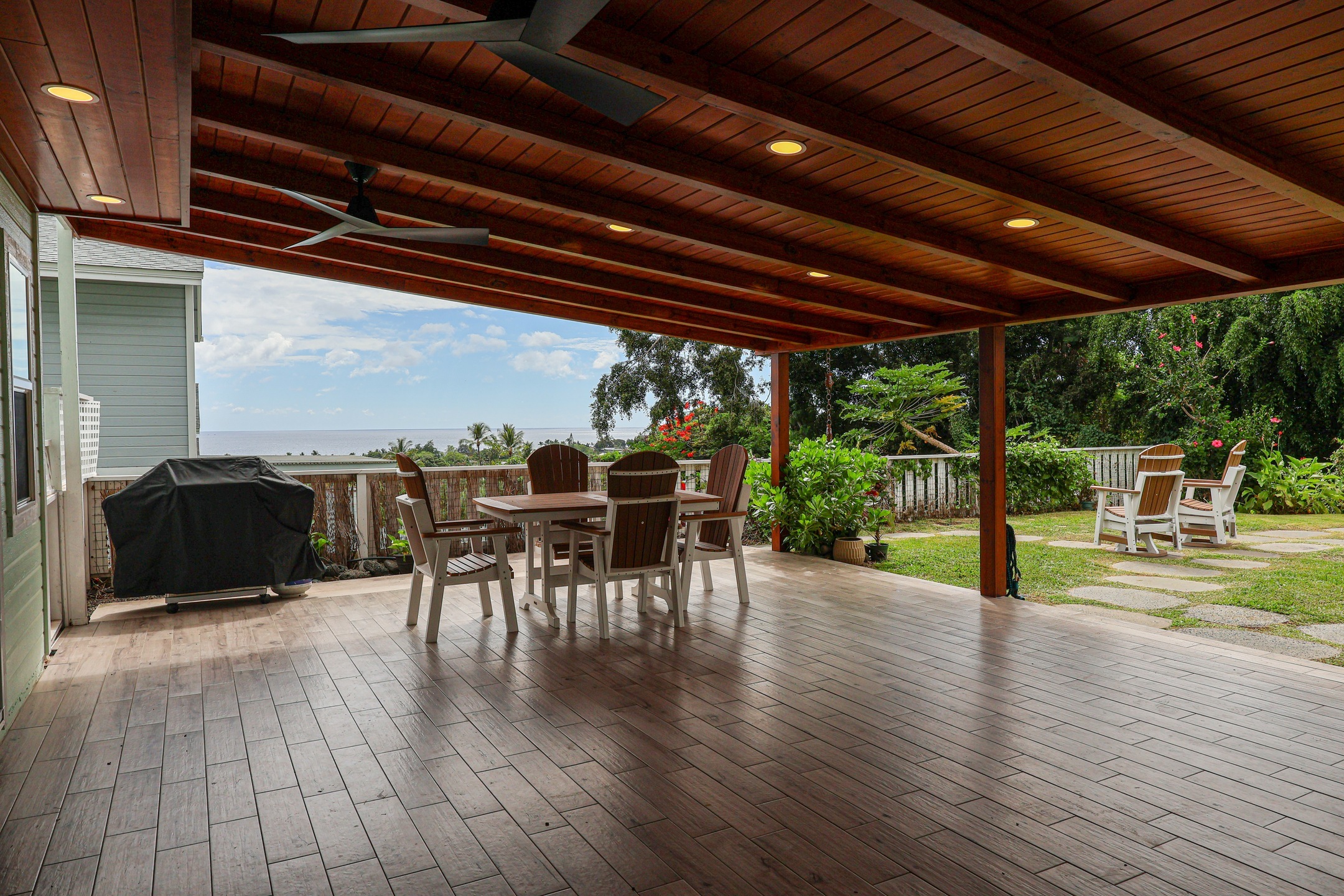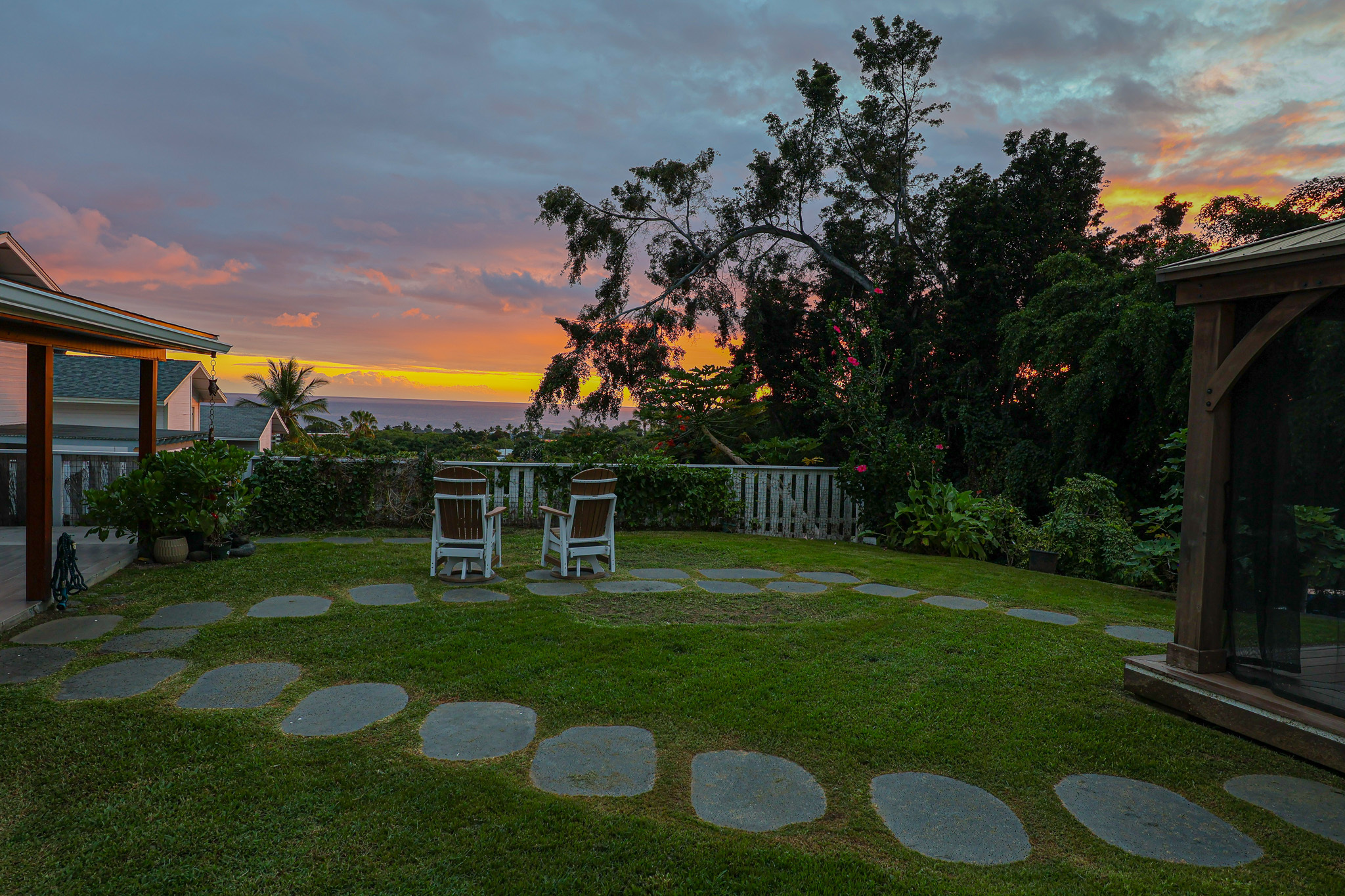 Enjoy stunning ocean and sunset views from the expansive covered lanai of this beautifully maintained Kona home. Situated in a sought-after neighborhood with underground utilities–no power lines to interrupt your view–and just a short walk to the beach. The front yard features panoramic ocean views framed by an ipe wood composite fence and a custom gate that opens to extra boat or vehicle parking. Fully tiled throughout, the home offers seamless indoor-outdoor living across 2,000+ sq ft, including tiled garage and lanai spaces. The custom kitchen and bath backsplashes, recessed lighting, and split AC units upstairs provide style and comfort. The lush, landscaped yard includes lava stone walls, oversized lava pavers, and a custom outdoor lava rock shower. Fruit trees include Indonesian guava, fig, papaya, star fruit, lilikoi, Meyer lemon, lime, and rosemary. The Hot Springs jetted hot tub (Sovereign model) sits on a custom ipe and teak composite deck with incredible ocean views. The 400-sq-ft high-end garage conversion adds flexible living space, complete with a custom door and wall-mounted motor. A 24-amp Level 2 EV charger is already installed. The custom shed with lighting includes a commercial-grade ice machine–great for entertaining or storing your fresh catch. Enjoy views of Living Stones Church and Ali‘i Drive. The fenced yard offers a perfect mix of privacy and openness. This home blends island living, comfort, and quality upgrades throughout.