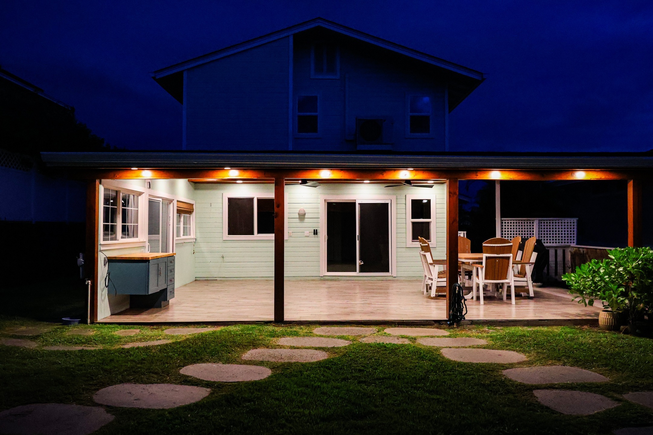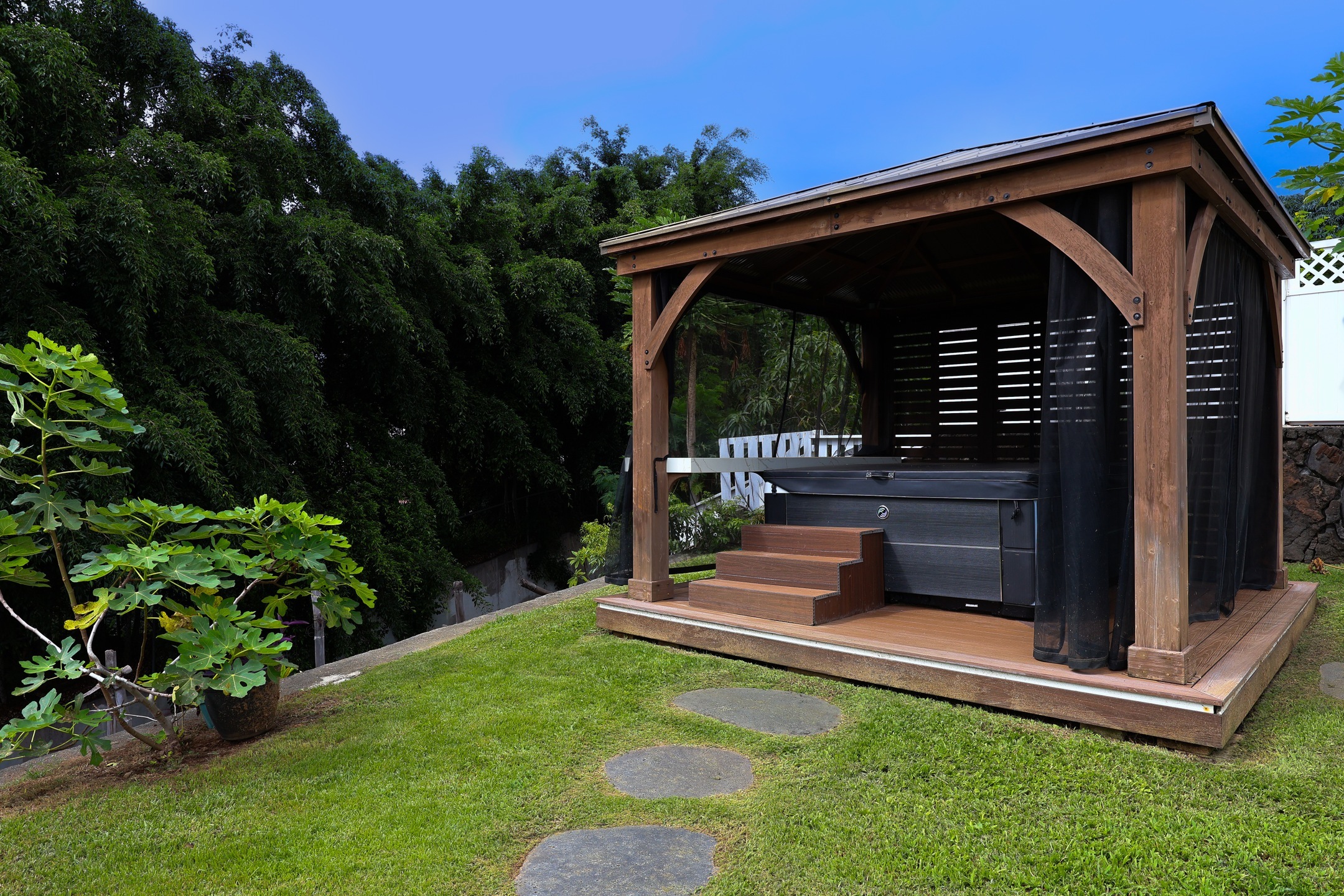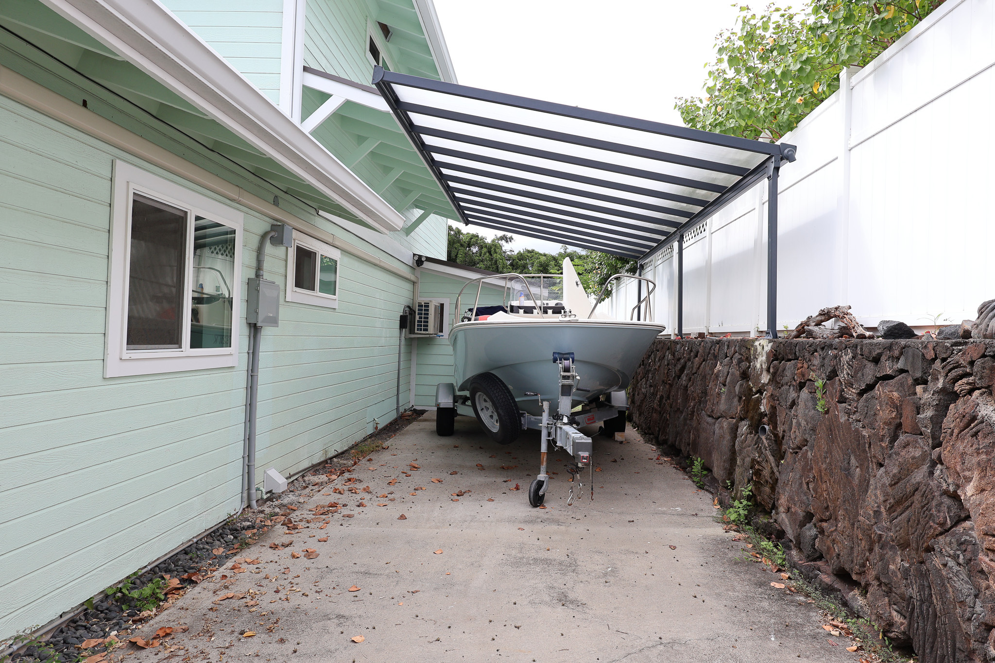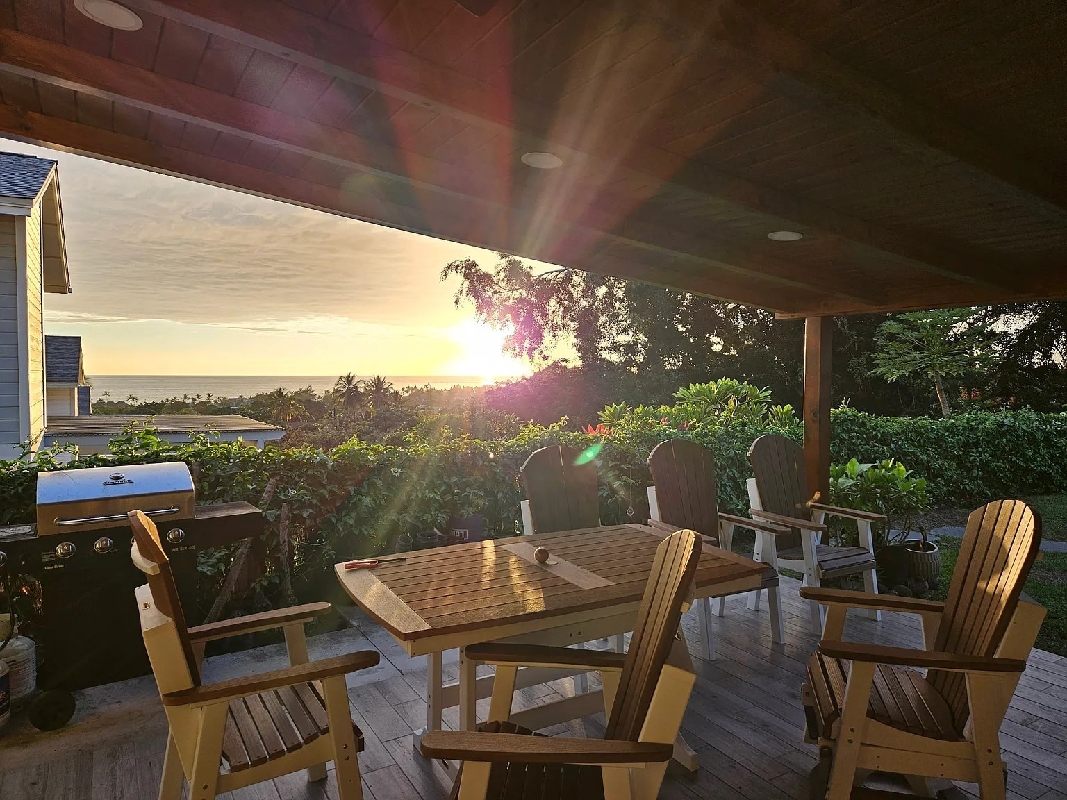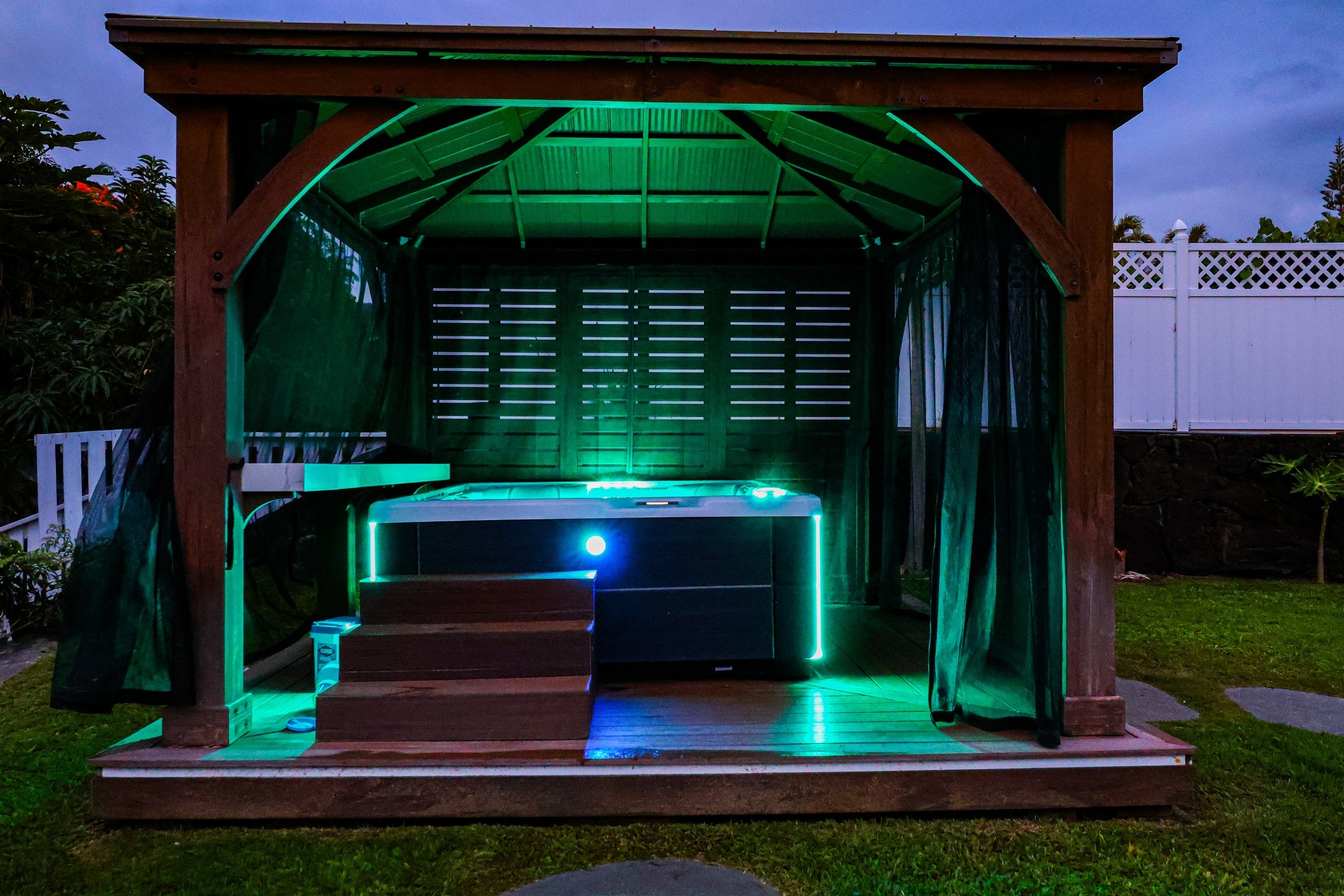 Enjoy stunning ocean and sunset views from the expansive covered lanai of this beautifully maintained Kona home. Situated in a sought-after neighborhood with underground utilities–no power lines to interrupt your view–and just a short walk to the beach. The front yard features panoramic ocean views framed by an ipe wood composite fence and a custom gate that opens to extra boat or vehicle parking. Fully tiled throughout, the home offers seamless indoor-outdoor living across 2,000+ sq ft, including tiled garage and lanai spaces. The custom kitchen and bath backsplashes, recessed lighting, and split AC units upstairs provide style and comfort. The lush, landscaped yard includes lava stone walls, oversized lava pavers, and a custom outdoor lava rock shower. Fruit trees include Indonesian guava, fig, papaya, star fruit, lilikoi, Meyer lemon, lime, and rosemary. The Hot Springs jetted hot tub (Sovereign model) sits on a custom ipe and teak composite deck with incredible ocean views. The 400-sq-ft high-end garage conversion adds flexible living space, complete with a custom door and wall-mounted motor. A 24-amp Level 2 EV charger is already installed. The custom shed with lighting includes a commercial-grade ice machine–great for entertaining or storing your fresh catch. Enjoy views of Living Stones Church and Ali‘i Drive. The fenced yard offers a perfect mix of privacy and openness. This home blends island living, comfort, and quality upgrades throughout.