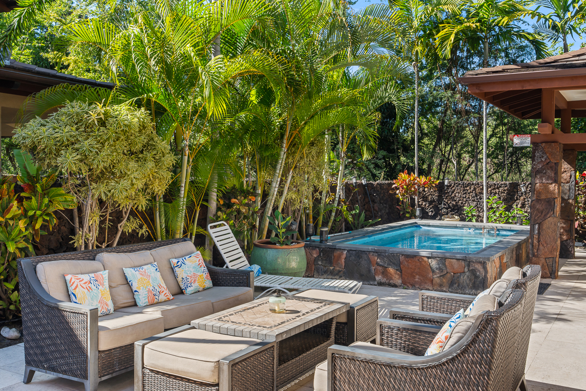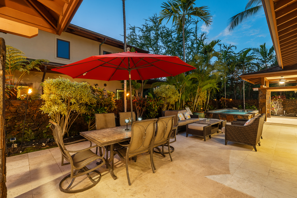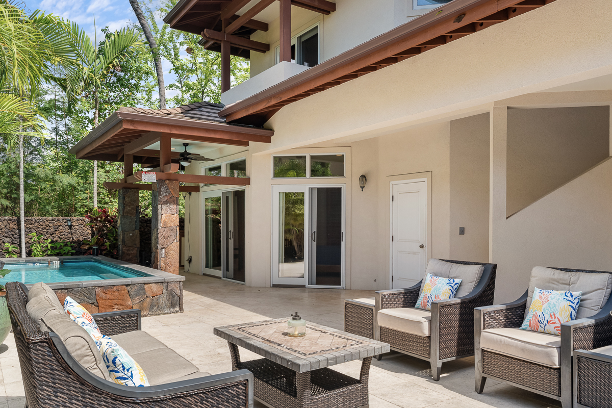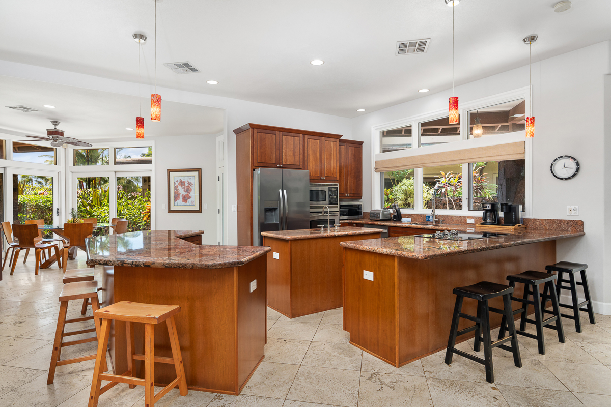 Welcome to Forever Sunsets - a rare opportunity within the exclusive gated oceanfront community of Ke Alohi Kai in Kailua-Kona. Positioned in one of Kona’s most desirable resort-zoned, STVR-approved neighborhoods, this property offers both lifestyle and proven performance in an irreplaceable coastal setting. Enjoy sunset views and short walking access to the shoreline from this private island retreat. Just a short stroll away is Kona’s famous Magic Sands Beach, where you can spend your days enjoying the ocean, beach volleyball, and dining at Magic’s Beach Grill with front-row sunset views over the water – all within easy walking distance. Designed for flexibility and connection, the thoughtful layout features four bedrooms, including two fully private en-suites, each opening to its own lanai. A separate wing with a suite on the ground level, and a two-bedroom suite on the upper level, creates ideal privacy for guests or multigenerational living, while an additional flex room with a closet offers potential for a fifth bedroom, office, or studio. The open-concept main living area centers around a gourmet kitchen with cherry cabinetry, mahogany doors, granite countertops, stainless steel appliances, and dual breakfast bars - perfect for entertaining. A wet bar, multiple laundry areas, split A/C systems throughout, and a garage enhance comfort and functionality. Energy efficiency is built in with a fully owned solar system and two Tesla batteries. Outdoor living truly shines with an above-ground pool and multiple lounge and dining areas designed for sunset gatherings and relaxed island evenings. Offered turnkey and fully furnished, Forever Sunsets has established itself as one of Kona’s strongest-performing vacation rentals, with consistent bookings and demonstrated guest demand. A rare opportunity to acquire a high-performing income property that also functions beautifully as a second home or legacy retreat.
