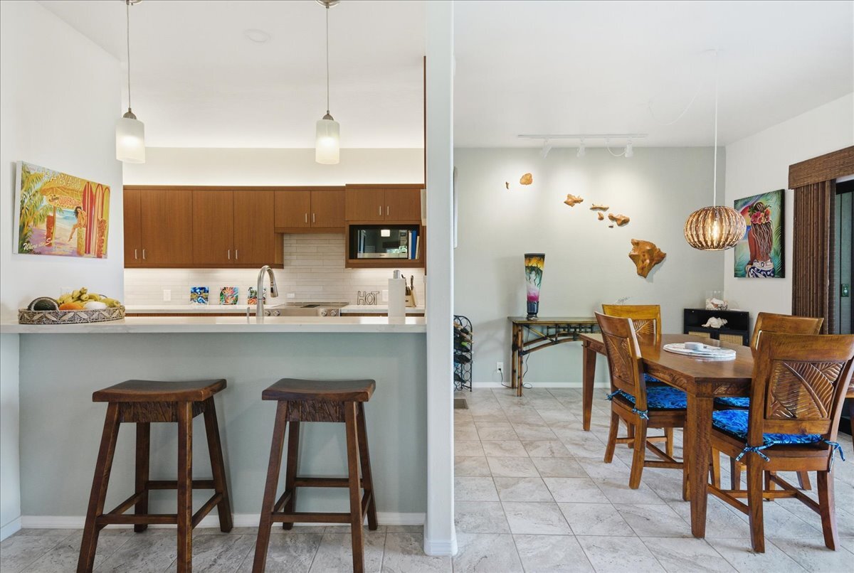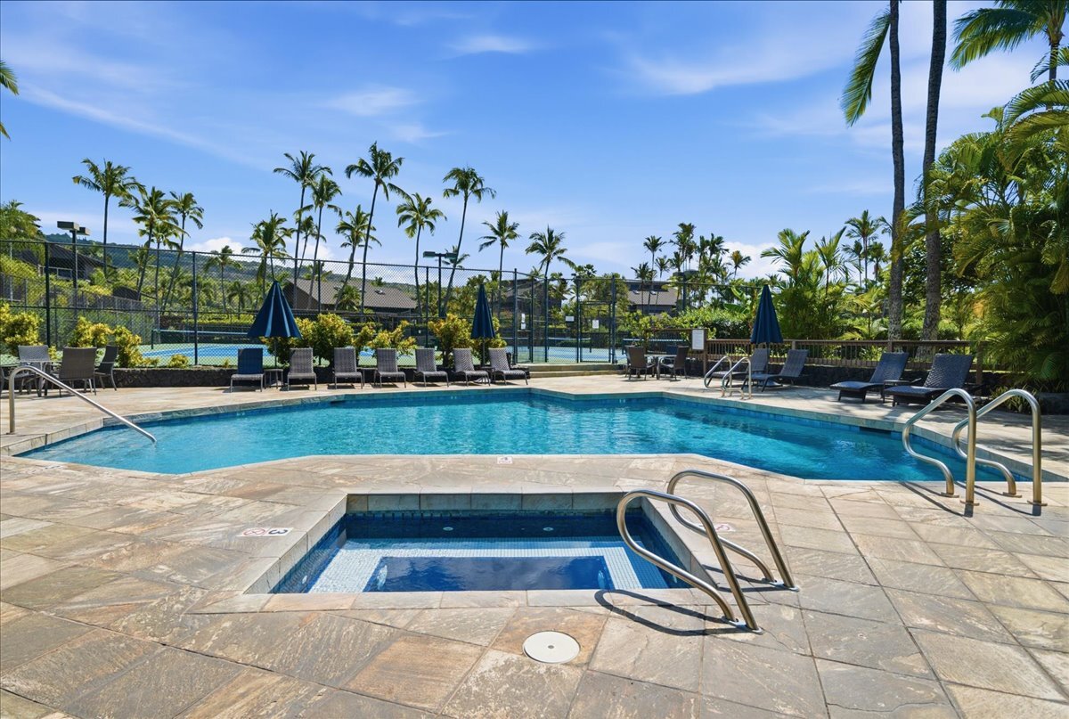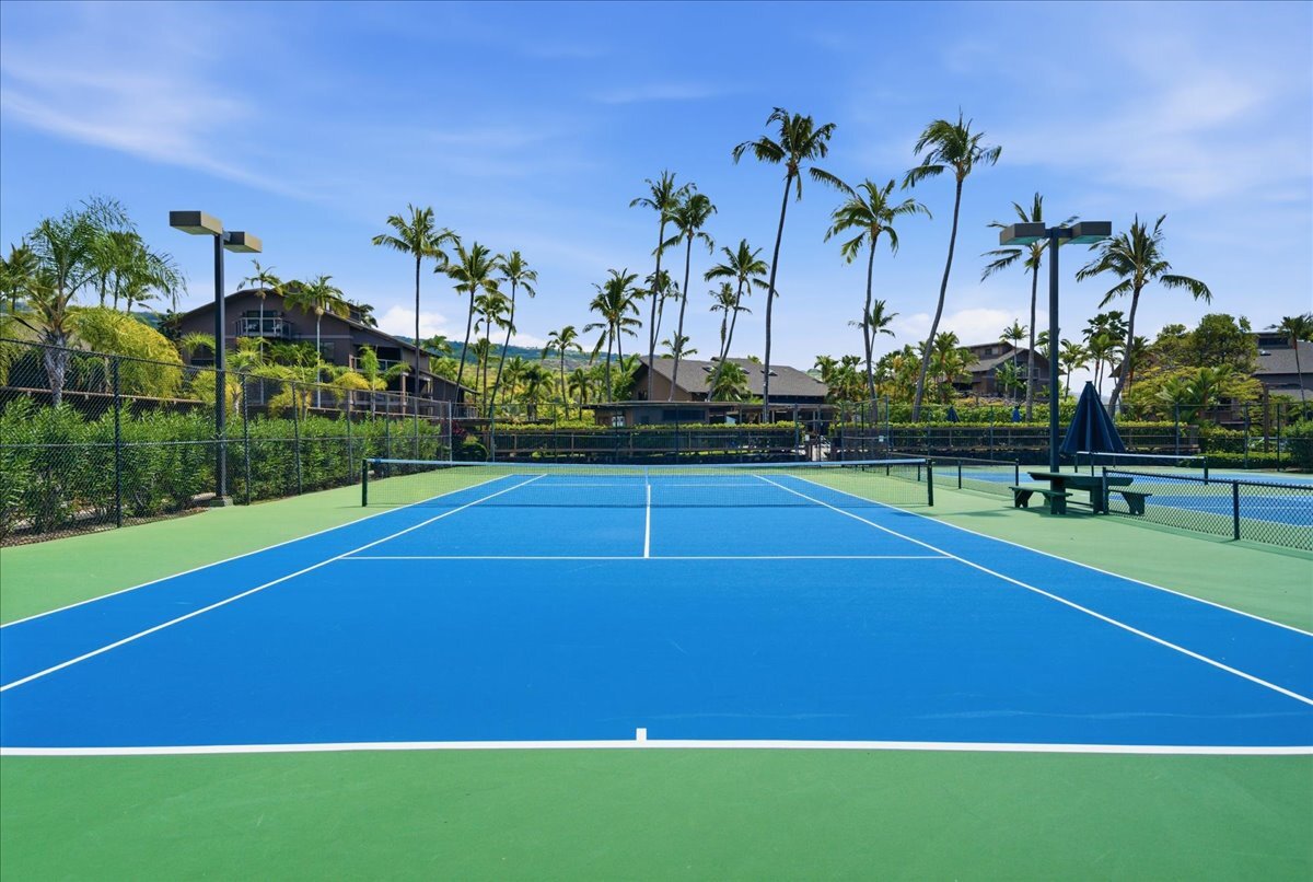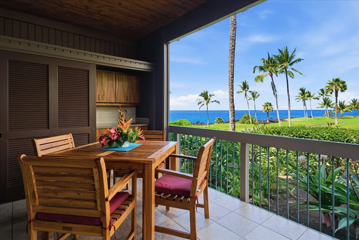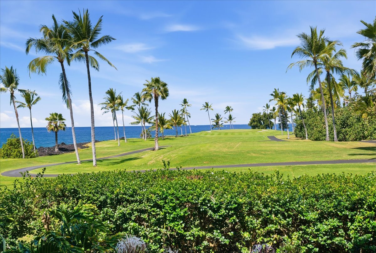 Discover the perfect blend of luxury and convenience in this meticulously maintained, perfectly positioned end unit in Building 15. With the rare advantage of single-level living after just a few entry steps, this immaculate two-bedroom, two-bath ground-floor residence immediately captivates with its breathtaking views. Situated on the 12th hole of the renowned Kona Country Club Golf Course, the expansive lanai is your front-row seat to amazing Ocean views. Here, you will witness spectacular sunsets and whale watching. Interior Features: The open-concept kitchen boasts sleek Quartz countertops, tiled backsplash, and a suite of high-end appliances. Comfort is assured year-round with central air conditioning. Primary Suite: Expansive and versatile, the primary suite includes extra space currently utilized as a home office. It features an exceptionally large walk-in closet with dedicated, lockable storage. The primary bath offers a spa-like experience with a grand walk-in shower and a separate water closet for ultimate privacy. Guest Room: The generous guest room provides comfort and privacy for visitors, complete with its own large walk-in closet. The guest bathroom showcases a beautiful custom walk-in shower. Unmatched in space, this unit offers an abundance of storage throughout. It is being sold furnished (with select personal exclusions), and the valuable Short-Term Vacation Rental (STVR) permit is easily transferable, presenting an ideal investment or turn-key primary residence.