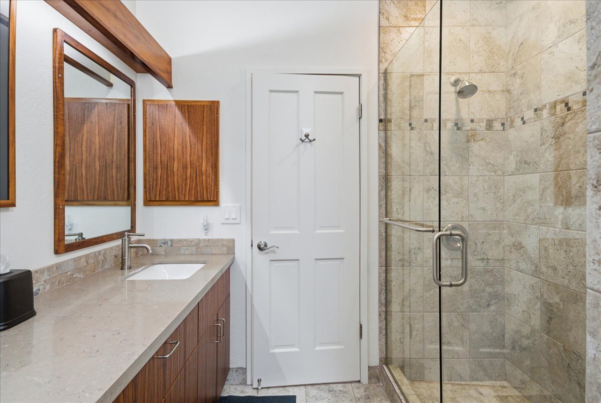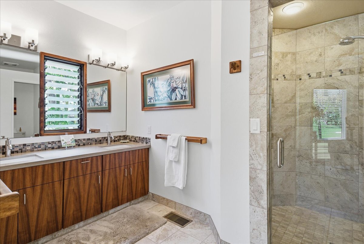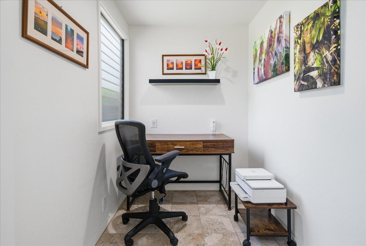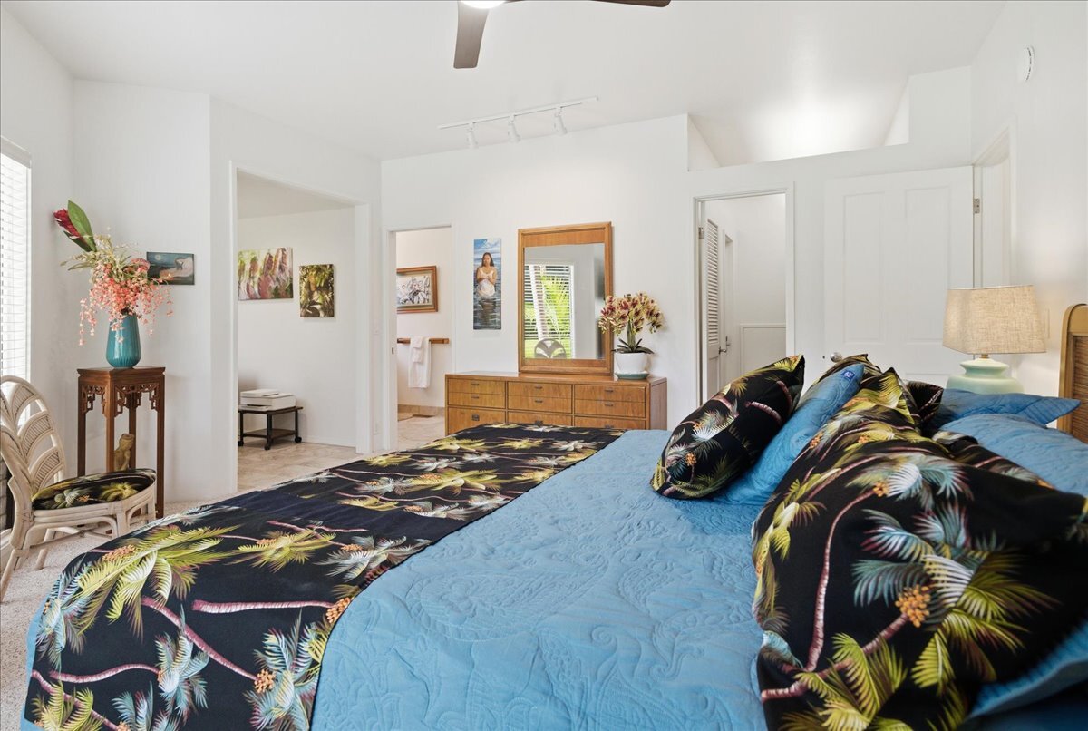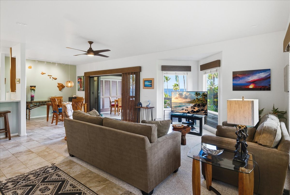 Discover the perfect blend of luxury and convenience in this meticulously maintained, perfectly positioned end unit in Building 15. With the rare advantage of single-level living after just a few entry steps, this immaculate two-bedroom, two-bath ground-floor residence immediately captivates with its breathtaking views. Situated on the 12th hole of the renowned Kona Country Club Golf Course, the expansive lanai is your front-row seat to amazing Ocean views. Here, you will witness spectacular sunsets and whale watching. Interior Features: The open-concept kitchen boasts sleek Quartz countertops, tiled backsplash, and a suite of high-end appliances. Comfort is assured year-round with central air conditioning. Primary Suite: Expansive and versatile, the primary suite includes extra space currently utilized as a home office. It features an exceptionally large walk-in closet with dedicated, lockable storage. The primary bath offers a spa-like experience with a grand walk-in shower and a separate water closet for ultimate privacy. Guest Room: The generous guest room provides comfort and privacy for visitors, complete with its own large walk-in closet. The guest bathroom showcases a beautiful custom walk-in shower. Unmatched in space, this unit offers an abundance of storage throughout. It is being sold furnished (with select personal exclusions), and the valuable Short-Term Vacation Rental (STVR) permit is easily transferable, presenting an ideal investment or turn-key primary residence.