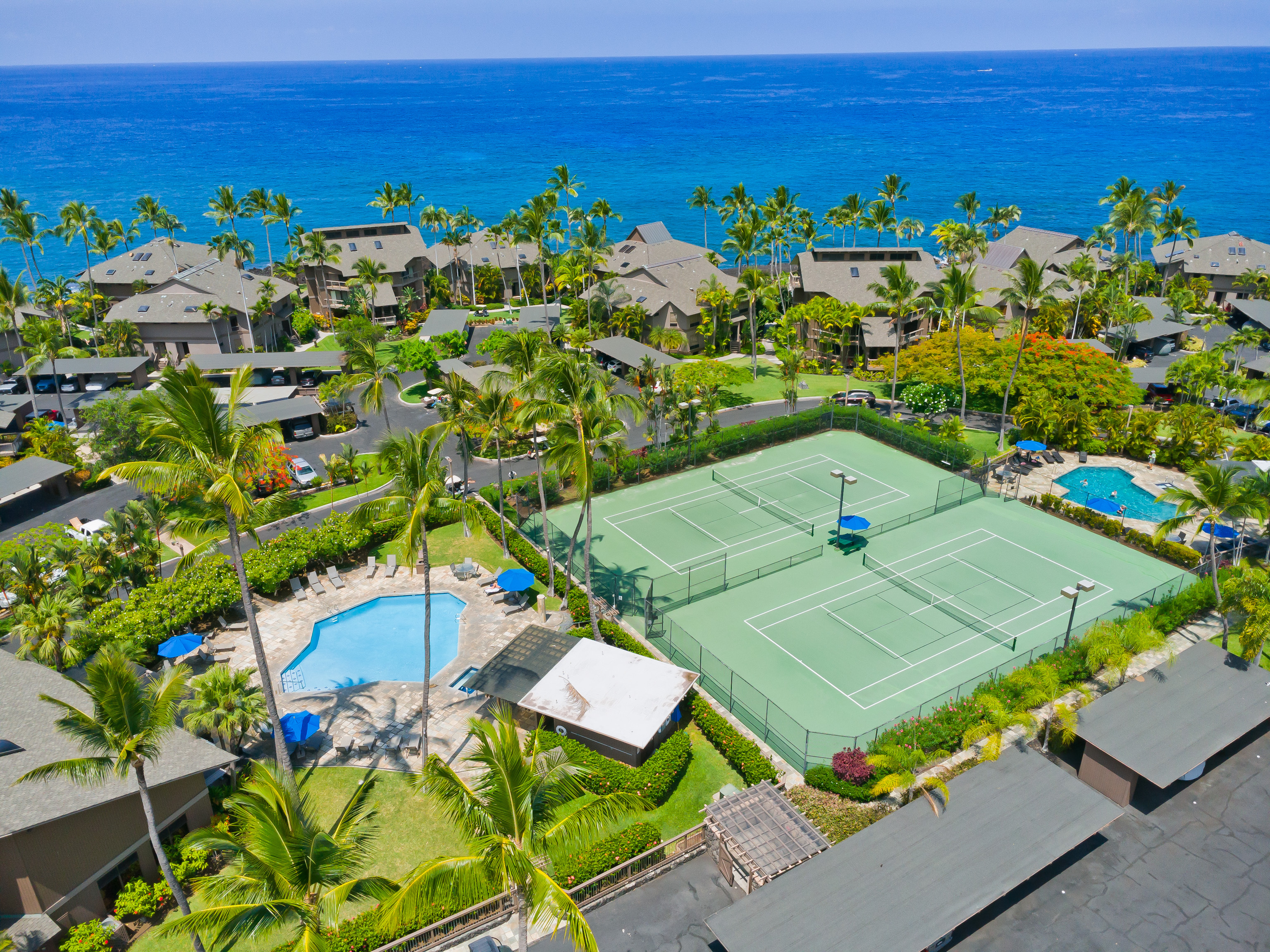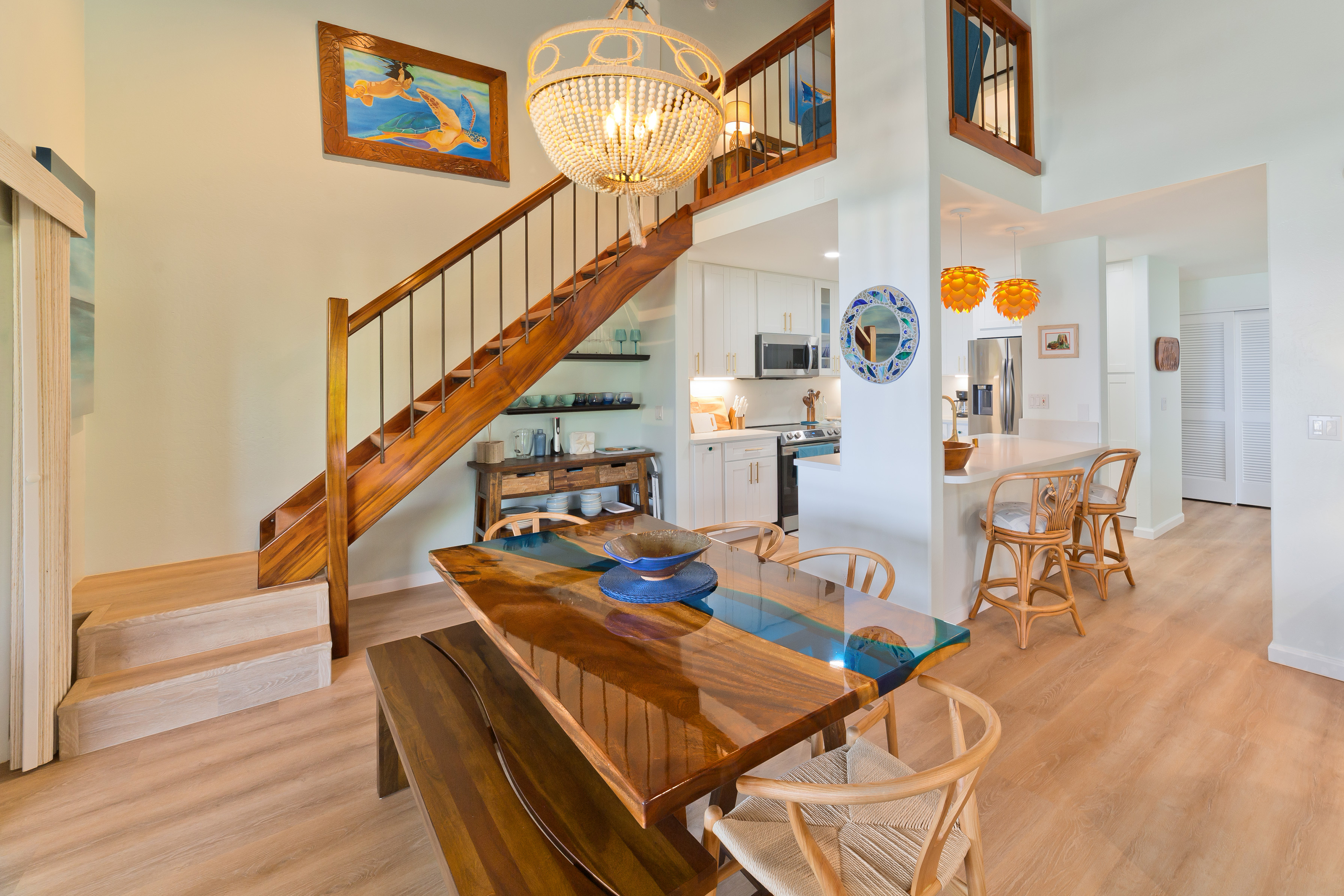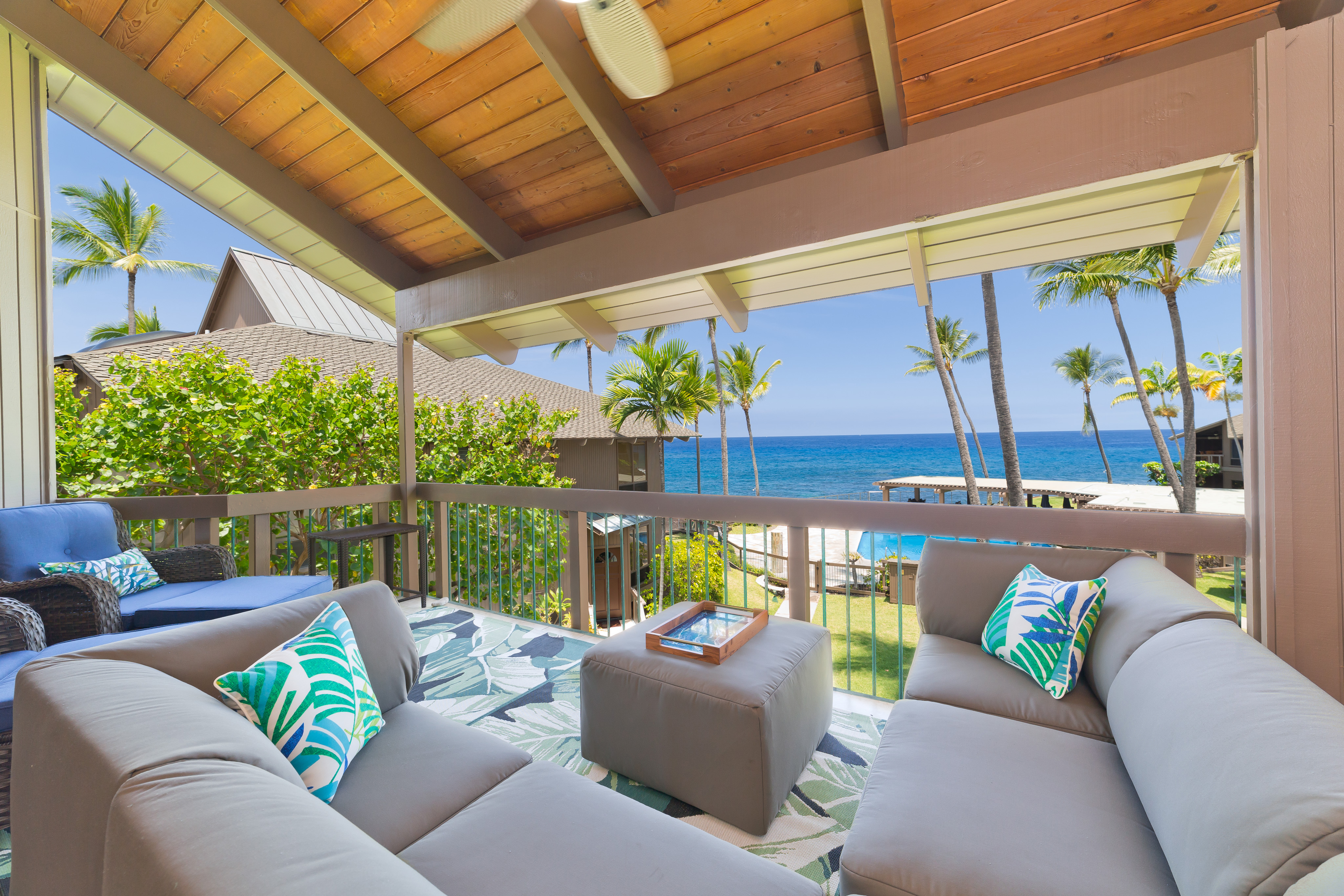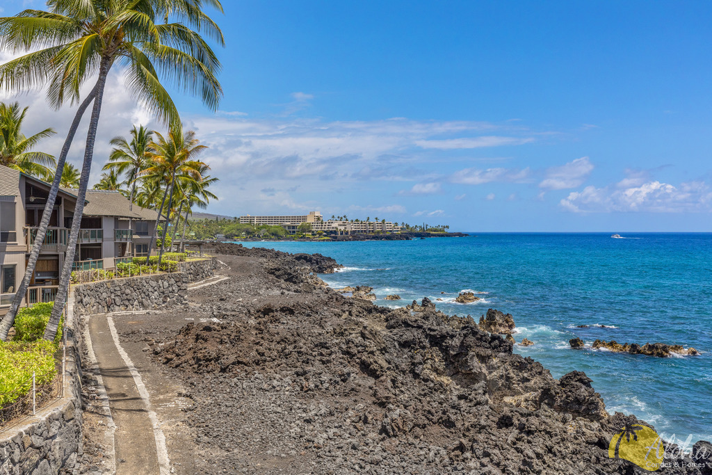 This stunning, upscale, totally renovated oceanfront view condo at Kanaloa at Kona is a must see! Surrounded by the breathtaking beauty of the Pacific Ocean, you can watch whales and sunsets from your Lanai. Hear and see the waves crashing from this 3 bedroom 3 full bath luxury unit. No expense was spared in its 2023 transformation with designer California style touches. Turnkey furnished and licensed as an STVR this condo has excellent bookings and rental history for the savvy investor. The master bedroom has a walk in closet, private office, and ensuite bath. Master bath features a free standing soaking tub, floor to ceiling tile, skylight and exudes a spa like environment. High open beam ceilings in the living room and dining room lead up to the loft bedroom with its own bath. Clean open concept kitchen with white quartz counters and high end laminate flooring throughout including stairs. Lanai has its own wet bar and wine fridge. Brand new central AC installed 2025. Kanaloa at Kona is a privately gated 16 acre lush tropically landscaped oceanfront oasis situated on a point on the Kona Coast and He'eia Bay in Keauhou. Featuring 3 community pools and jacuzzis, 3 tennis courts, and BBQ areas. Conveniently located just minutes from the Keauhou Shopping Center with restaurants, grocery store, and movie theater as well as Kahaluu Beach Park famous for surfing and snorkeling. Walking distance to Keauhou Bay for famous manta ray dives and boating excursions as well as adjacent to the Country Club Golf Course.