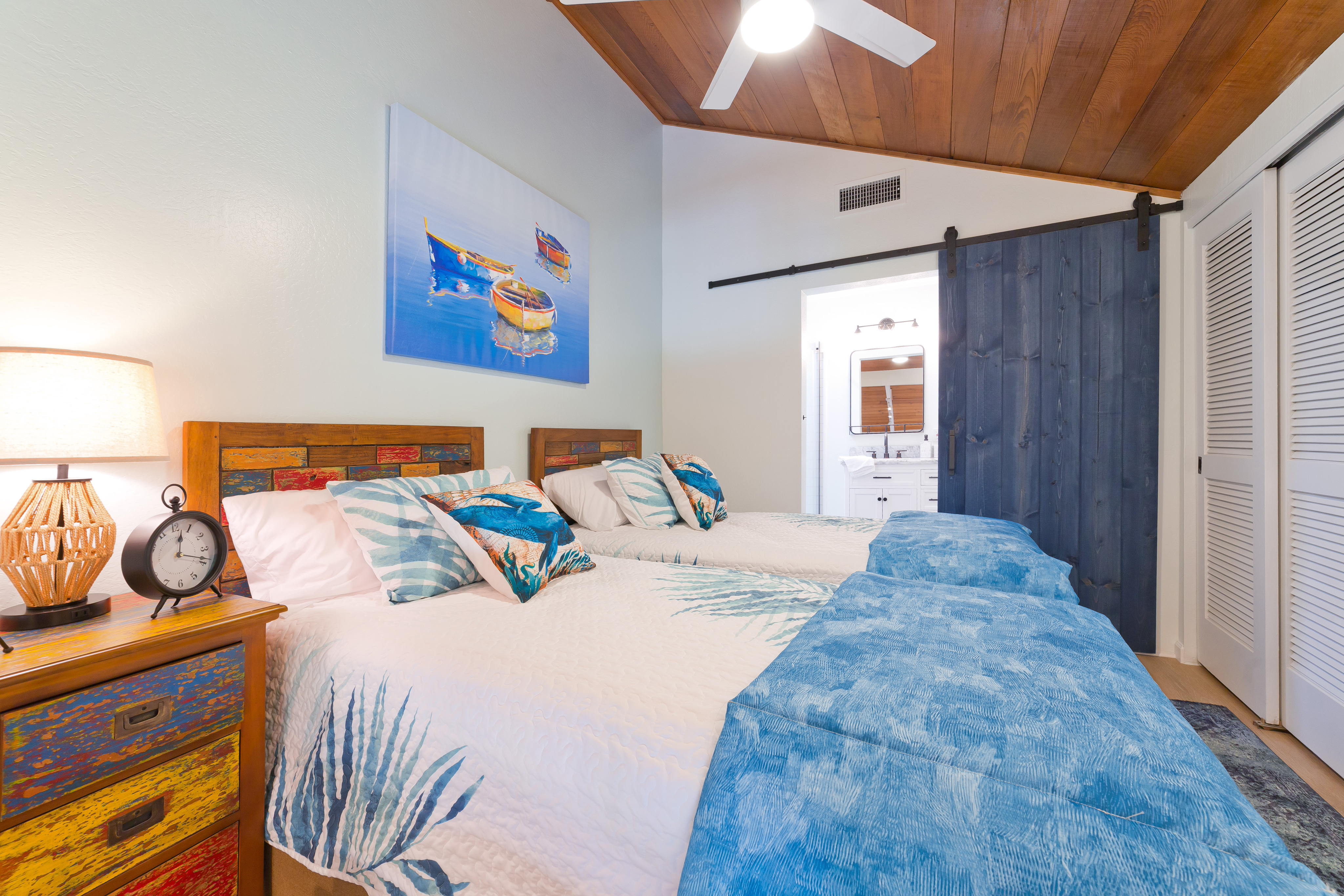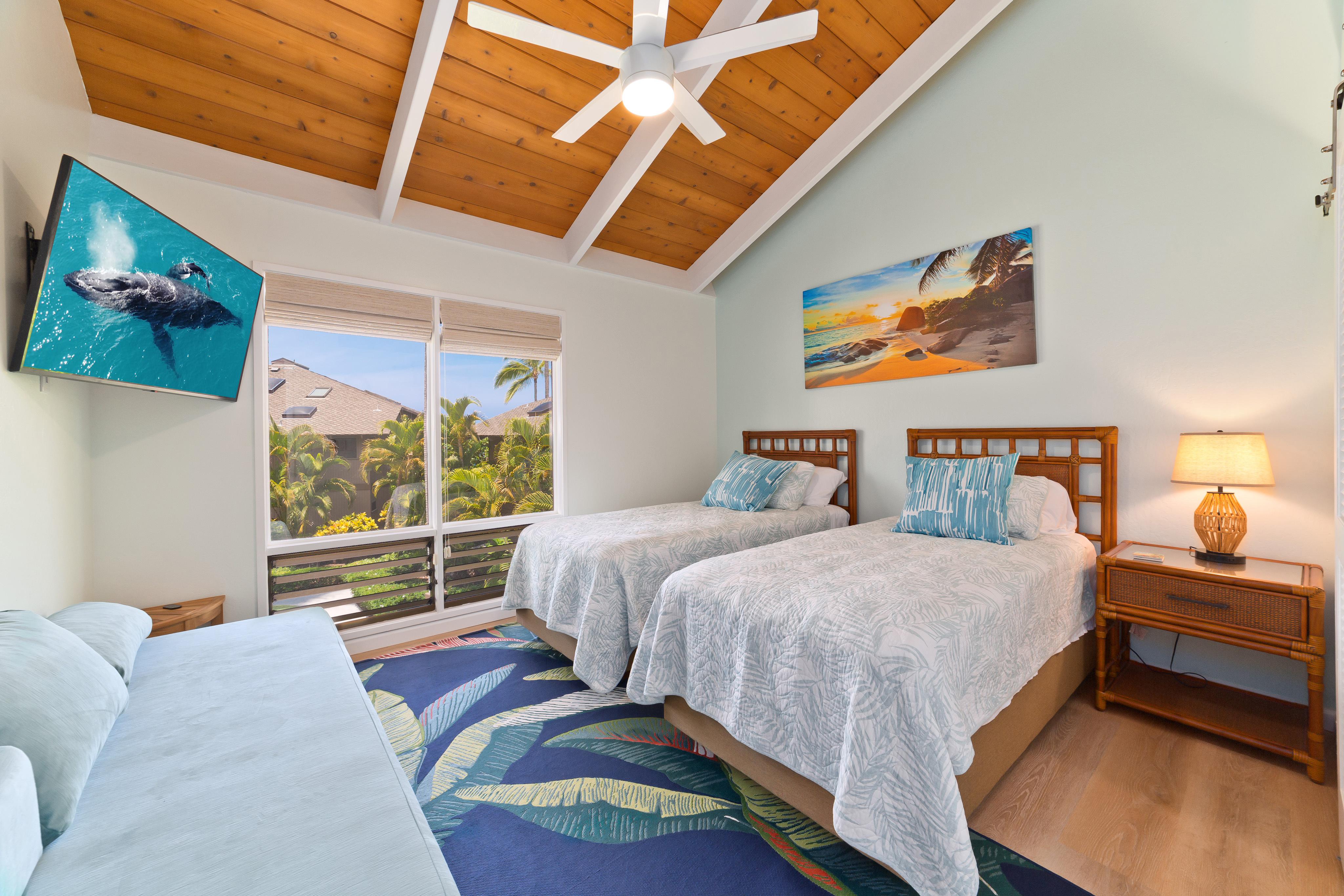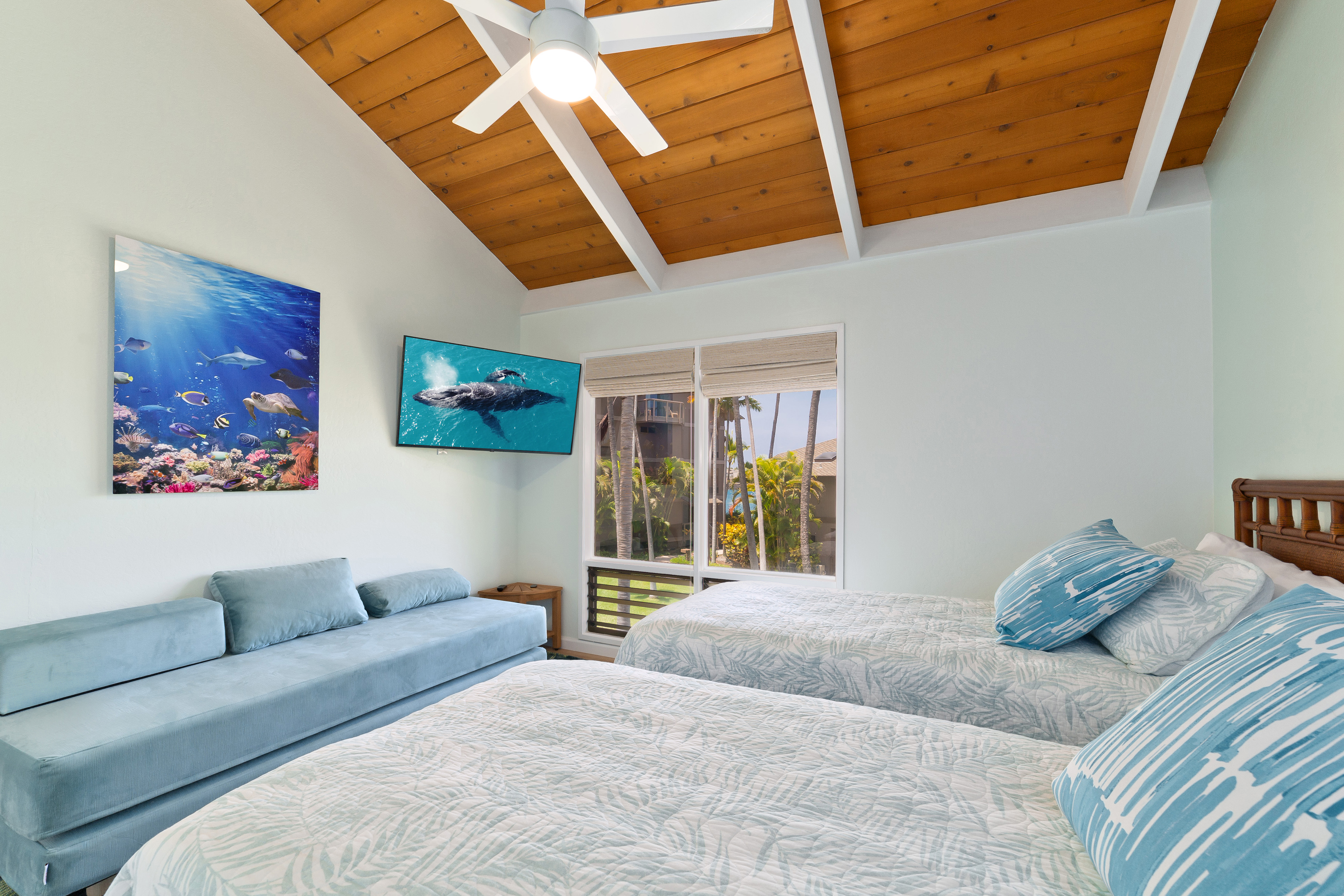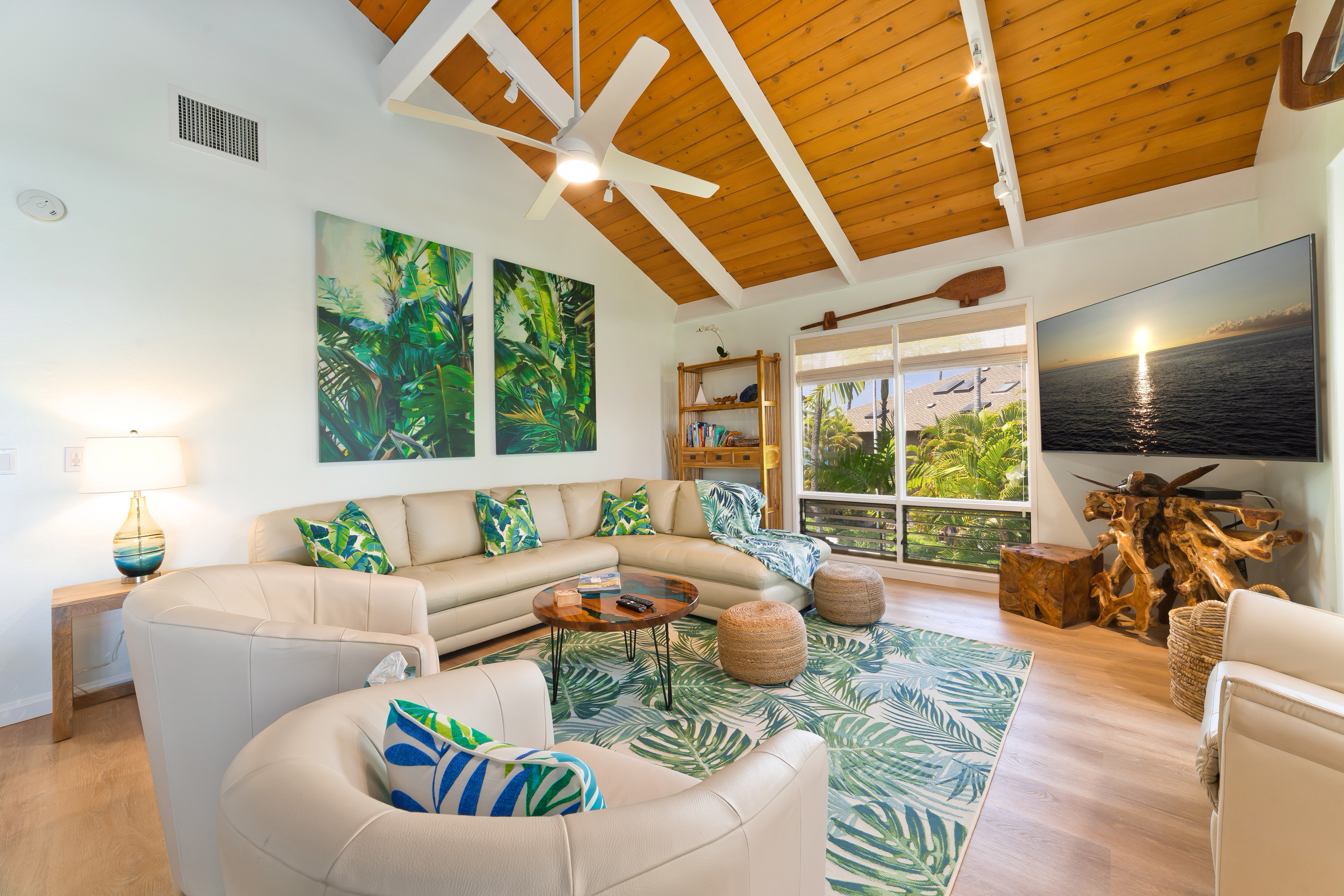 This stunning, upscale, totally renovated oceanfront view condo at Kanaloa at Kona is a must see! Surrounded by the breathtaking beauty of the Pacific Ocean, you can watch whales and sunsets from your Lanai. Hear and see the waves crashing from this 3 bedroom 3 full bath luxury unit. No expense was spared in its 2023 transformation with designer California style touches. Turnkey furnished and licensed as an STVR this condo has excellent bookings and rental history for the savvy investor. The master bedroom has a walk in closet, private office, and ensuite bath. Master bath features a free standing soaking tub, floor to ceiling tile, skylight and exudes a spa like environment. High open beam ceilings in the living room and dining room lead up to the loft bedroom with its own bath. Clean open concept kitchen with white quartz counters and high end laminate flooring throughout including stairs. Lanai has its own wet bar and wine fridge. Brand new central AC installed 2025. Kanaloa at Kona is a privately gated 16 acre lush tropically landscaped oceanfront oasis situated on a point on the Kona Coast and He'eia Bay in Keauhou. Featuring 3 community pools and jacuzzis, 3 tennis courts, and BBQ areas. Conveniently located just minutes from the Keauhou Shopping Center with restaurants, grocery store, and movie theater as well as Kahaluu Beach Park famous for surfing and snorkeling. Walking distance to Keauhou Bay for famous manta ray dives and boating excursions as well as adjacent to the Country Club Golf Course.
