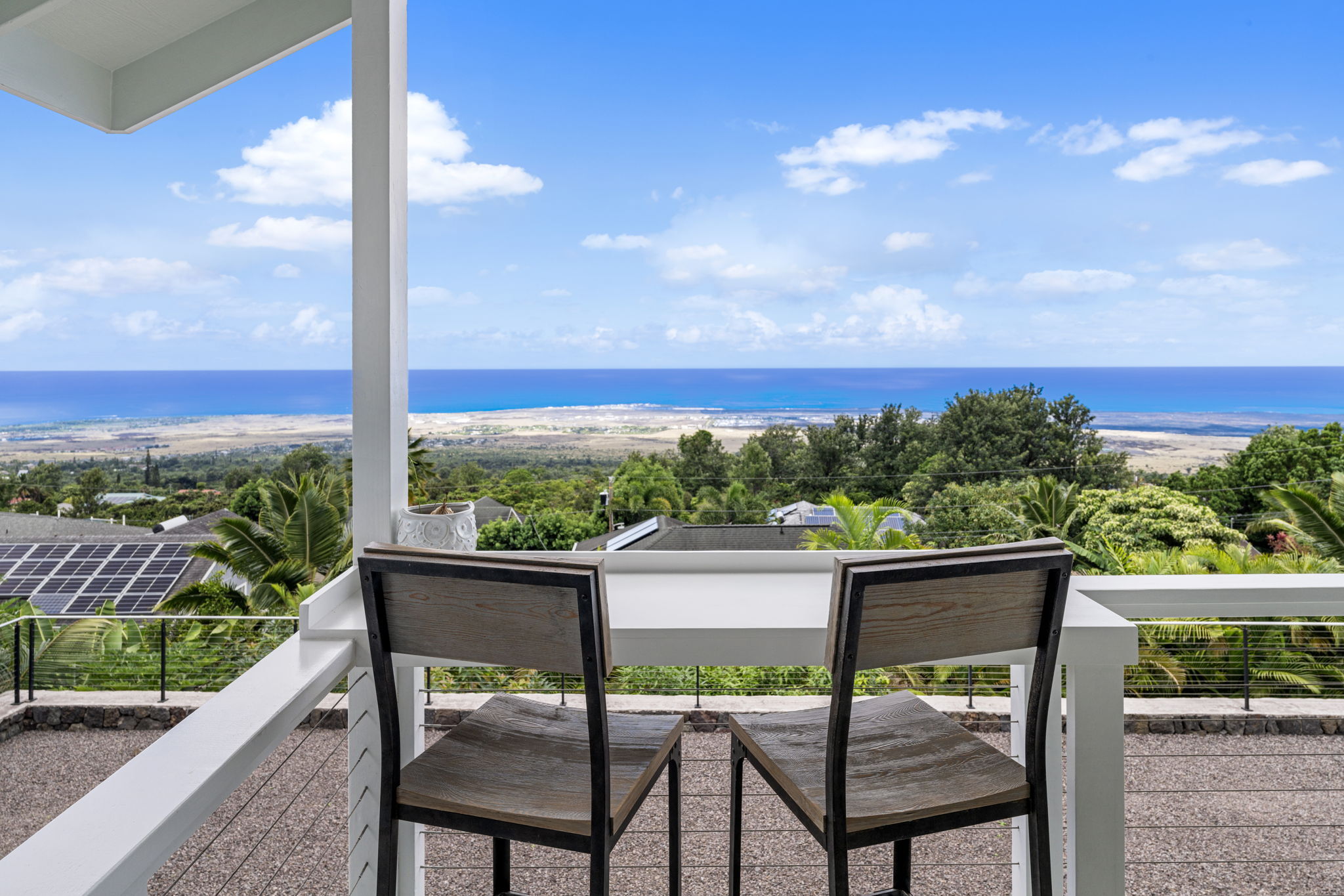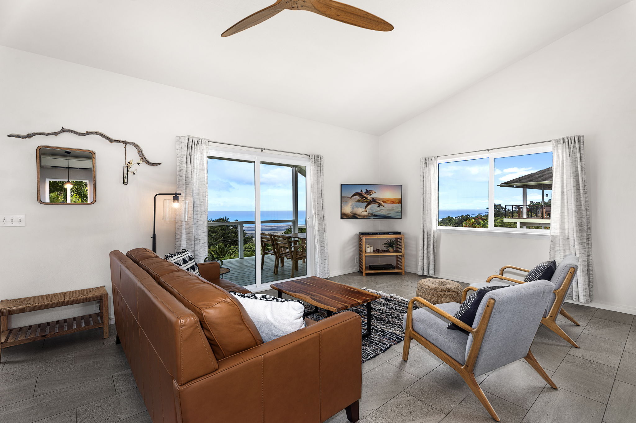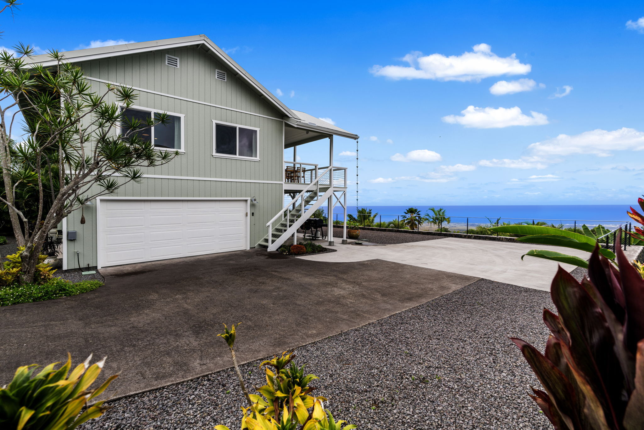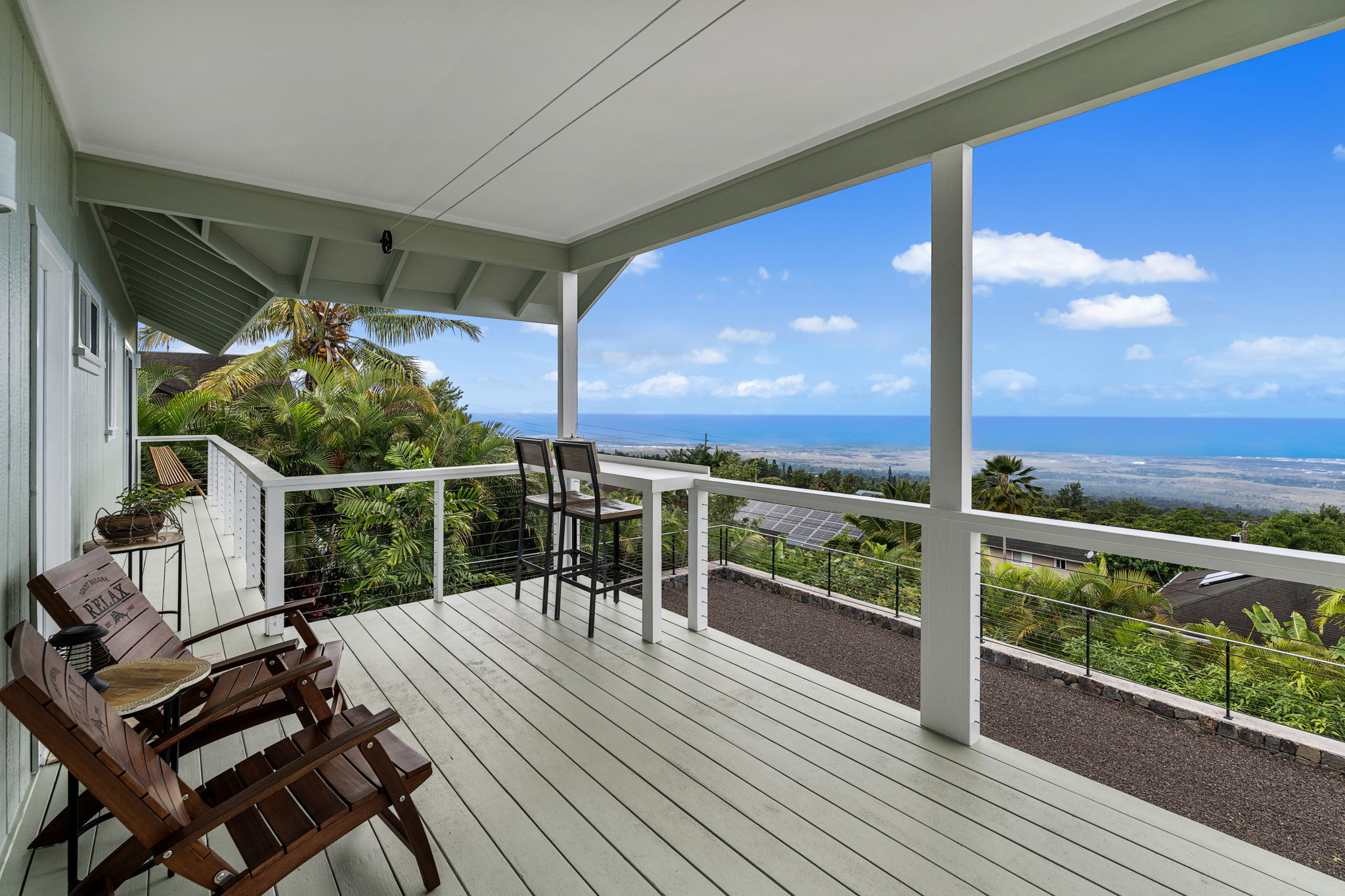 Stunning Kona Home with Unobstructed Ocean Views & Modern Upgrades! Discover paradise in this immaculate 3-bedroom, 2-bathroom home in Kona, boasting breathtaking, un-blockable ocean views at an ideal elevation. The upstairs features a spacious living area, while a separate downstairs guest suite with a kitchenette offers flexibility for visitors or rental potential. Landscaping with areca palms, sharwil avocado, mango, meyer lemon, Tahitian lime, white pineapples, apple bananas, papaya, plus vibrant plants, shrubs, rock walls, concrete steps, and cable fencing.