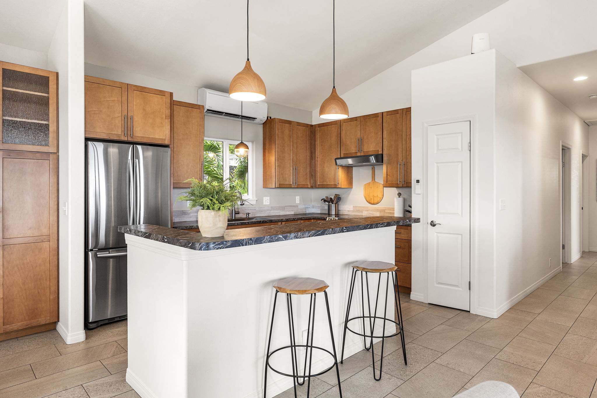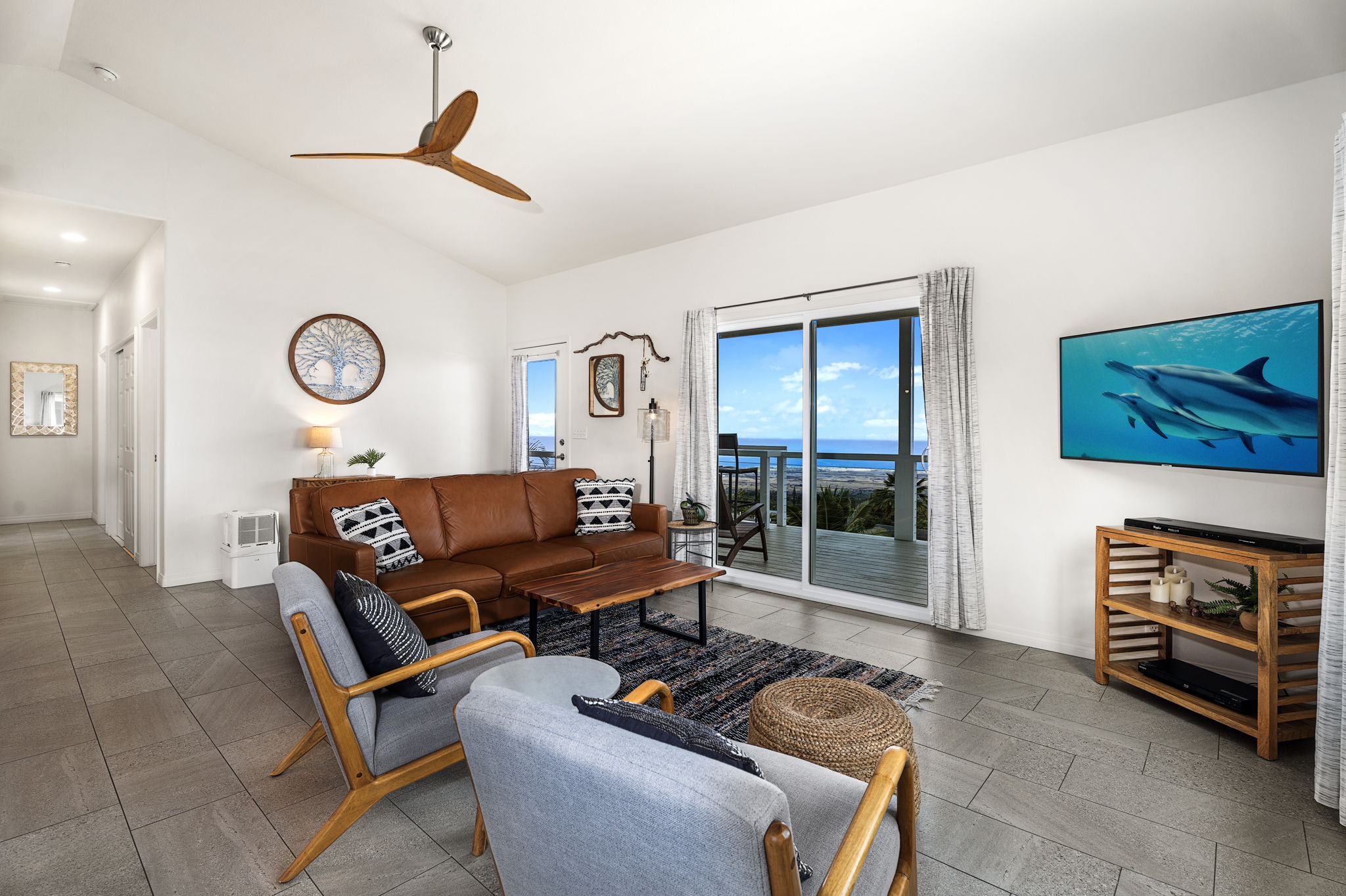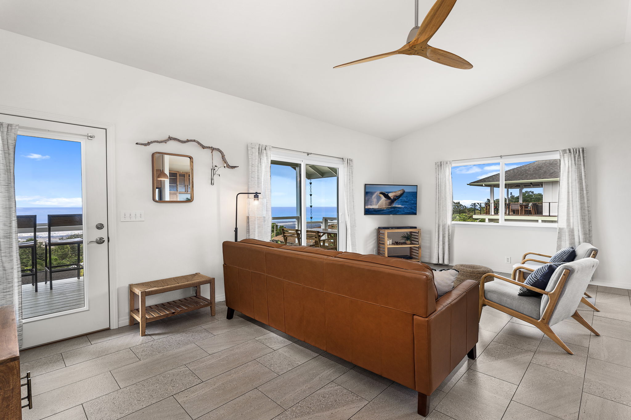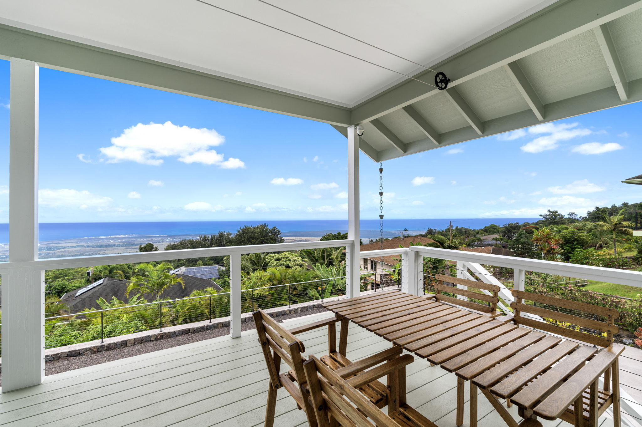 Stunning Kona Home with Unobstructed Ocean Views & Modern Upgrades! Discover paradise in this immaculate 3-bedroom, 2-bathroom home in Kona, boasting breathtaking, un-blockable ocean views at an ideal elevation. The upstairs features a spacious living area, while a separate downstairs guest suite with a kitchenette offers flexibility for visitors or rental potential. Landscaping with areca palms, sharwil avocado, mango, meyer lemon, Tahitian lime, white pineapples, apple bananas, papaya, plus vibrant plants, shrubs, rock walls, concrete steps, and cable fencing.