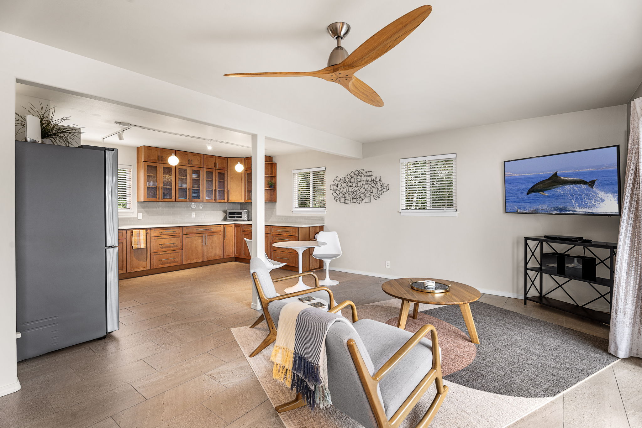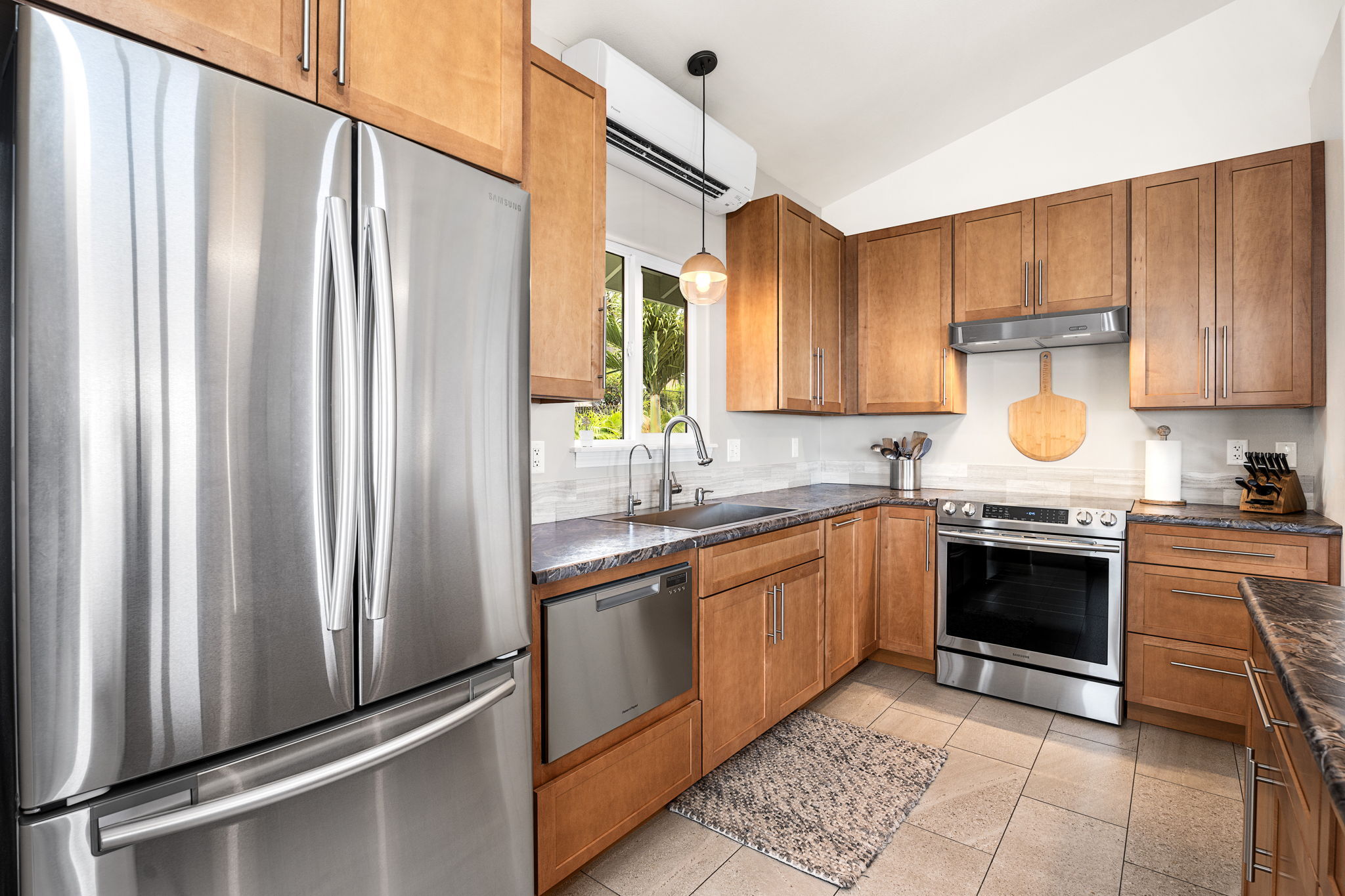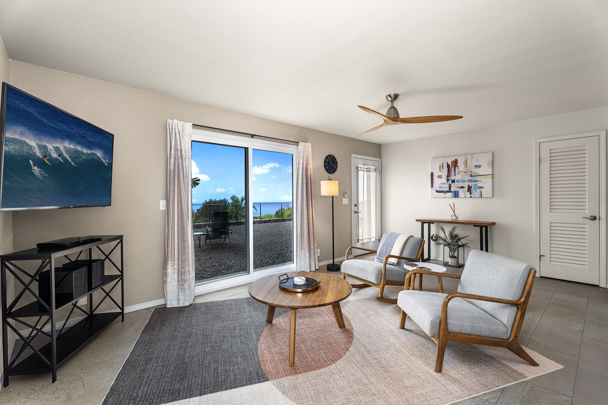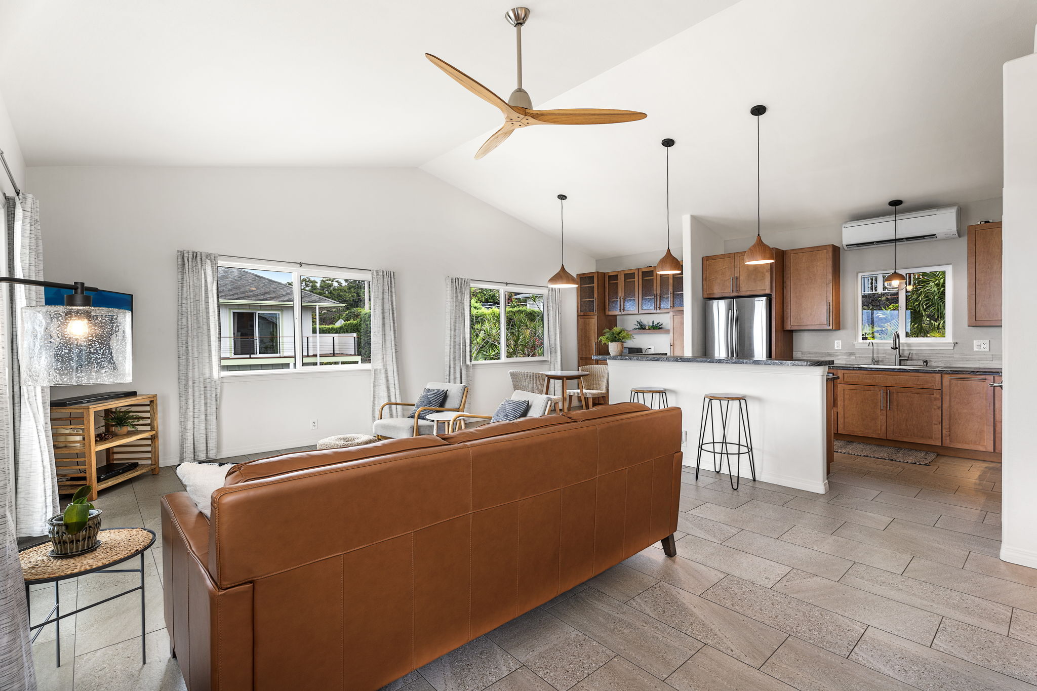 Stunning Kona Home with Unobstructed Ocean Views & Modern Upgrades! Discover paradise in this immaculate 3-bedroom, 2-bathroom home in Kona, boasting breathtaking, un-blockable ocean views at an ideal elevation. The upstairs features a spacious living area, while a separate downstairs guest suite with a kitchenette offers flexibility for visitors or rental potential. Landscaping with areca palms, sharwil avocado, mango, meyer lemon, Tahitian lime, white pineapples, apple bananas, papaya, plus vibrant plants, shrubs, rock walls, concrete steps, and cable fencing.