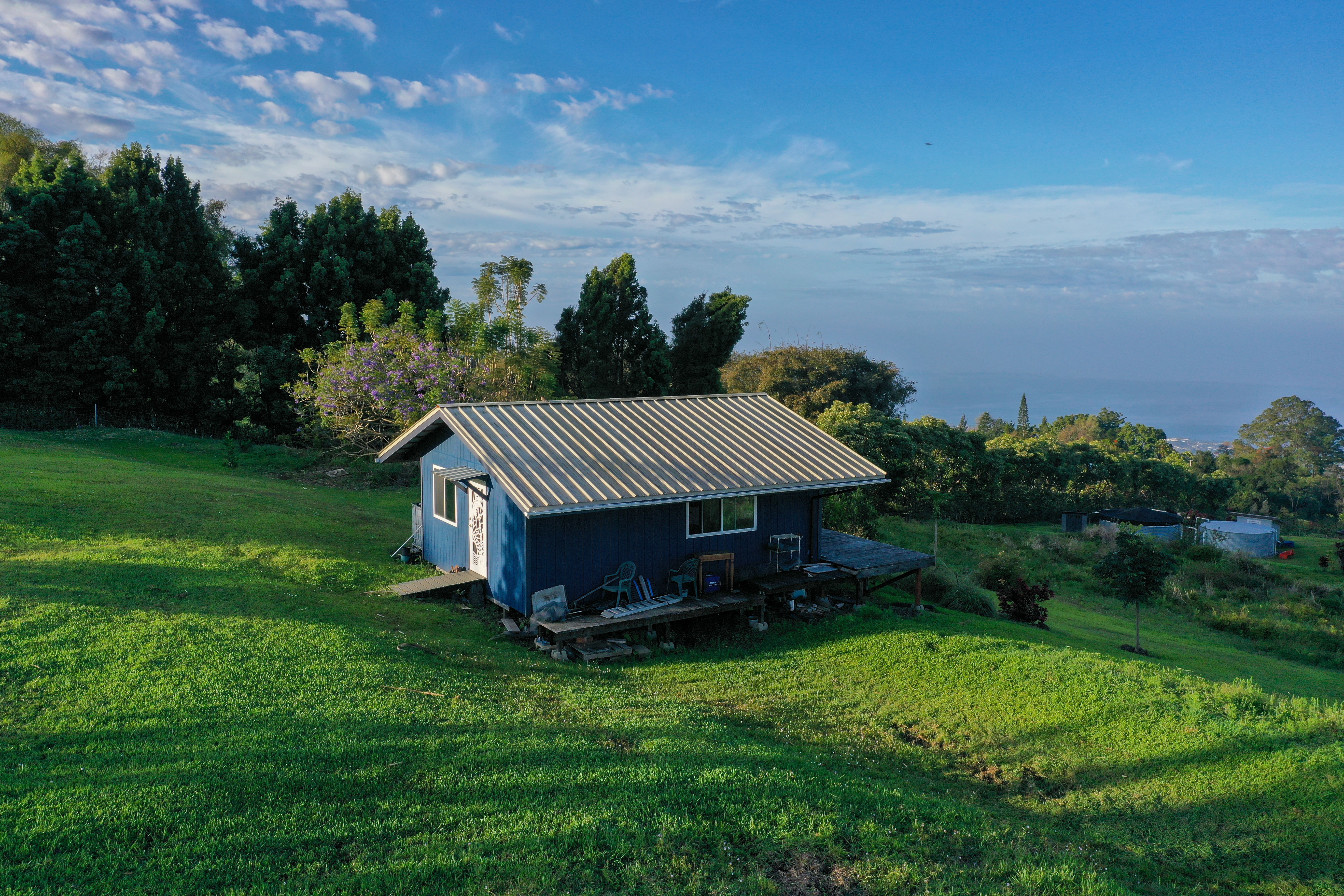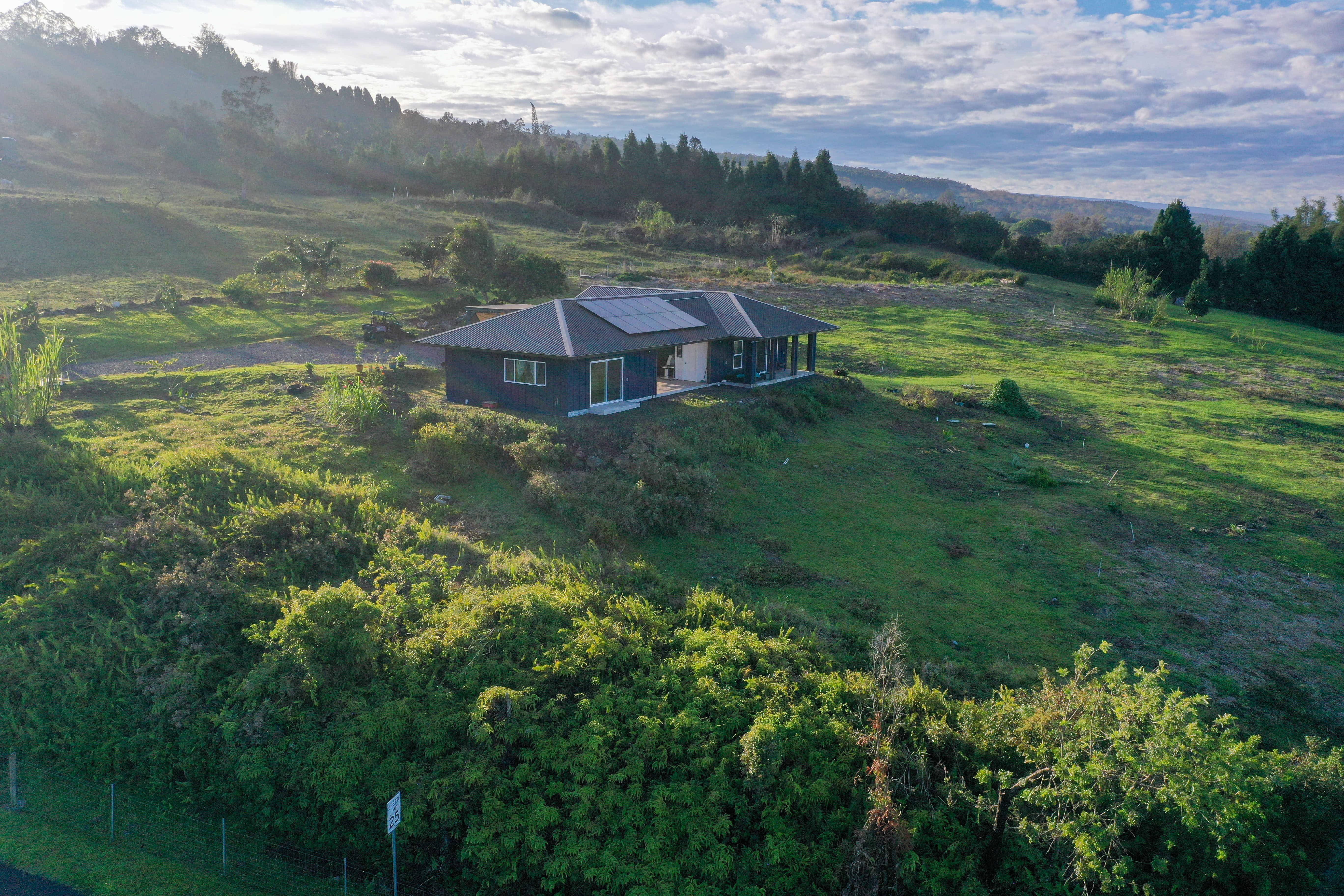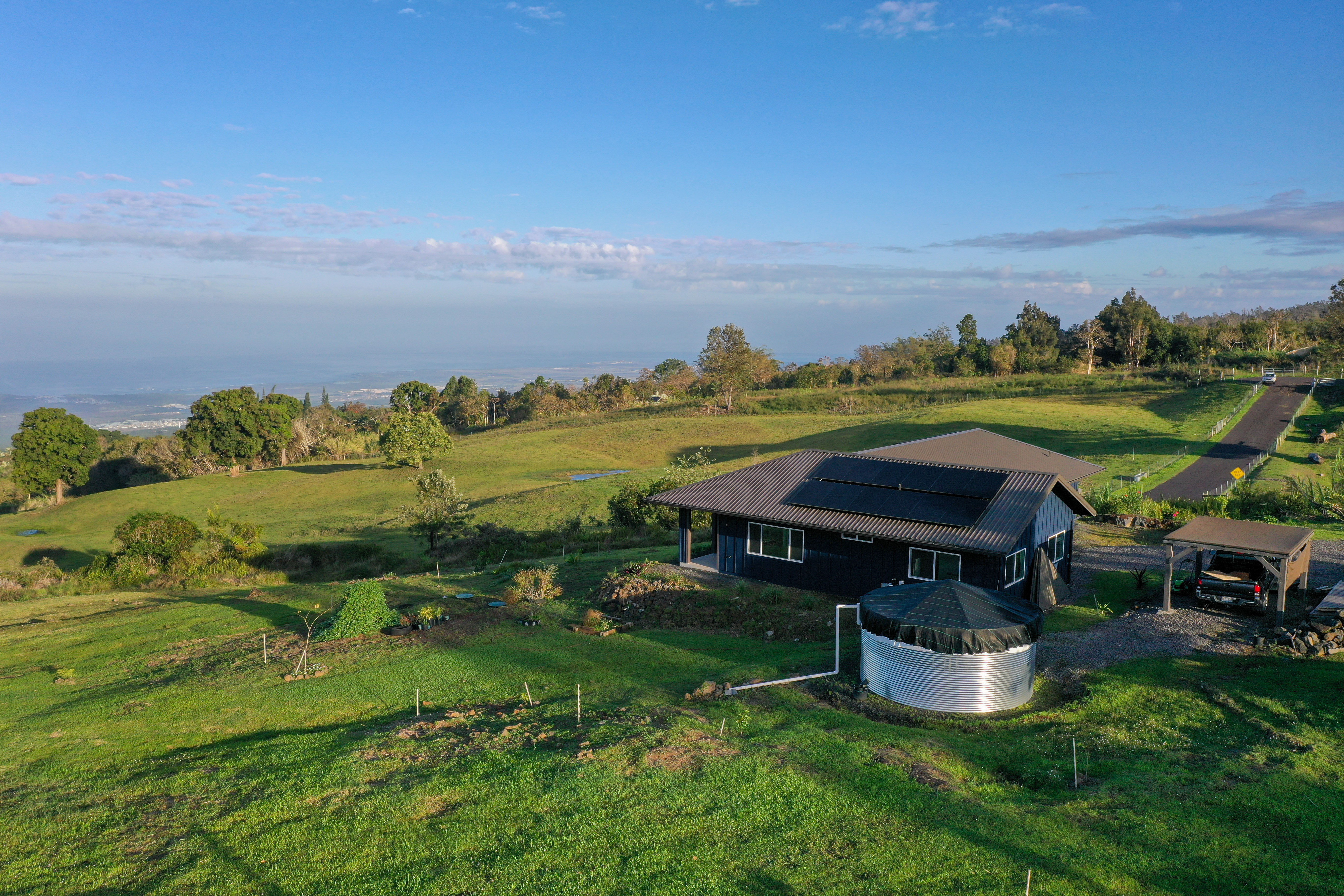 Welcome to your private slice of paradise in the highly desirable Holualoa countryside in a private gated community with little CC&Rs. This completely off-grid home is situated on 5.3 acres of Agricultural-zoned land. The fully fenced property features a newly built (2024) single-level home has panoramic views of the Kona coast and Hualalai mountain. The home features 3 bedrooms and 2.5 bathrooms with thoughtfully designed double-wall construction, concrete slab foundation, metal roofing, and a 30,000 watt fully owned photovoltaic system! The open layout of this home is complemented by covered lanai spaces, ideal for enjoying cool mauka breezes and peaceful surroundings. This property provides endless possibilities for farming and gardening or creating your dream homestead. With ample usable acreage, privacy, and room to expand, it’s a rare opportunity to own a large parcel in Holualoa. Seller has spent the last few years planting exotic fruit trees and making most of the acreage mow-able. Located just a short drive from Kailua-Kona, you’ll enjoy the perfect balance of privacy and convenience, with easy access to town, beaches, and amenities.