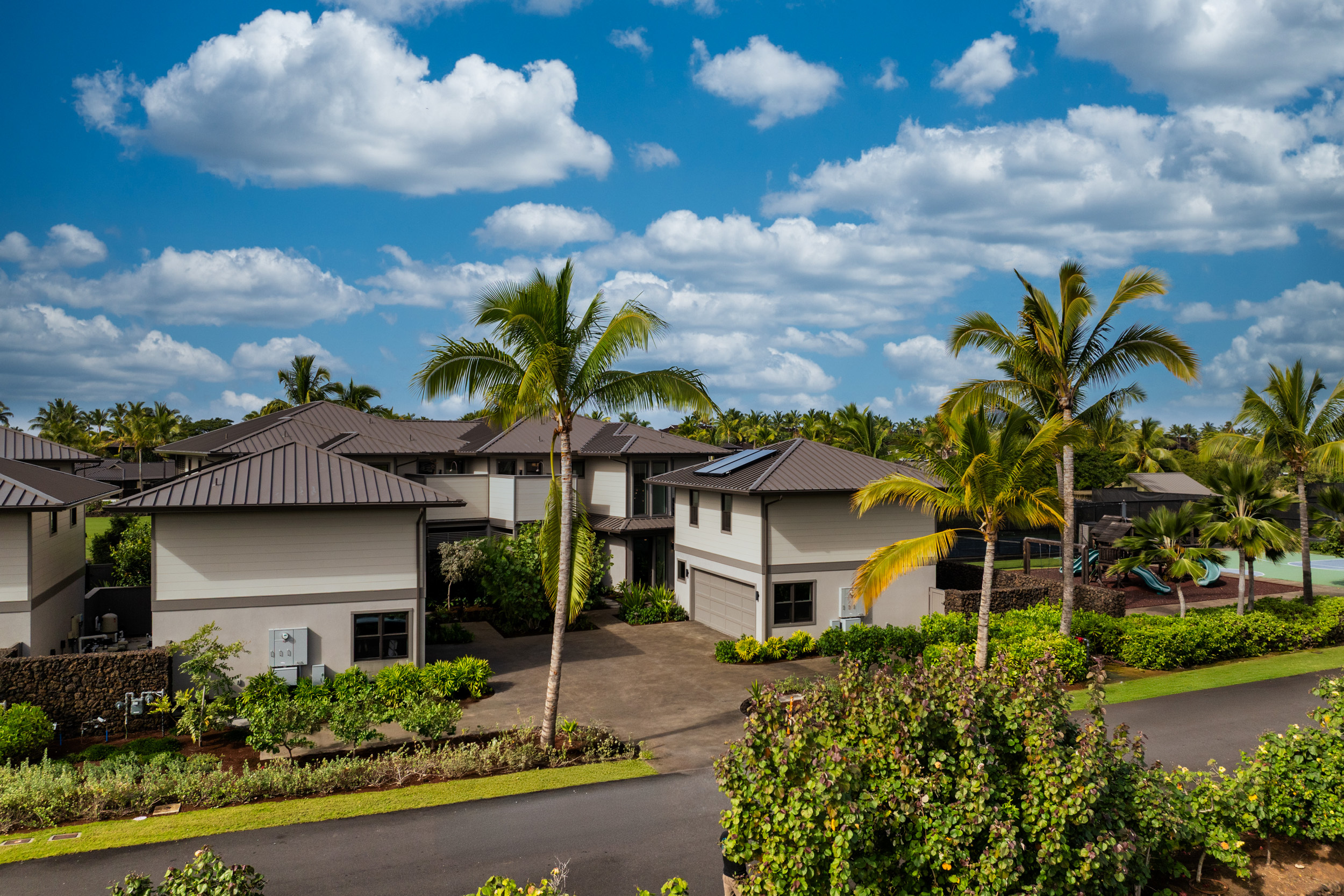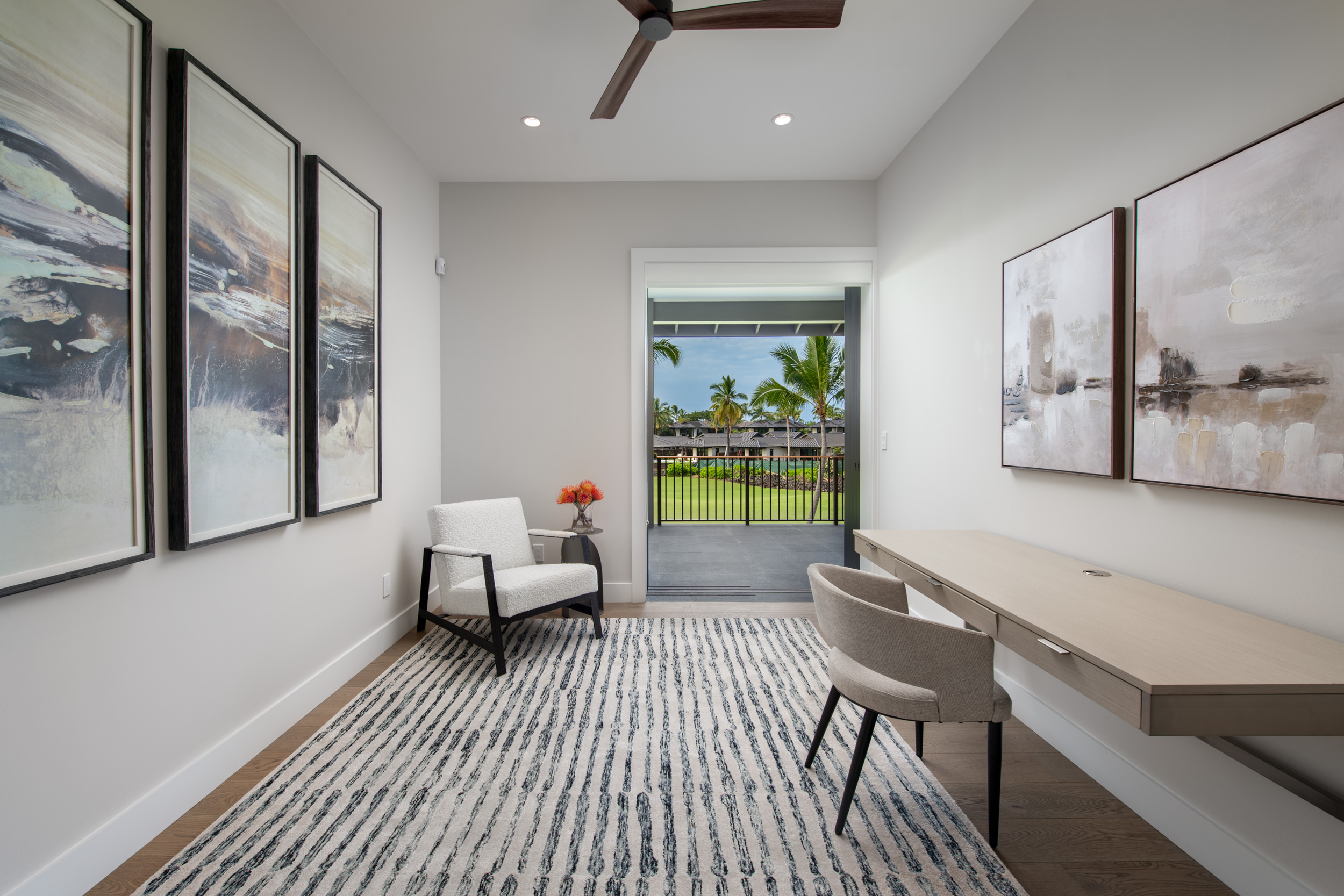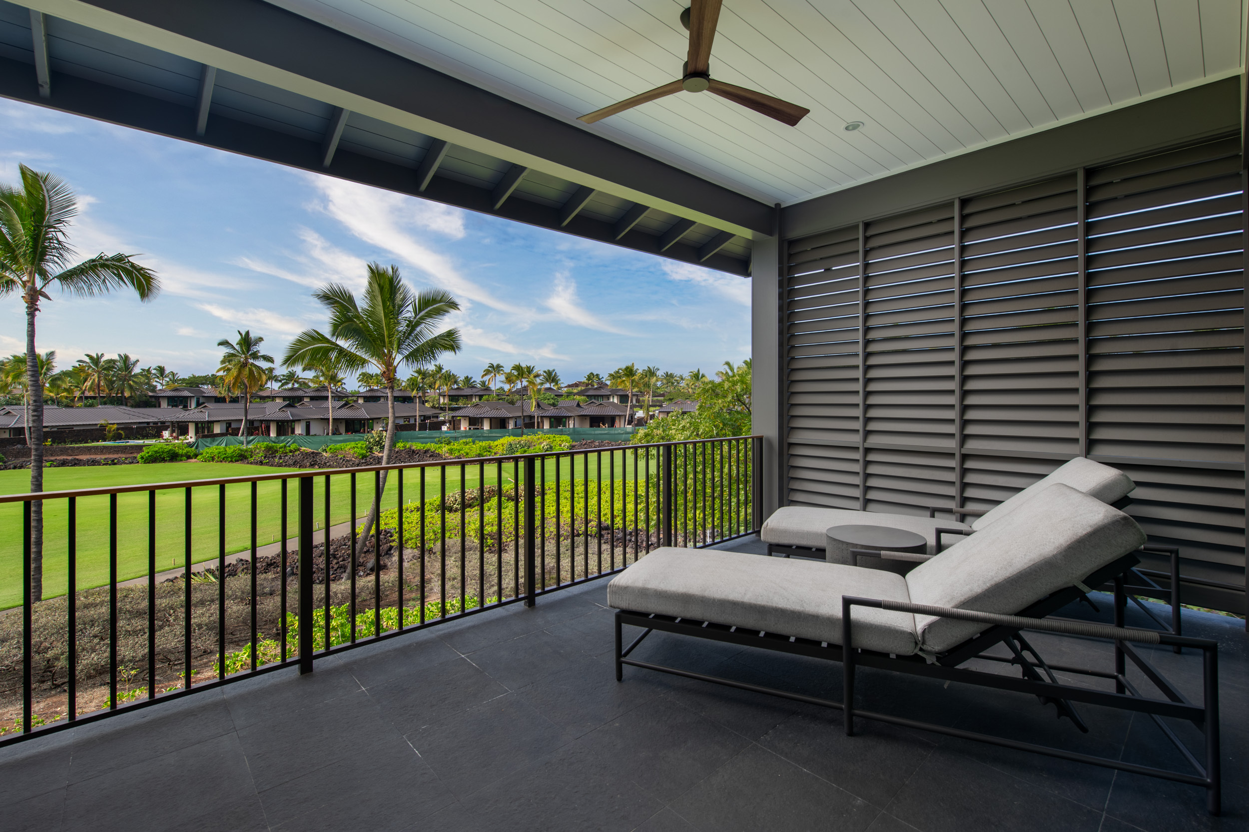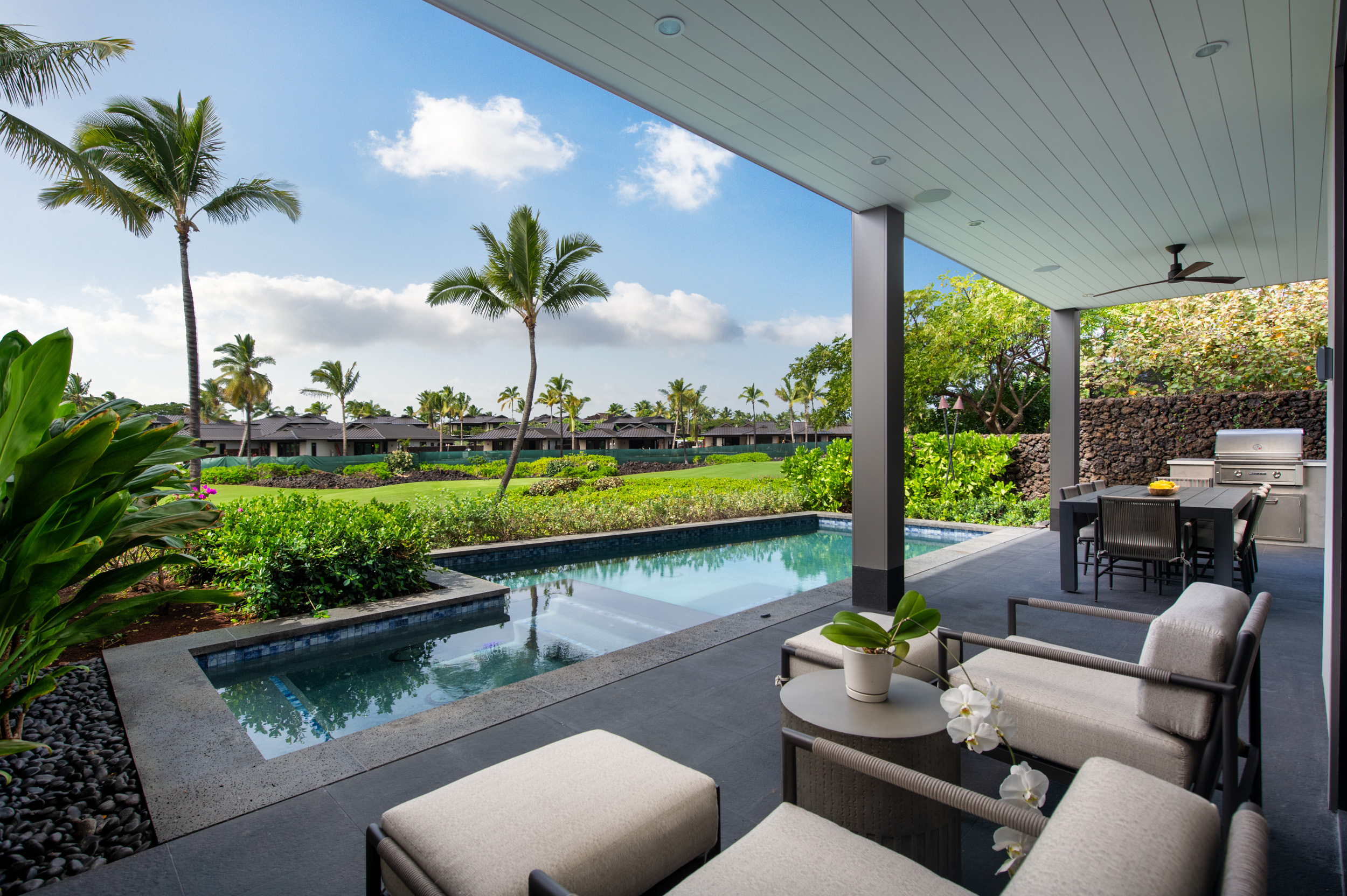 Welcome to Hinahina 24, a refined luxury townhome in Kailua-Kona’s exclusive Kohanaiki community on the Big Island of Hawai‘i. Completed in 2024 and ideally positioned along the 7th fairway of the Rees Jones—designed championship golf course, this elegant two-story residence embodies exceptional craftsmanship and the effortless beauty of indoor-outdoor living. A chef’s kitchen appointed with Sub-Zero and Wolf appliances anchors the open-concept great room. Pocketing glass doors invite the outdoors in, opening to a spacious covered lanai with a private pool and spa, built-in BBQ, and gracious dining area–an ideal setting for relaxed afternoons and memorable evenings. The main-level primary suite offers a serene retreat with direct access to the lanai and a spa-inspired bath complete with a private outdoor shower. Upstairs, a second primary suite–also featuring an outdoor shower–shares an expansive lanai with two additional guest bedrooms, each designed to capture natural light and gentle island breezes. A detached suite above the two-car garage provides a private fifth bedroom with its own entrance, and is ideal for visiting family, guests, or a quiet office sanctuary. Just steps from the Sports Complex and a short golf cart ride to Kohanaiki’s vibrant Clubhouse, Beach Club, and Golf Practice Facility, Hinahina 24 presents a rare opportunity to enjoy elevated island living in one of Hawai‘i’s most coveted private communities.